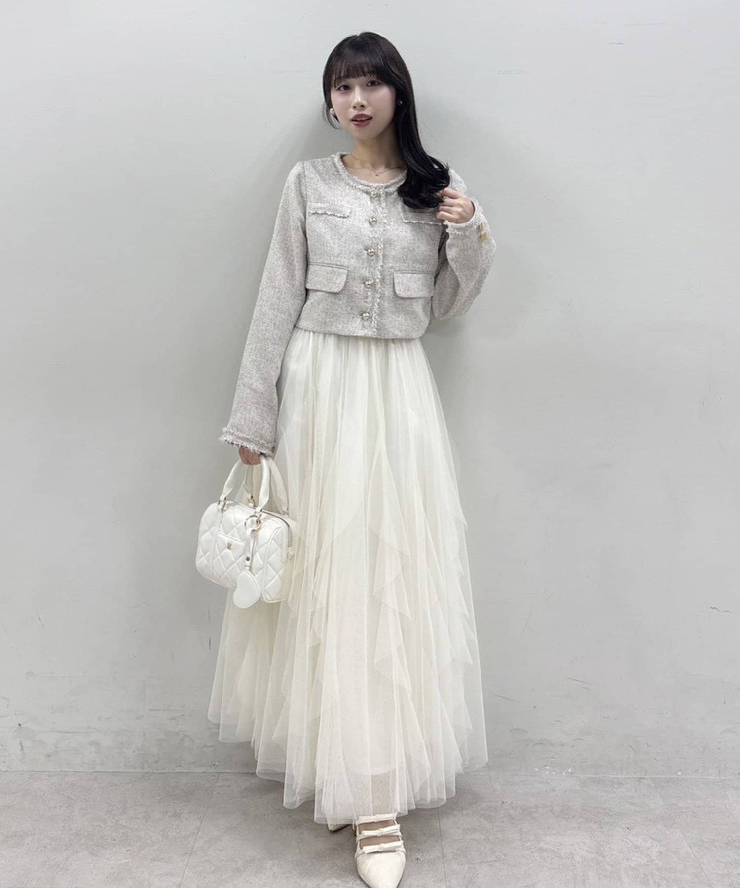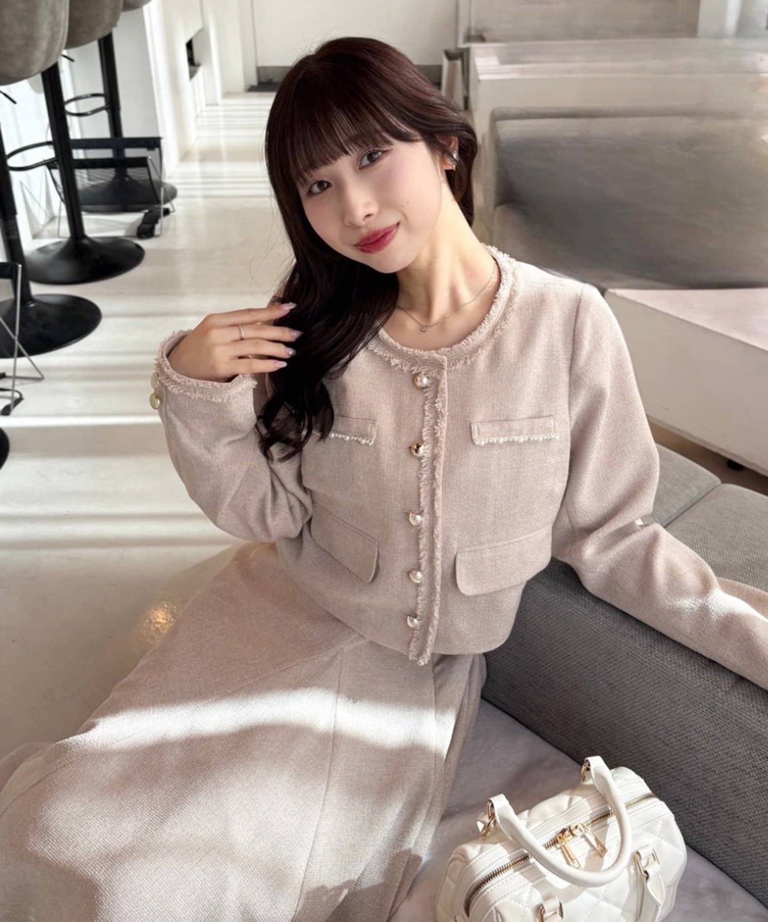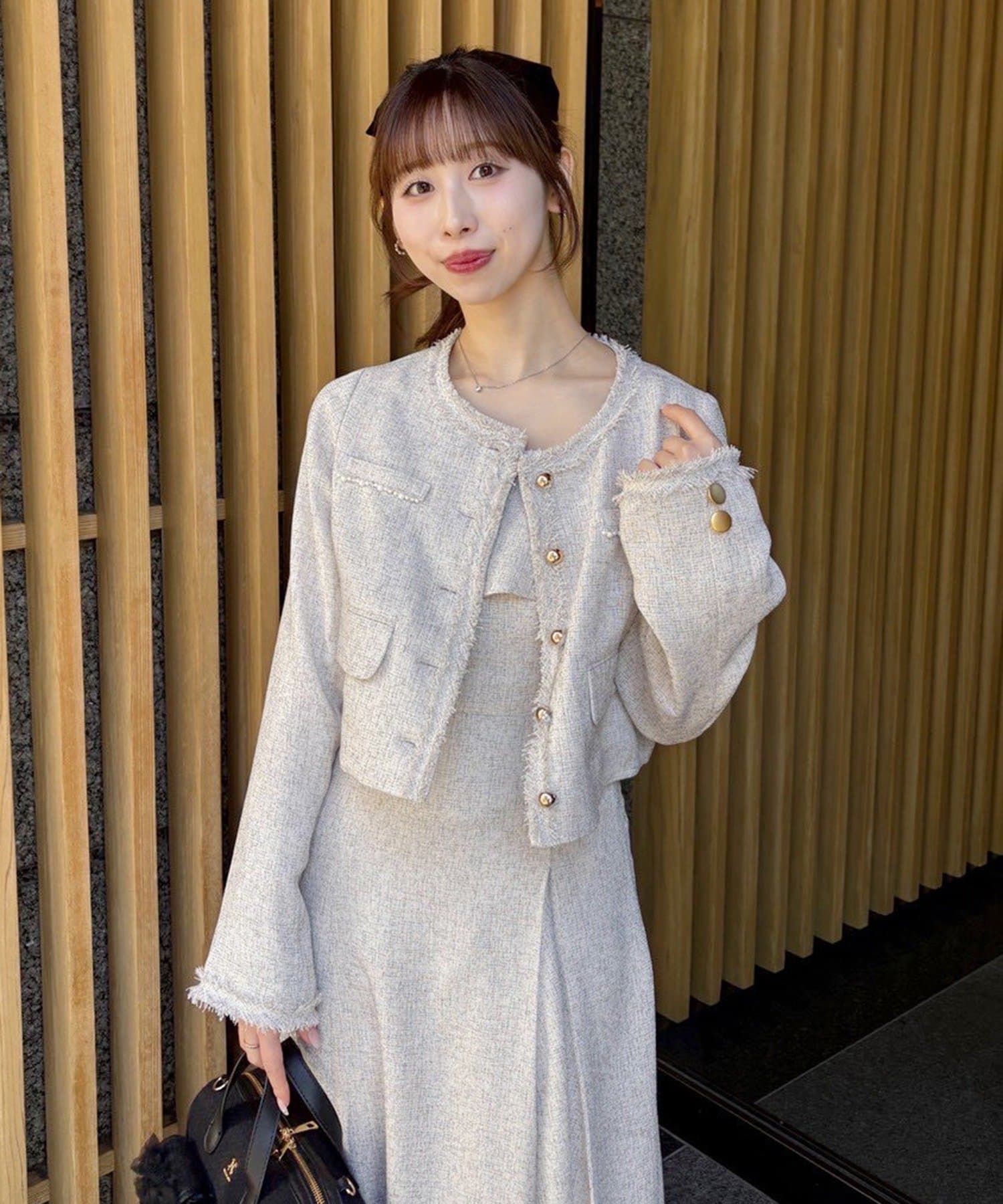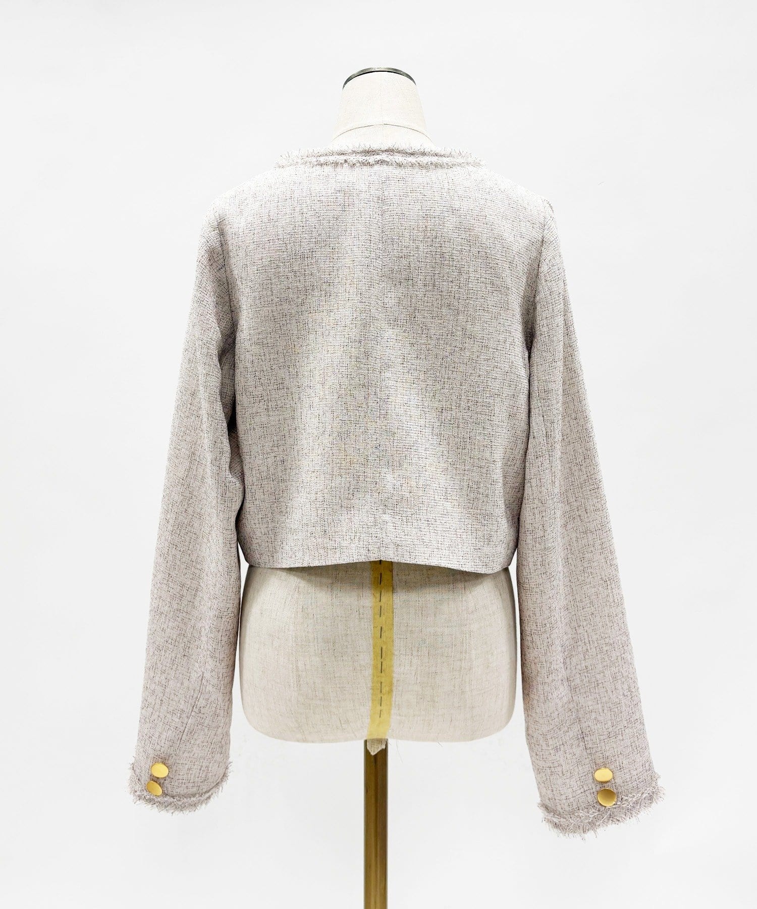 オーロラ×ゴールドの珍しいボタンが目を惹く、ノーカラーツイードジャケット。