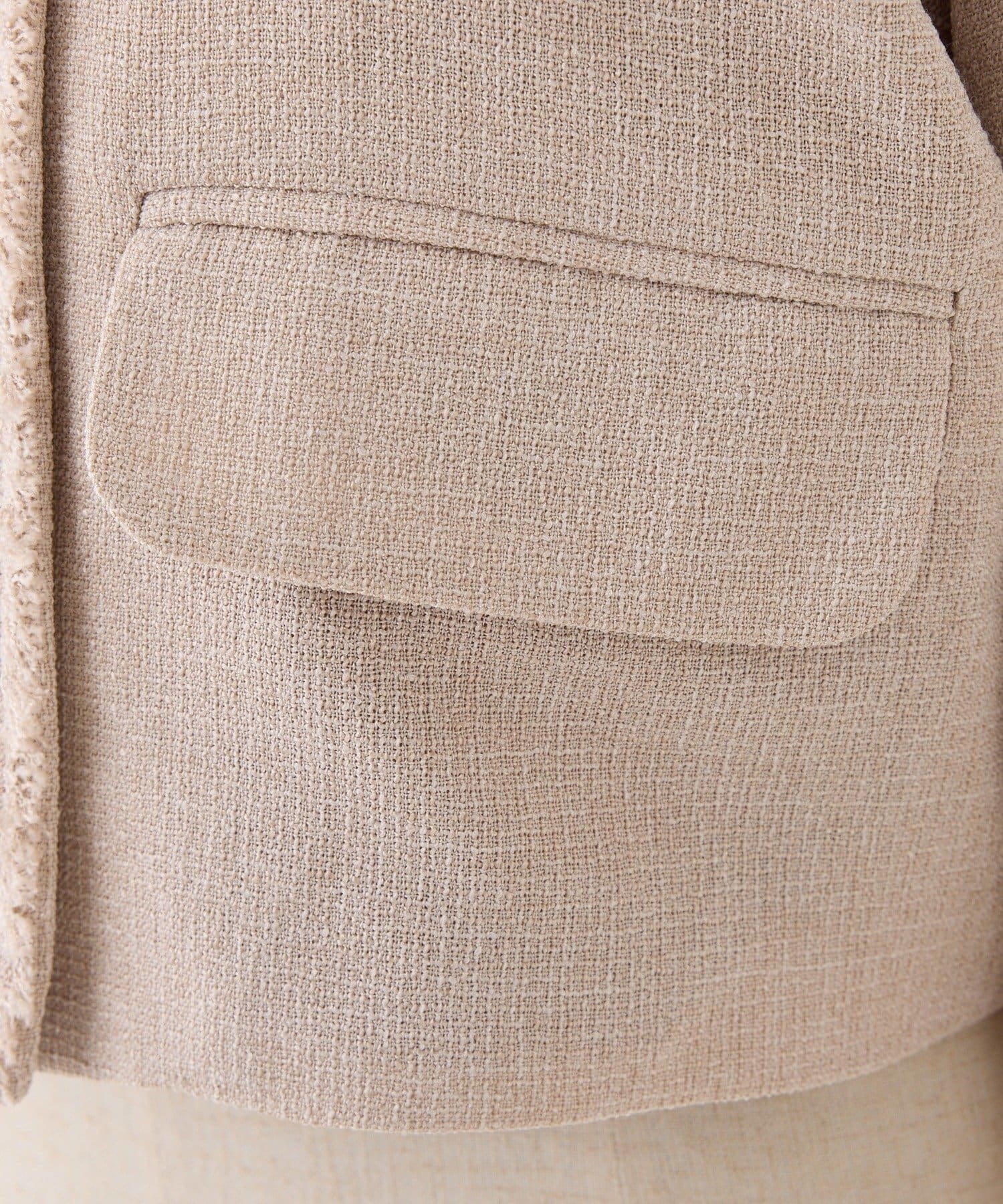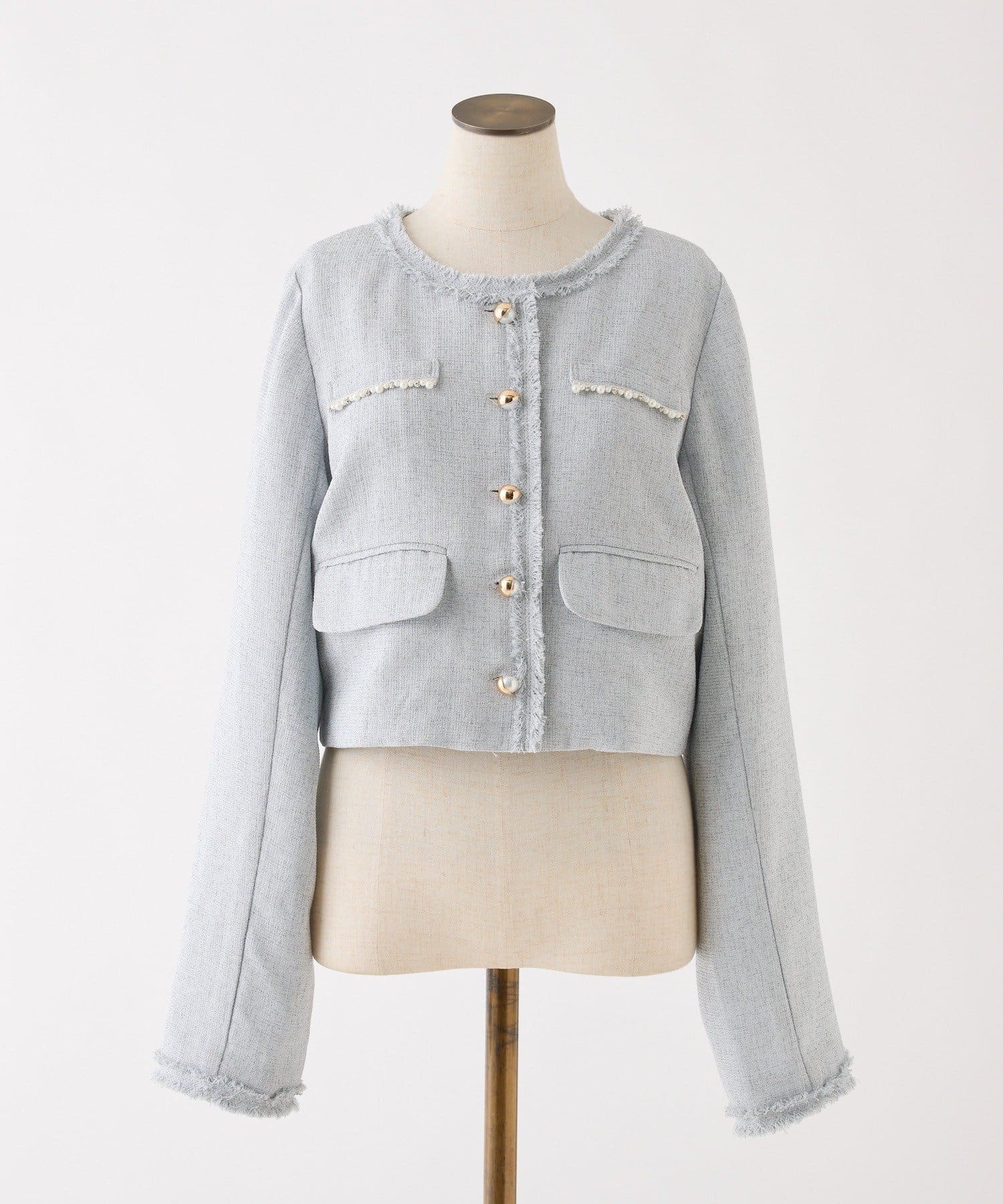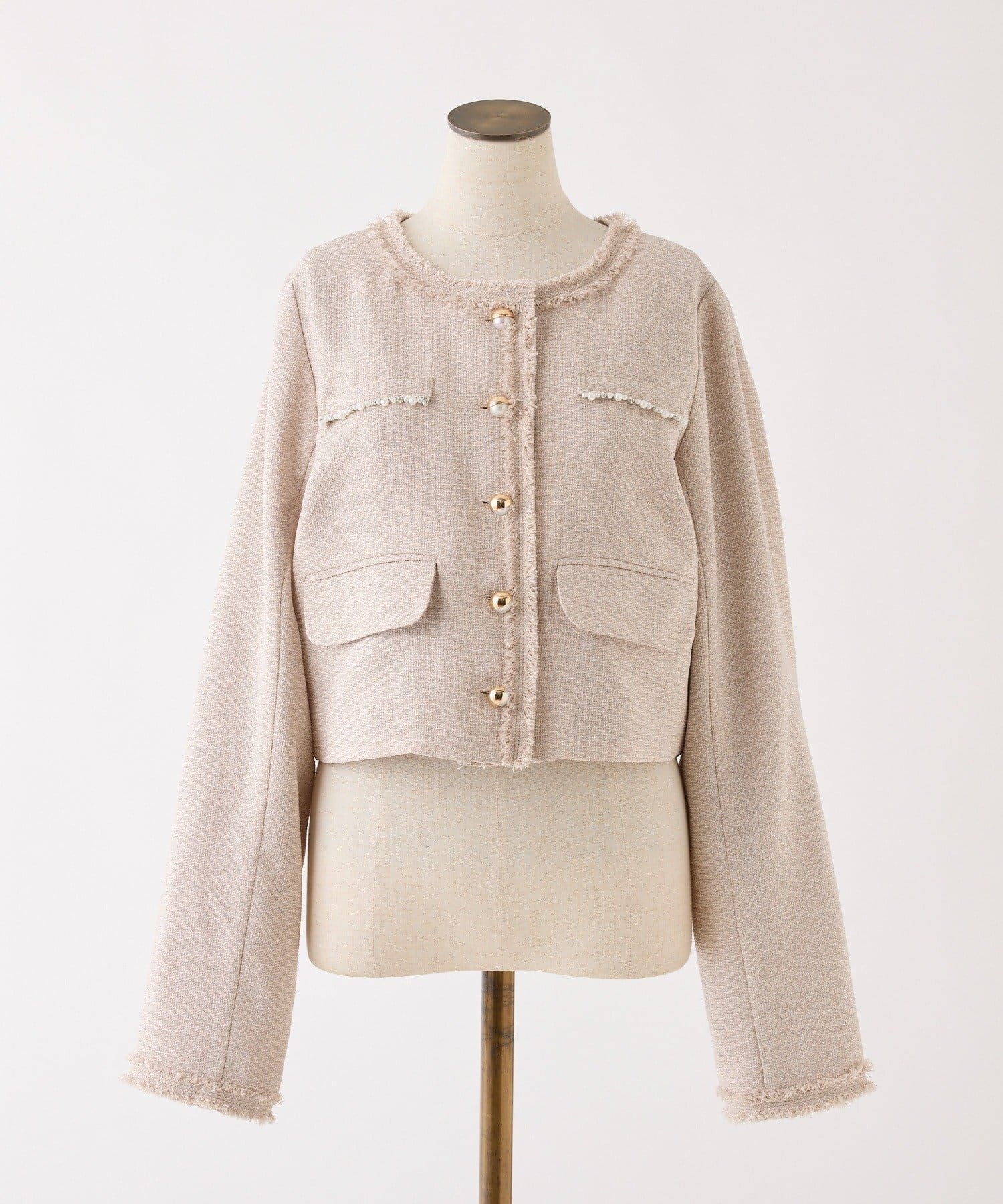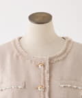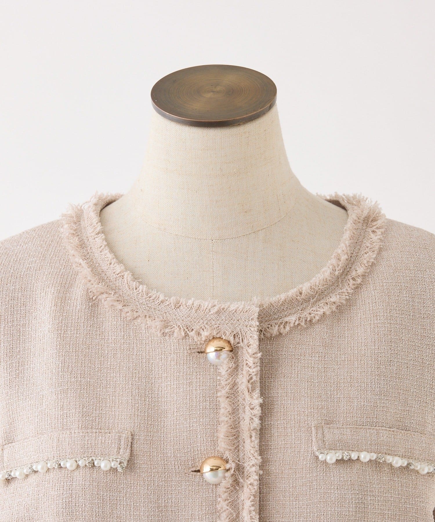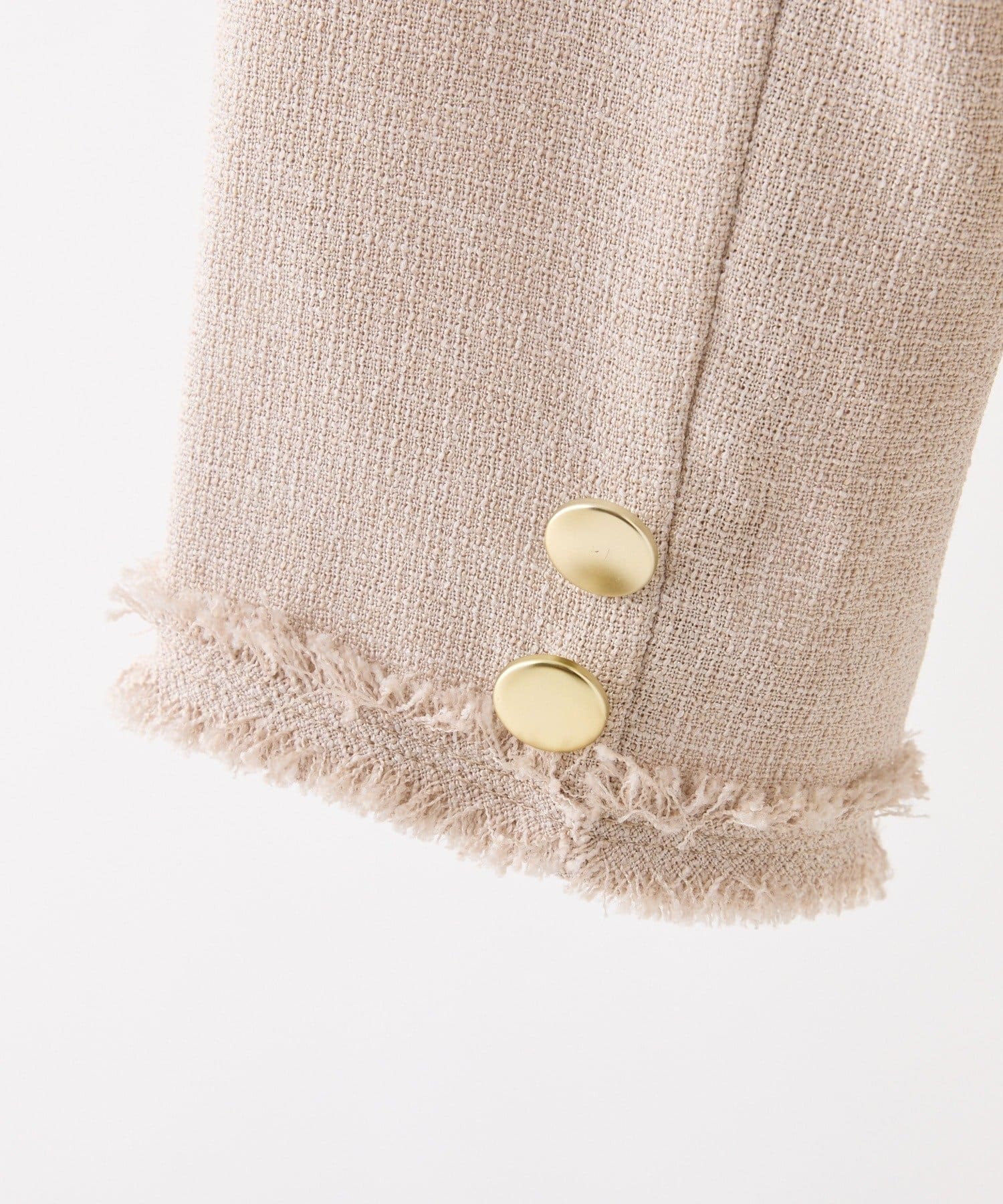 オーロラ×ゴールドの珍しいボタンが目を惹く、ノーカラーツイードジャケット。