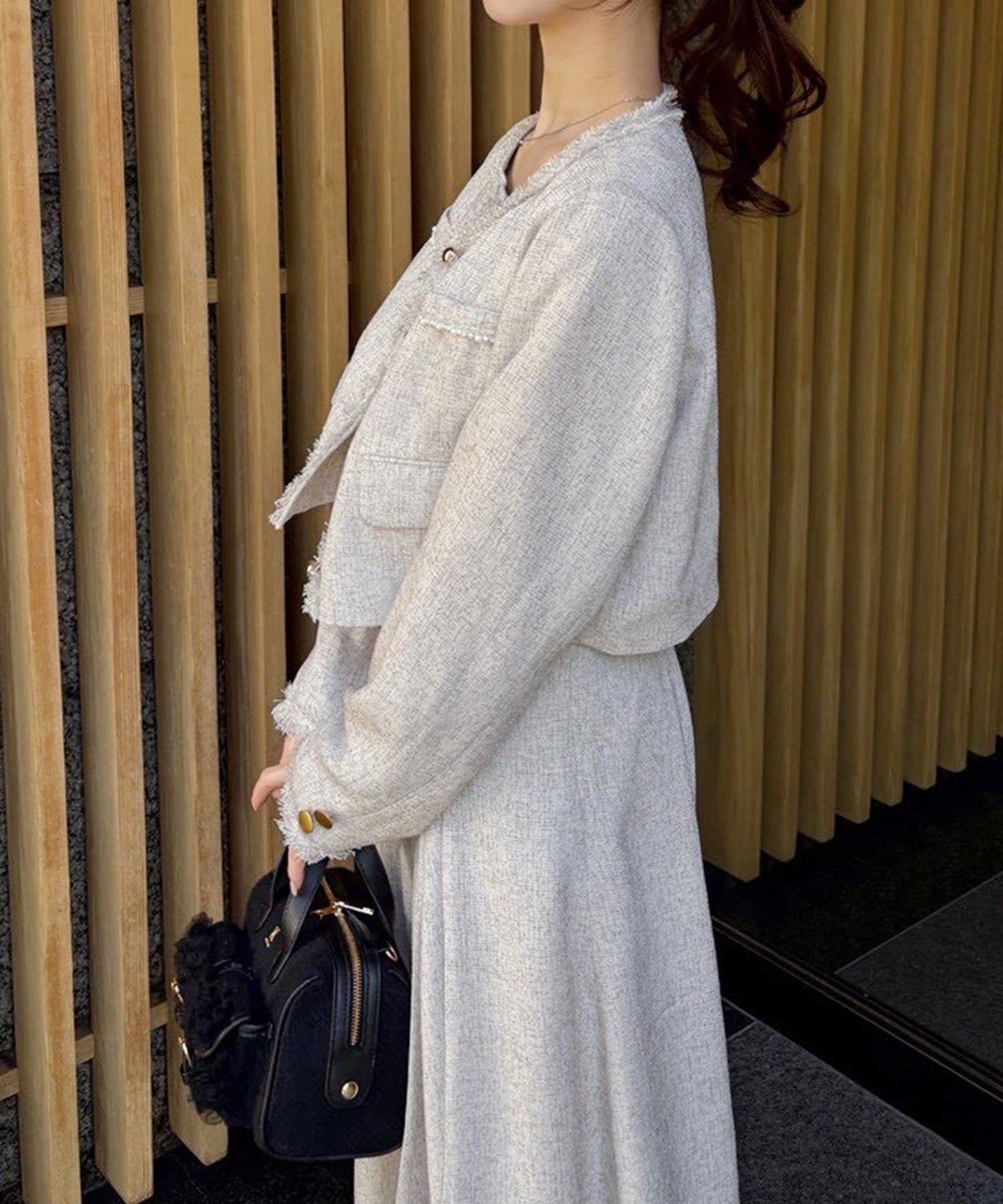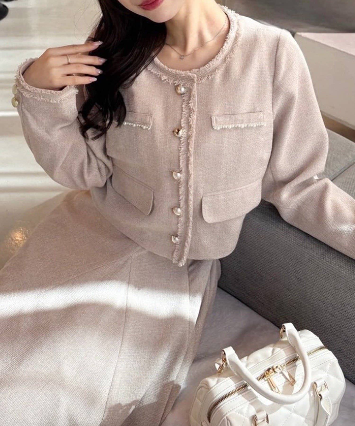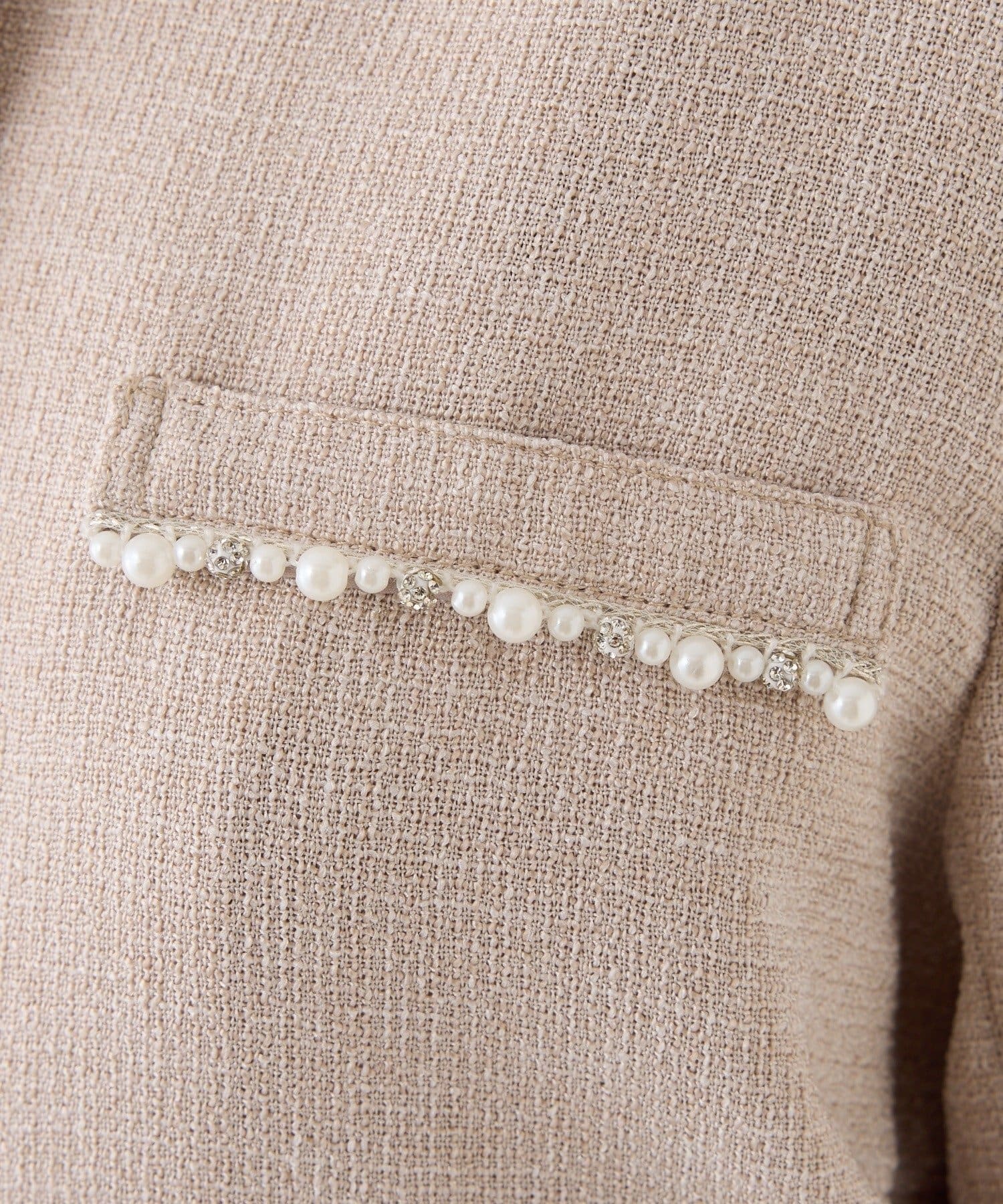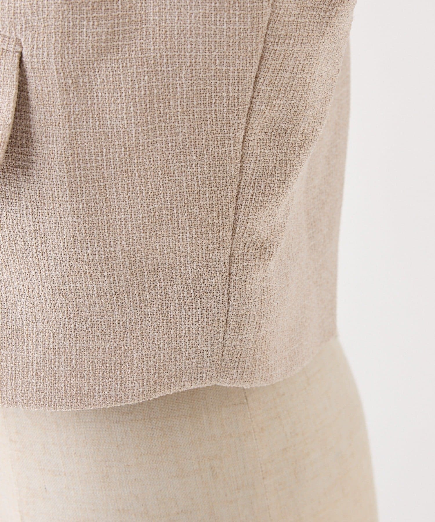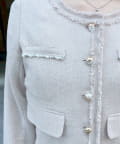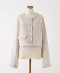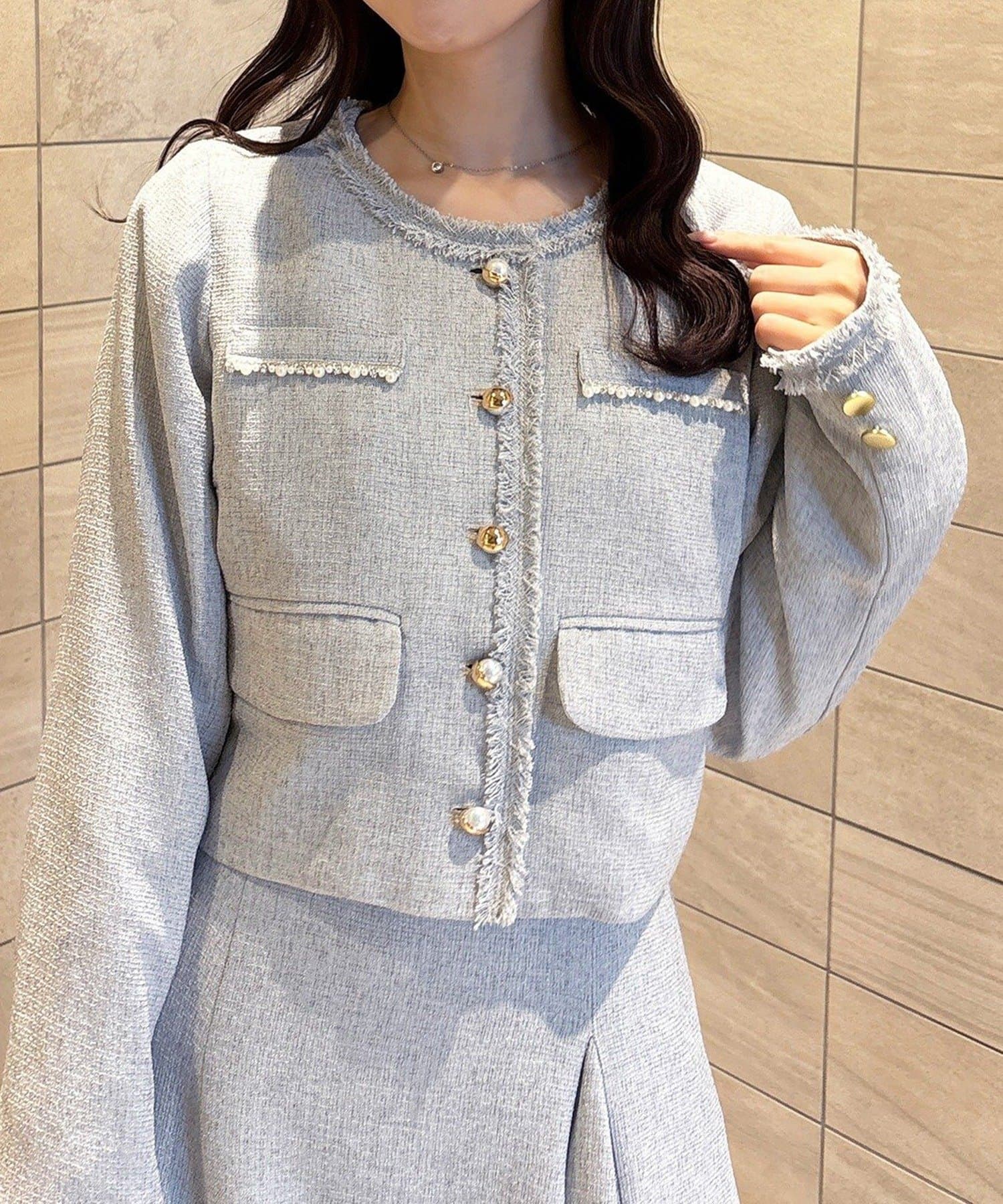 オーロラ×ゴールドの珍しいボタンが目を惹く、ノーカラーツイードジャケット。
