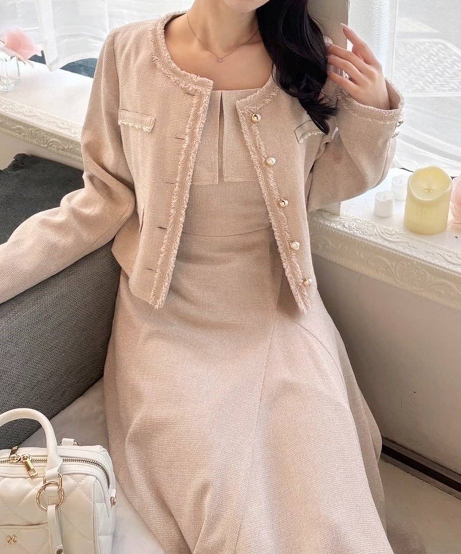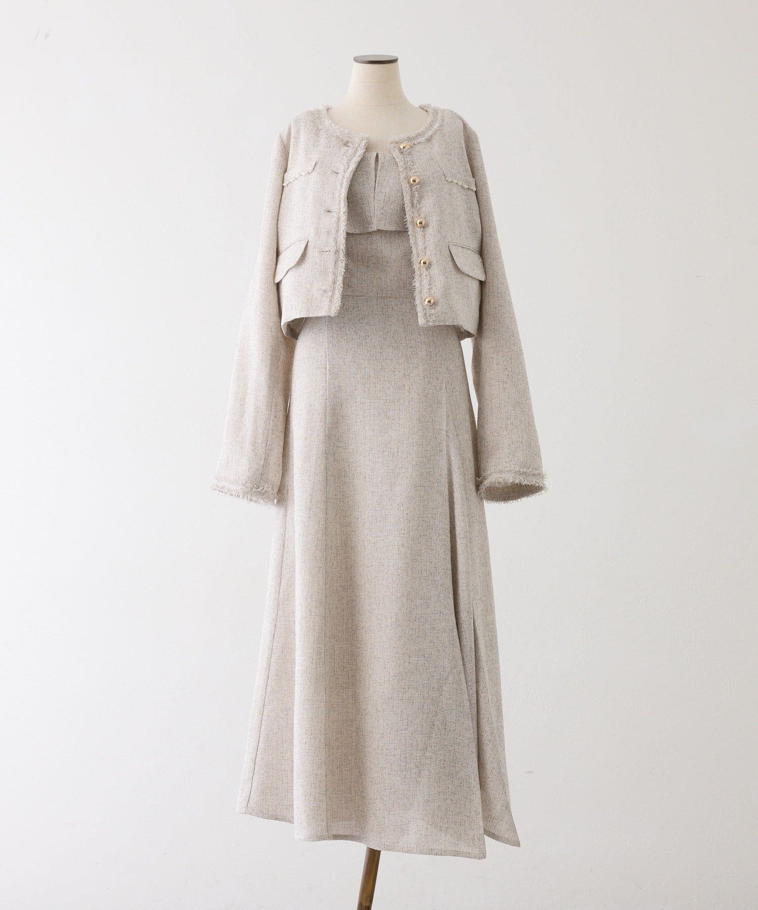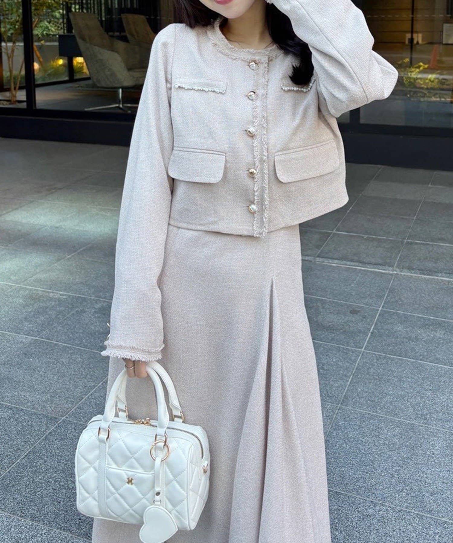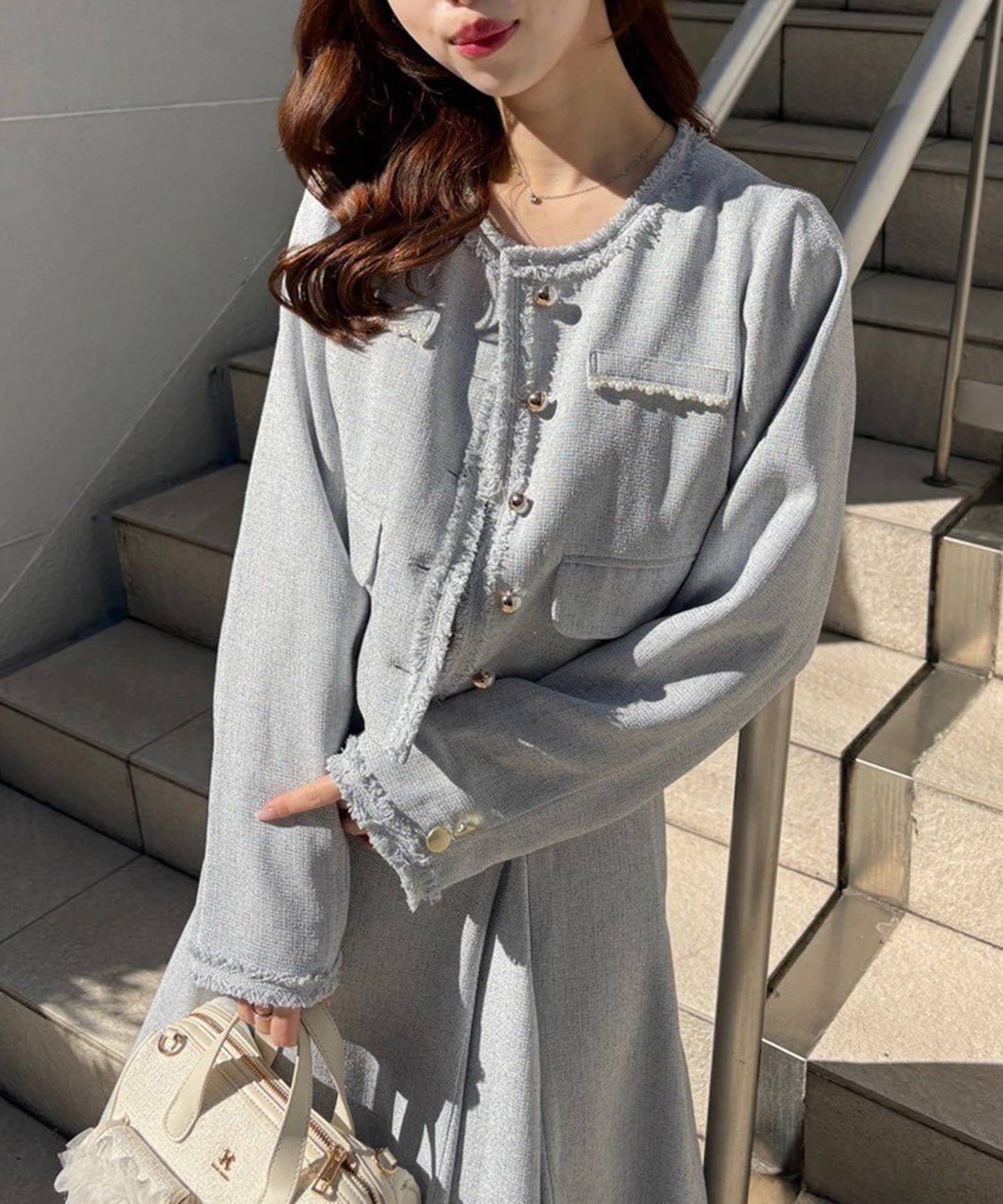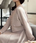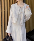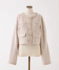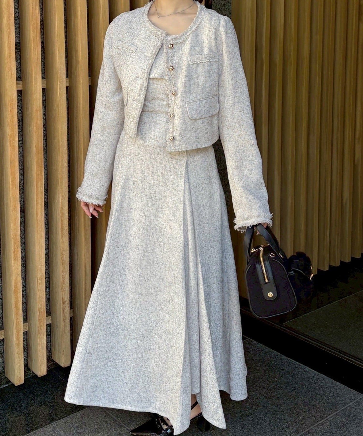 オーロラ×ゴールドの珍しいボタンが目を惹く、ノーカラーツイードジャケット。