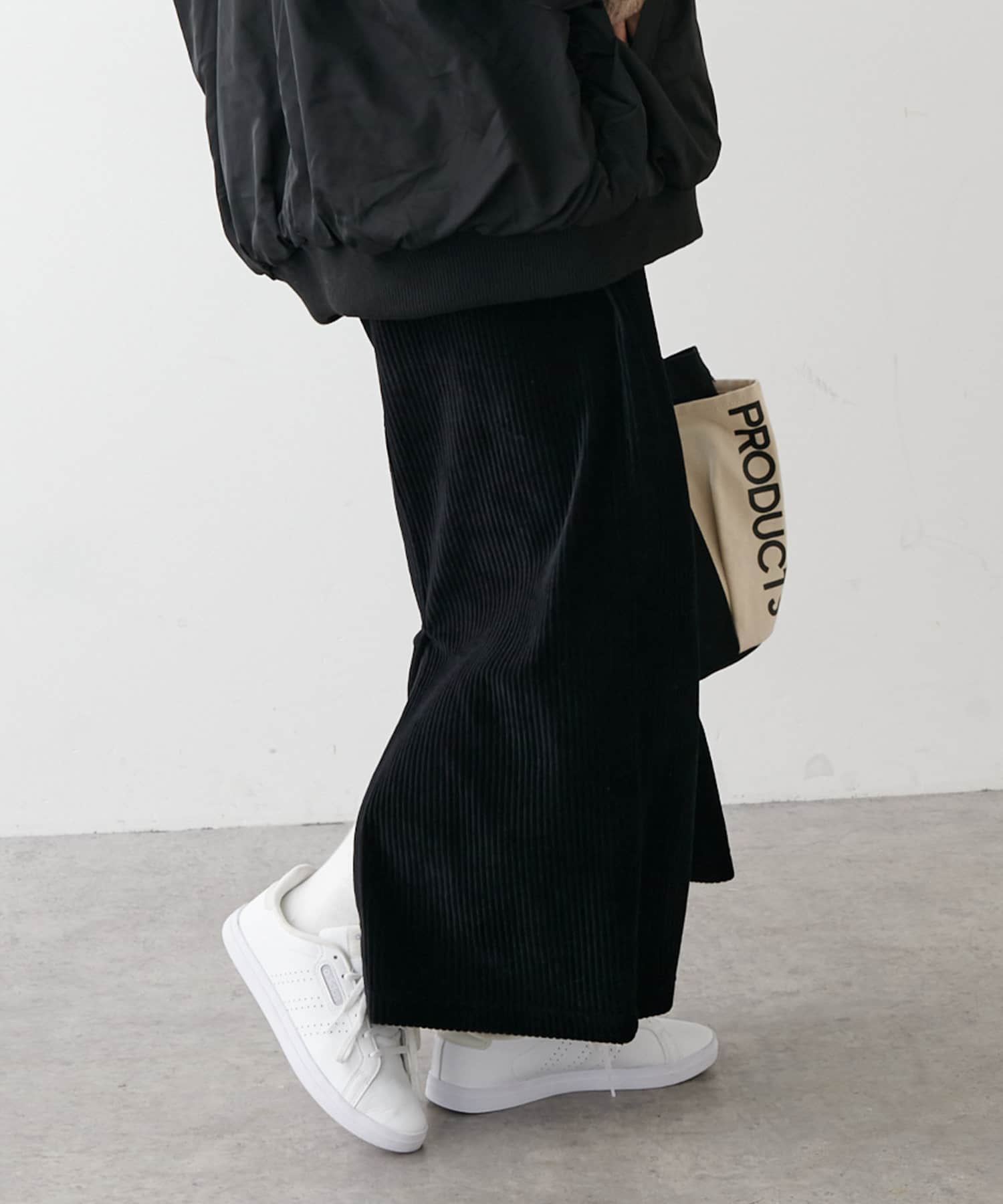 丈が長めで後ろにスリットが入っているため、スニーカーやパンプス、ブーツなど様々なシューズとマッチします。