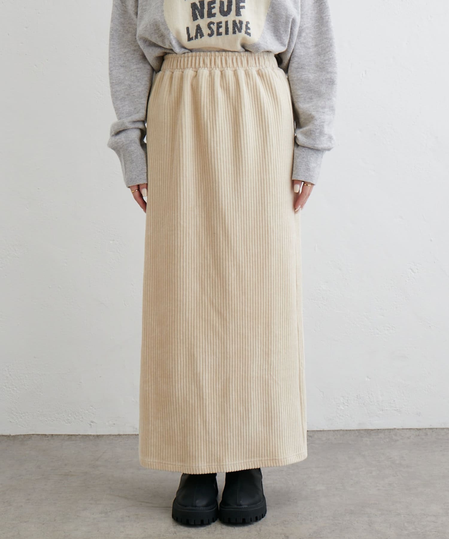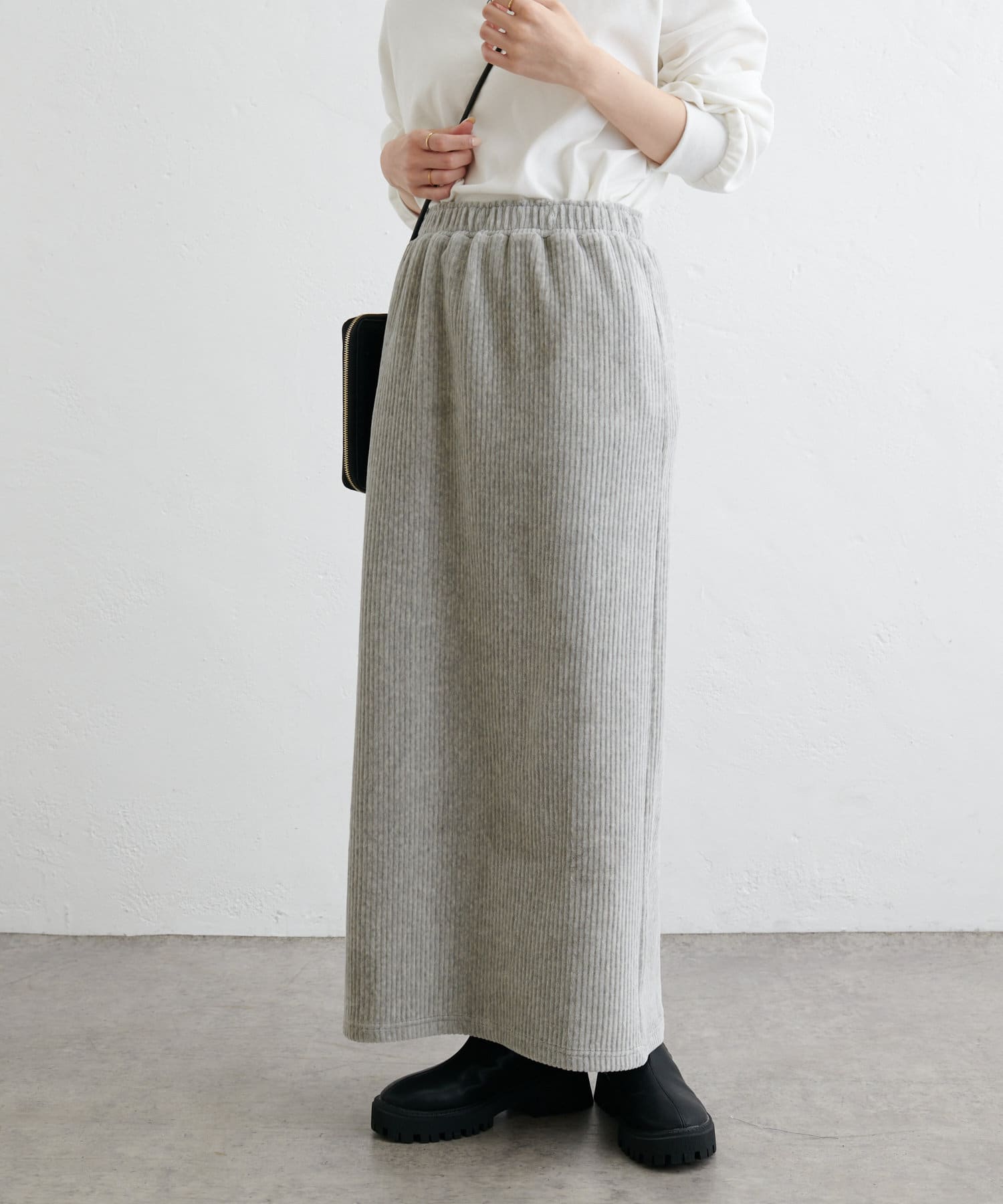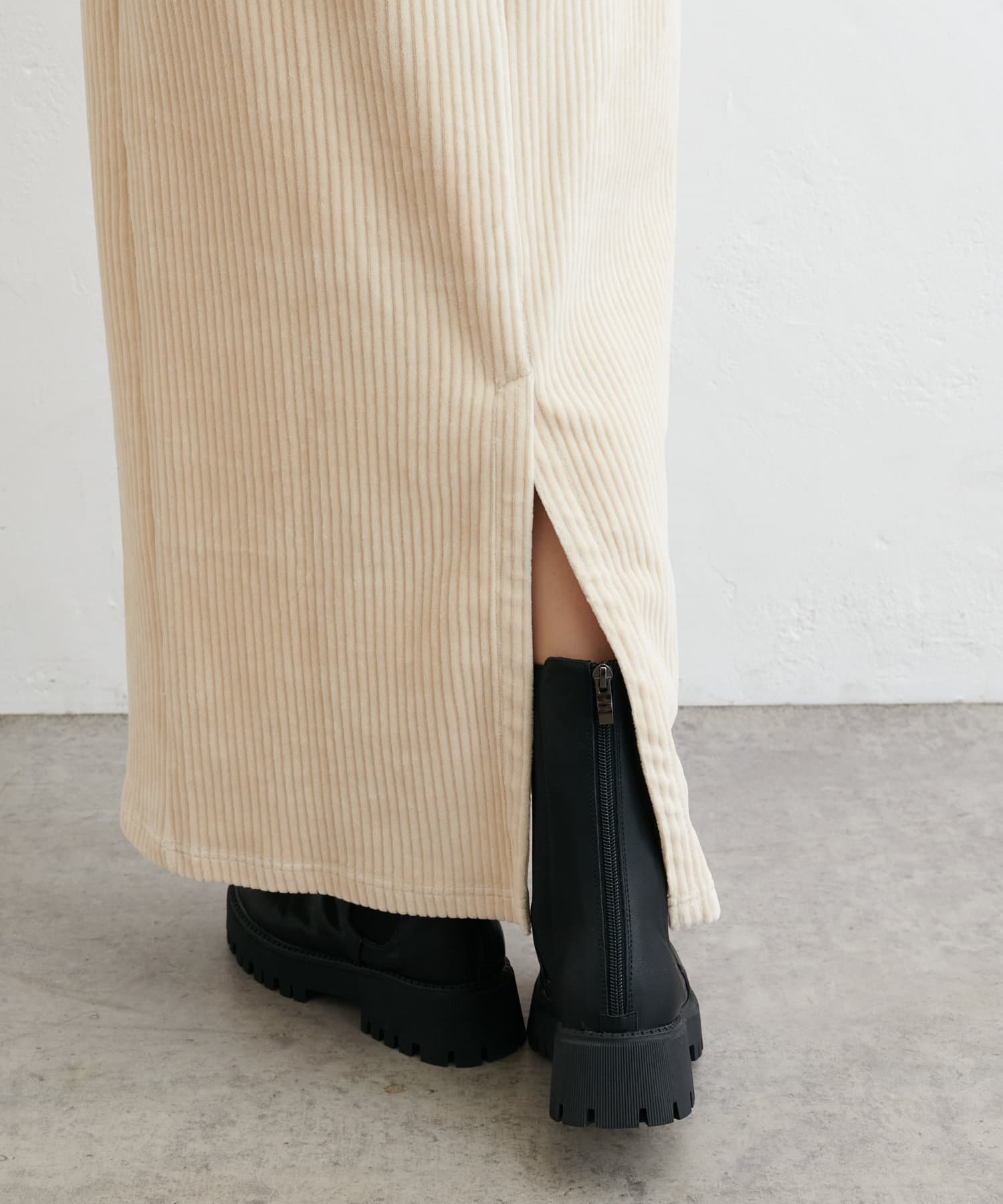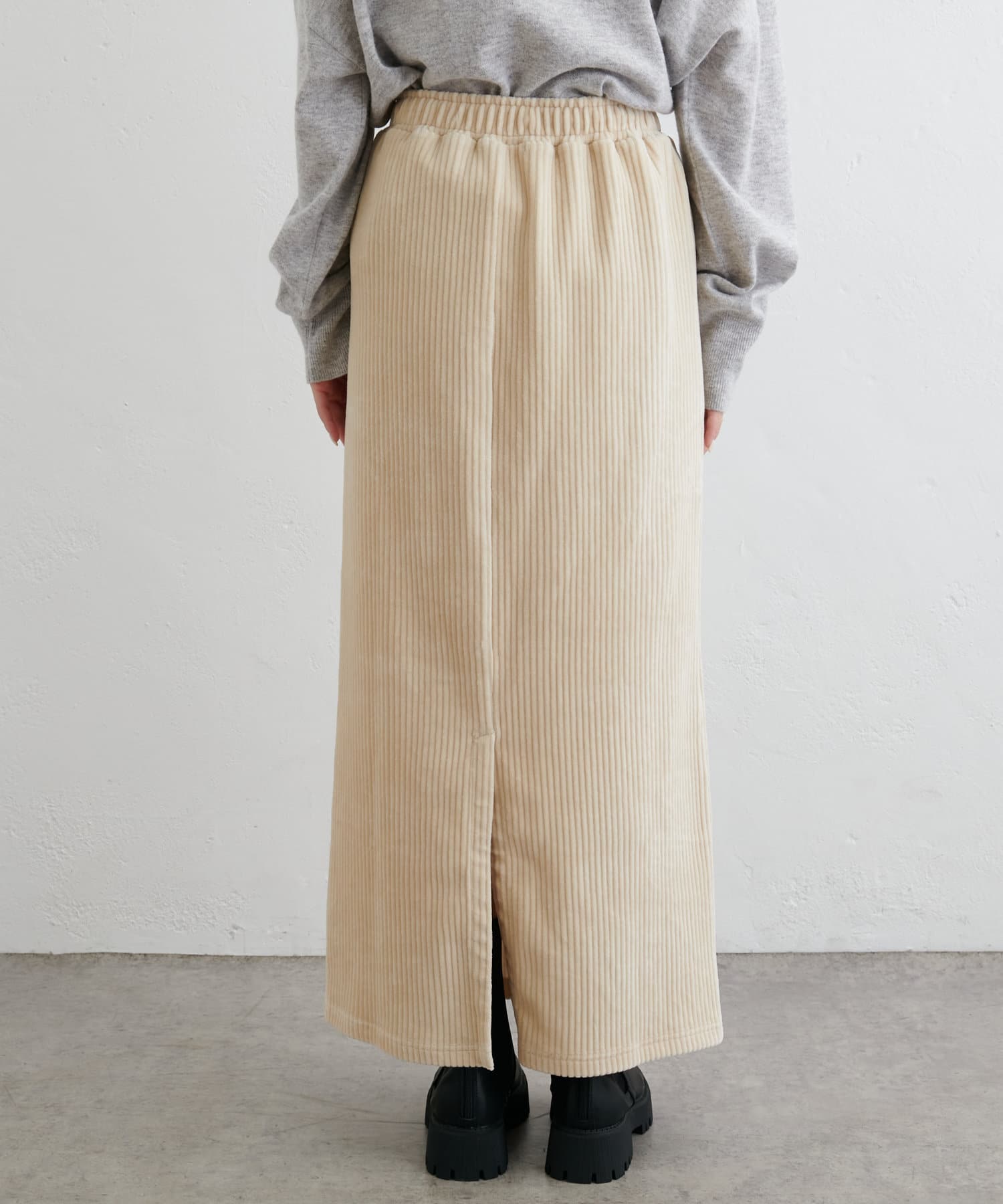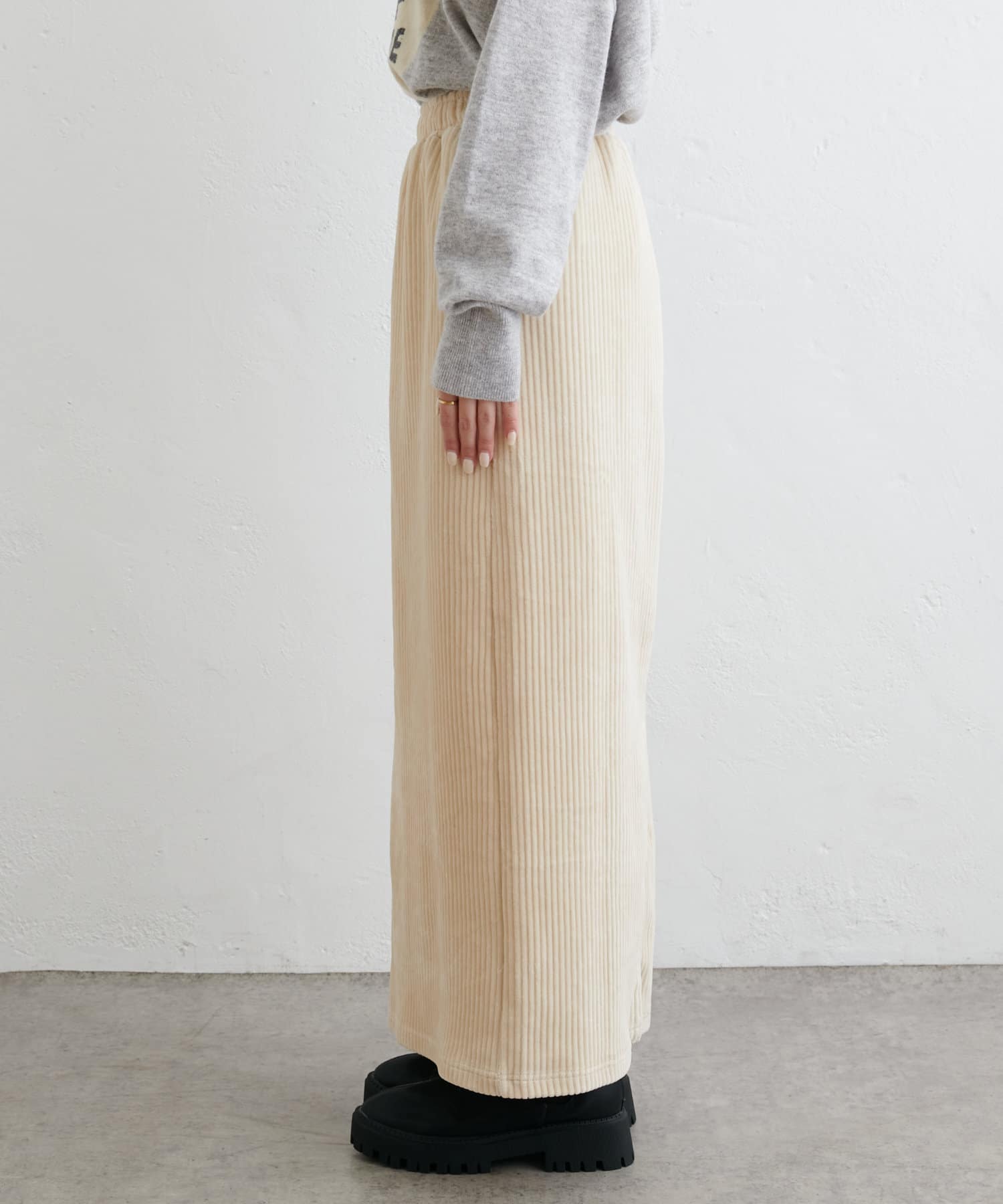 フィットしすぎず体のラインを拾いにくい絶妙なIラインシルエットが魅力のコールテンスカート。