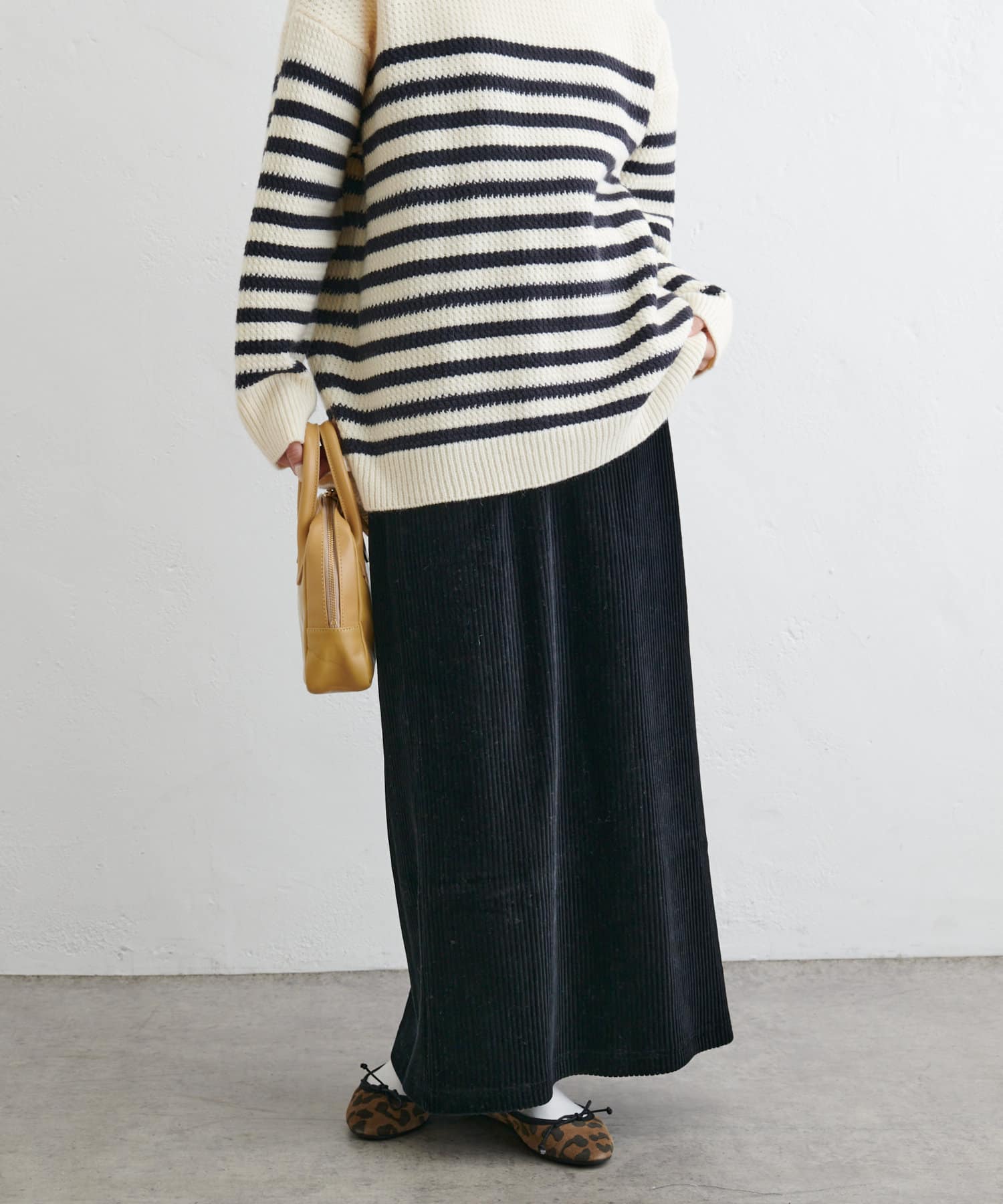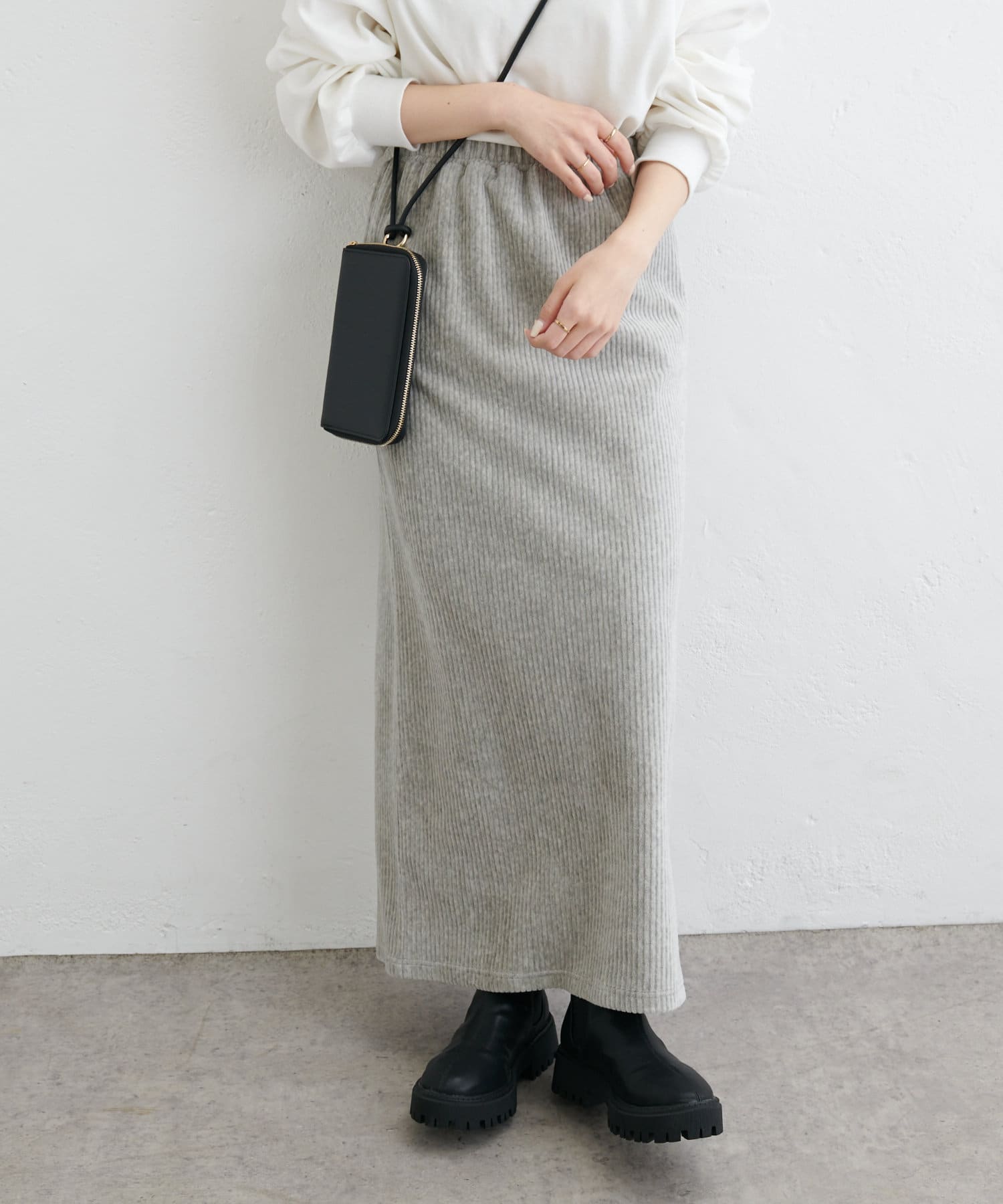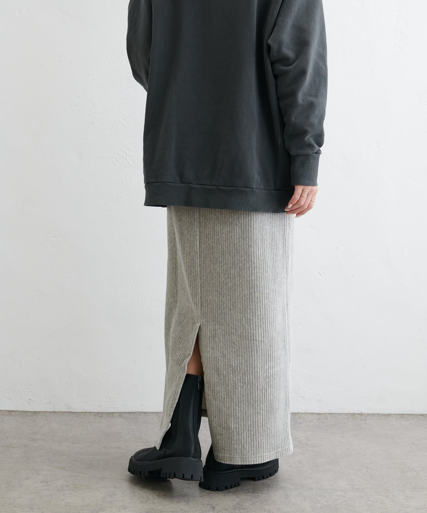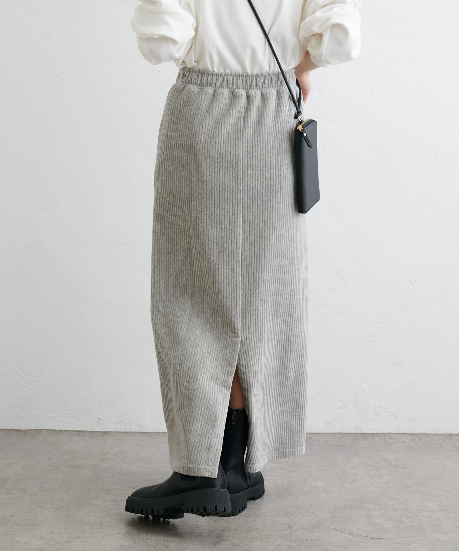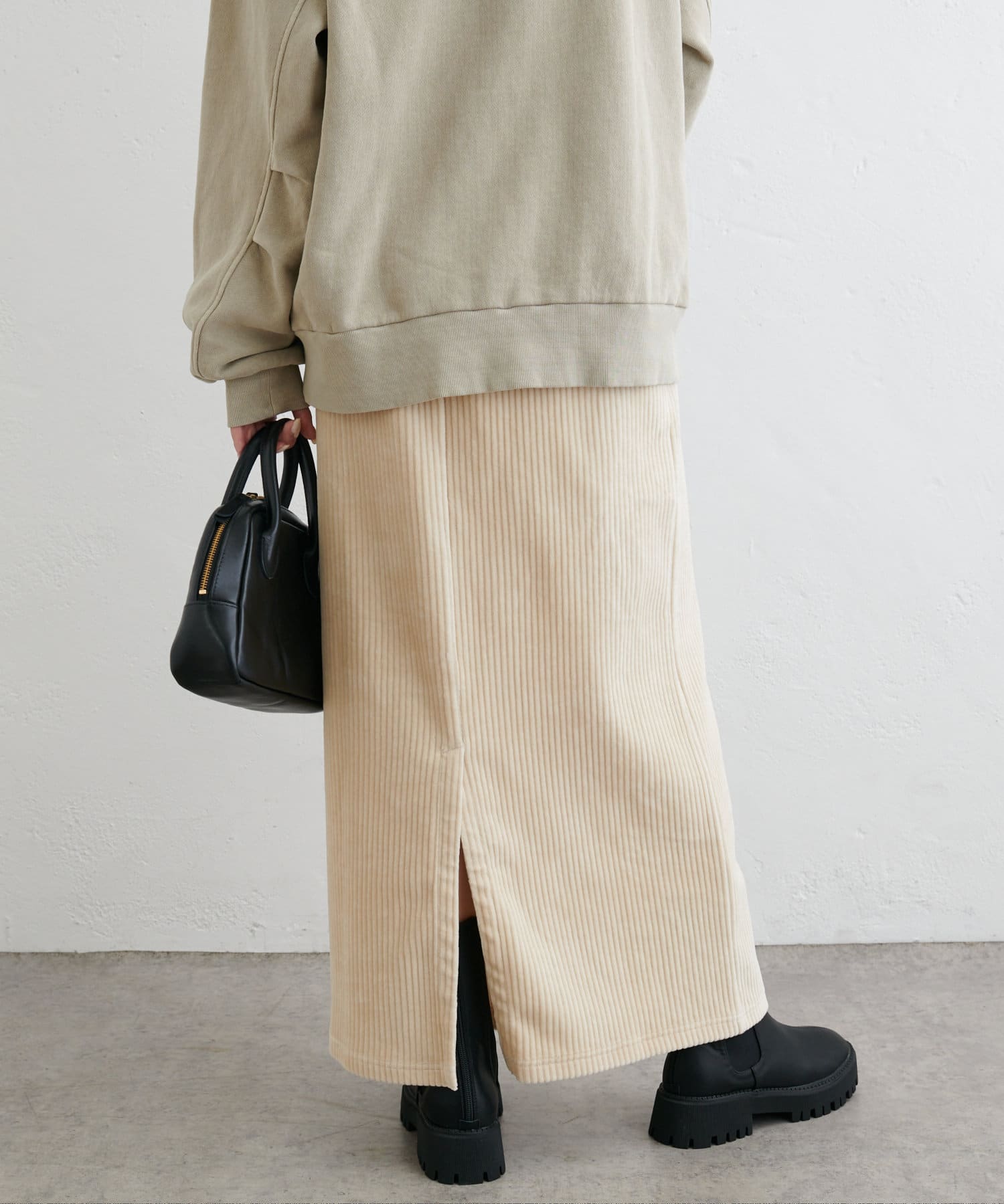 フィットしすぎず体のラインを拾いにくい絶妙なIラインシルエットが魅力のコールテンスカート。