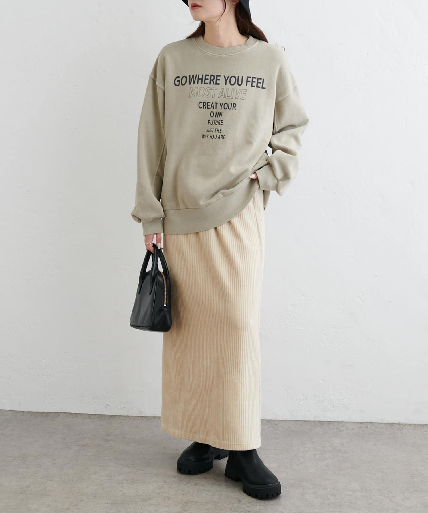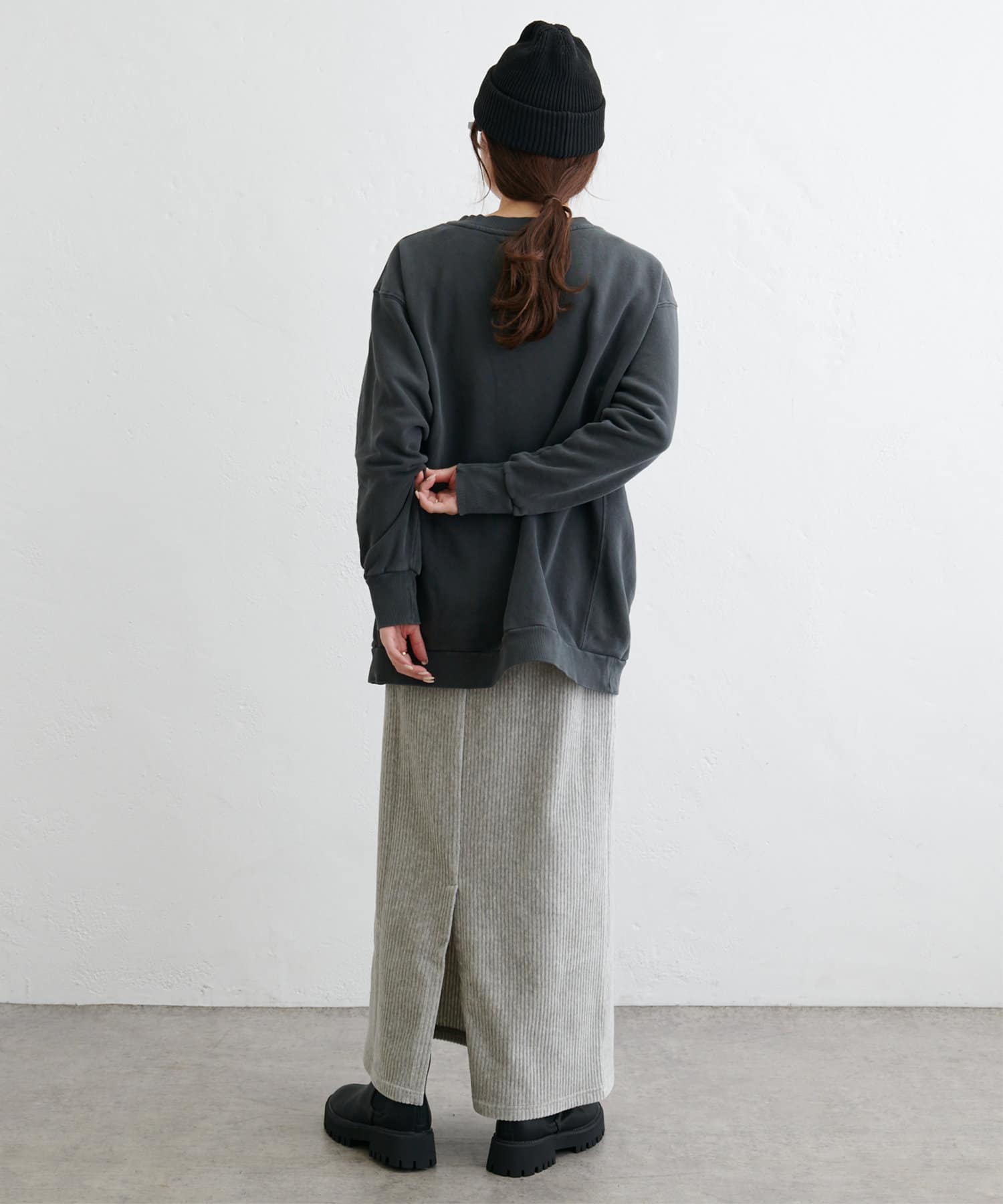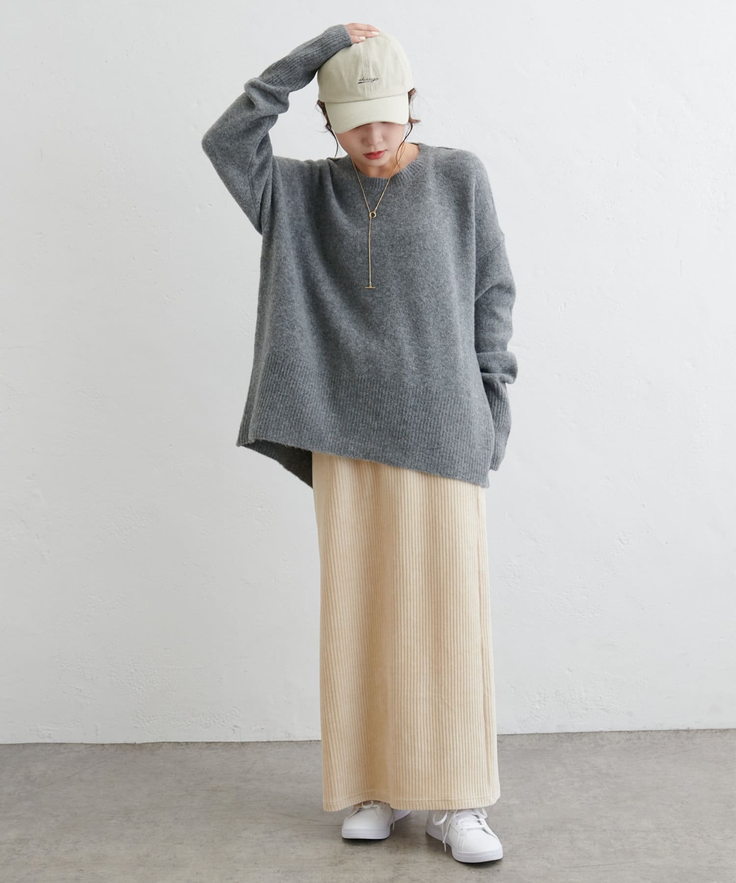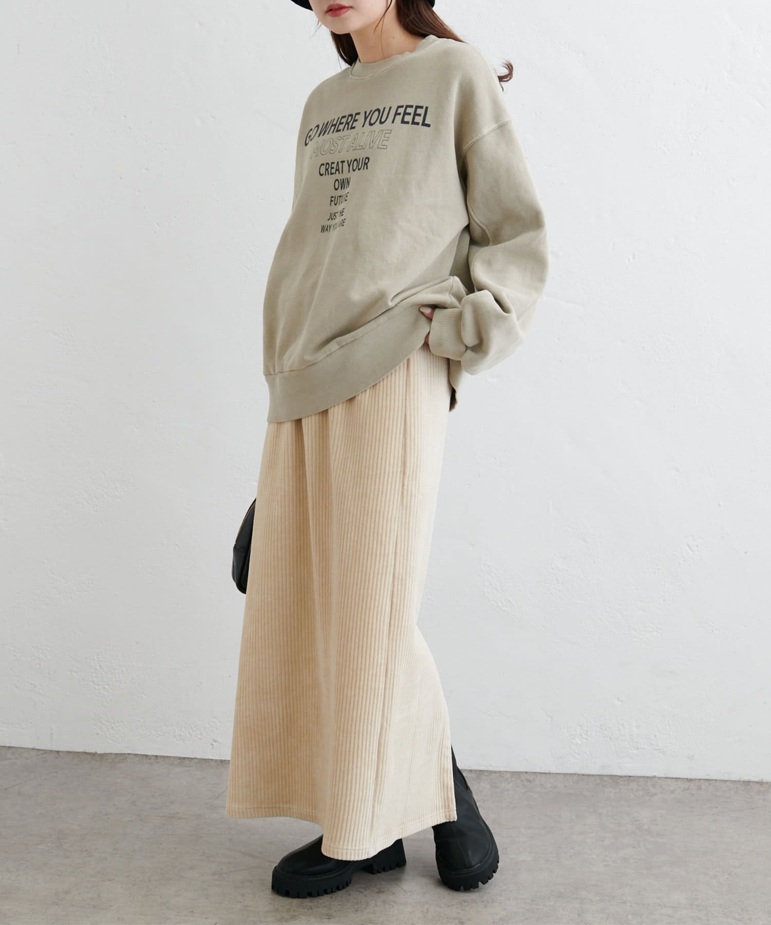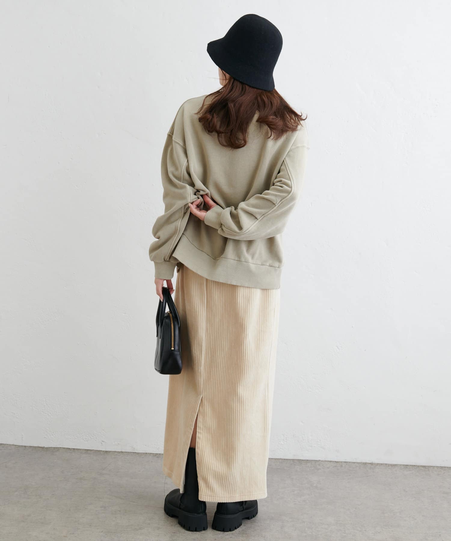 フィットしすぎず体のラインを拾いにくい絶妙なIラインシルエットが魅力のコールテンスカート。