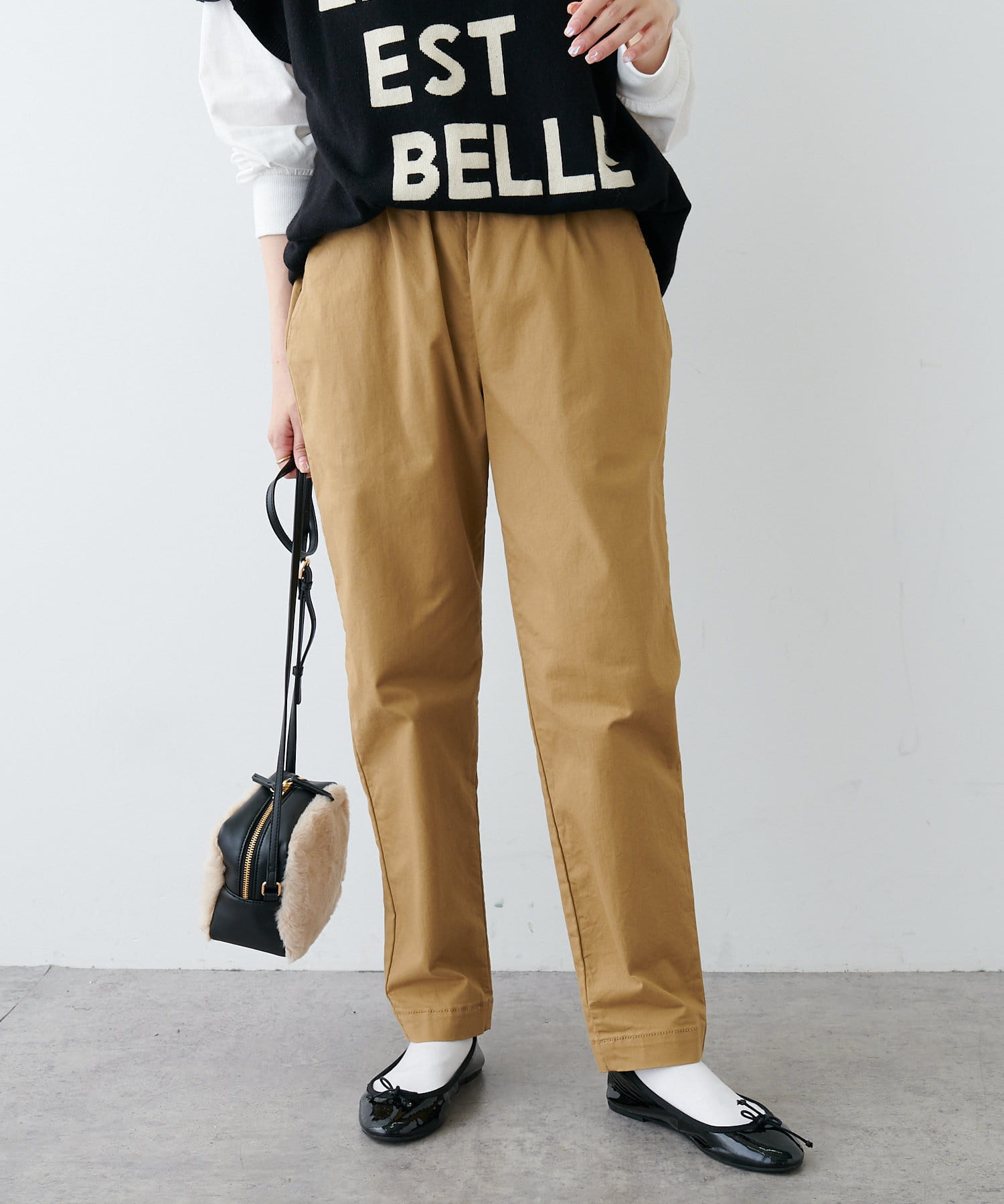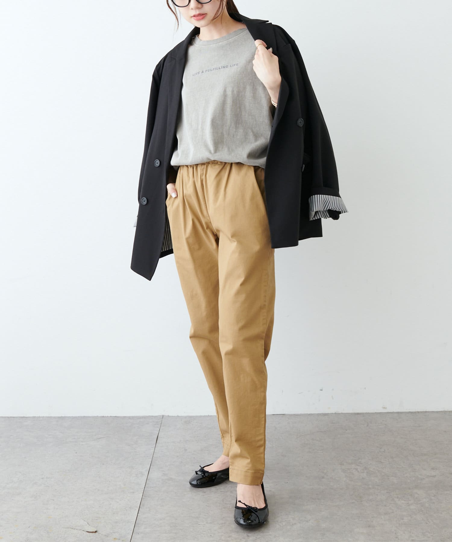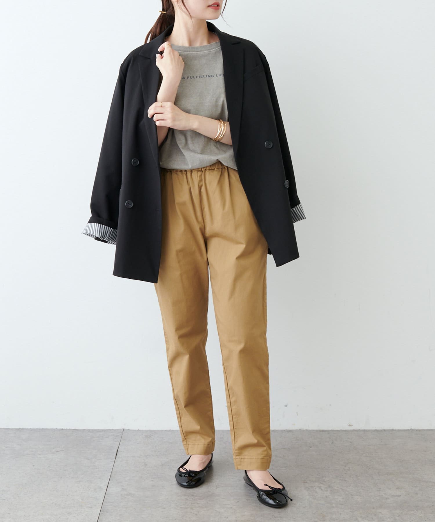 ハリのある生地を使用しているので、ラフな雰囲気になりすぎずきちんと感を演出。