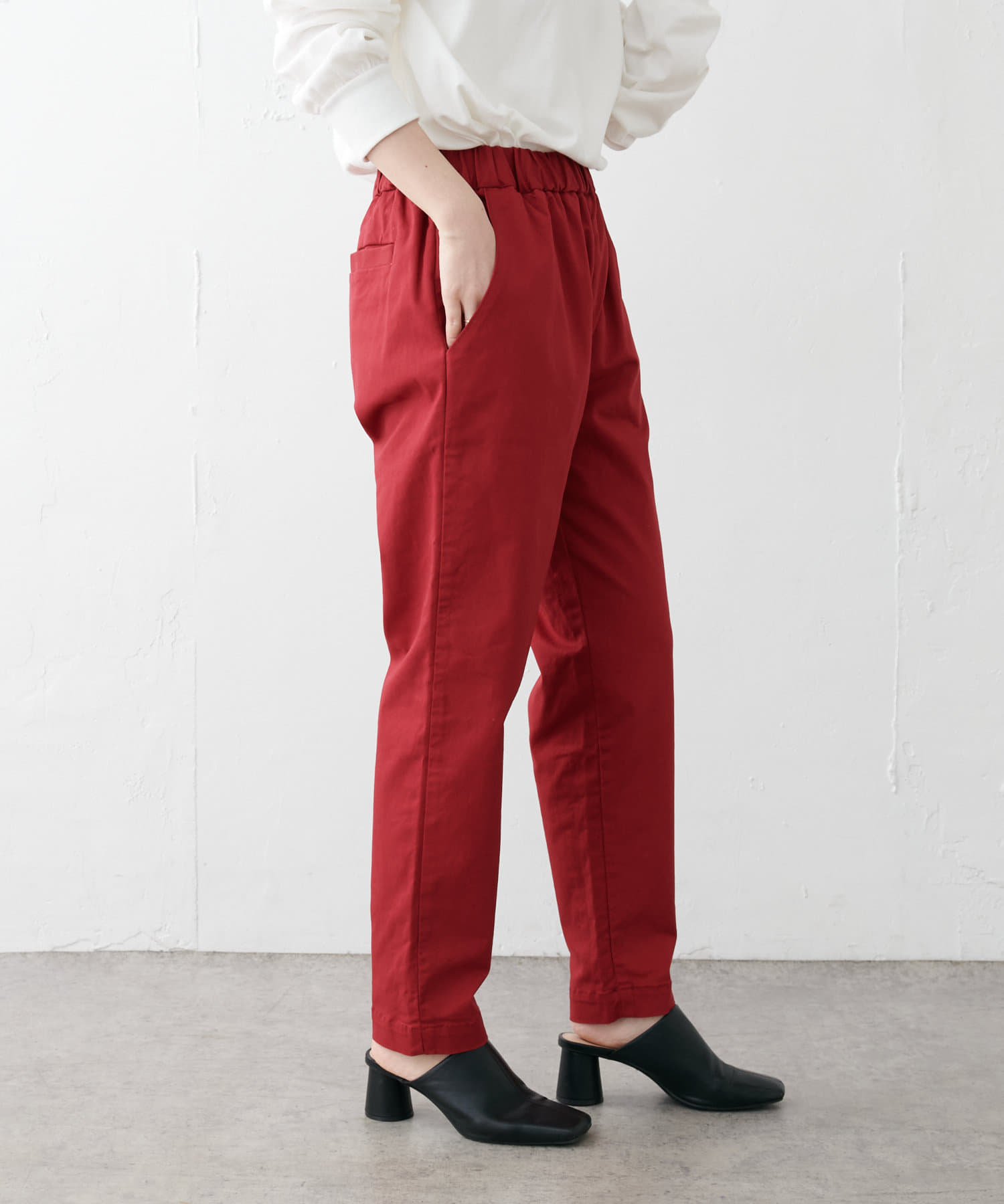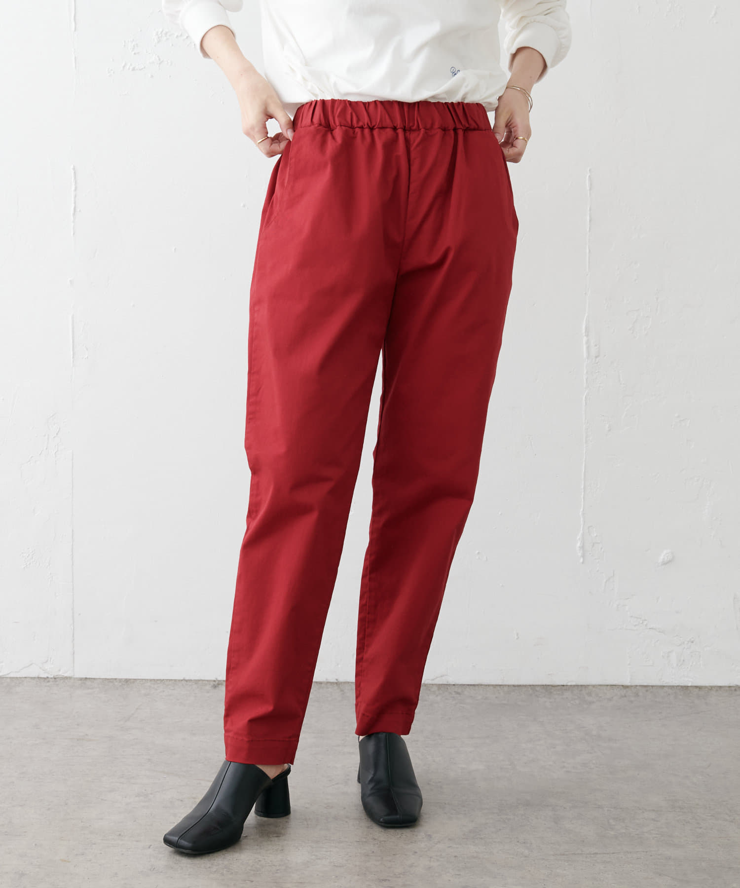 落ちついた色の赤だったので秋にピッタリのパンツである。ストレッチもあるので履きやすい。