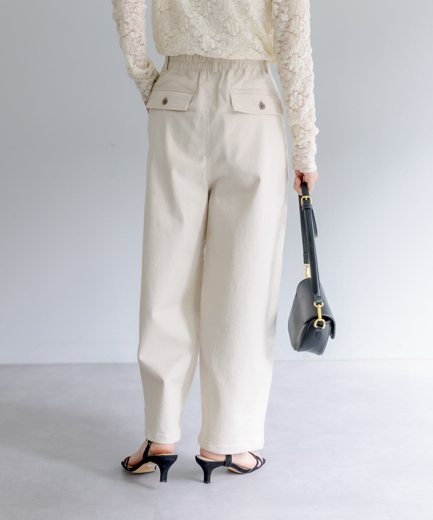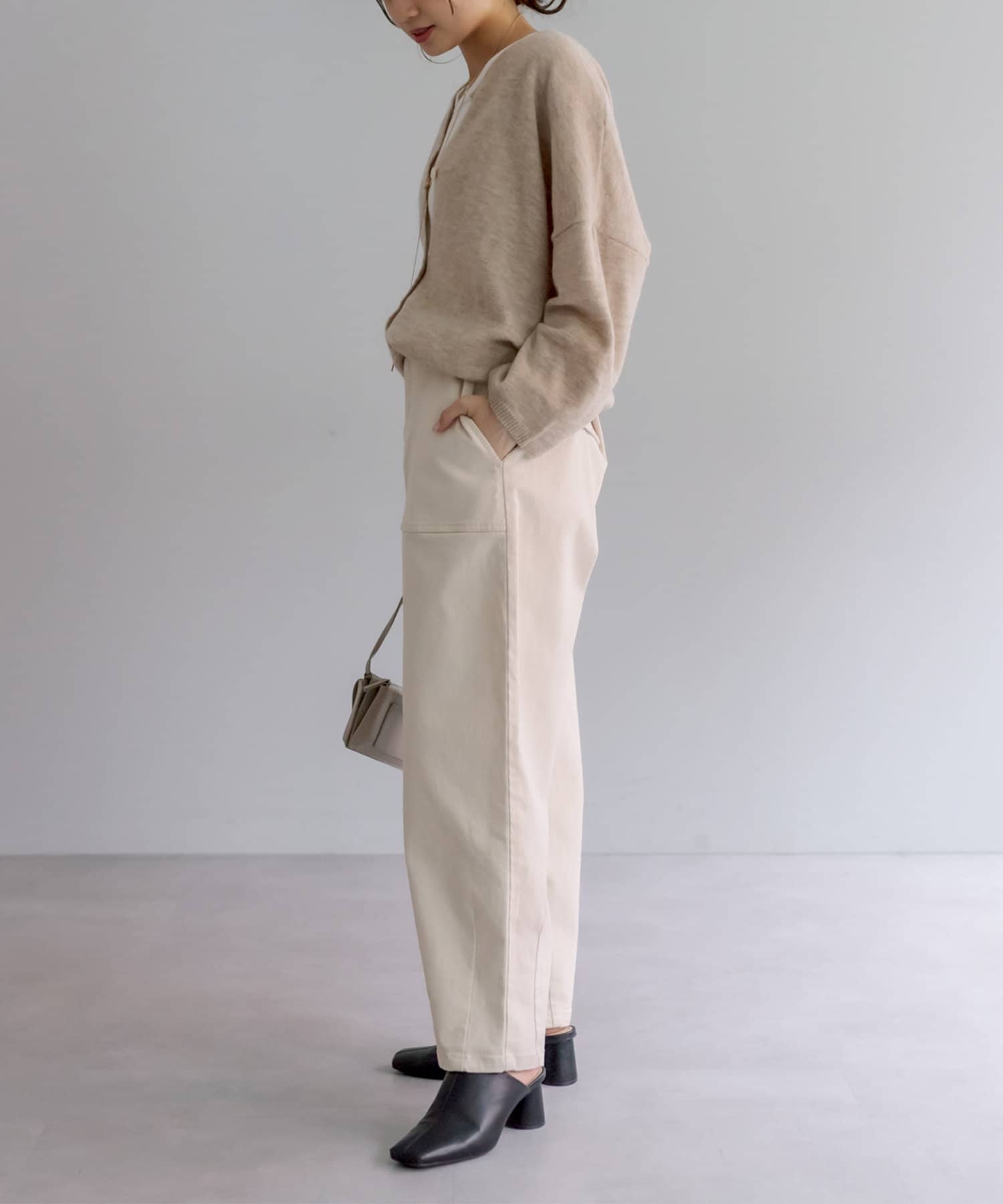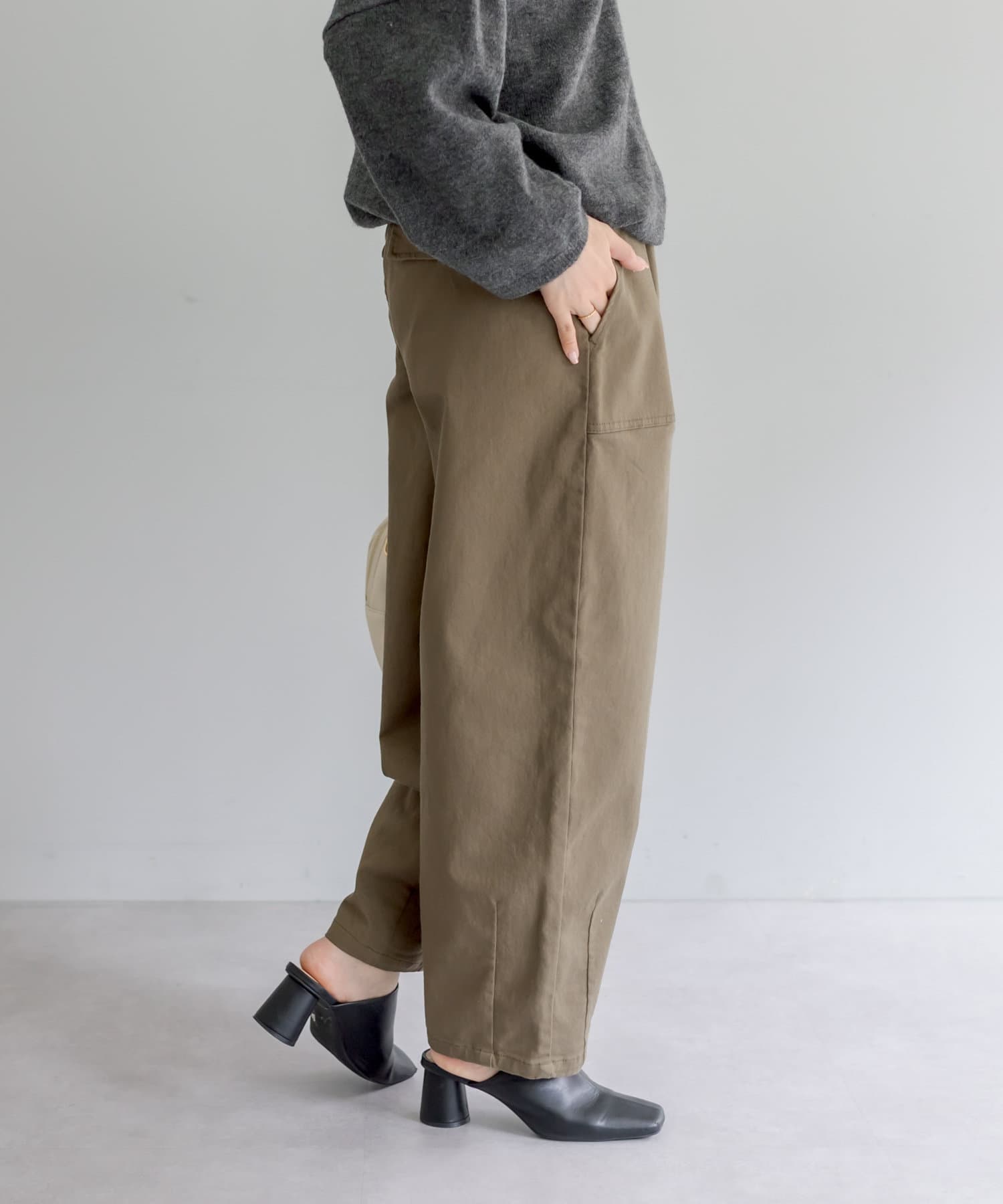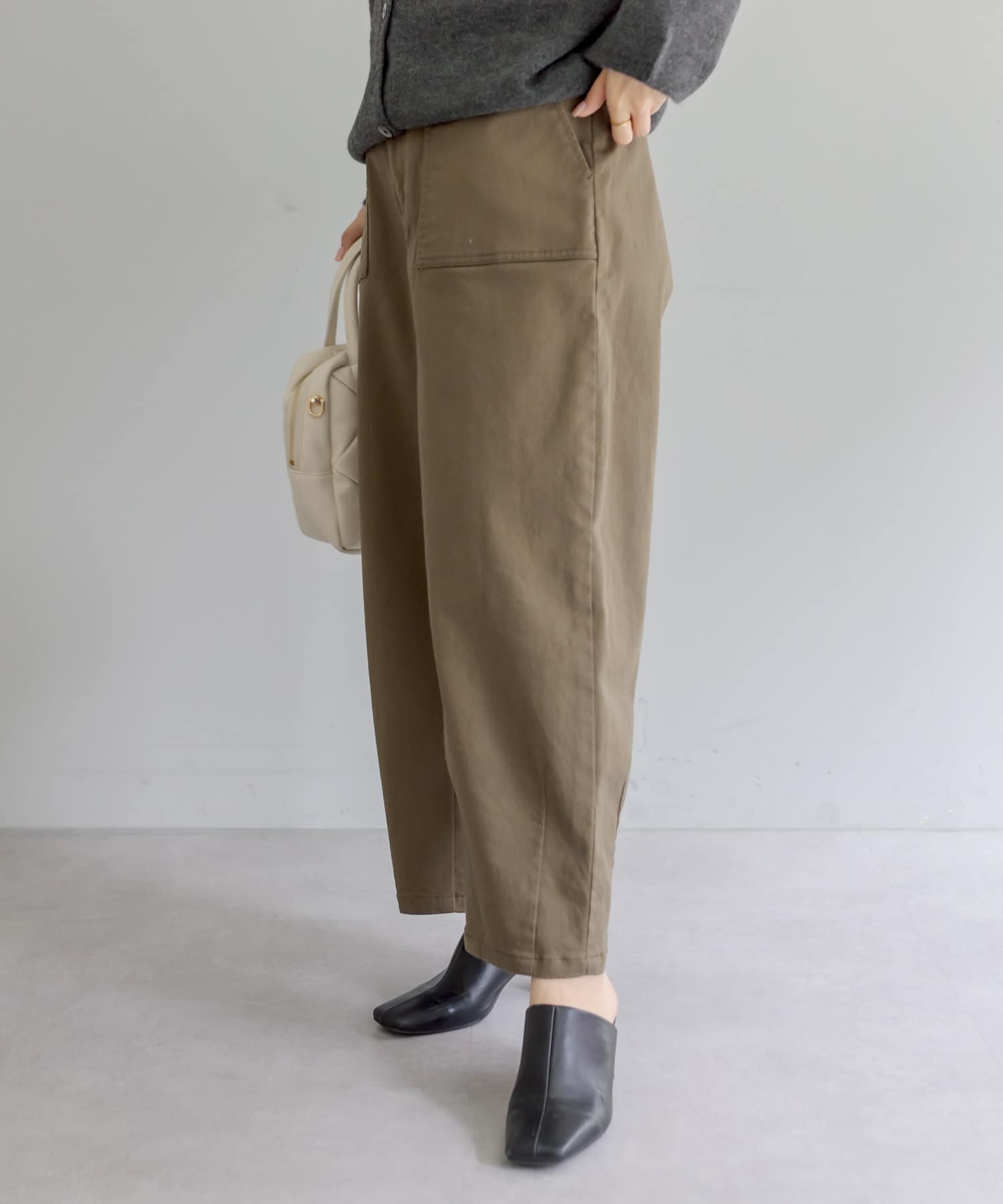 ゆったりとしたルーズなシルエットと、大きめのポケットが目を引くイージーパンツ。