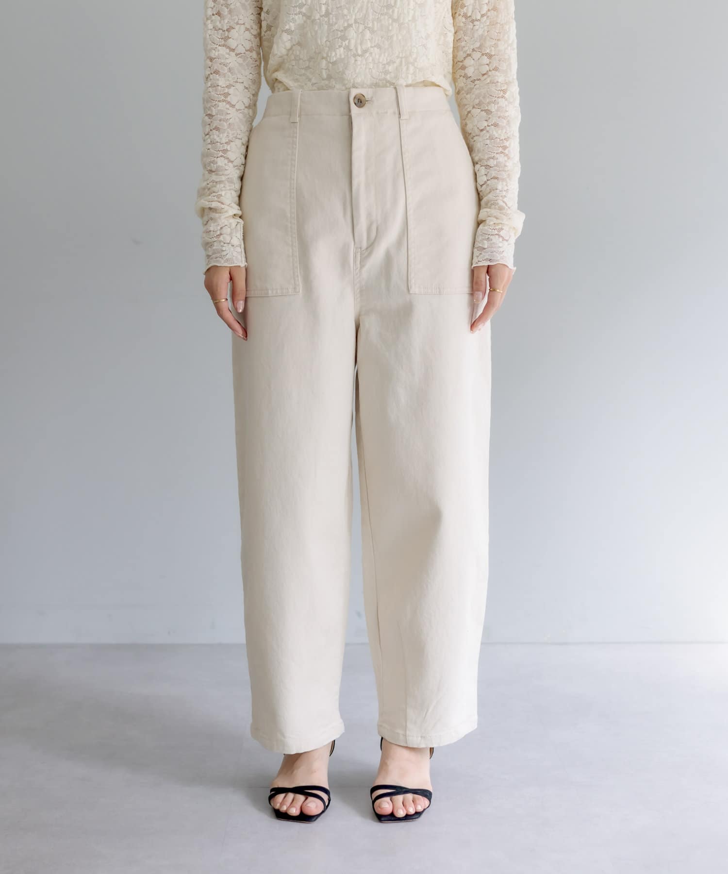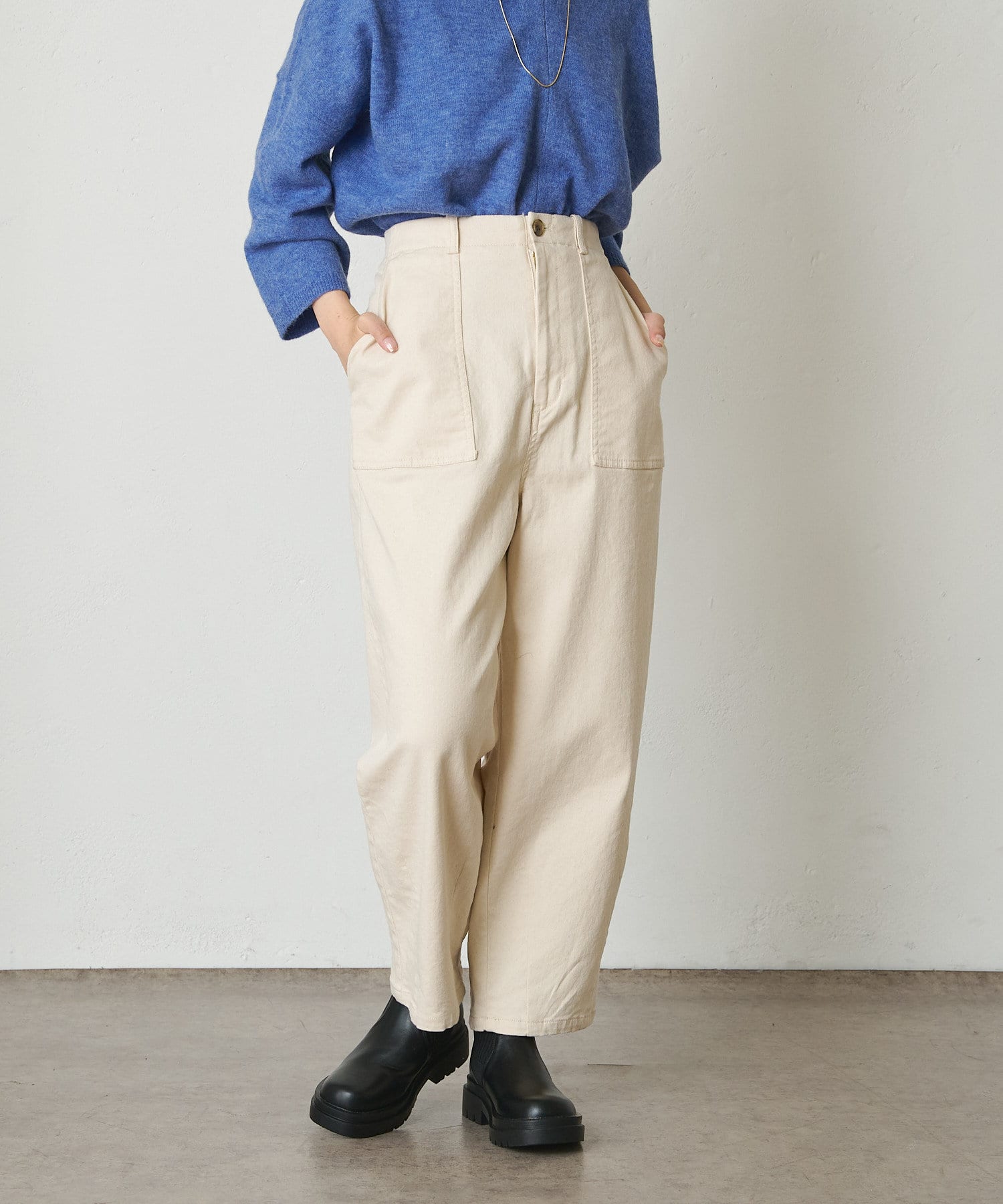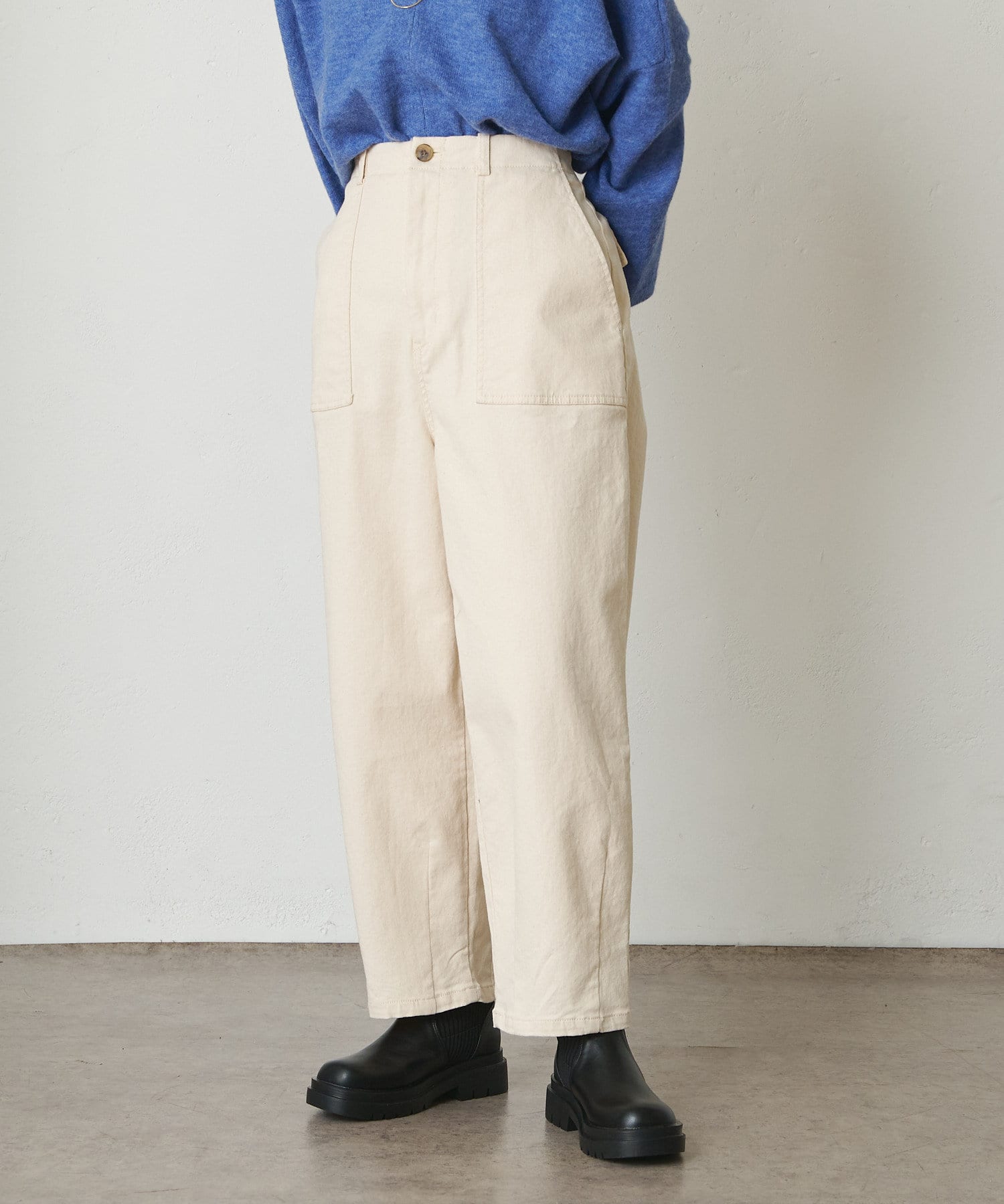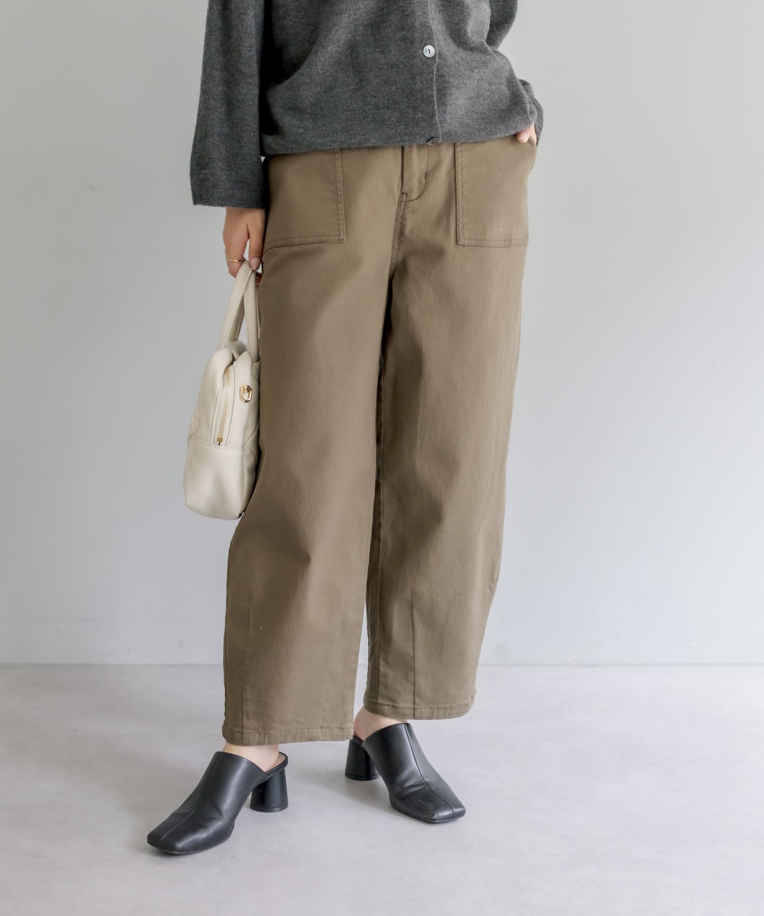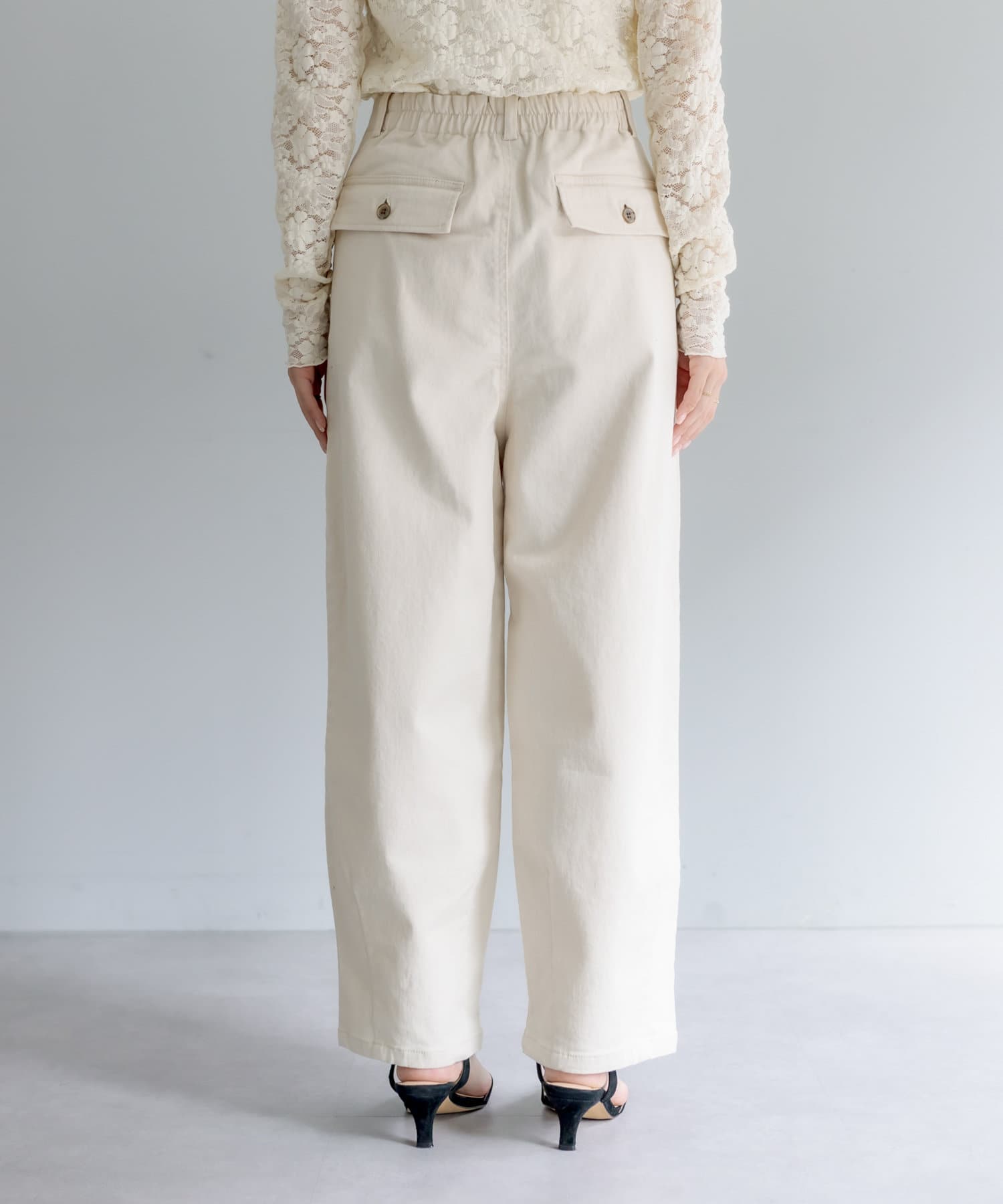 ゆったりとしたルーズなシルエットと、大きめのポケットが目を引くイージーパンツ。