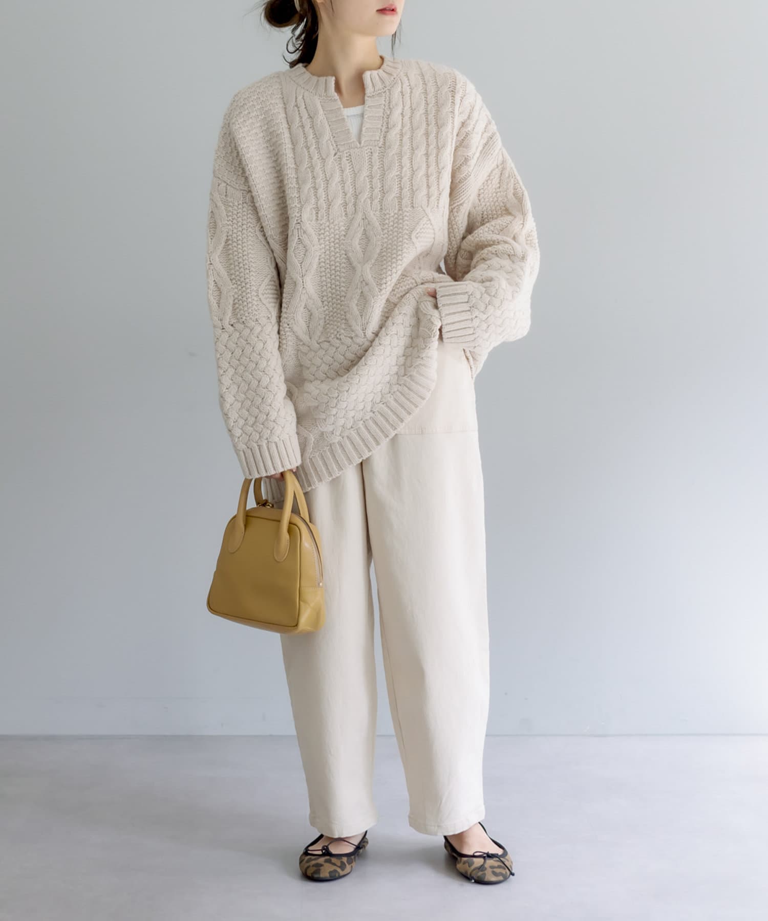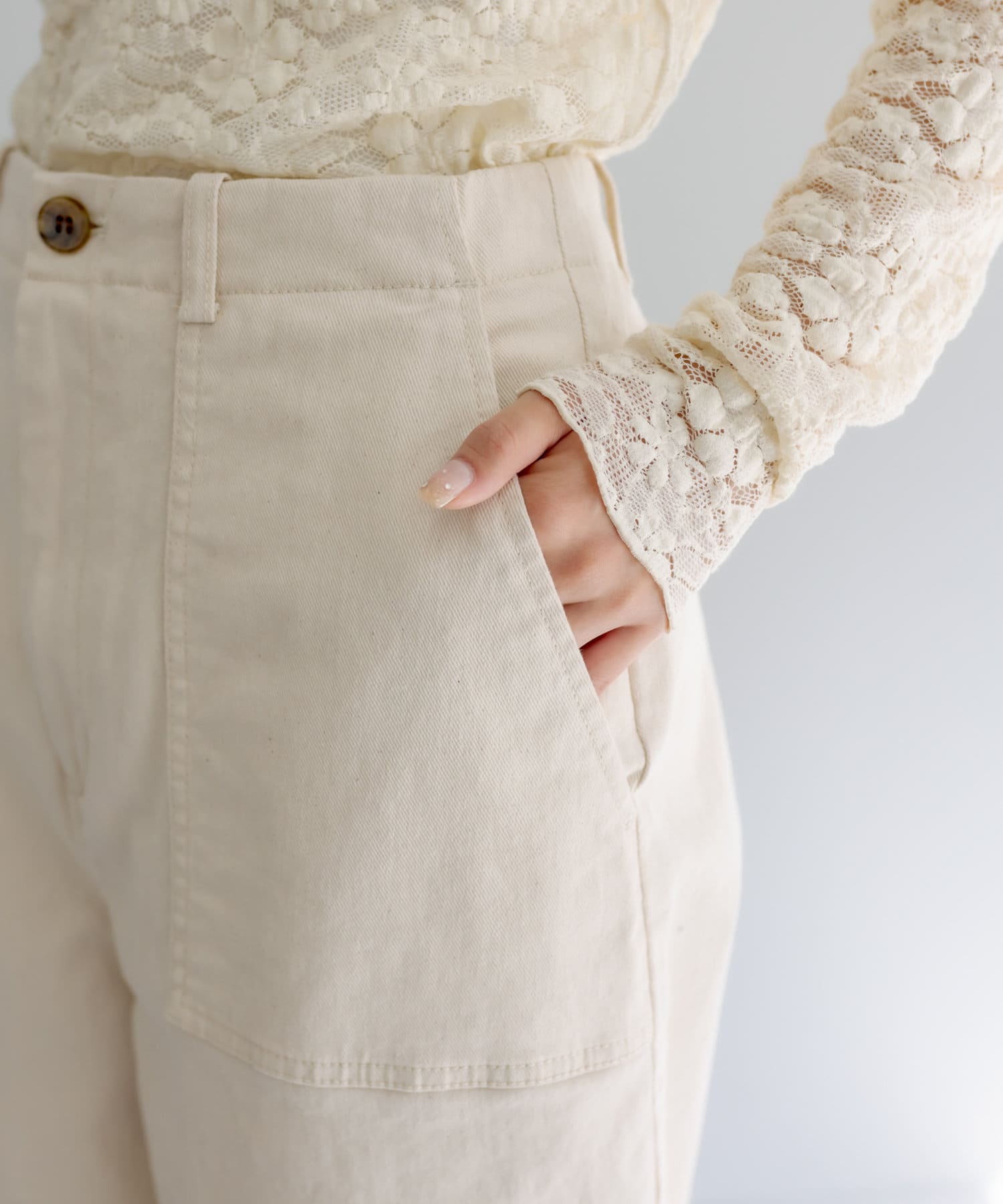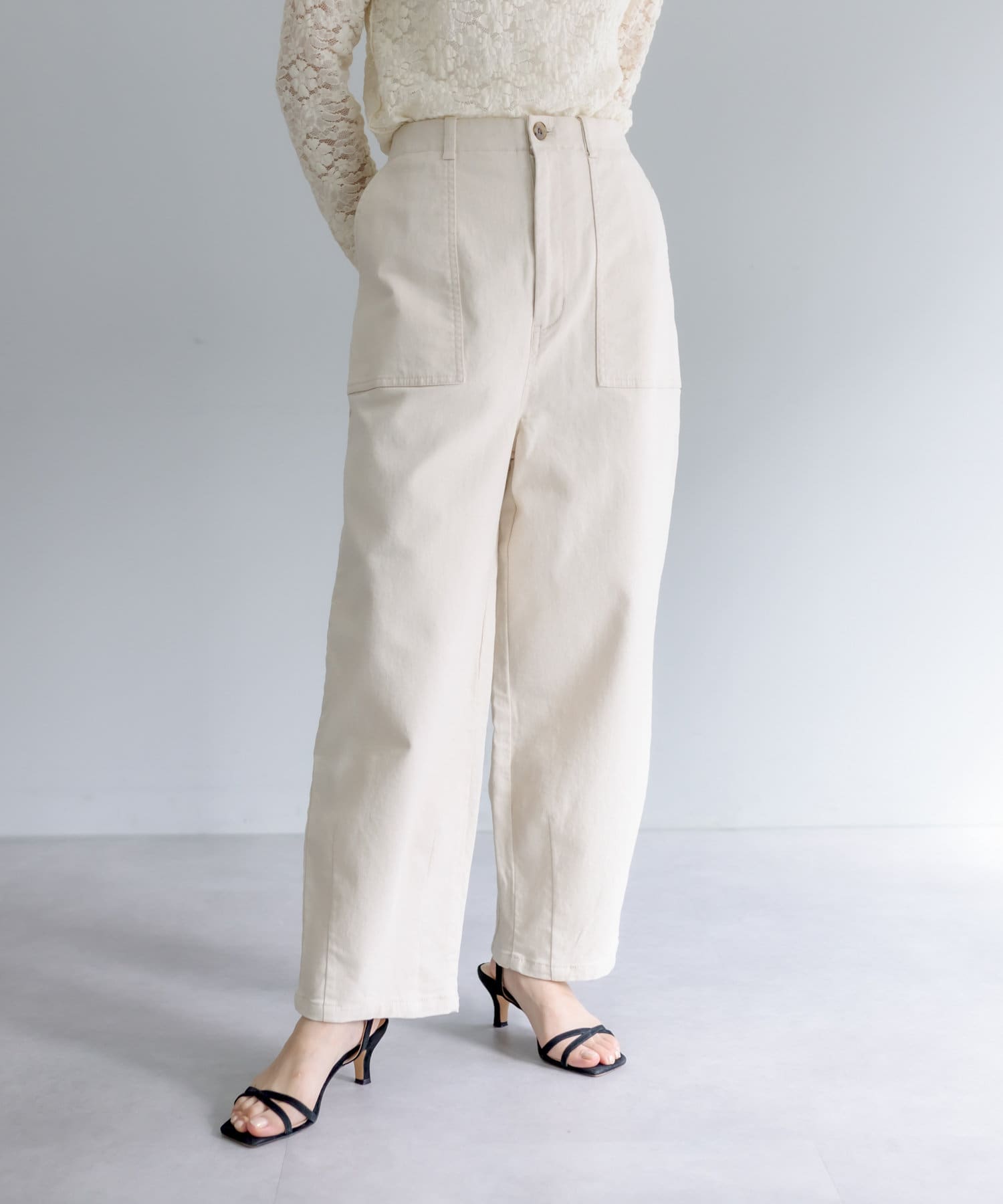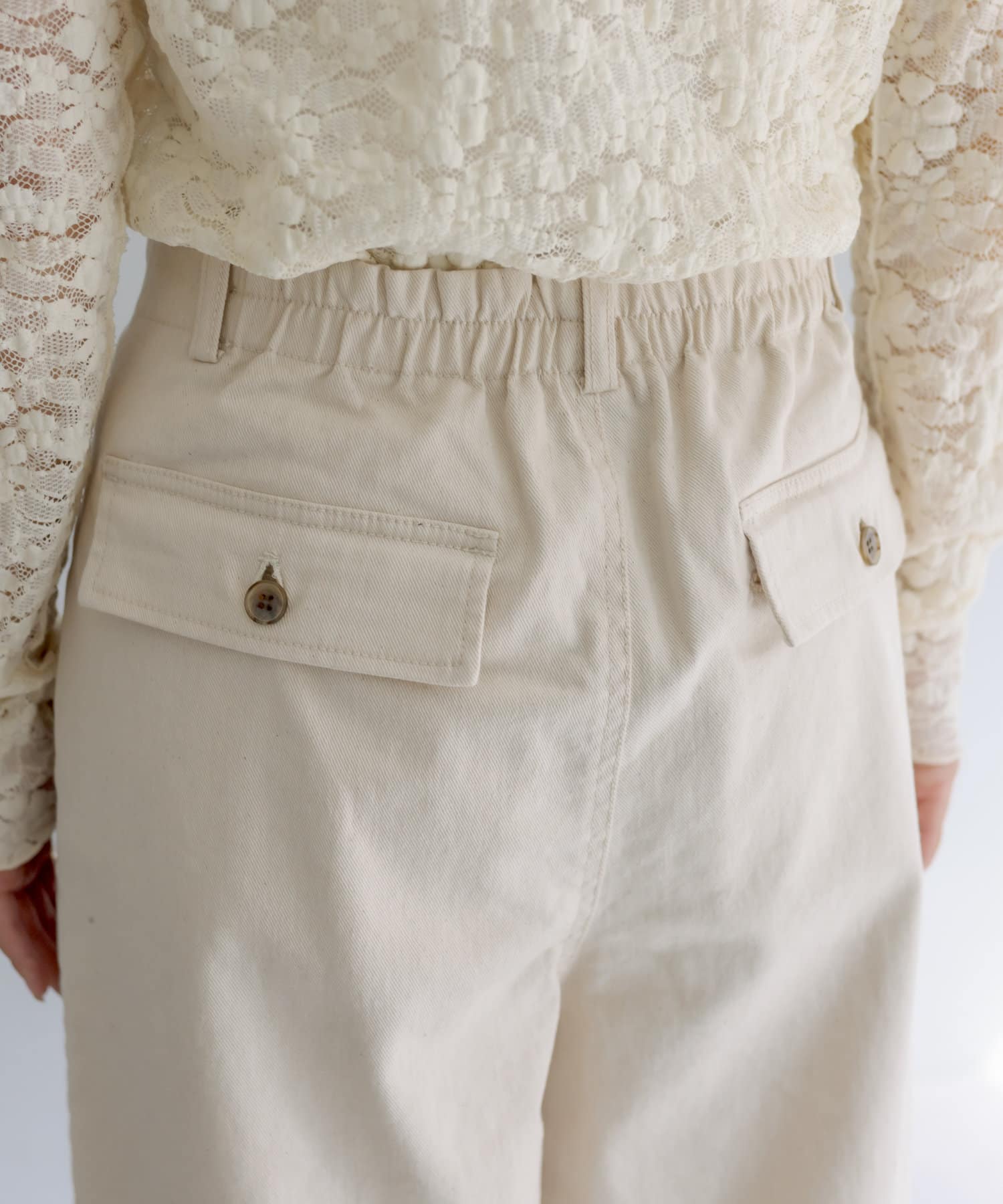 ゆったりとしたルーズなシルエットと、大きめのポケットが目を引くイージーパンツ。