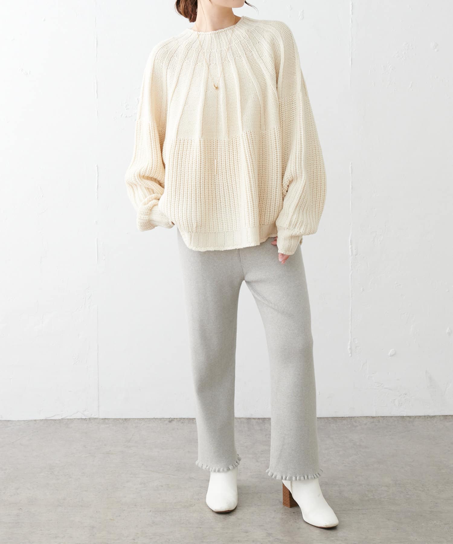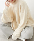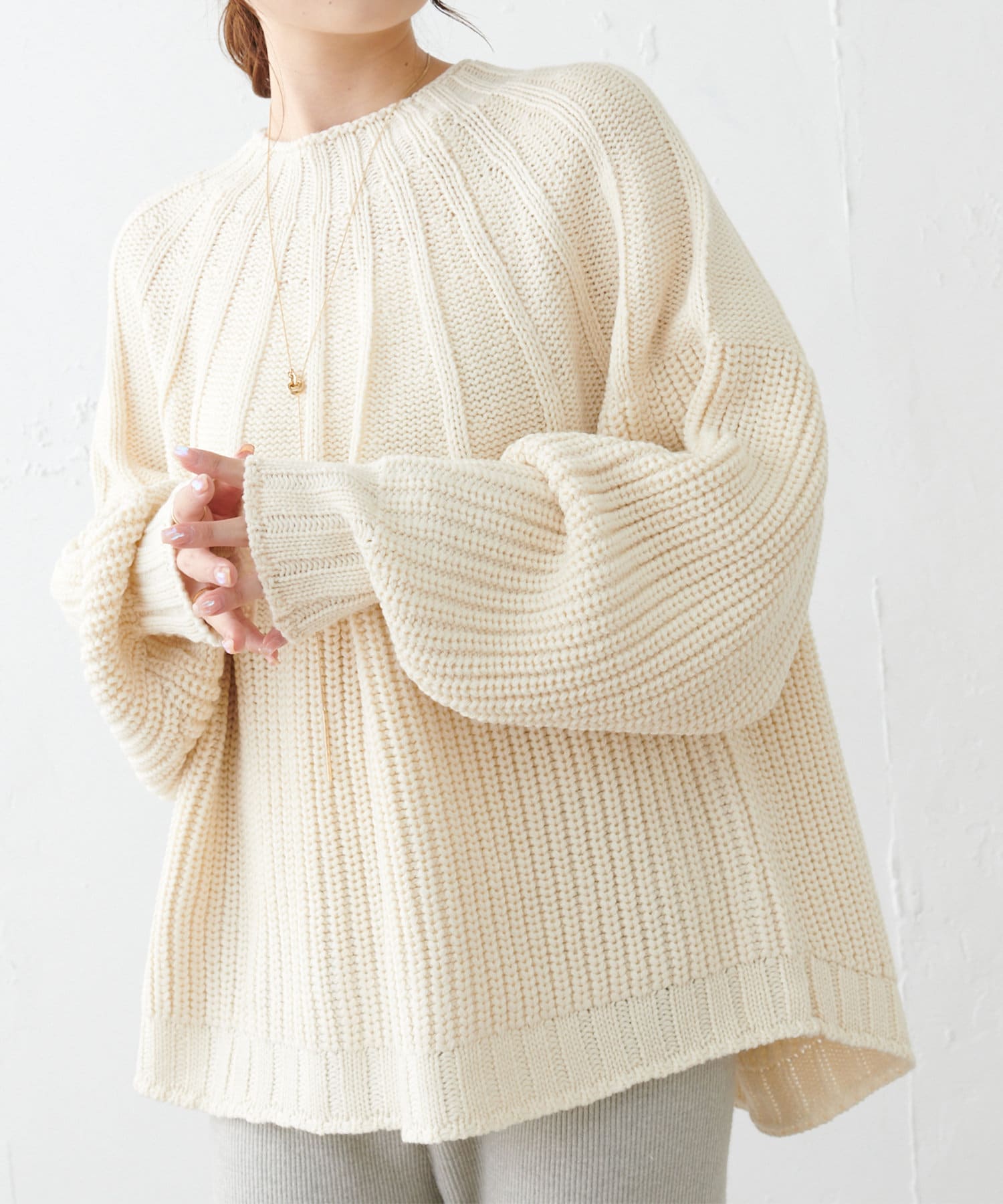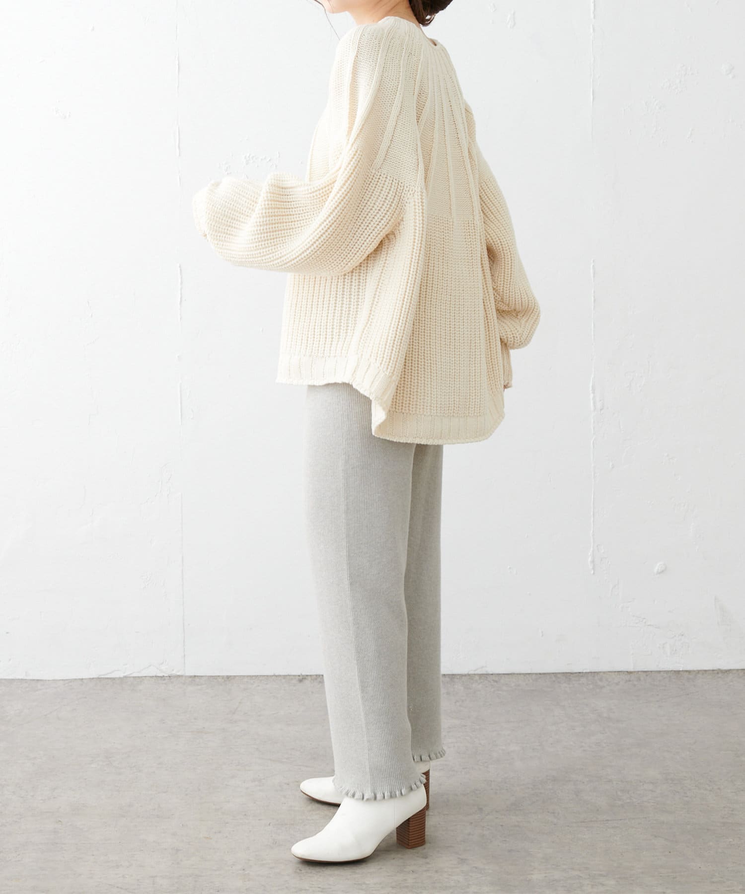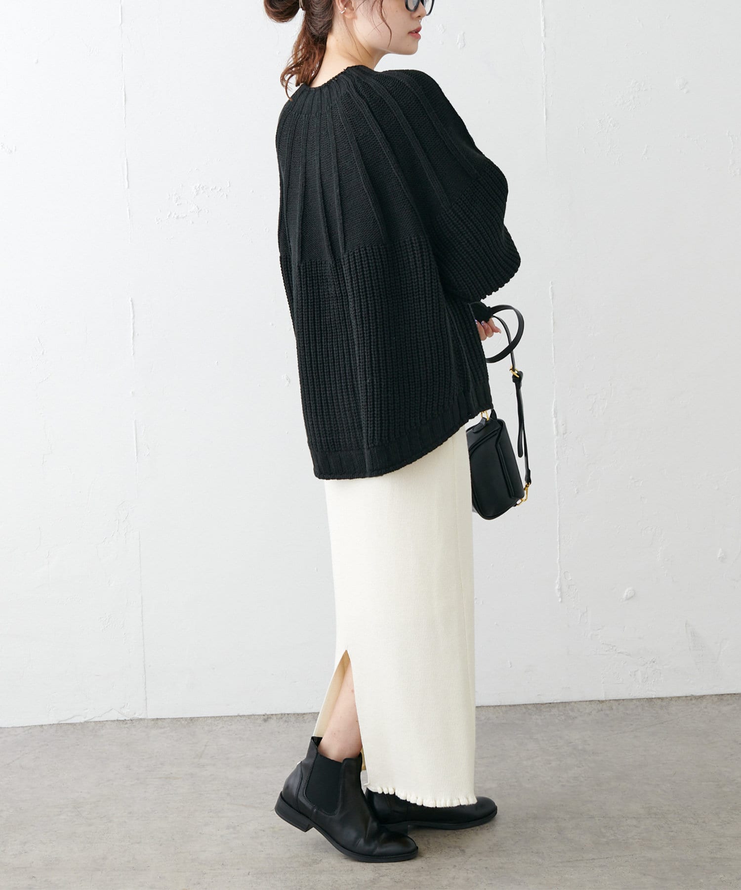 ボトムスを選ばないミドル丈に、ふっくらボリューム感が可愛らしいニットです。