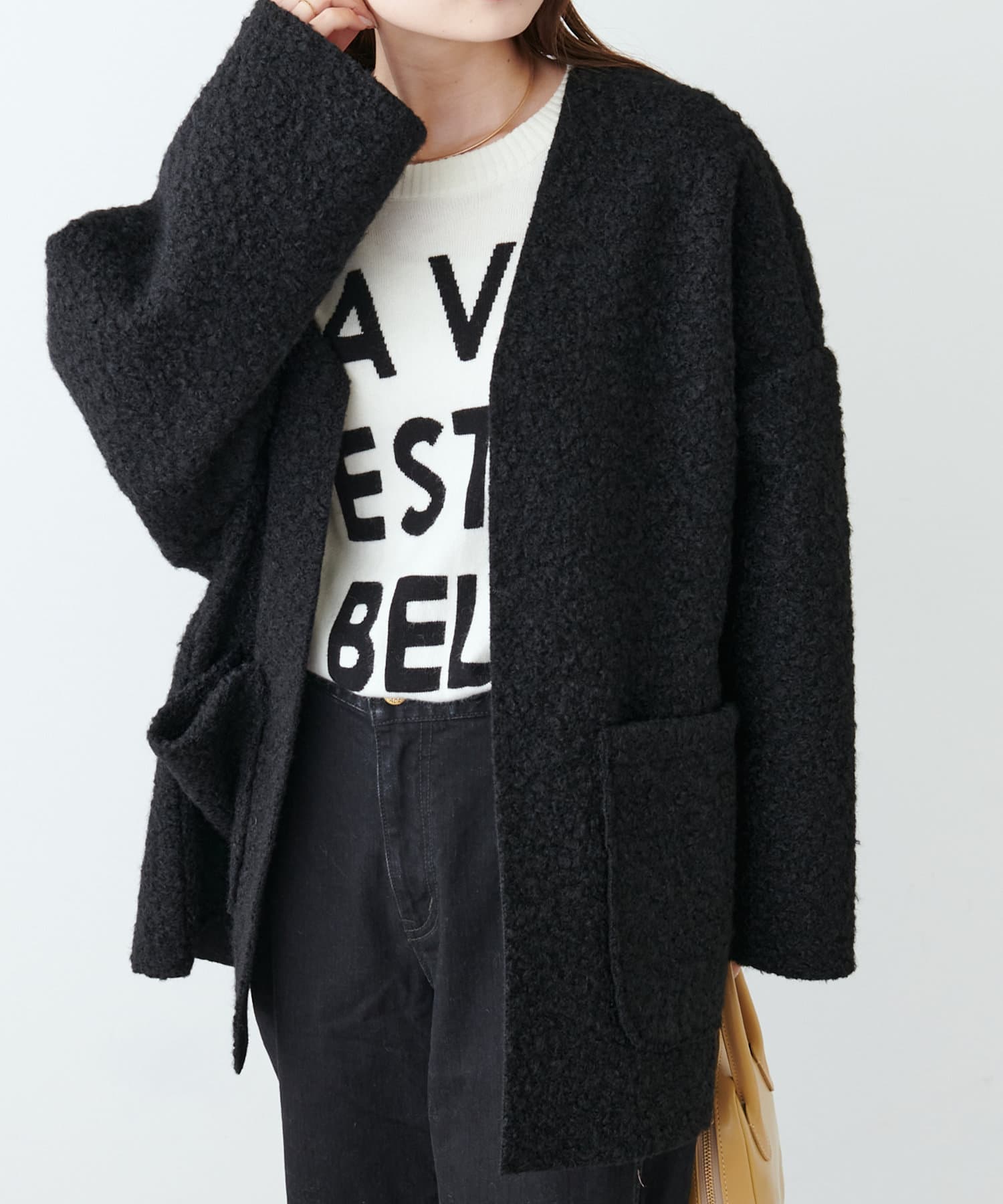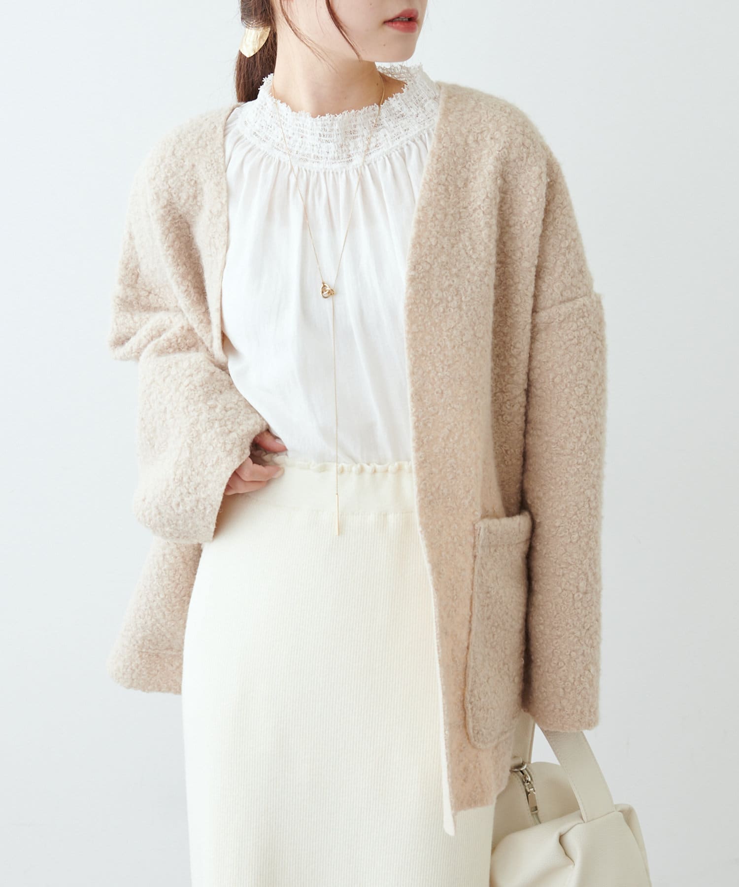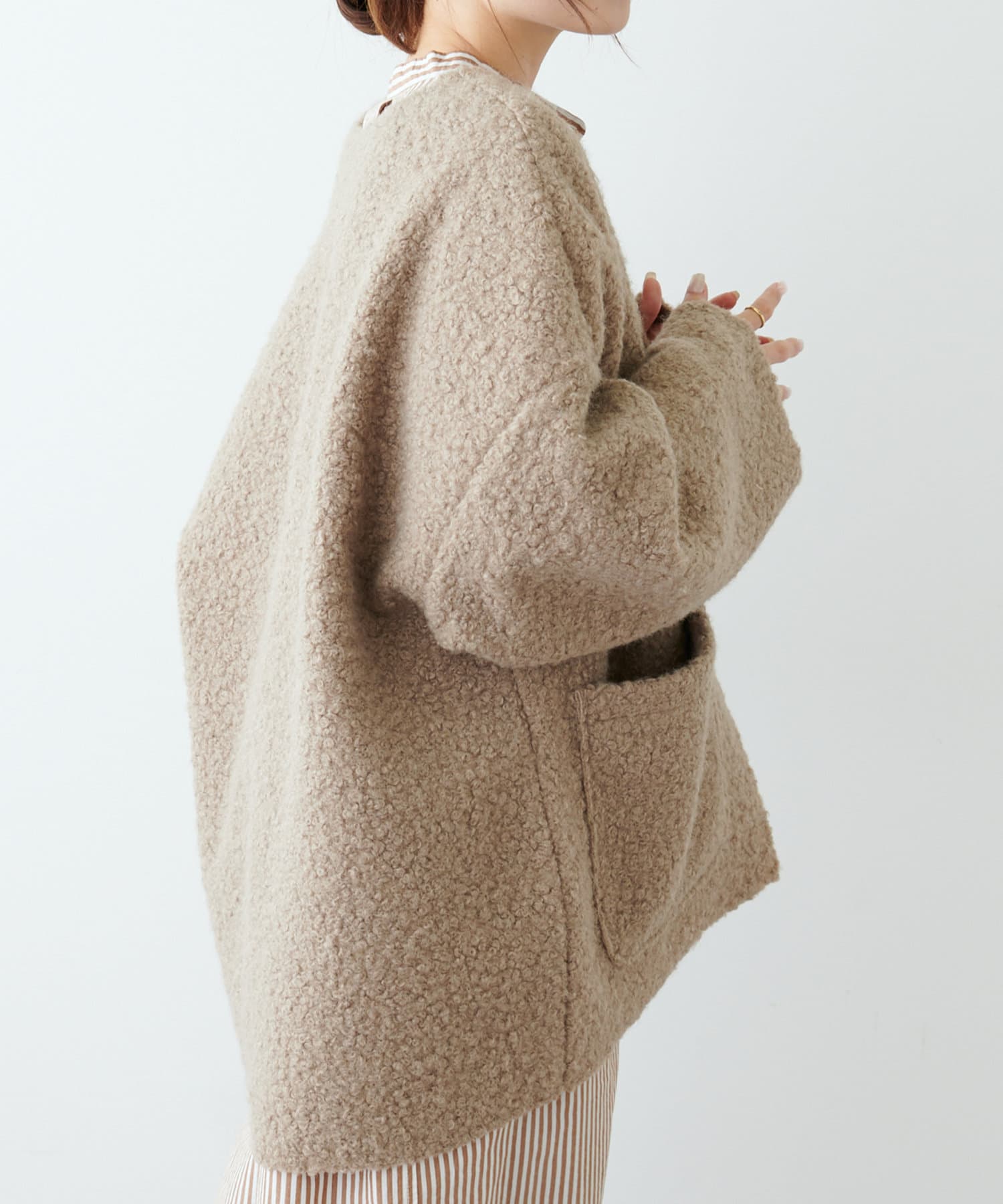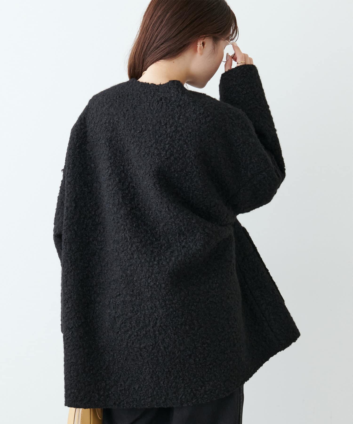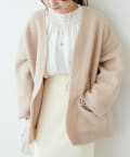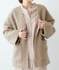 くるんとカールした表情豊かなフェイクウールカーディガン。