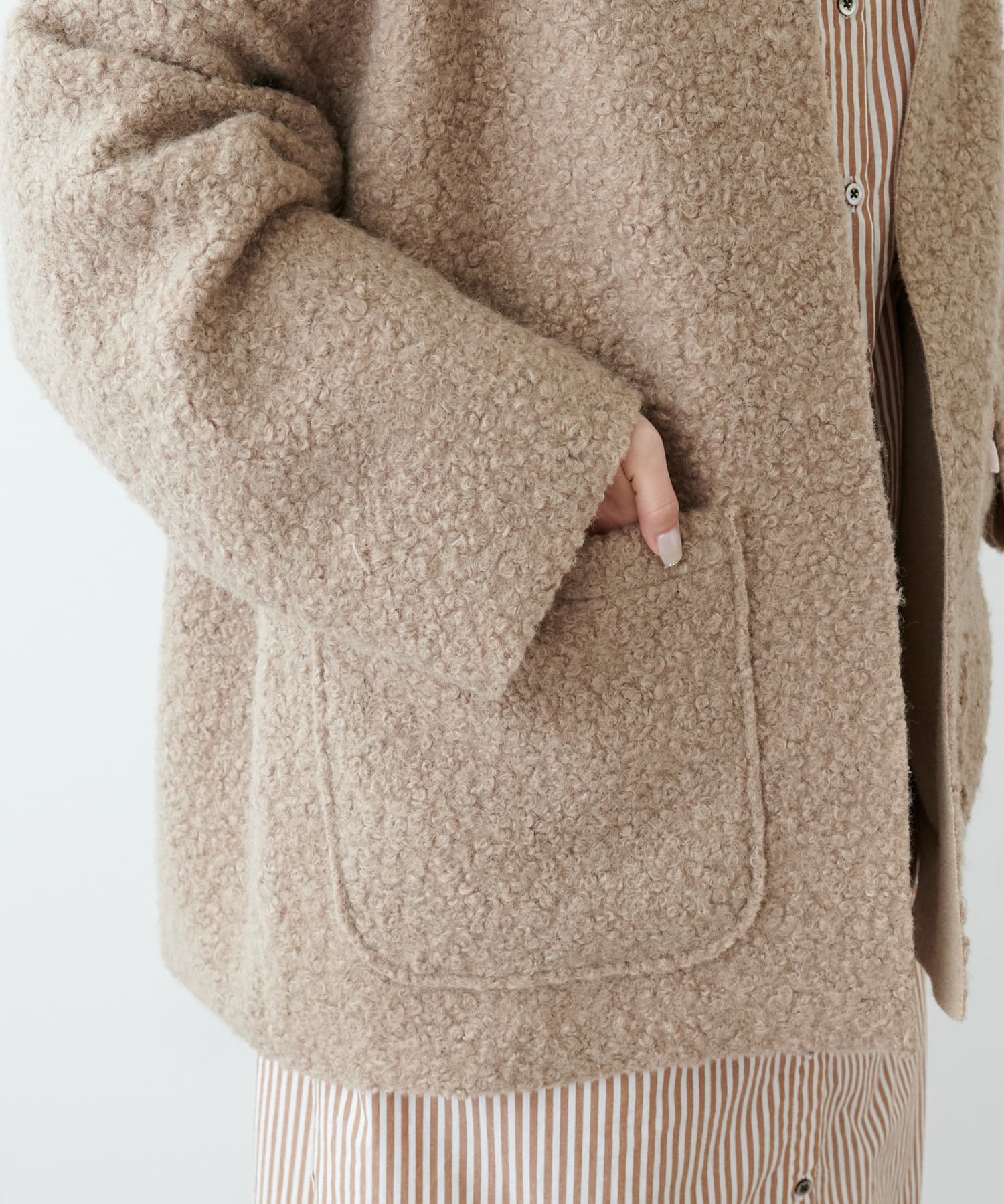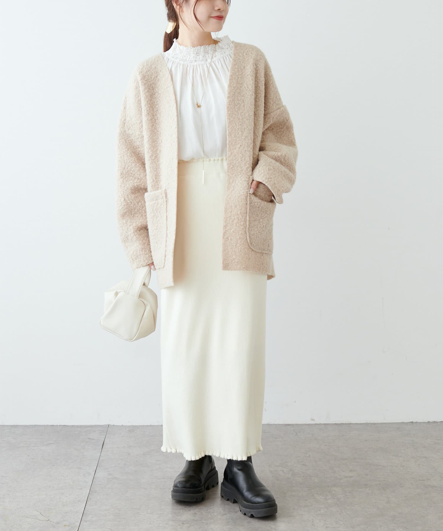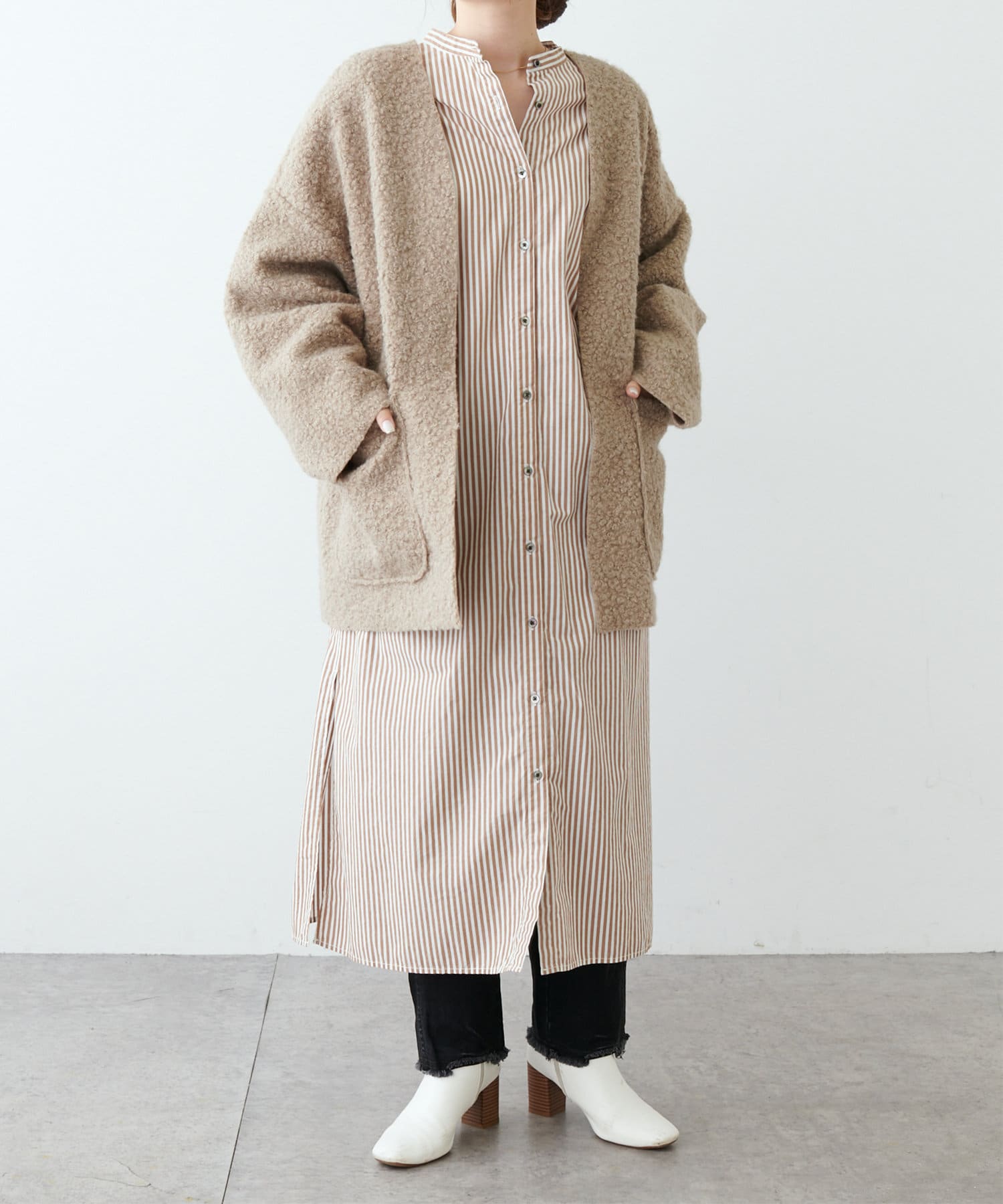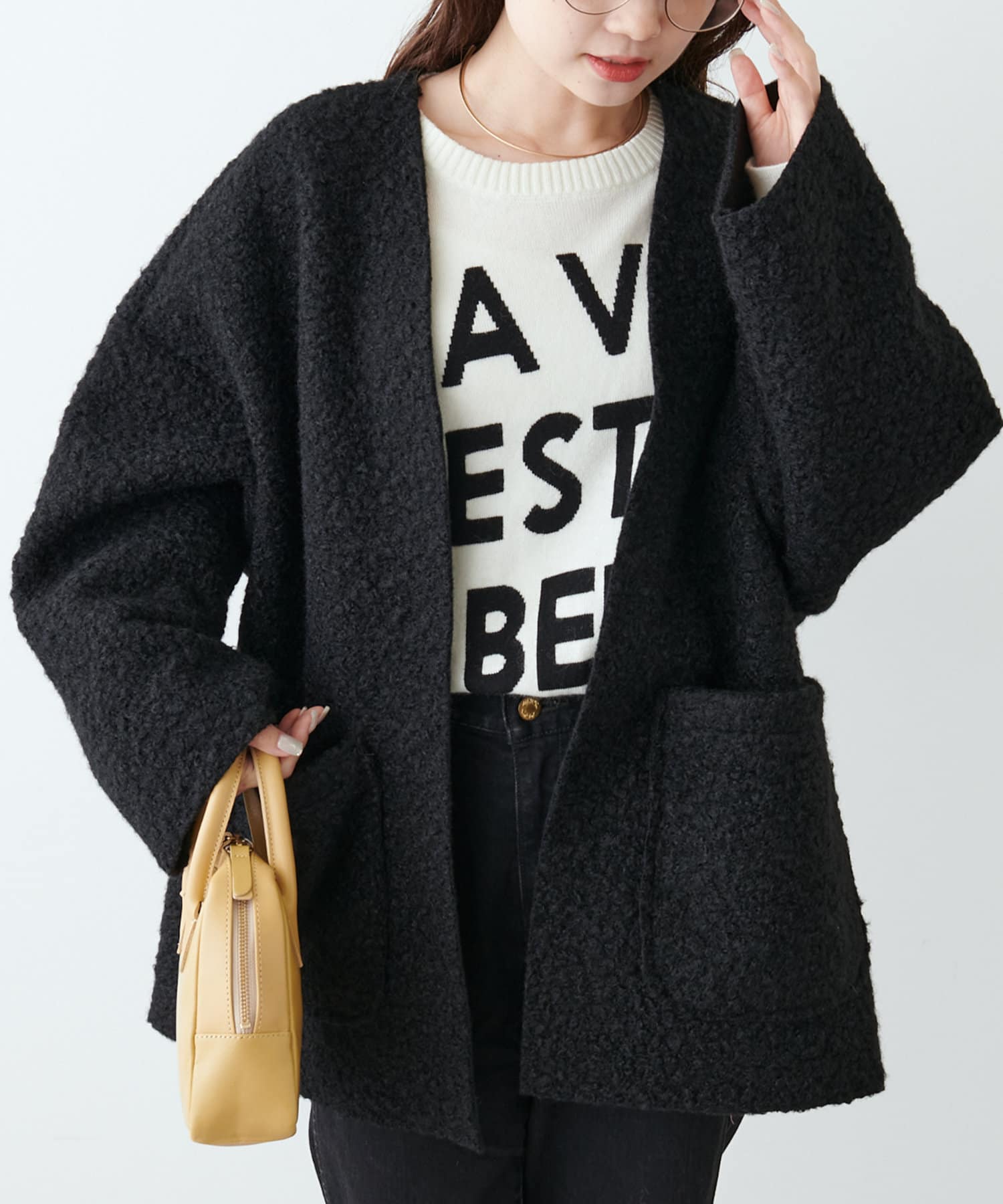 くるんとカールした表情豊かなフェイクウールカーディガン。