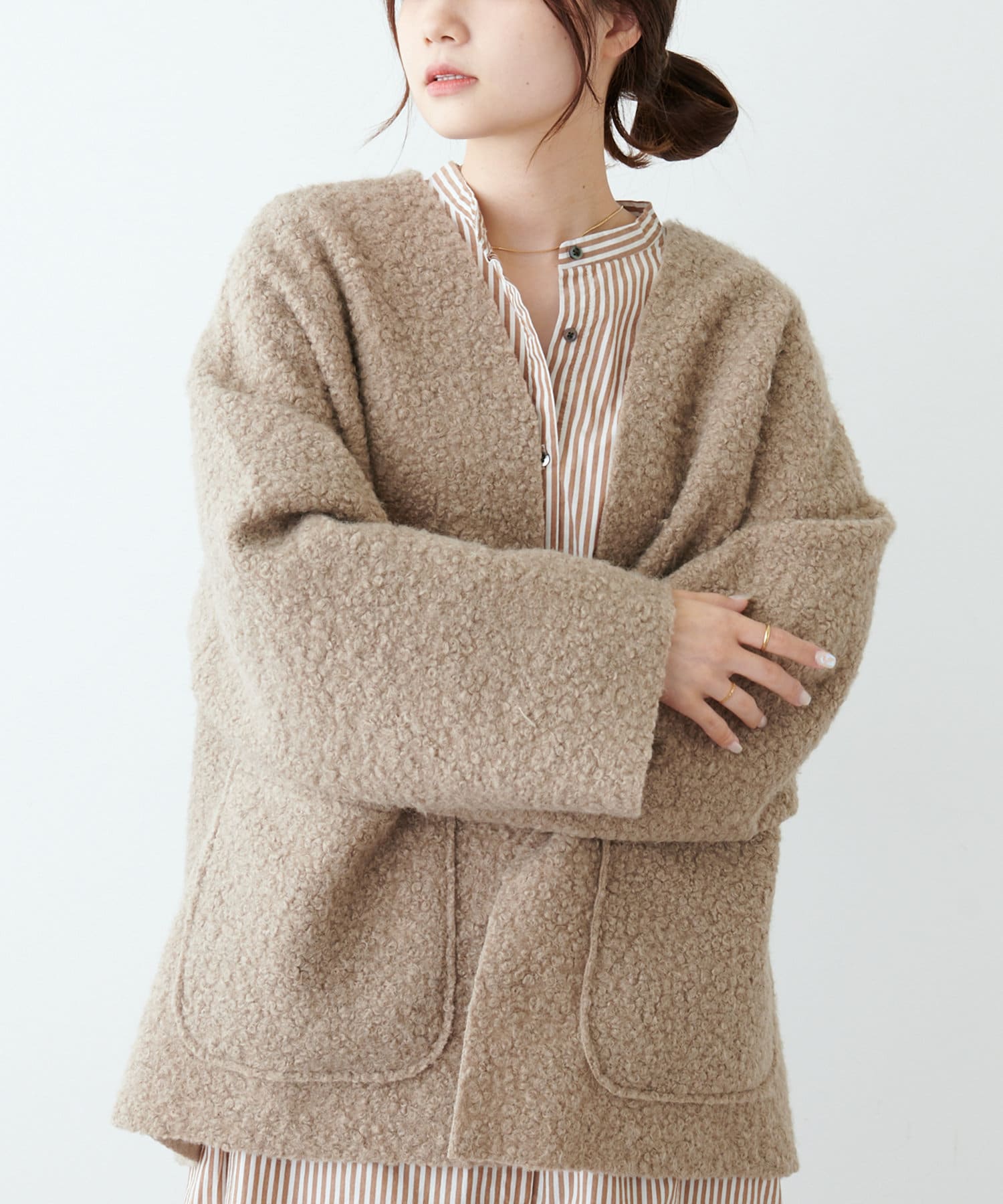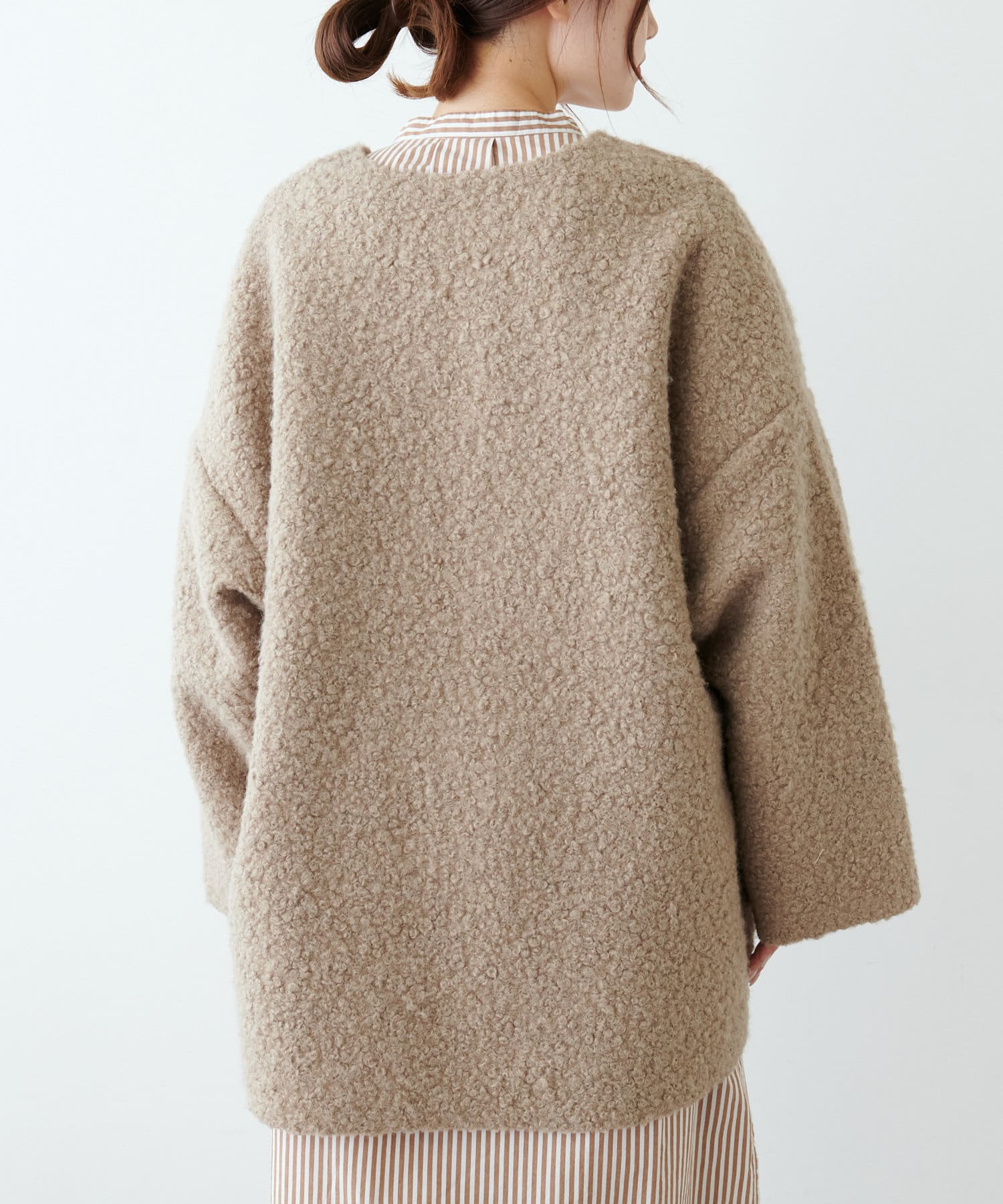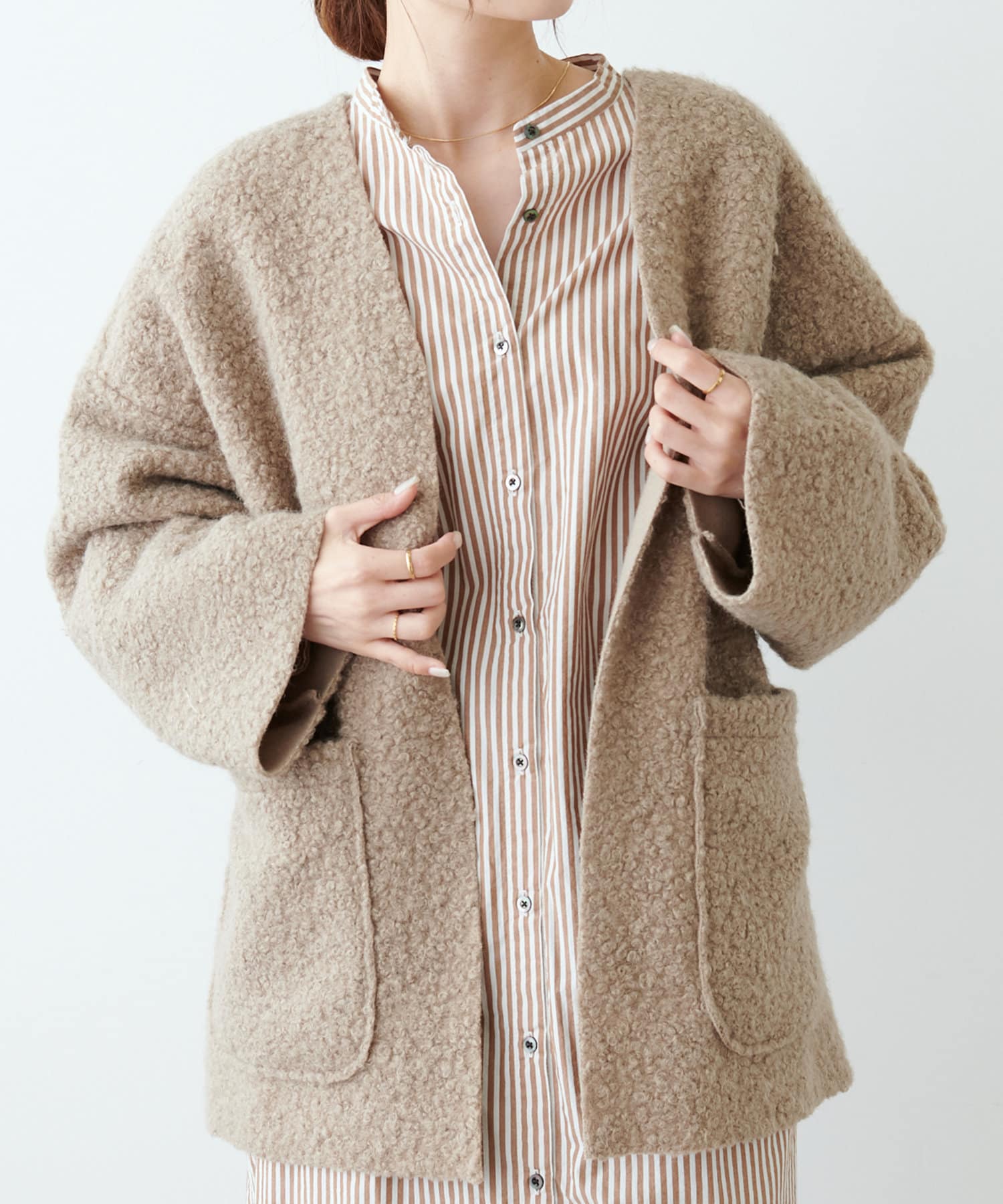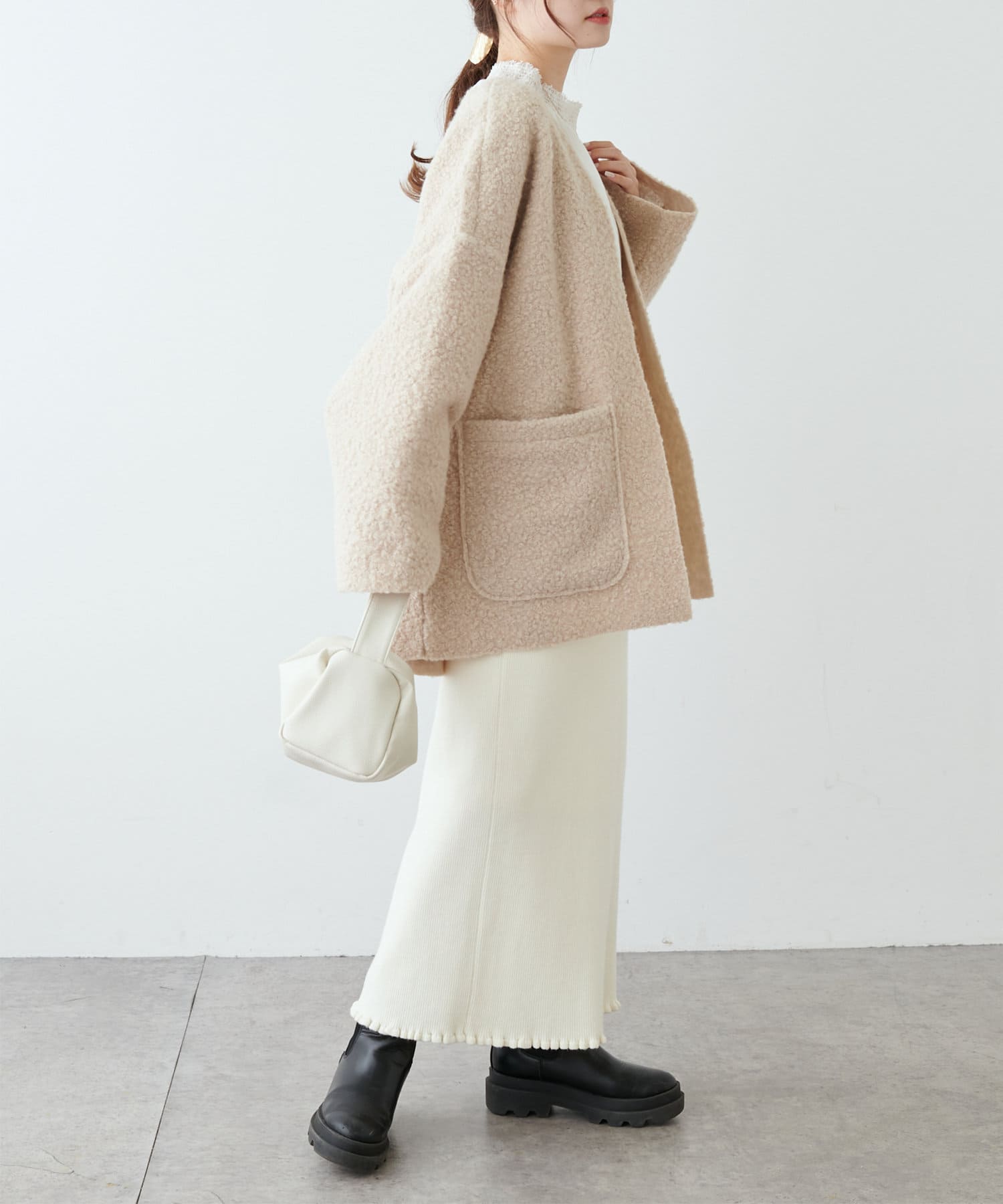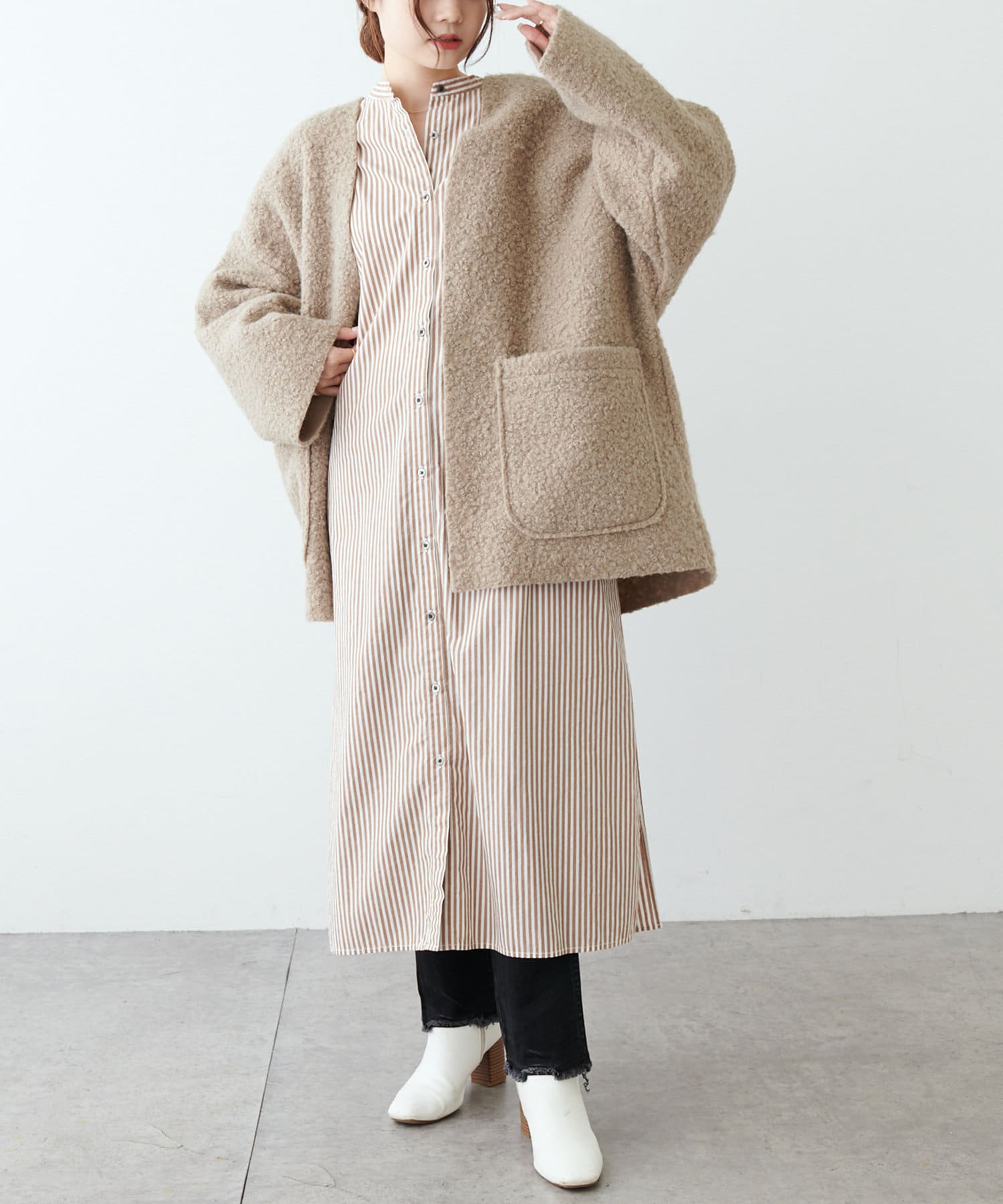 ノーカラーデザインなので、ハイネックのニットやマフラー合わせもおすすめです。