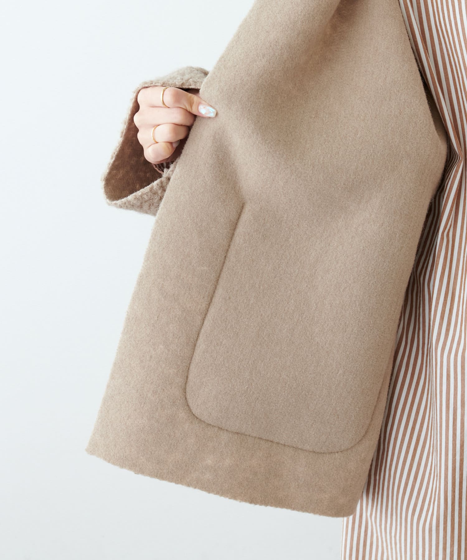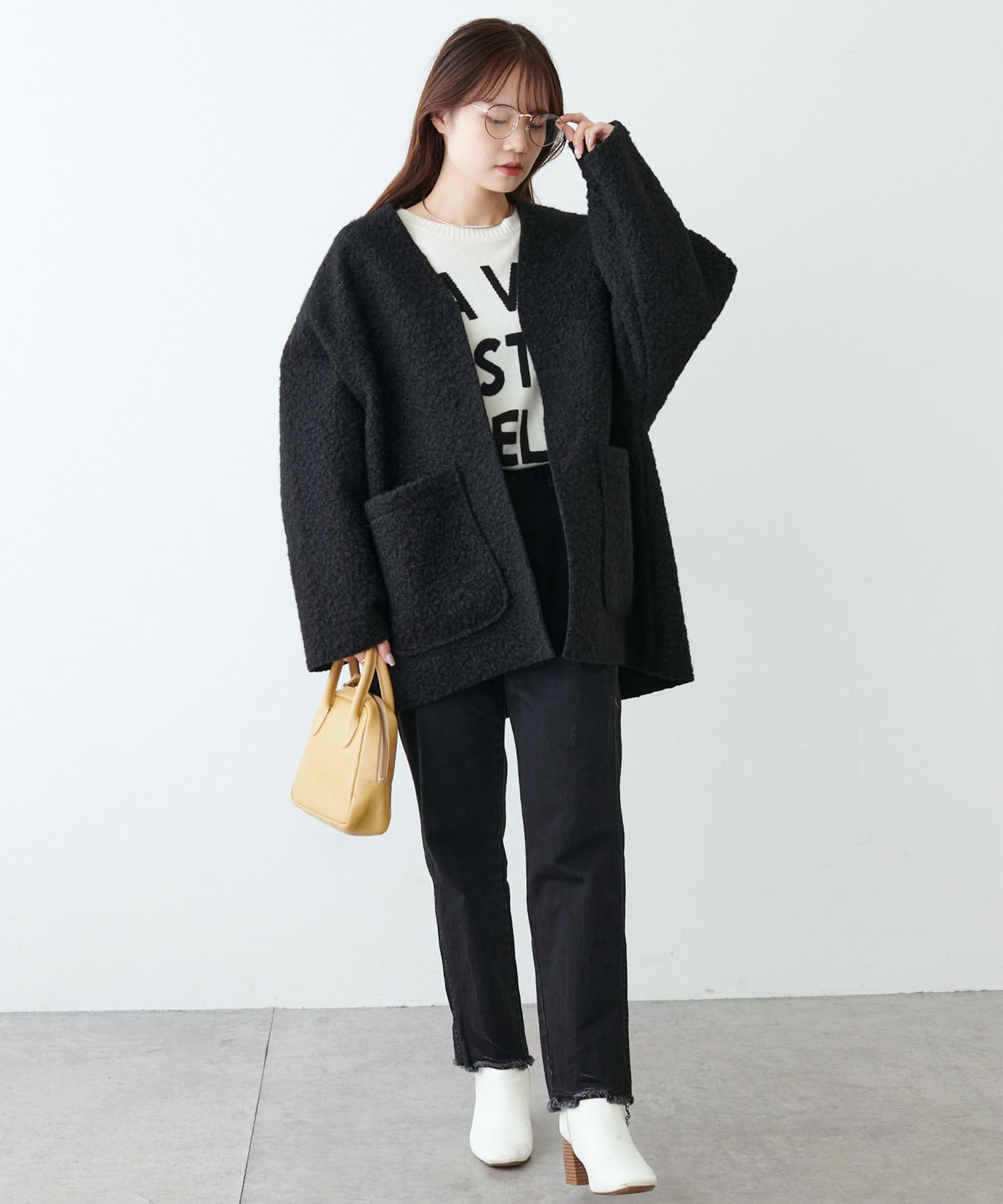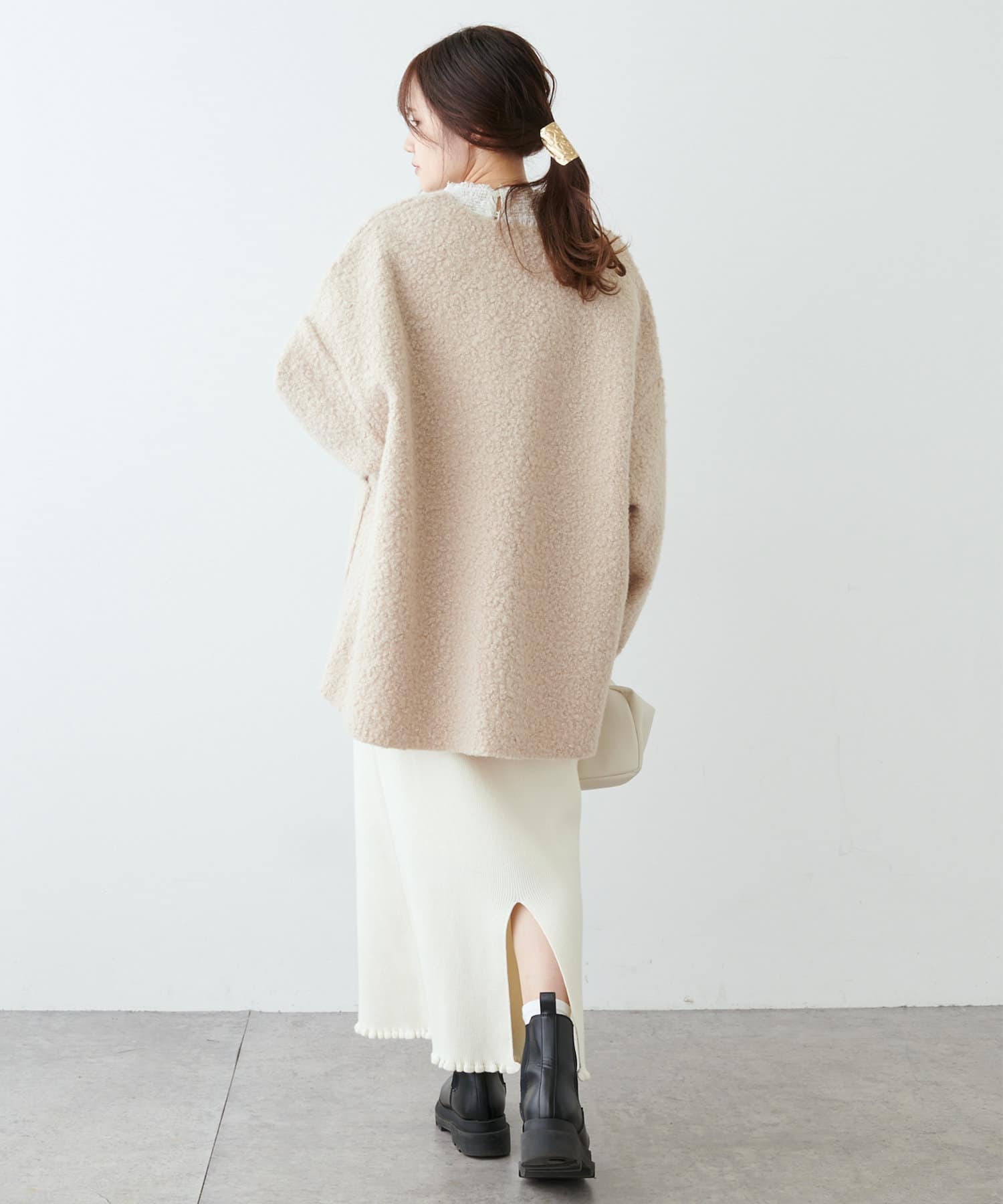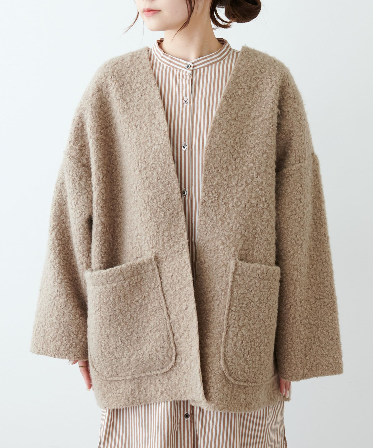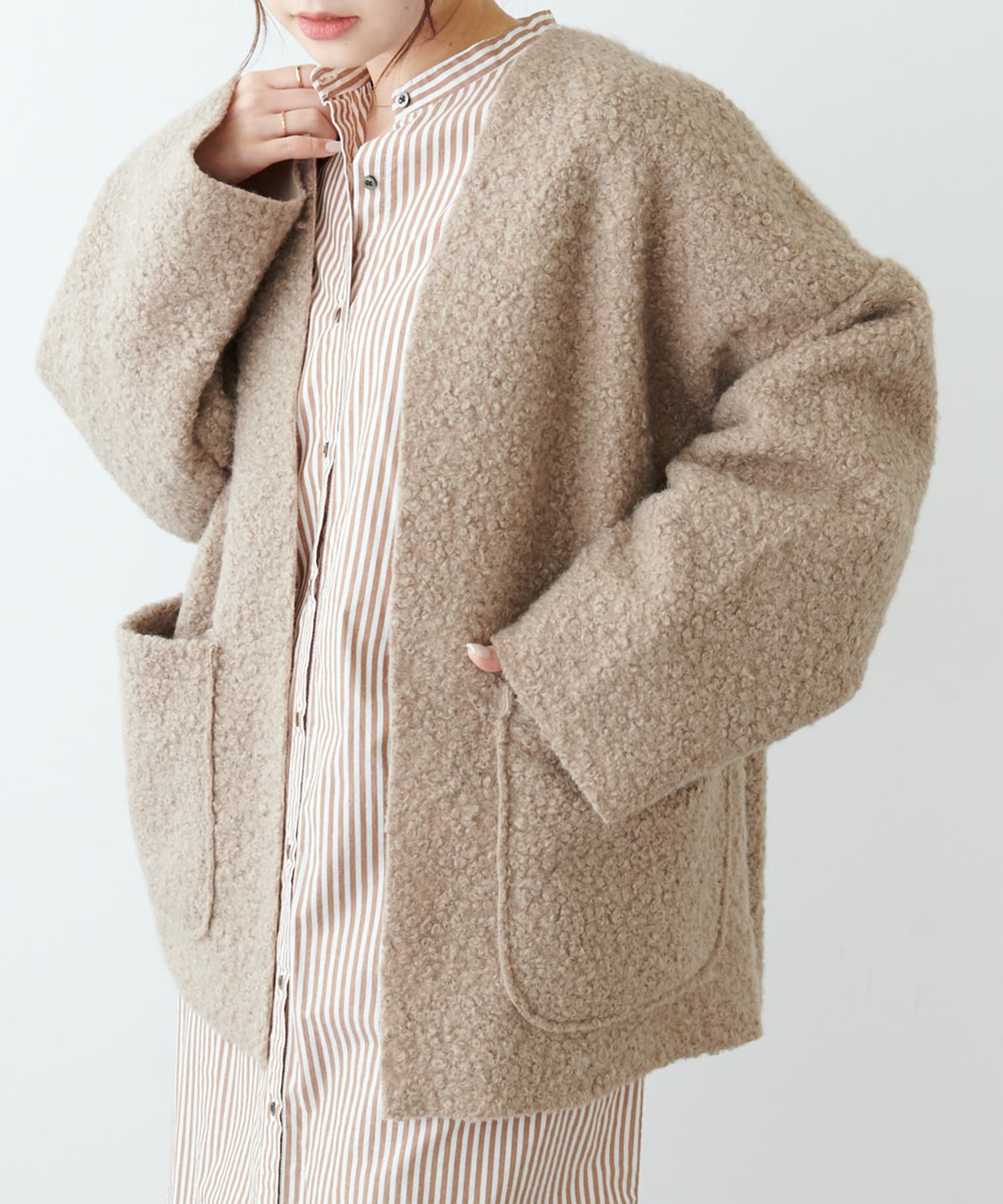 ノーカラーデザインなので、ハイネックのニットやマフラー合わせもおすすめです。