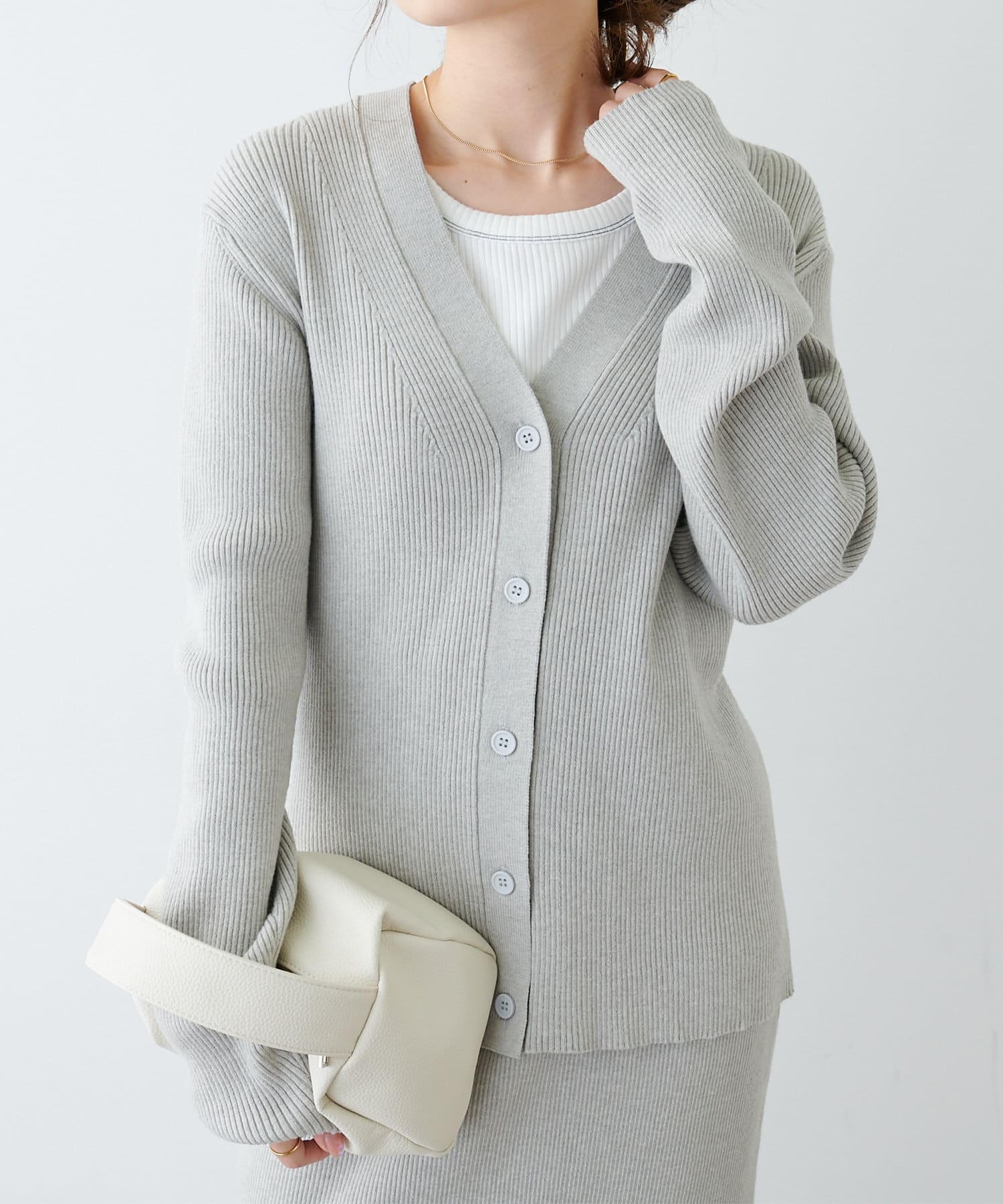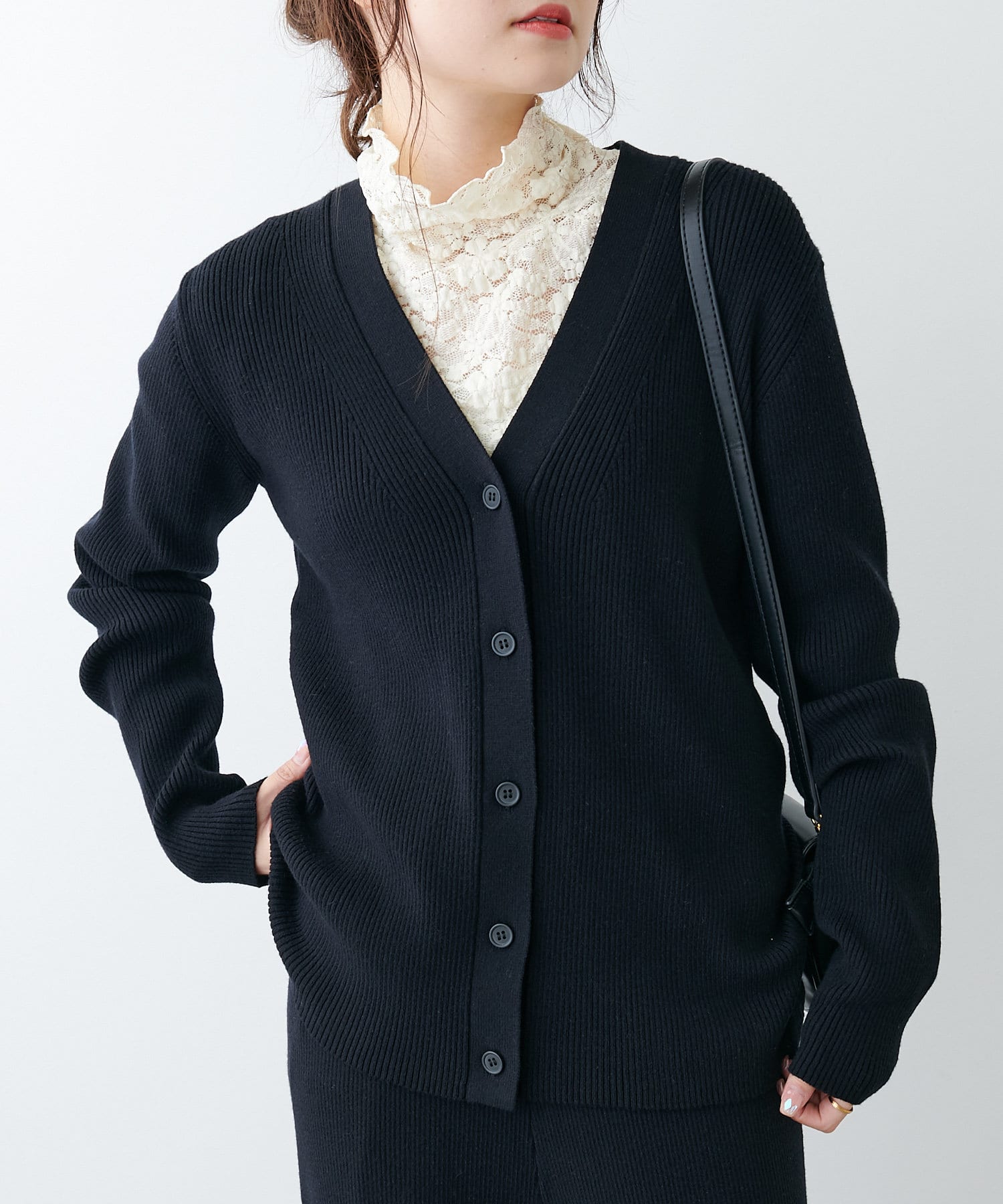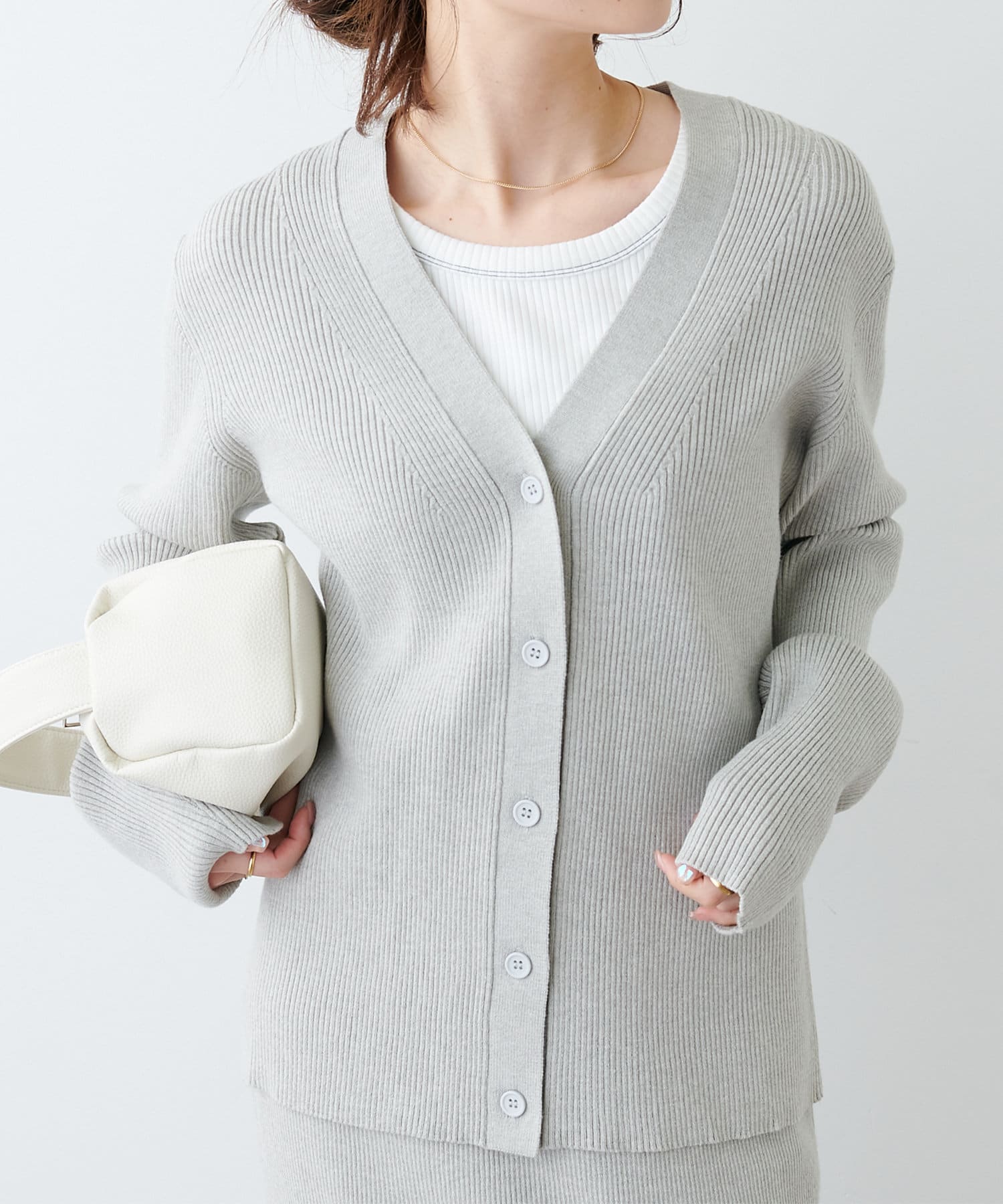 首元をスッキリみせてくれるVネックカーディガンは、秋冬の強い味方。