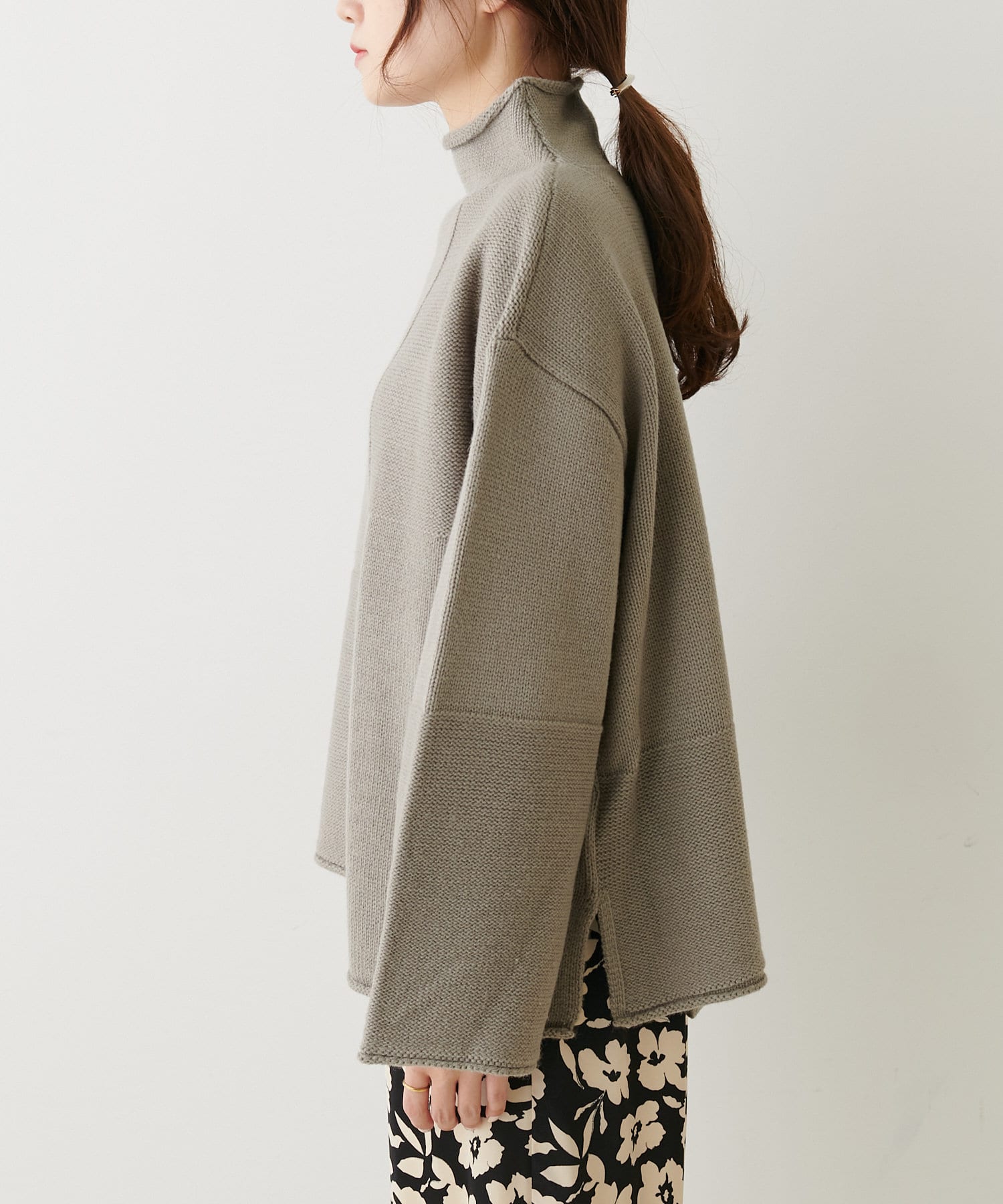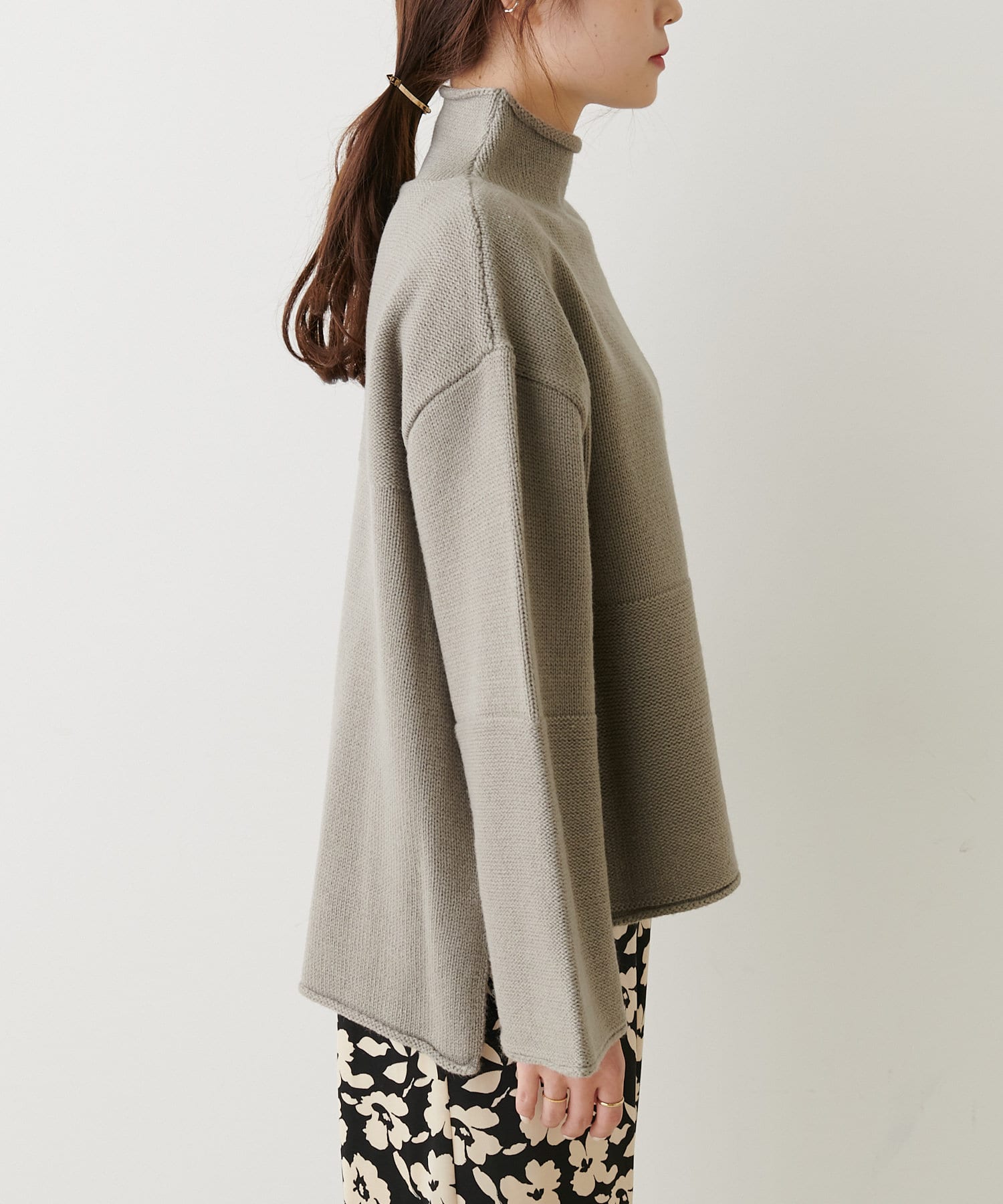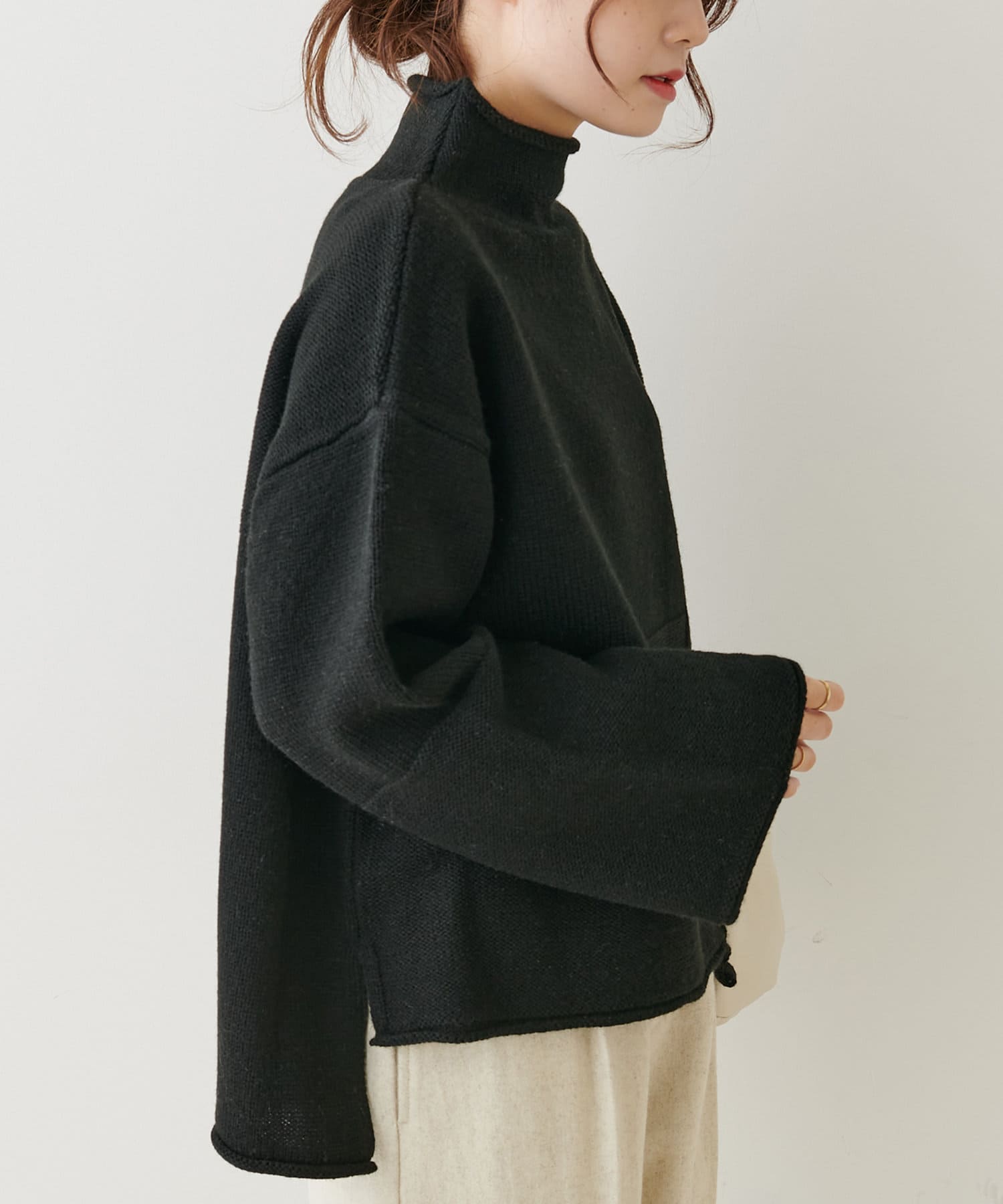 ボトルネックなので首周りにゆとりがあり、程良い高さなのでハイネックが苦手な方でも着やすいデザインに仕上げました。
