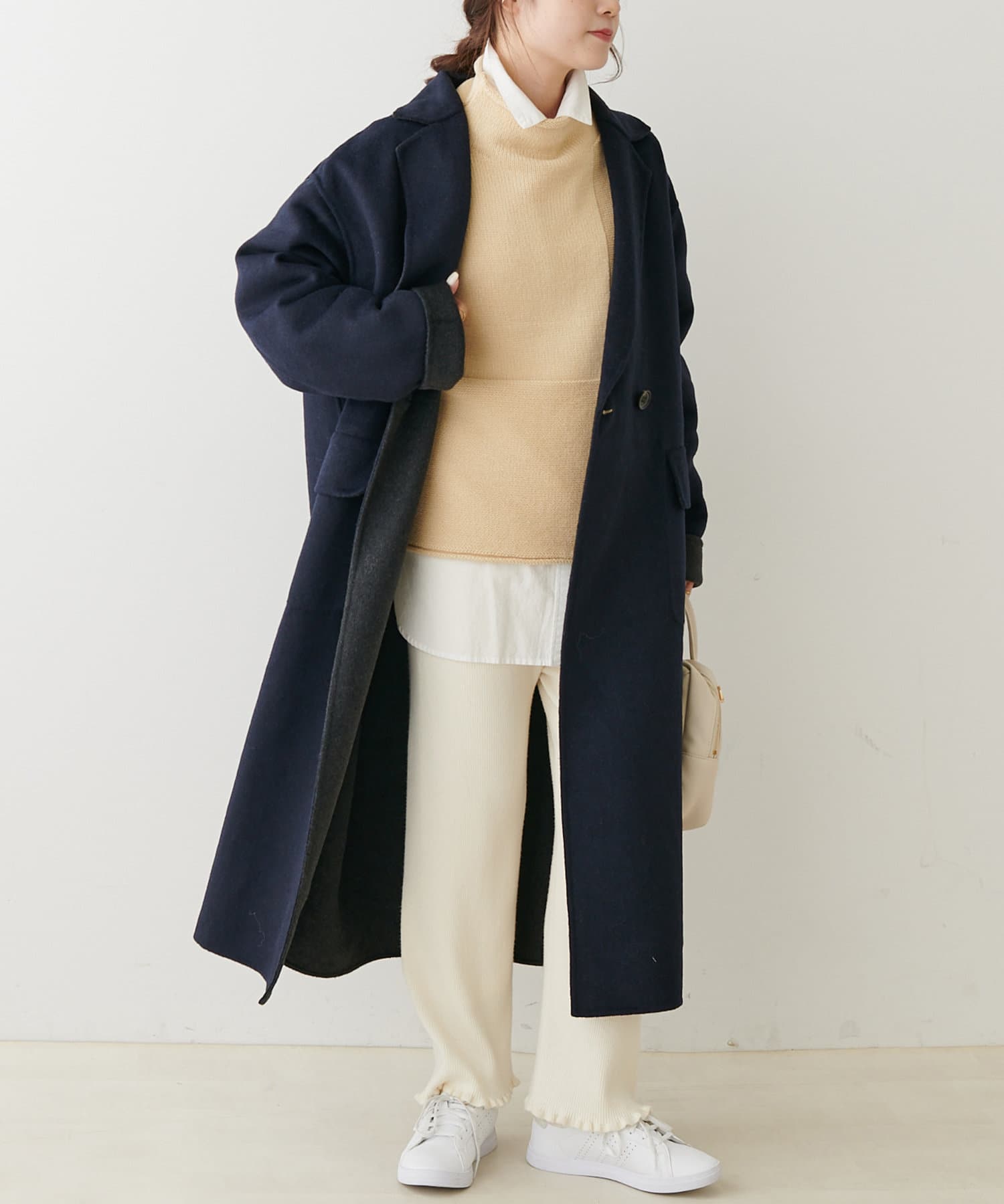 ボトムスを選ばない着丈でスカート、パンツスタイルでも万能。