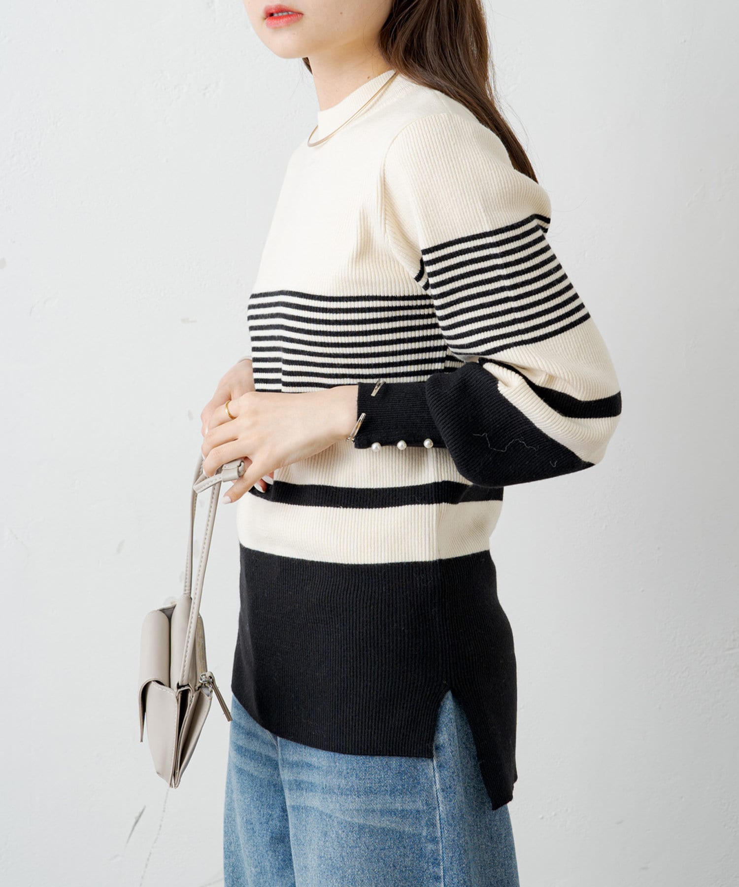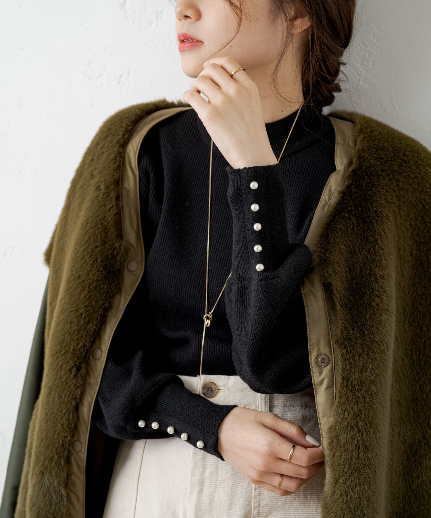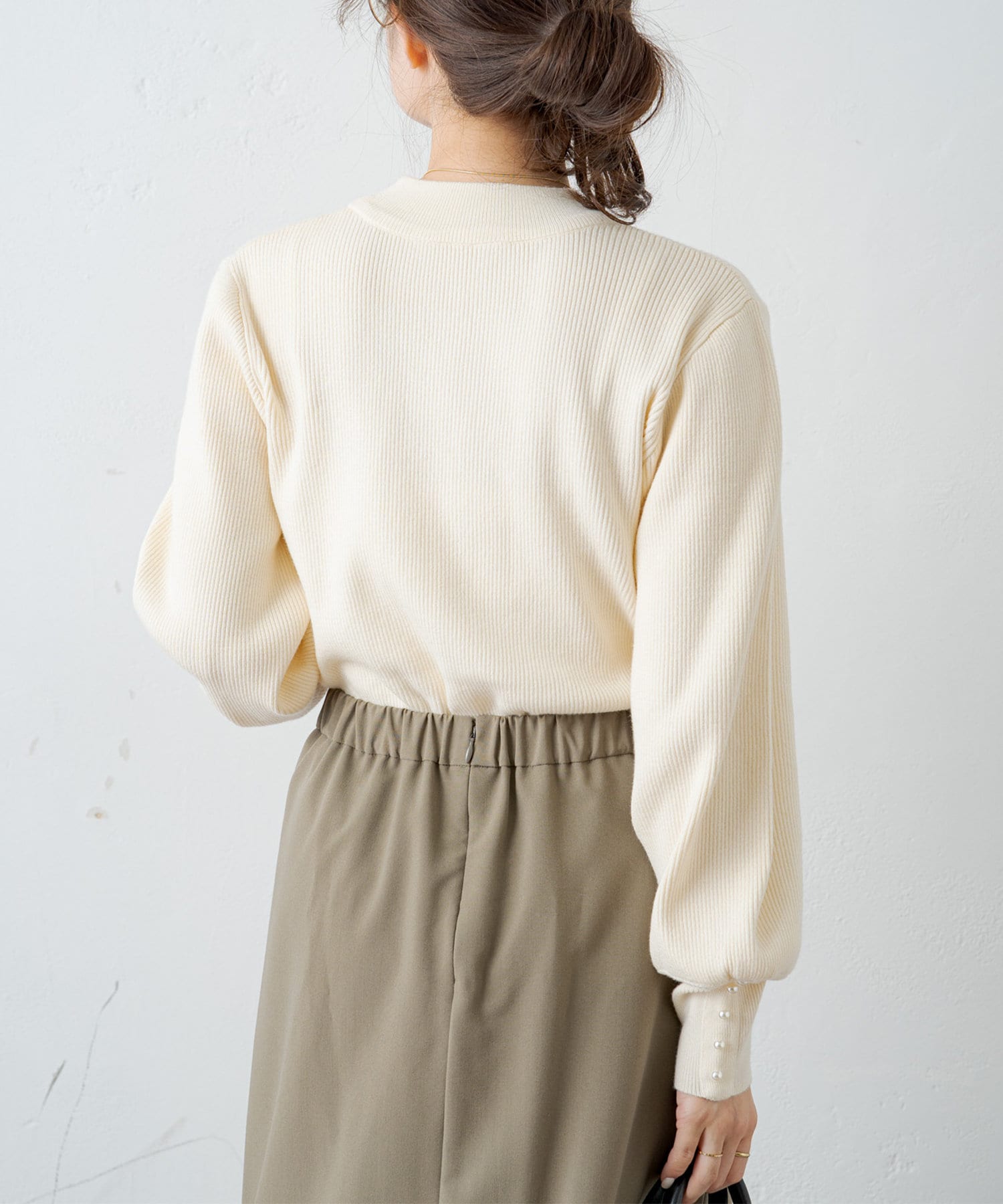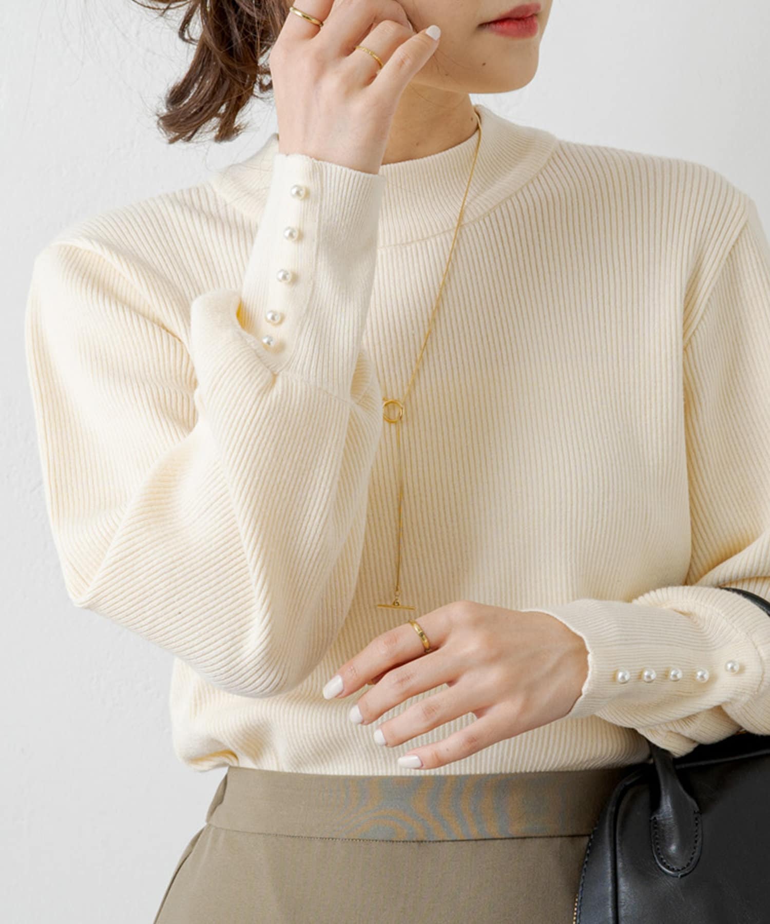袖にパールをあしらい手元を上品に演出してくれるリブニット。