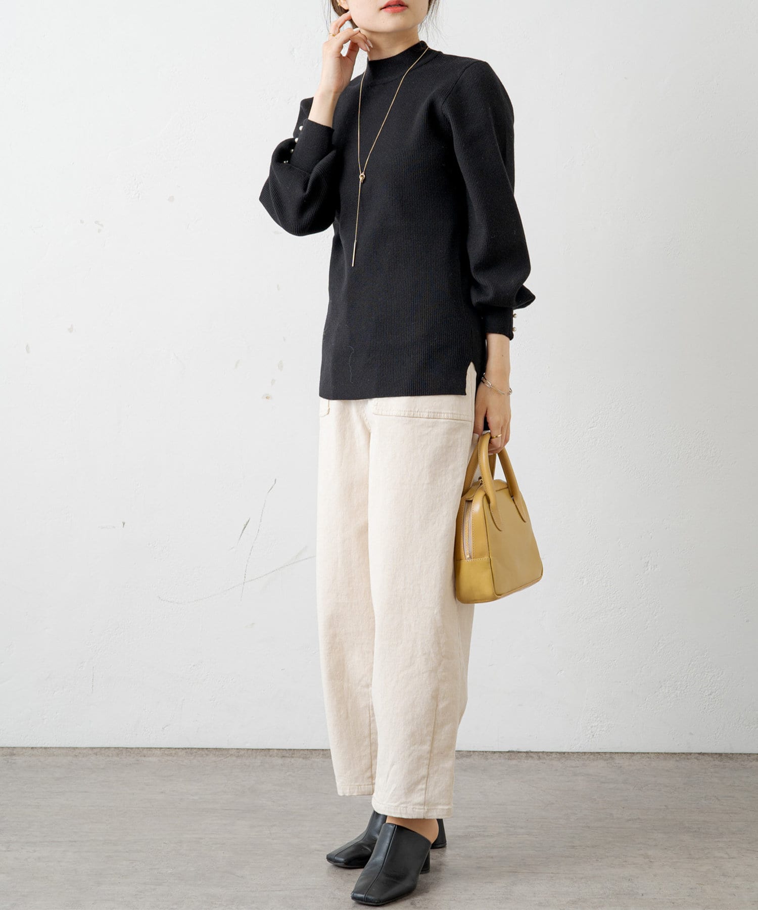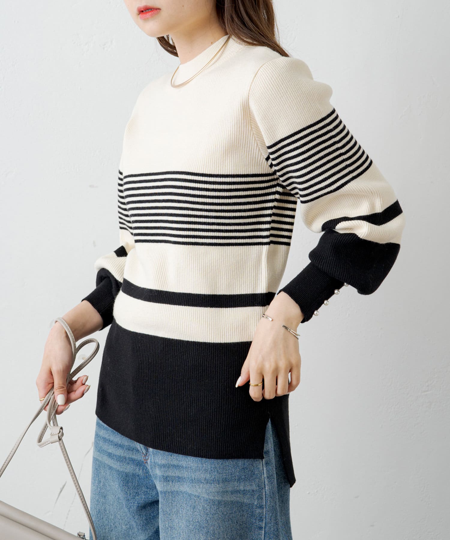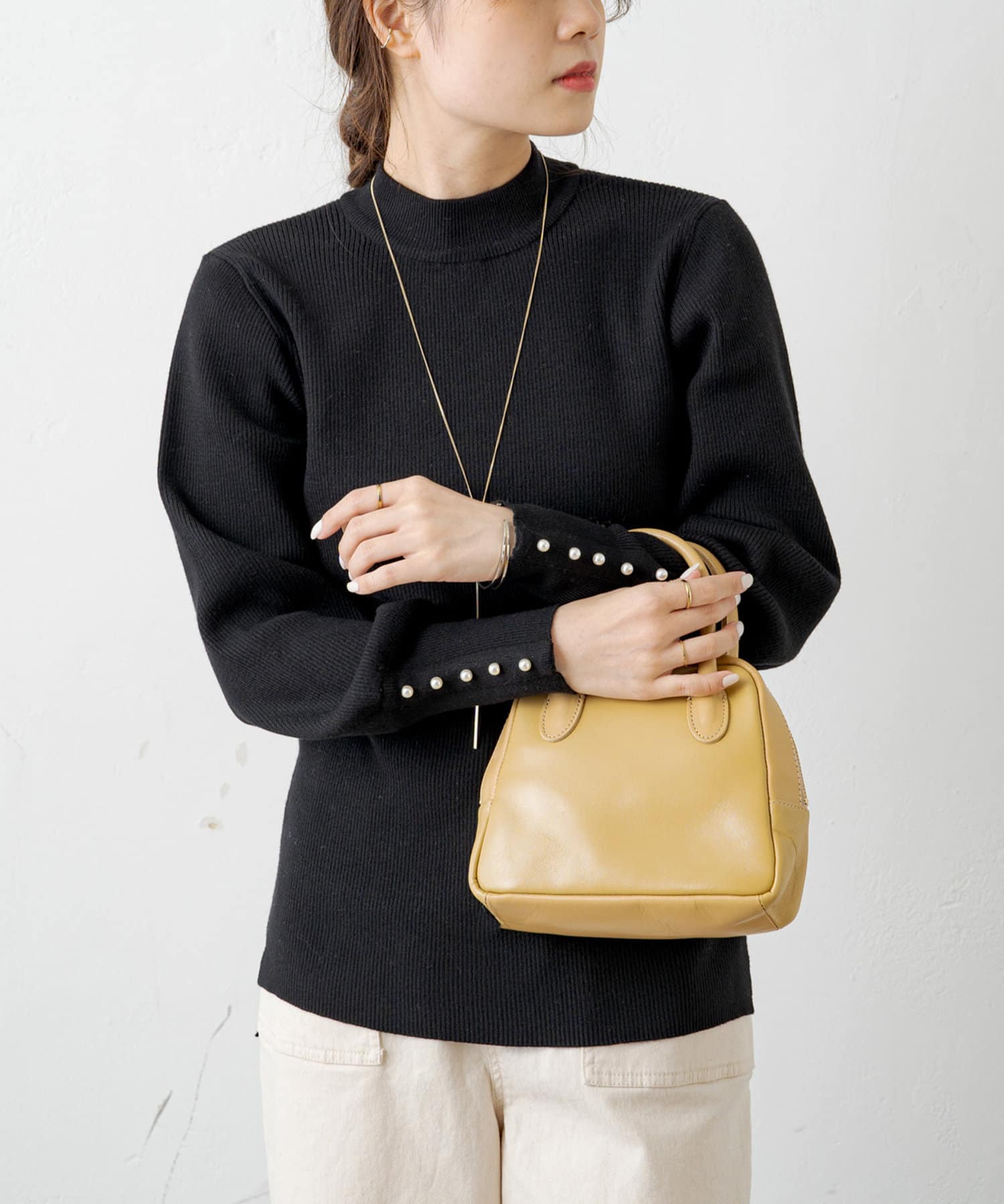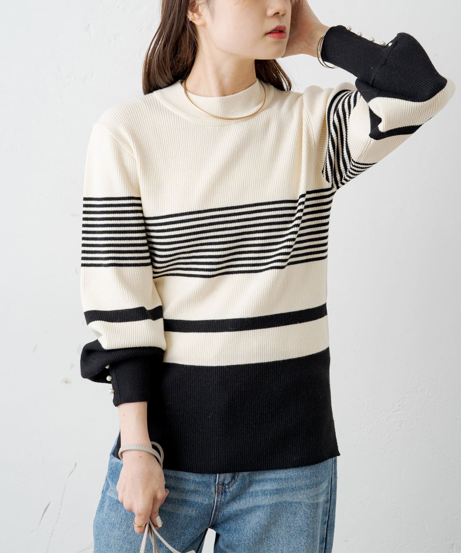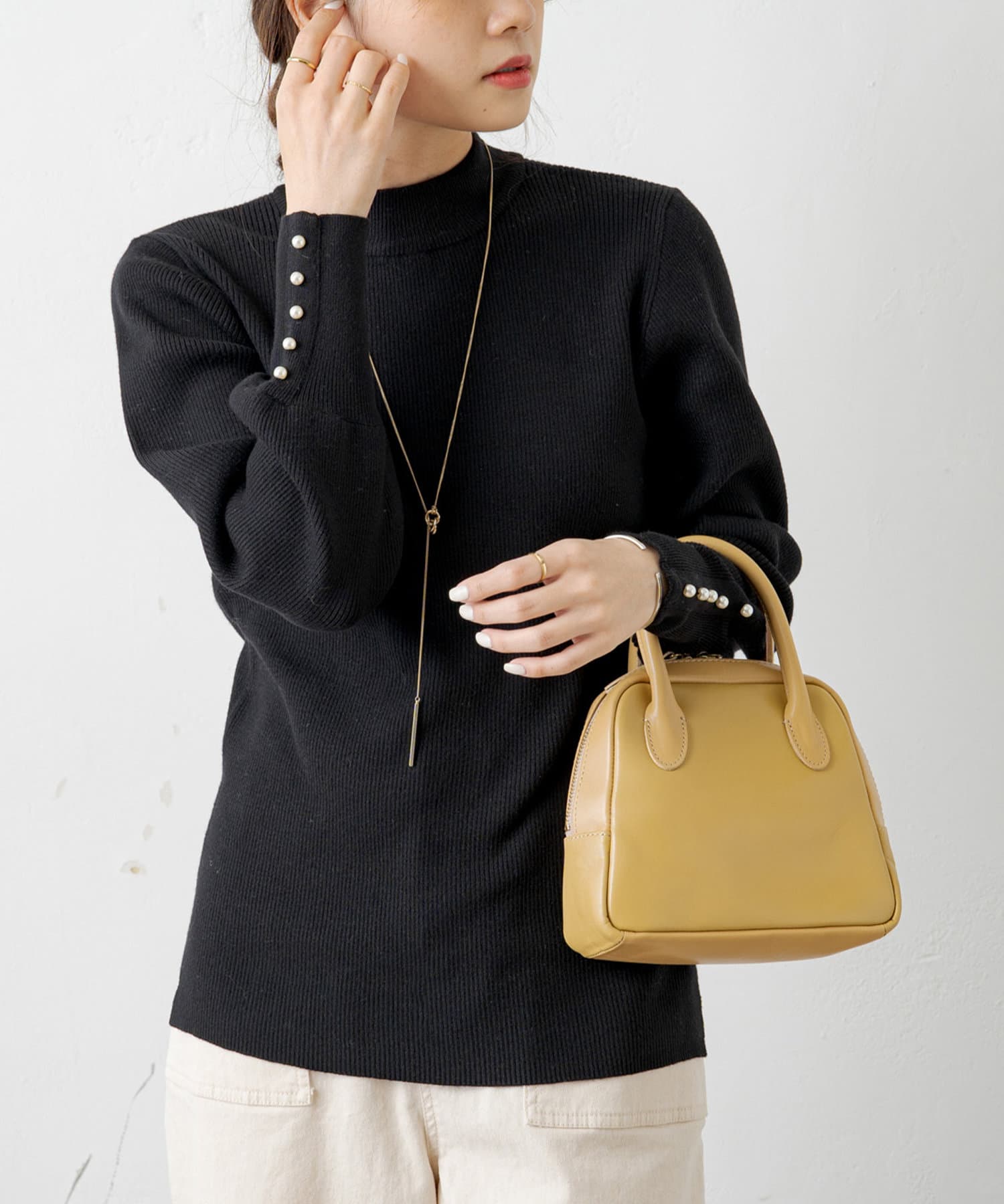 袖にパールをあしらい手元を上品に演出してくれるリブニット。