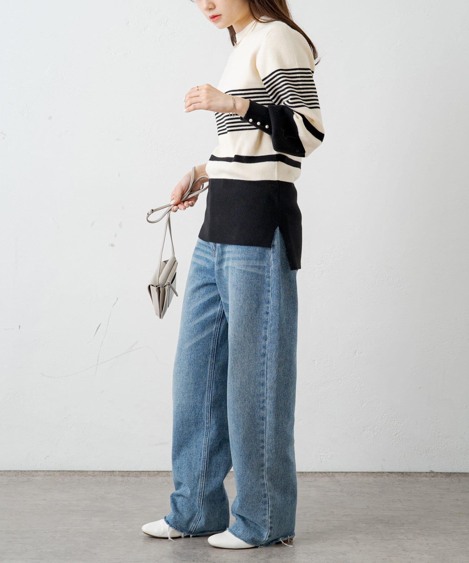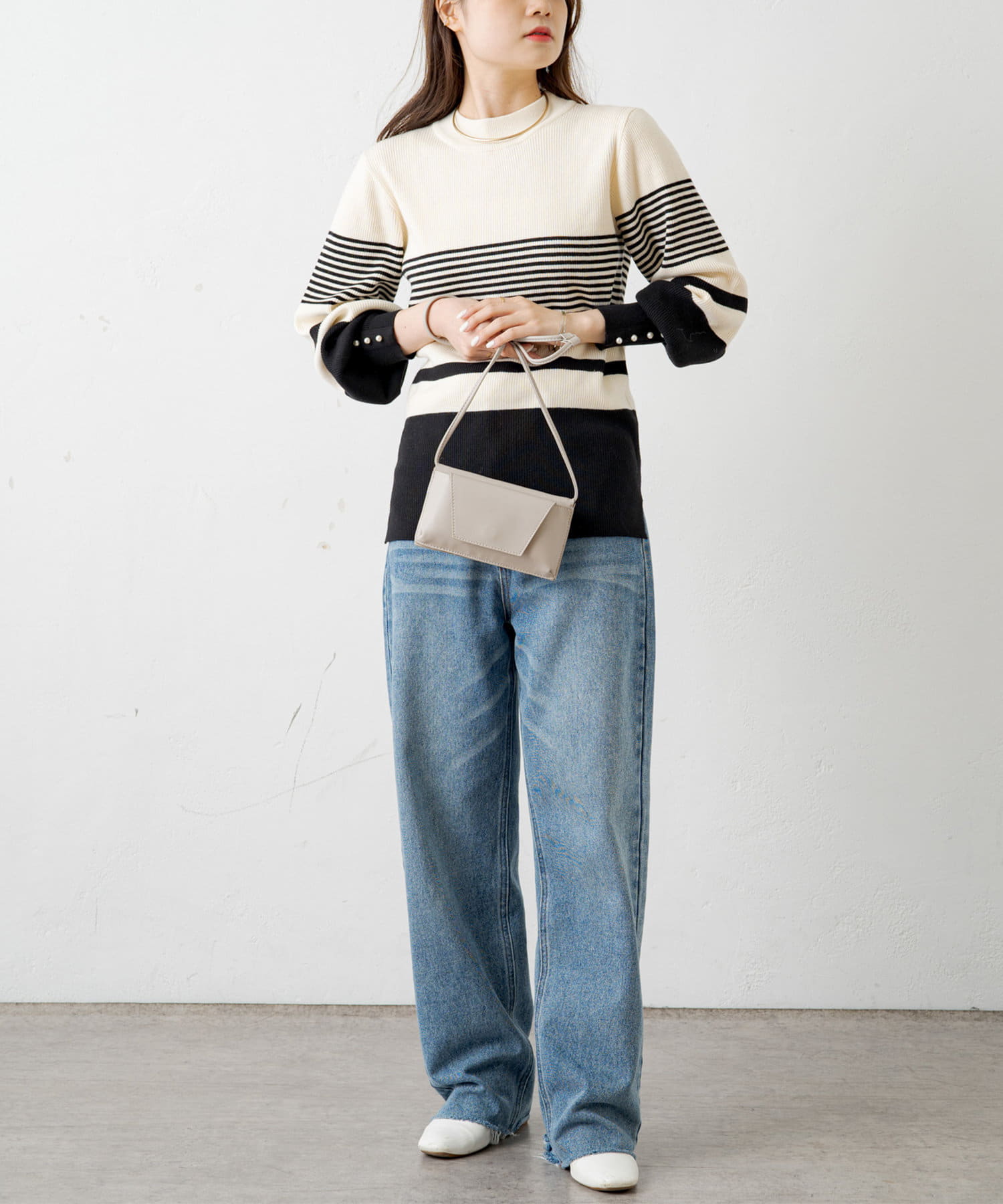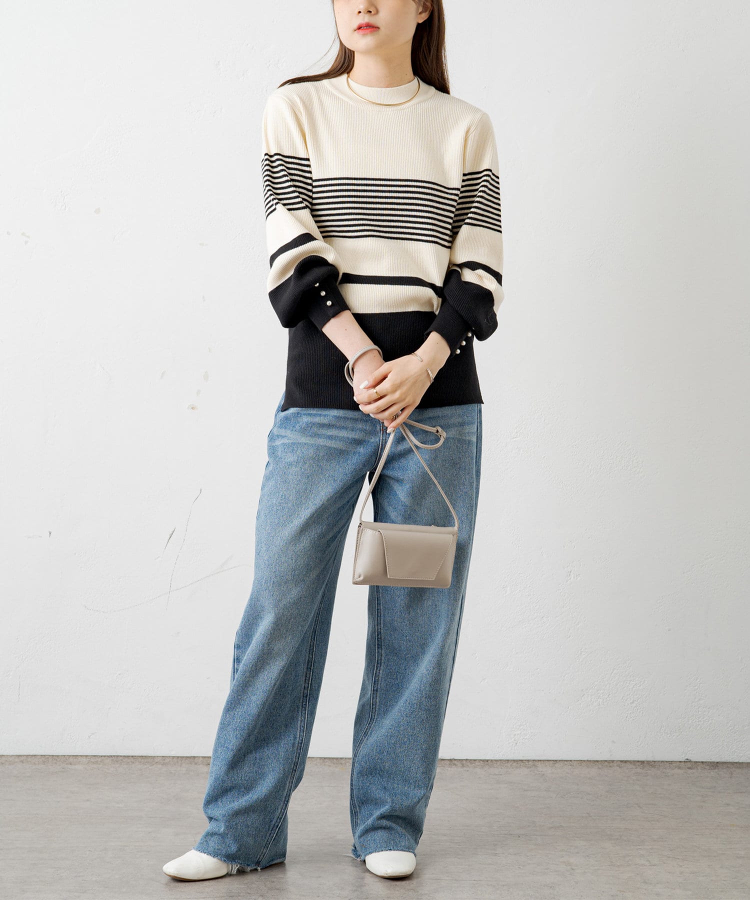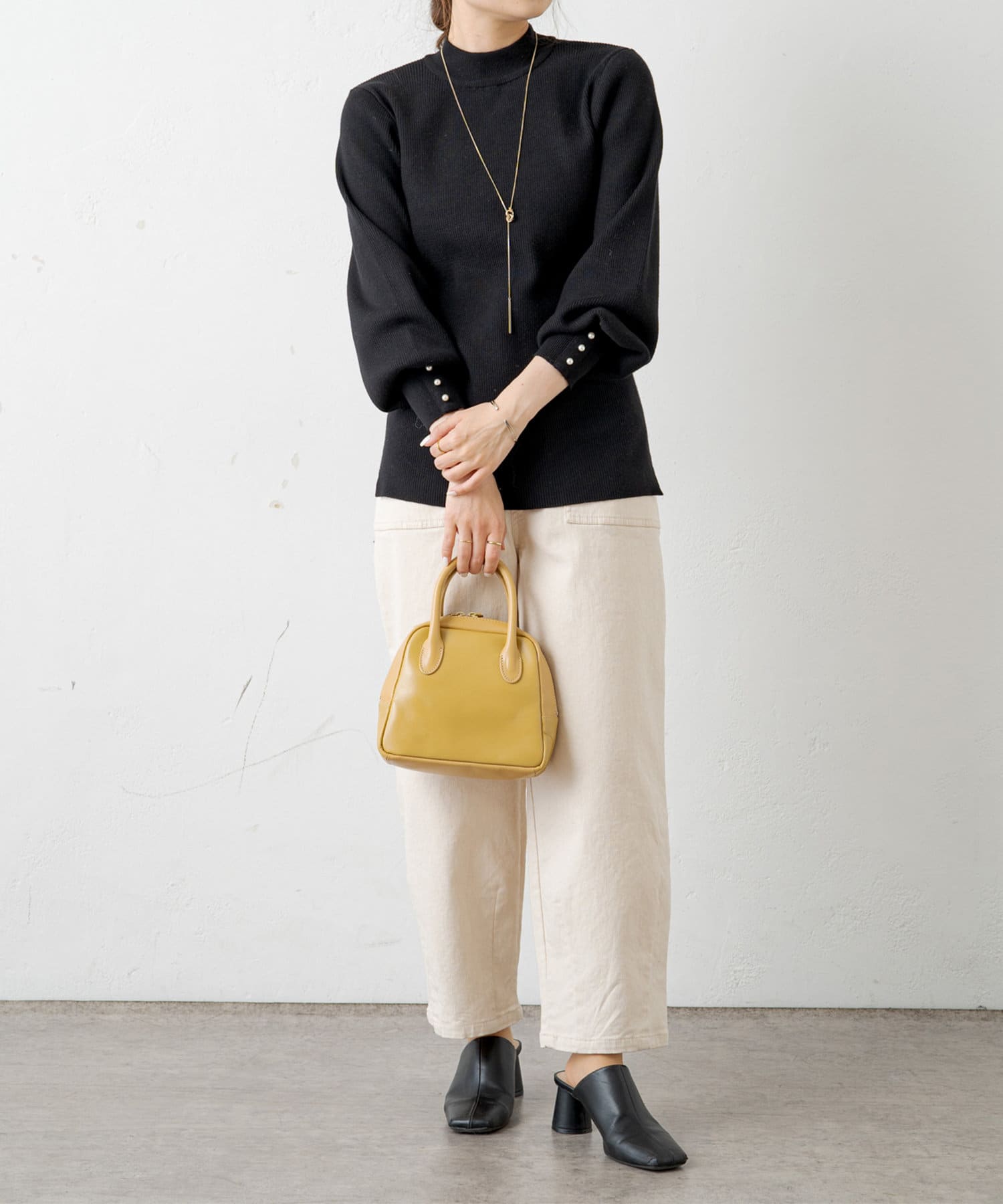 袖にパールをあしらい手元を上品に演出してくれるリブニット。