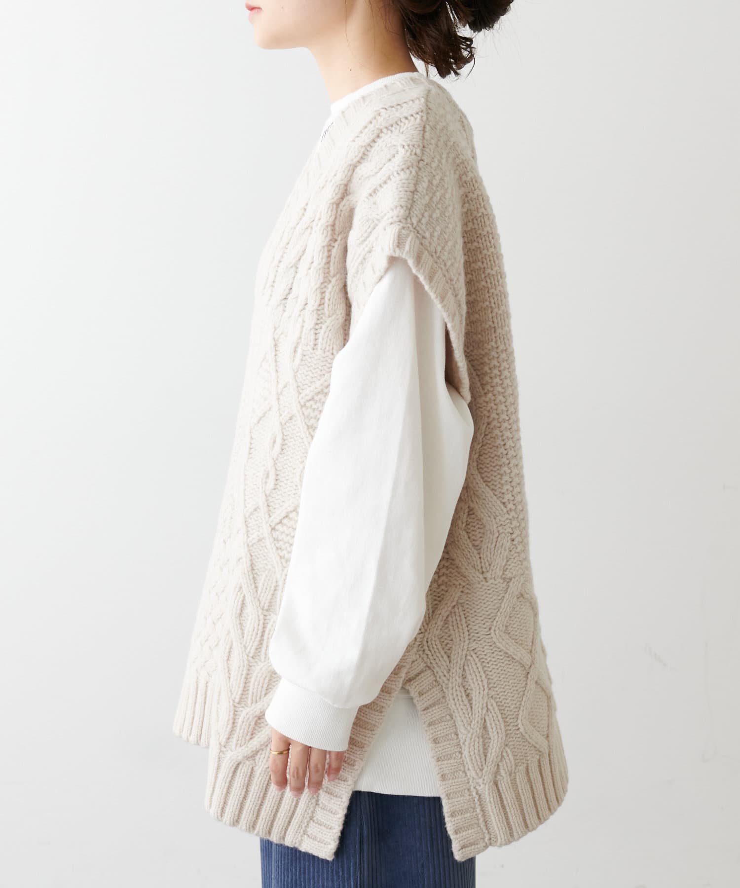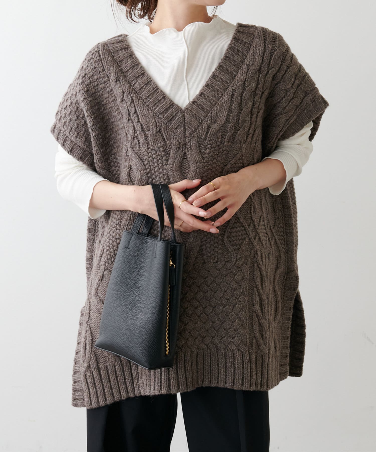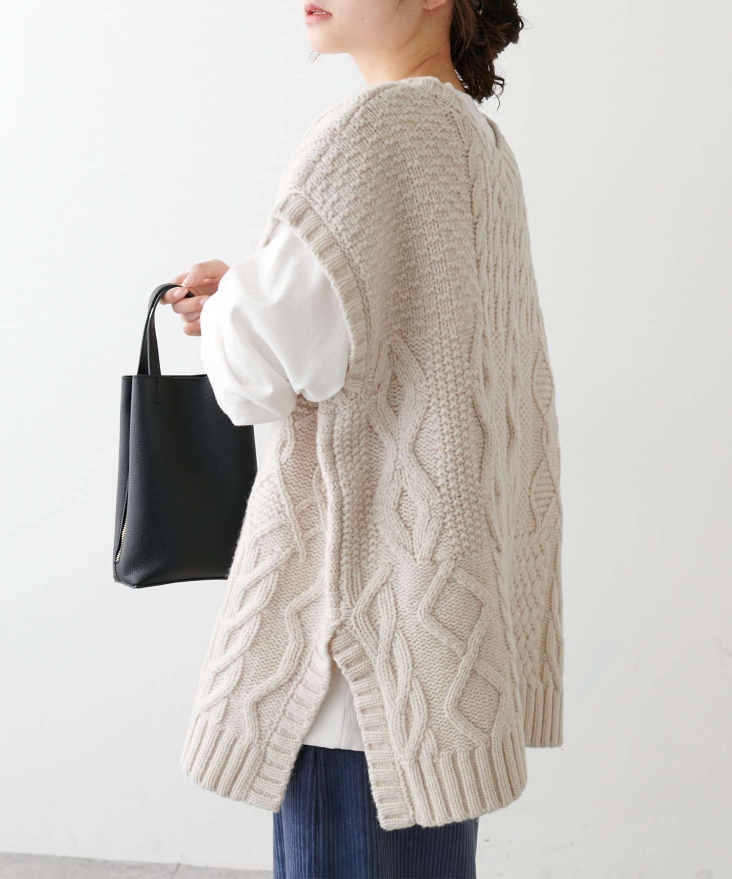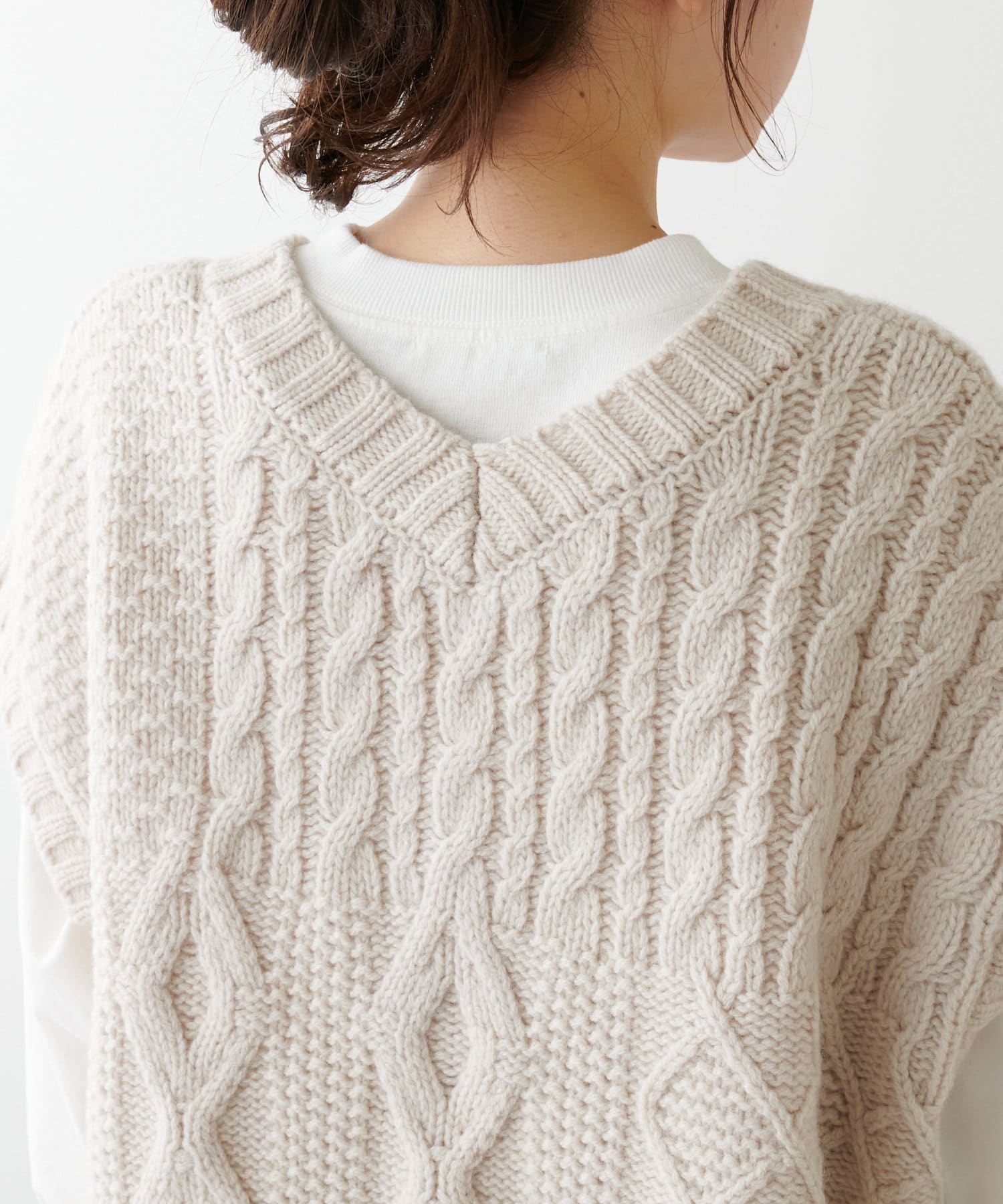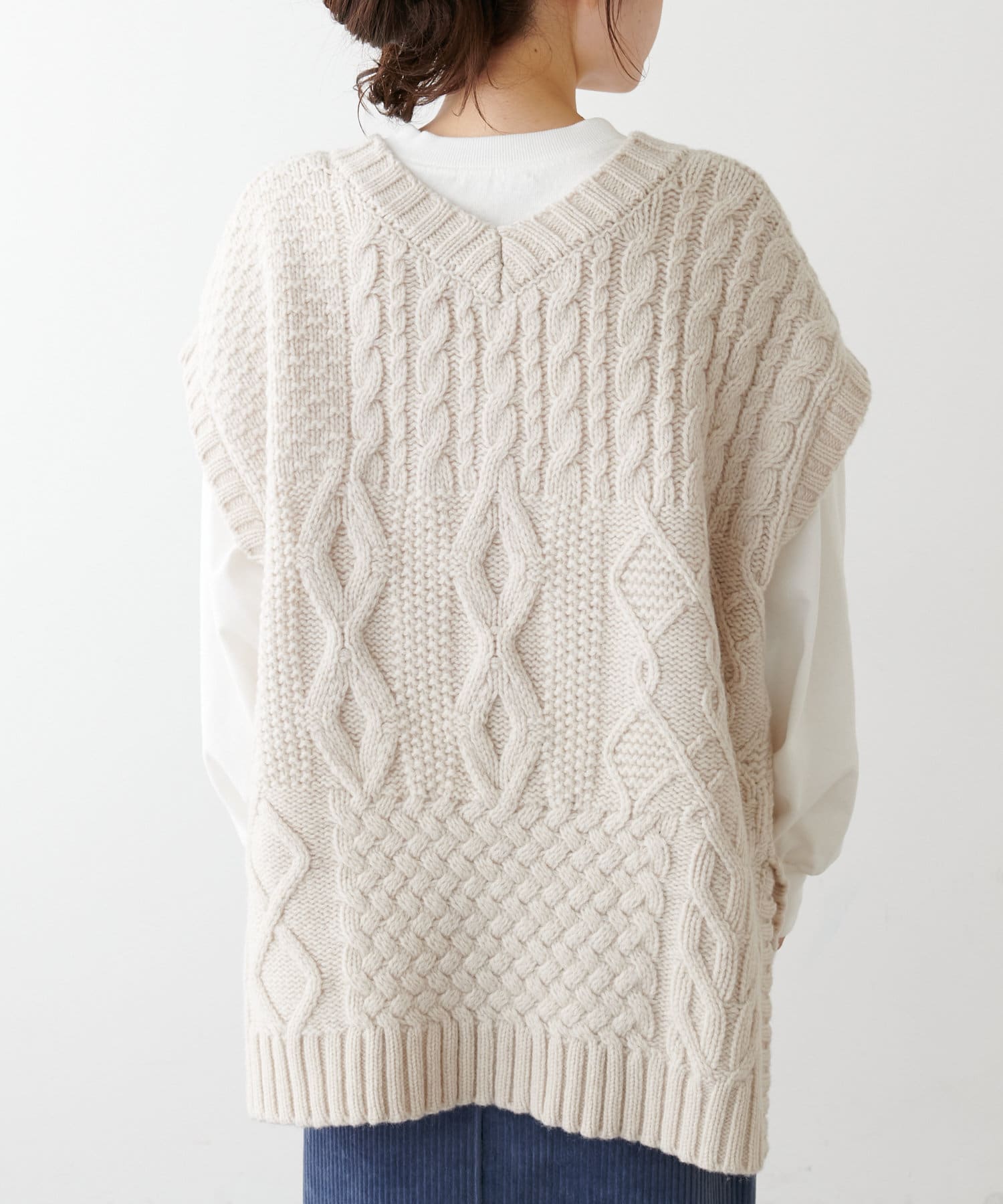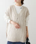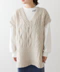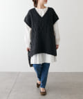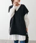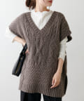 程よいボリューム感とたっぷりの編み地で立体感をだした今期注目のパッチワークニットベスト。