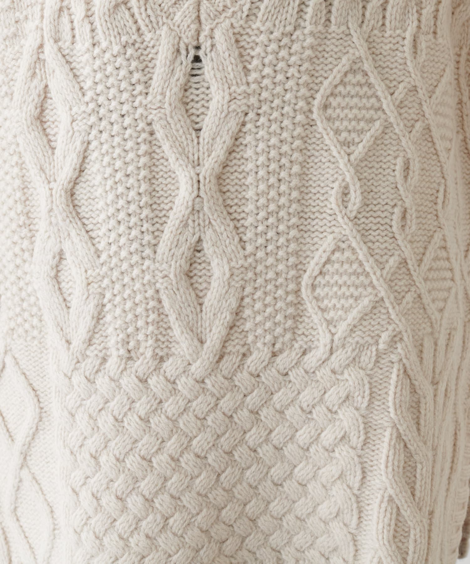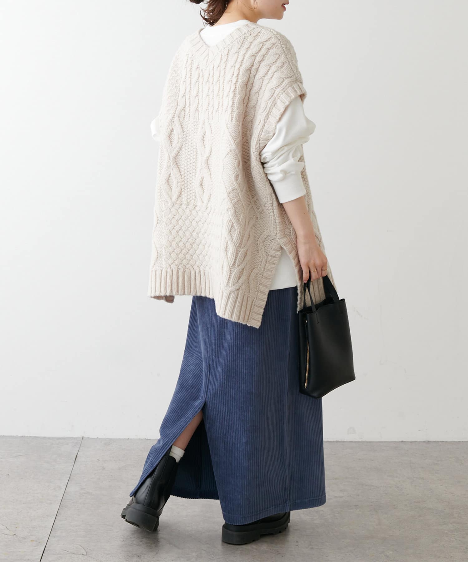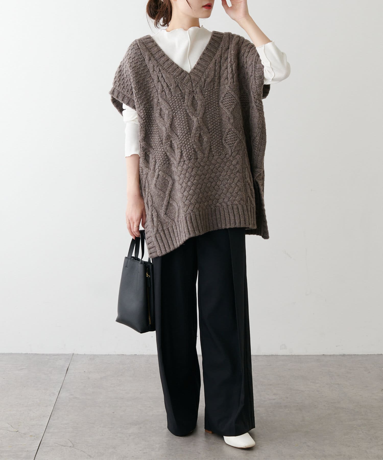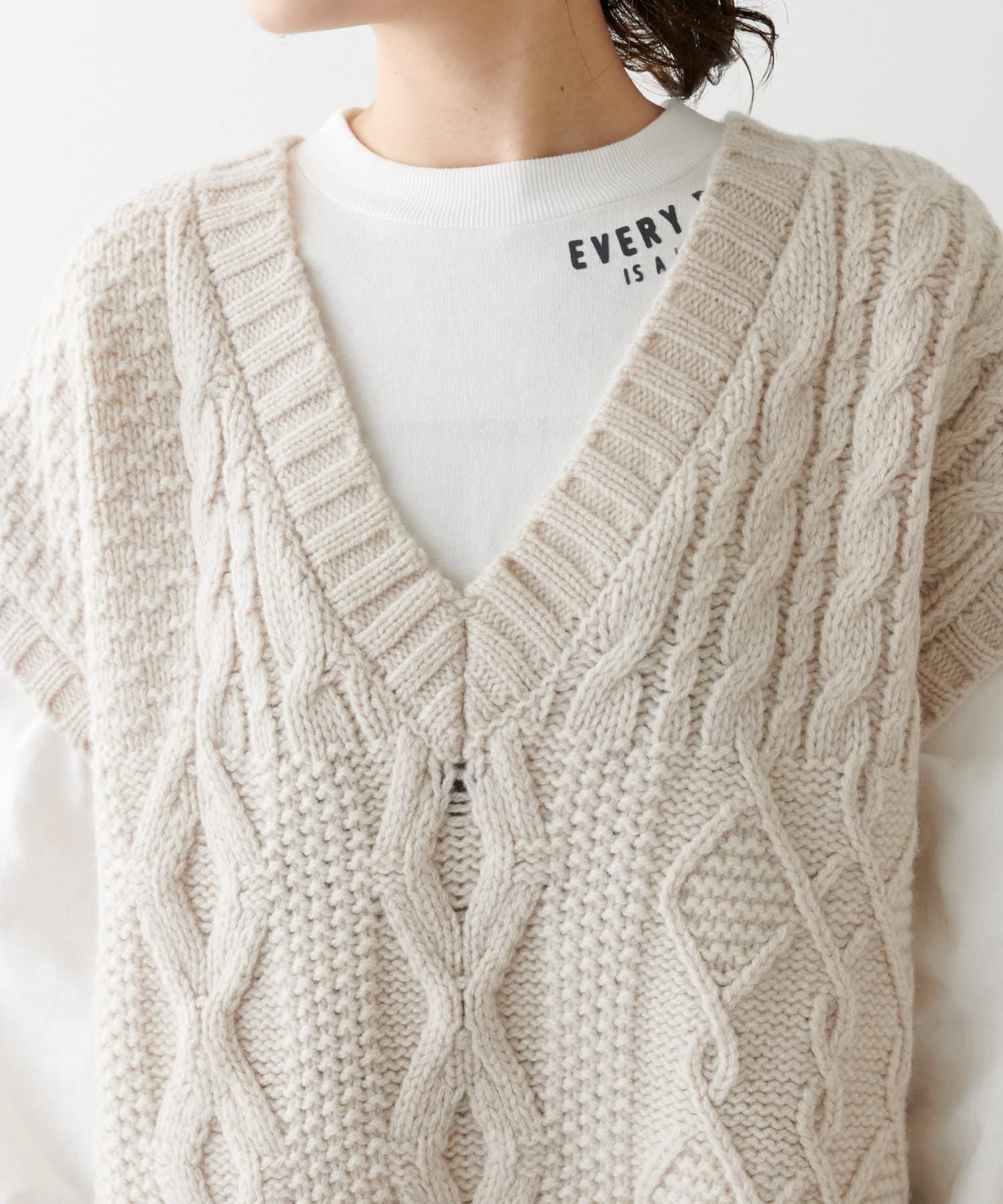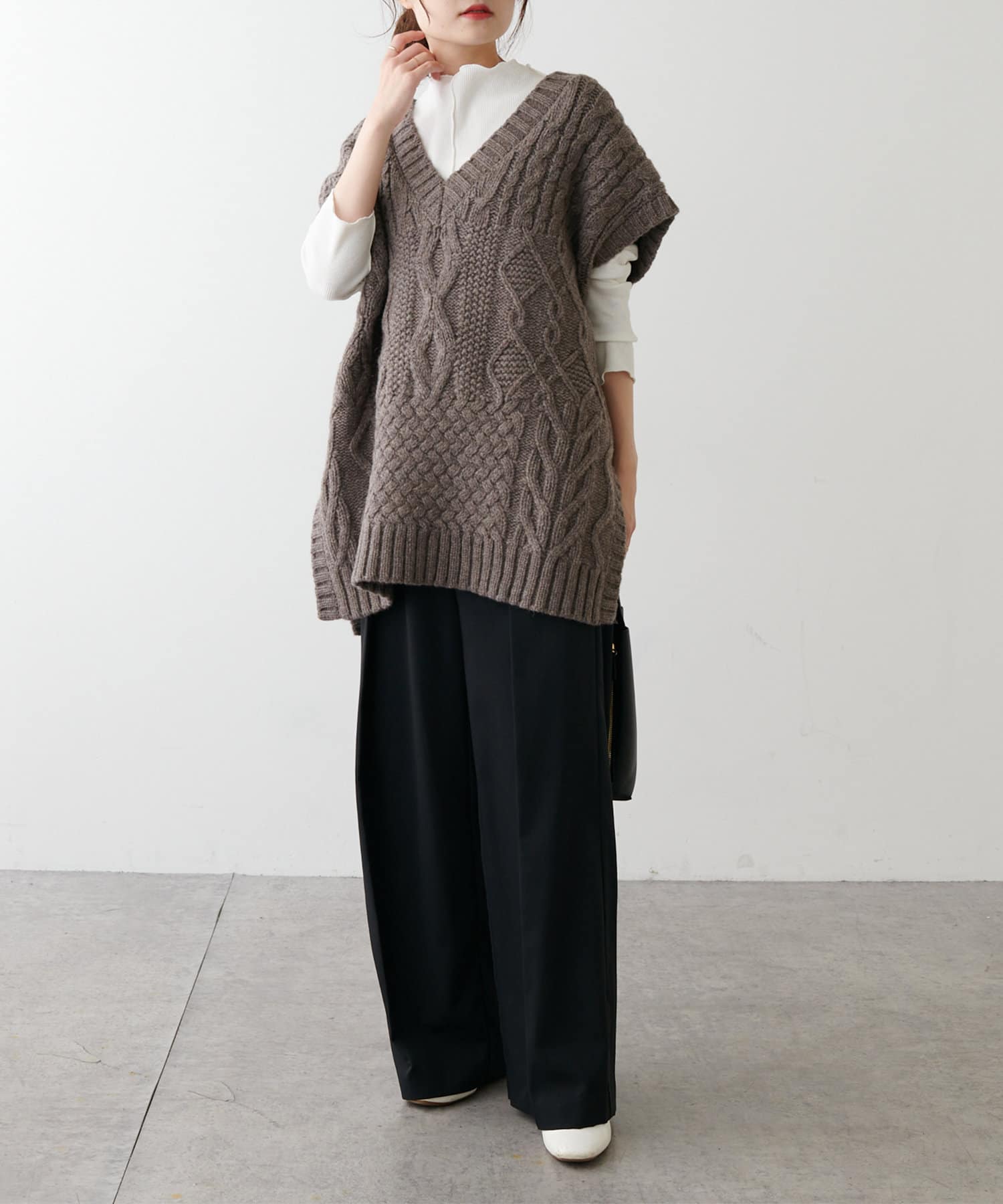 程よいボリューム感とたっぷりの編み地で立体感をだした今期注目のパッチワークニットベスト。