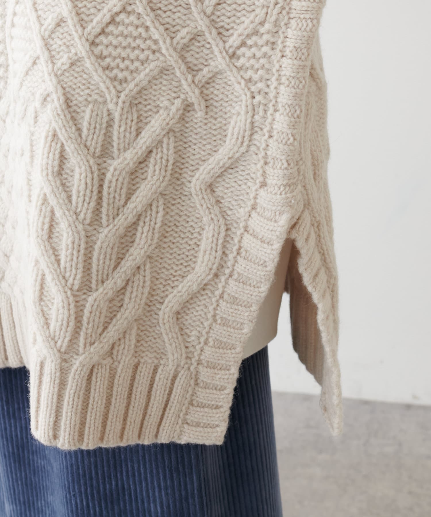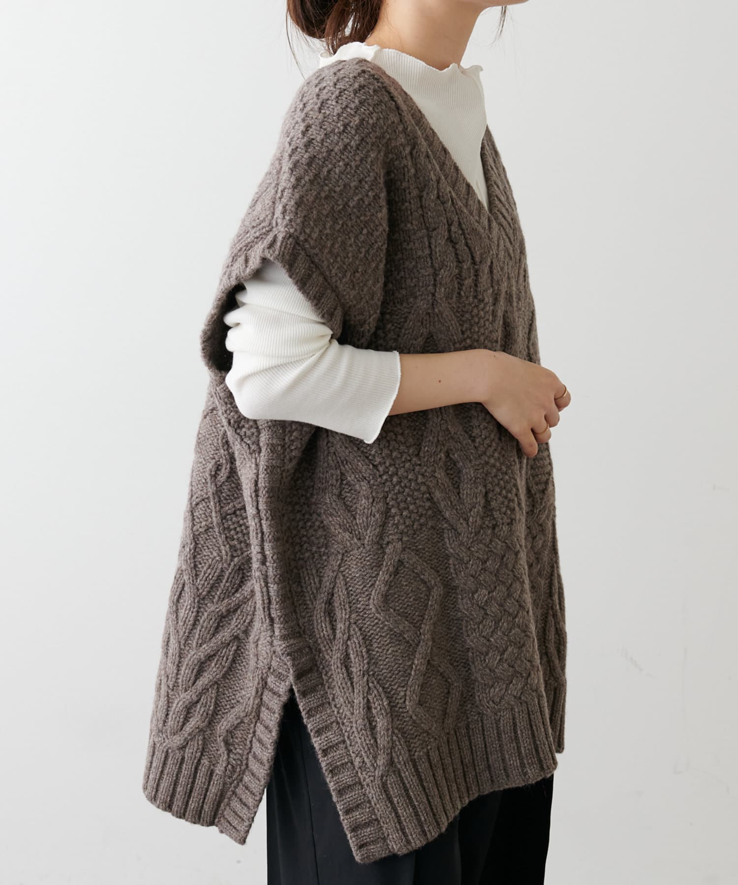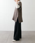 Vネックとサイドのスリットでニット素材でもすっきりとした見た目に。