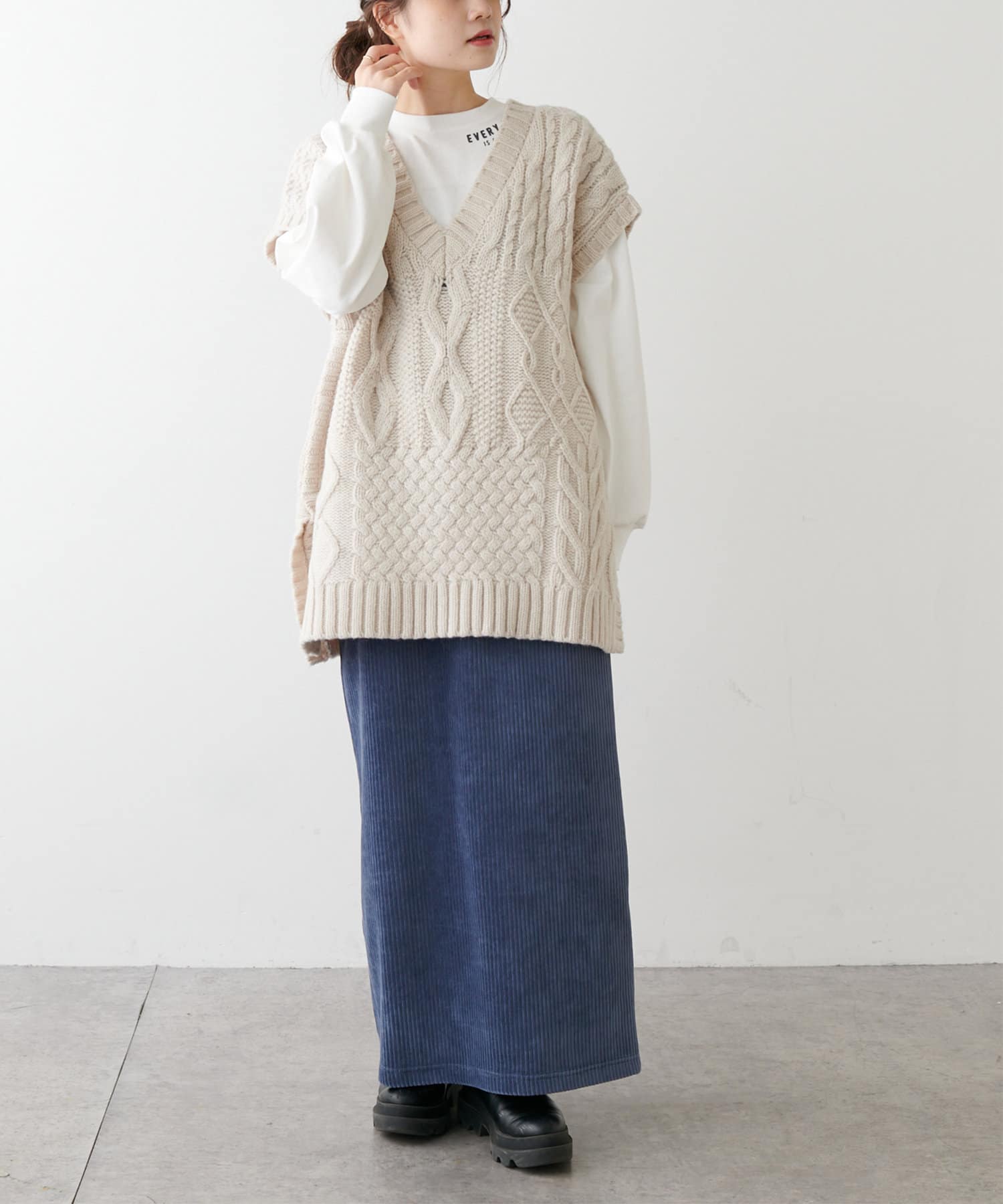 普段着用しているシャツやロンTに重ねるだけで一気に秋冬らしい印象に。