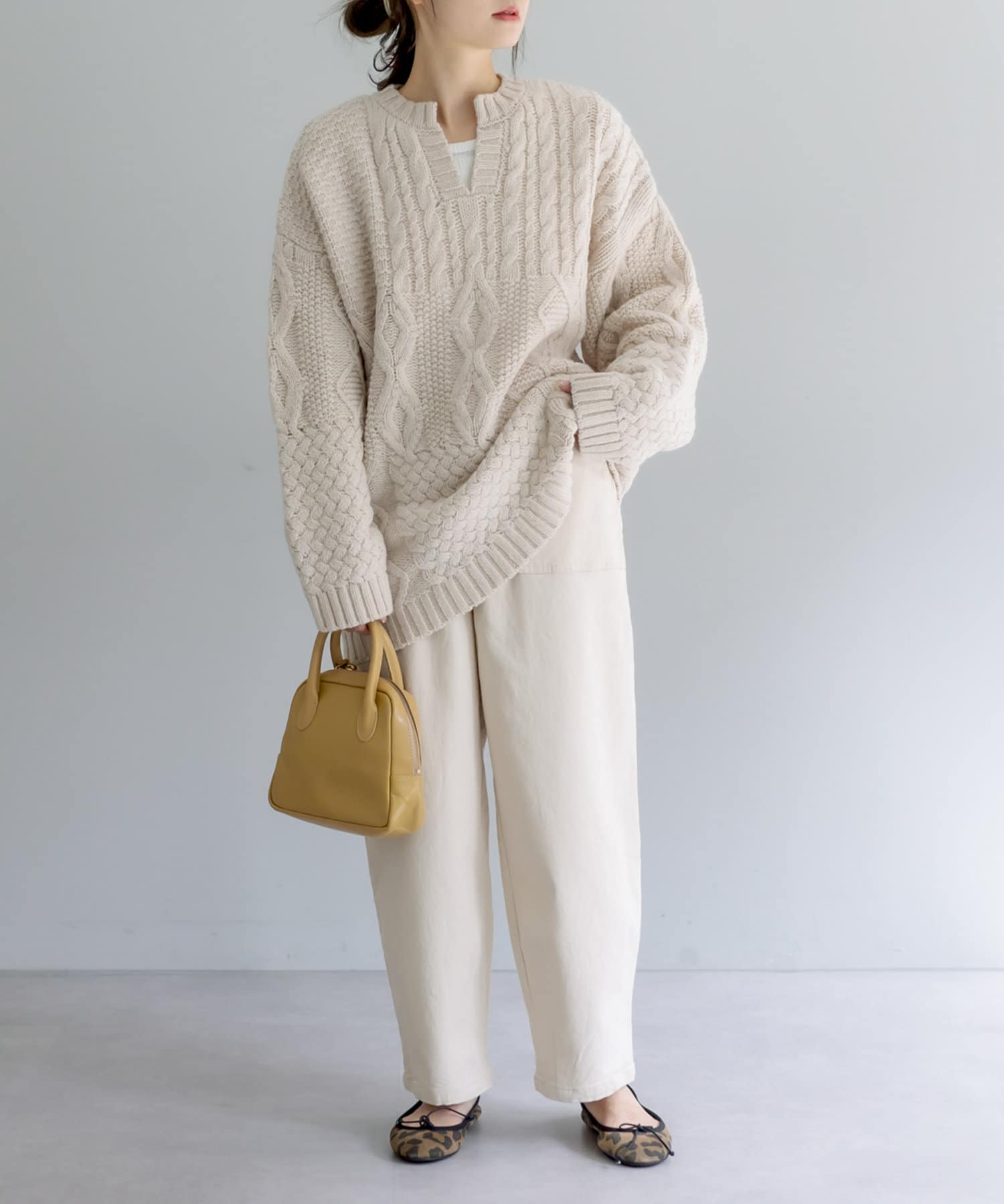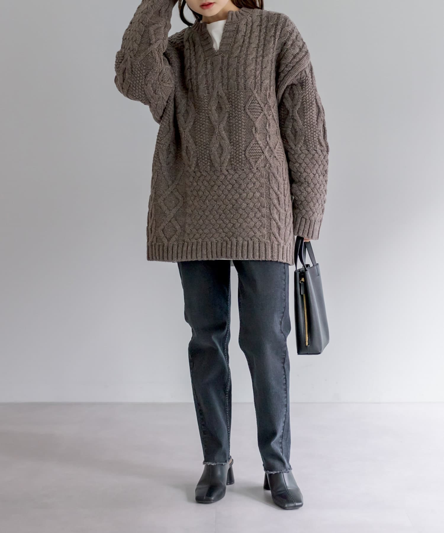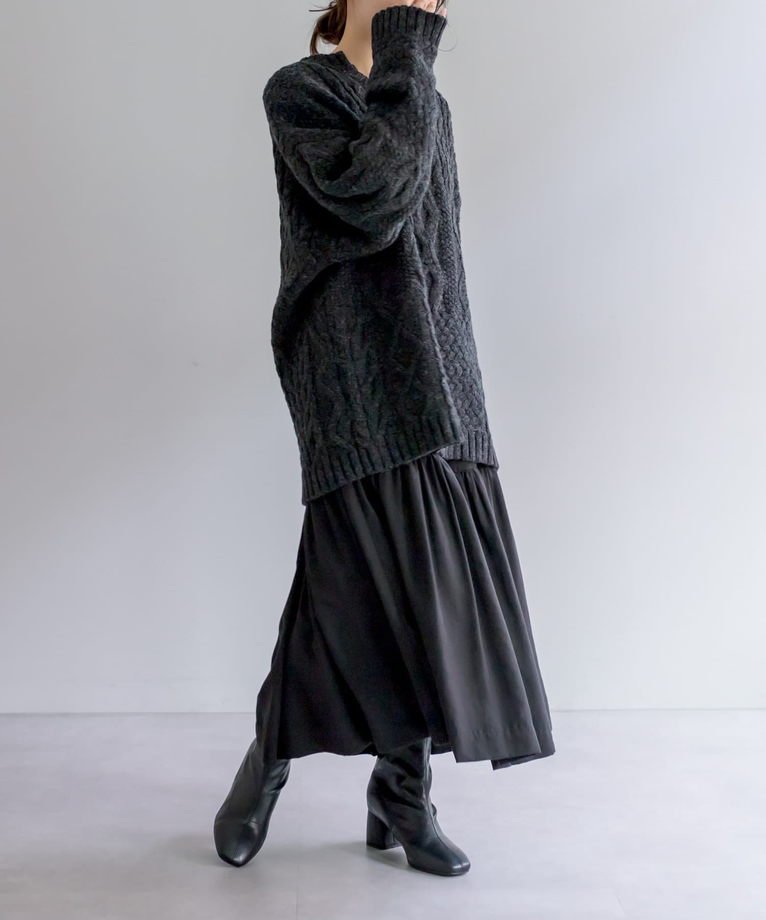 一枚でも様になるニットですが、タートルネックやカットソーと合わせれば雰囲気の違ったスタイリングが楽しめます。