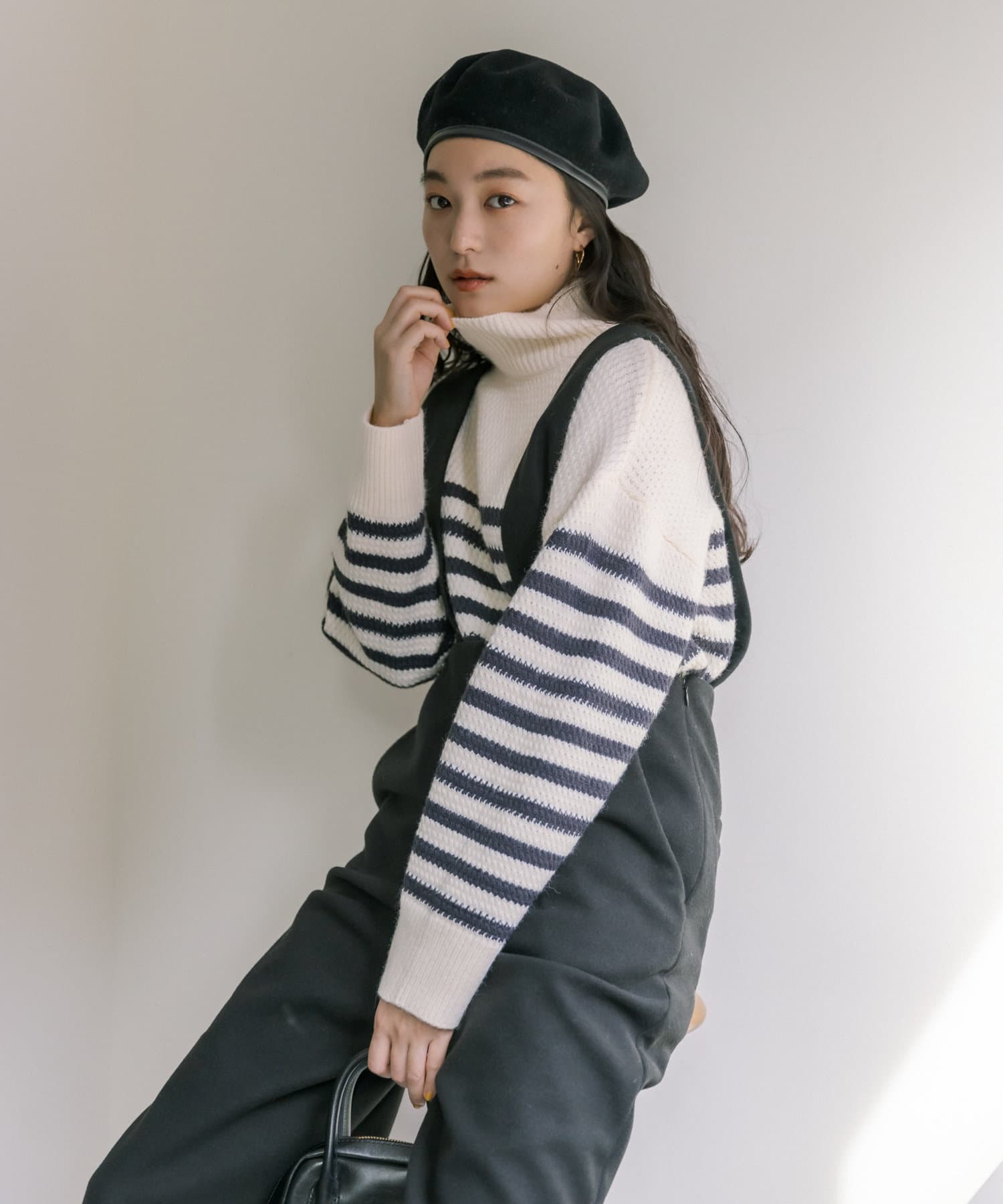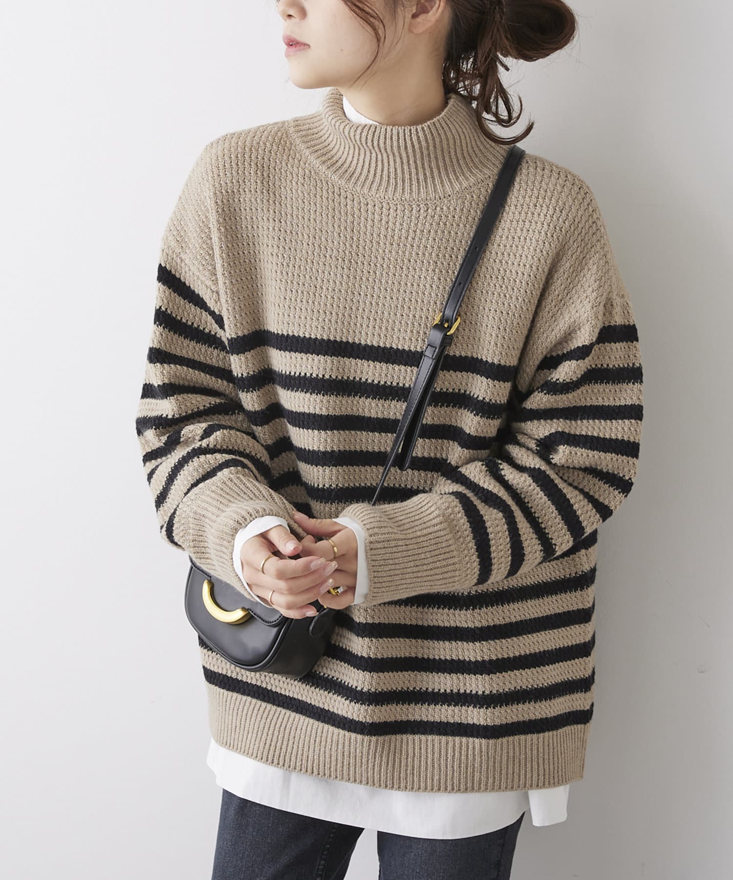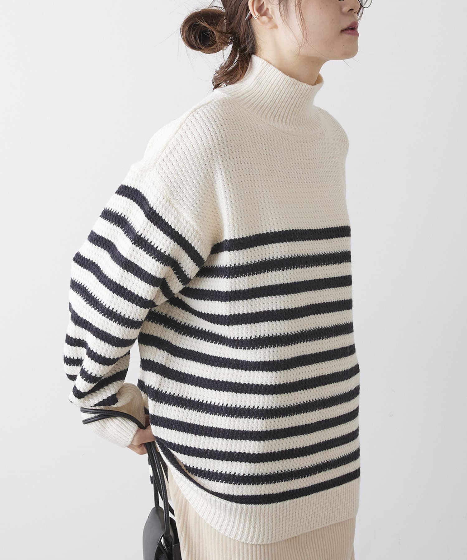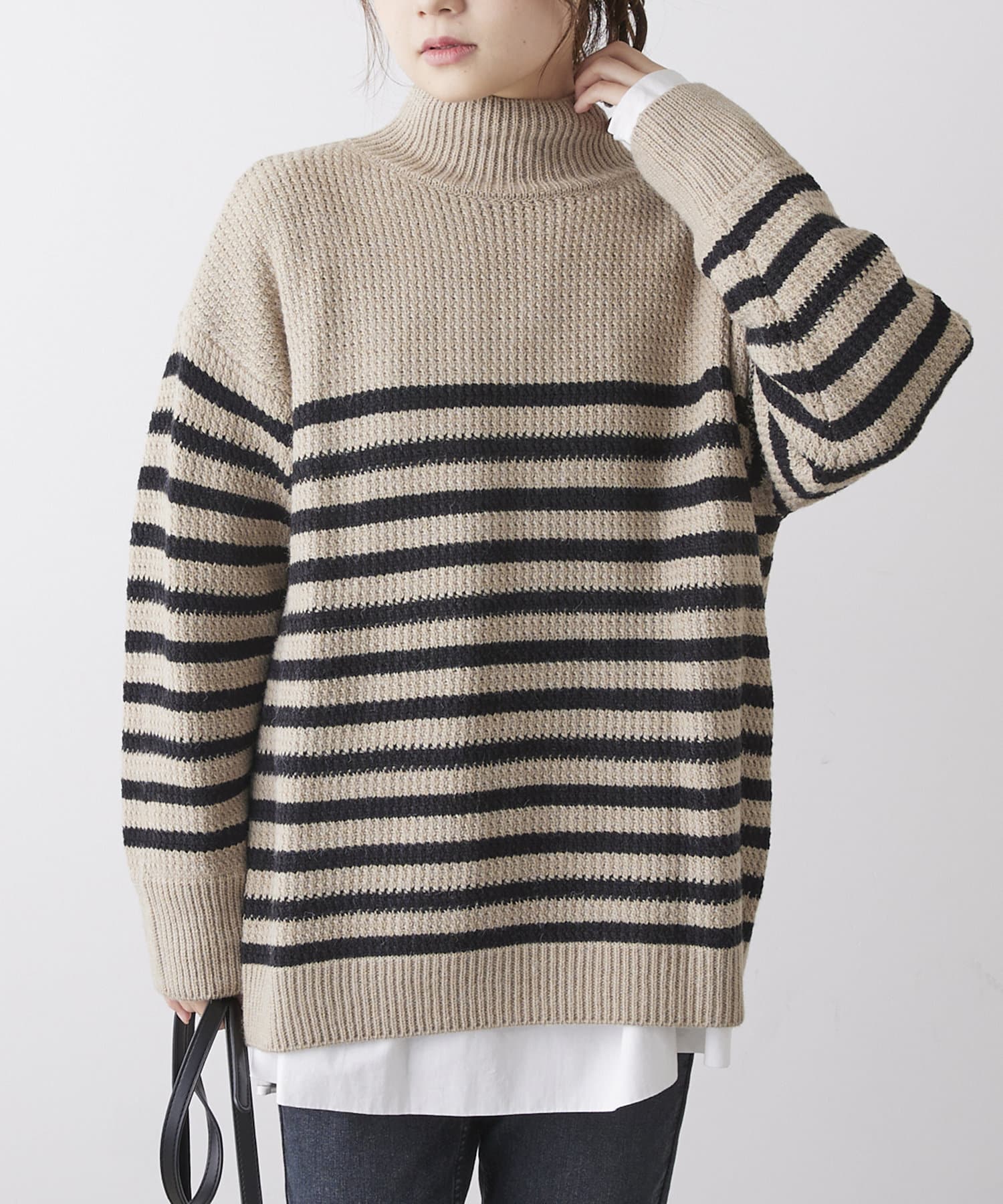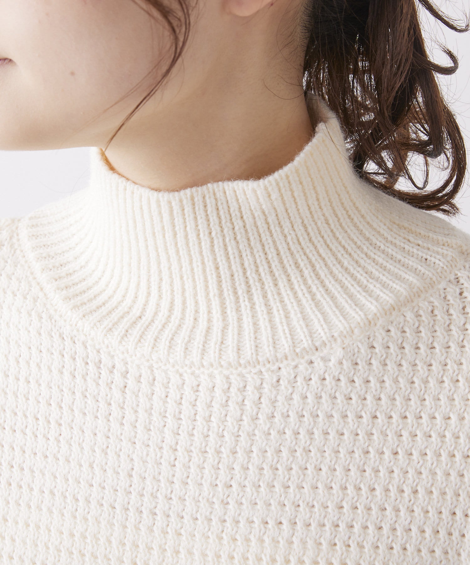 少し太めのローゲージの糸を使用することで、綺麗見えするハイネックもカジュアルにデイリーユース出来るようなデザインに。