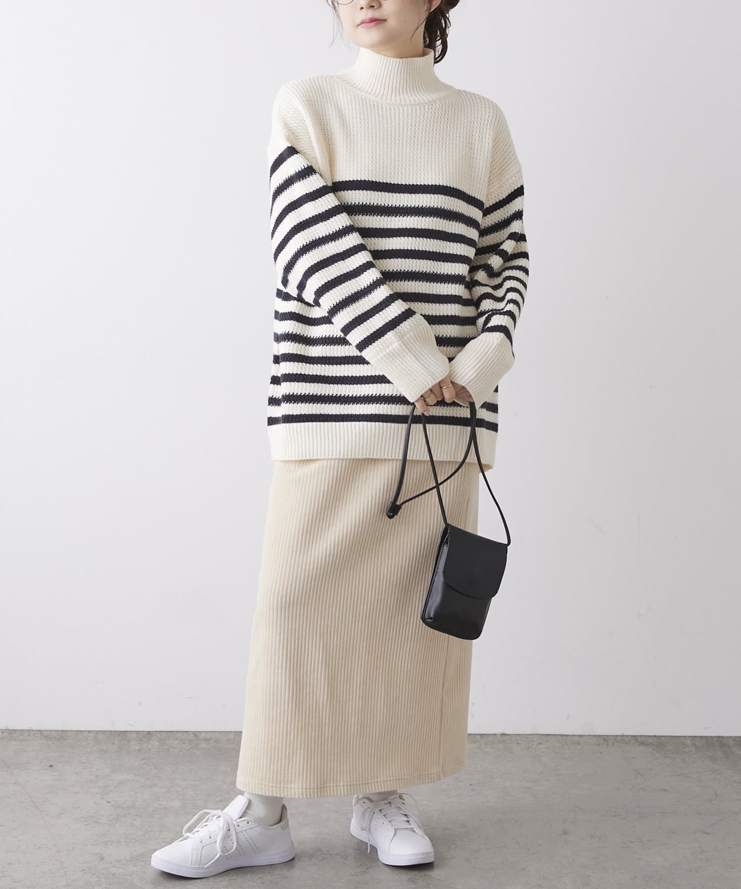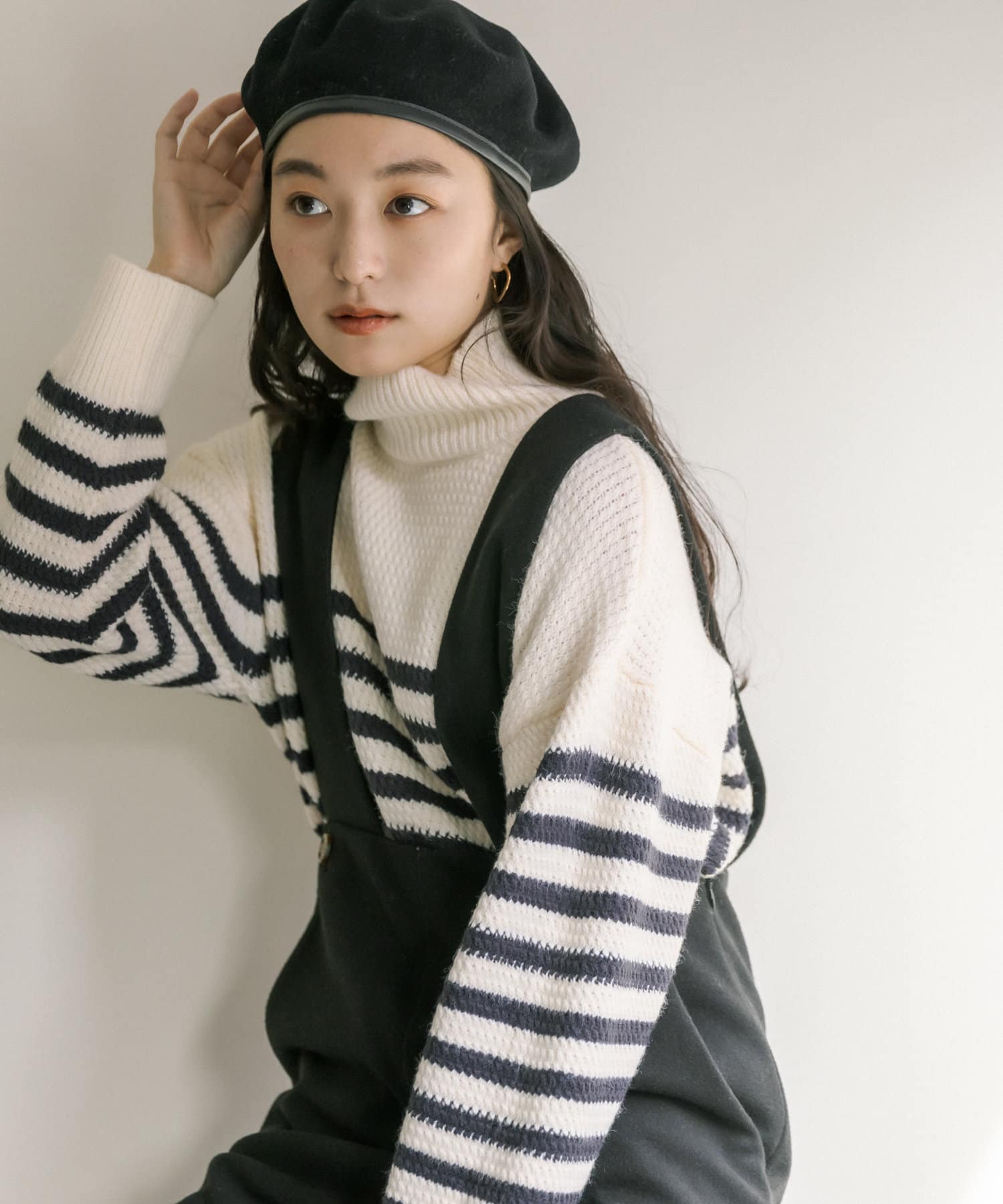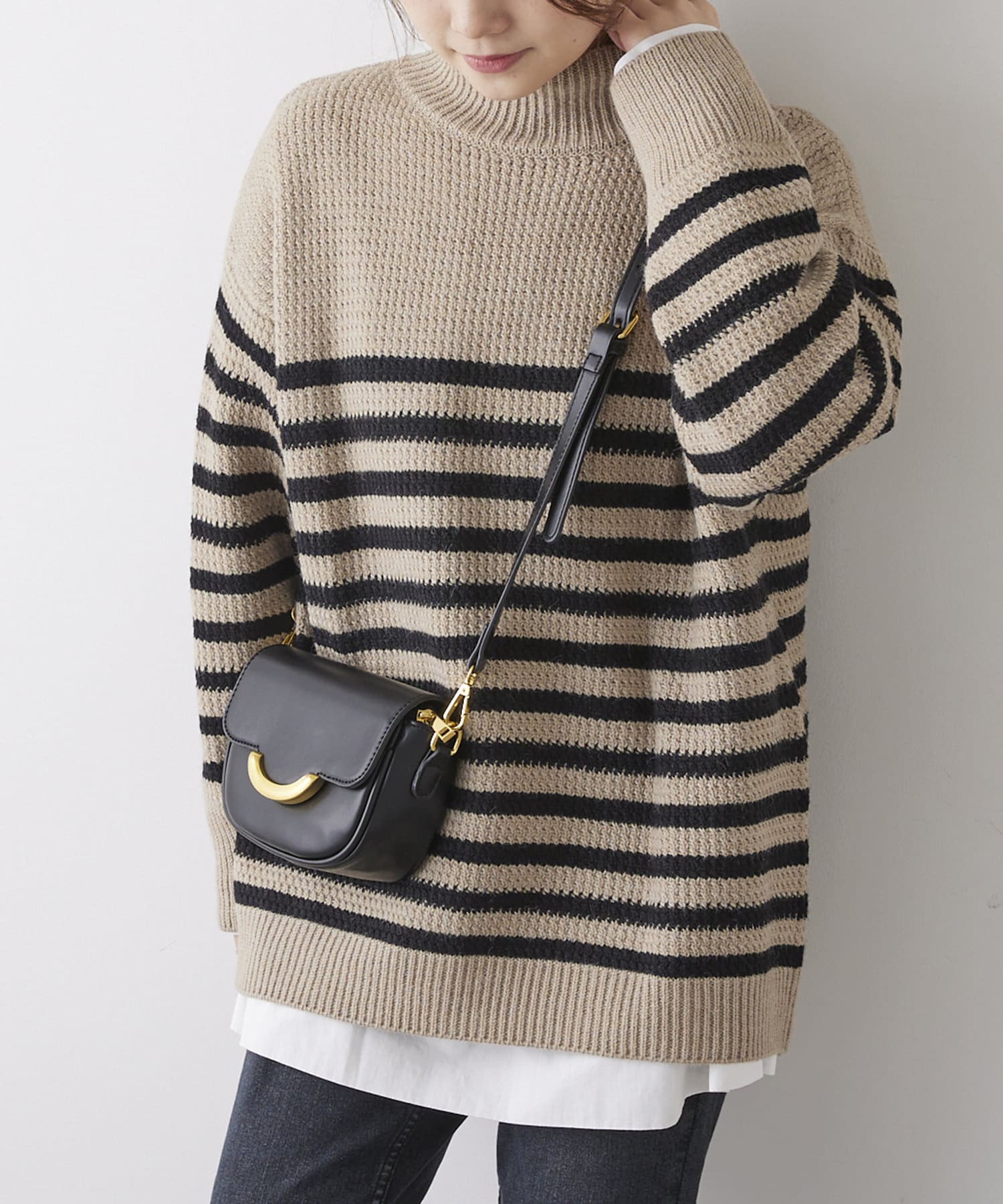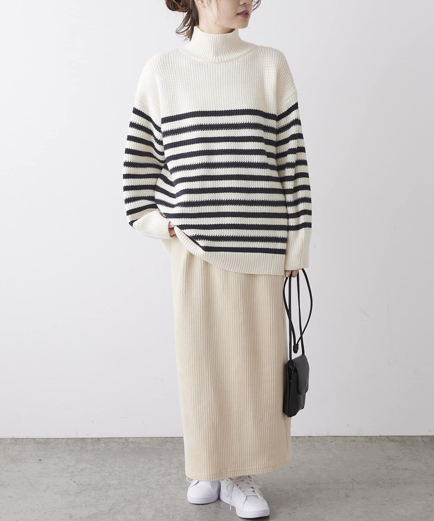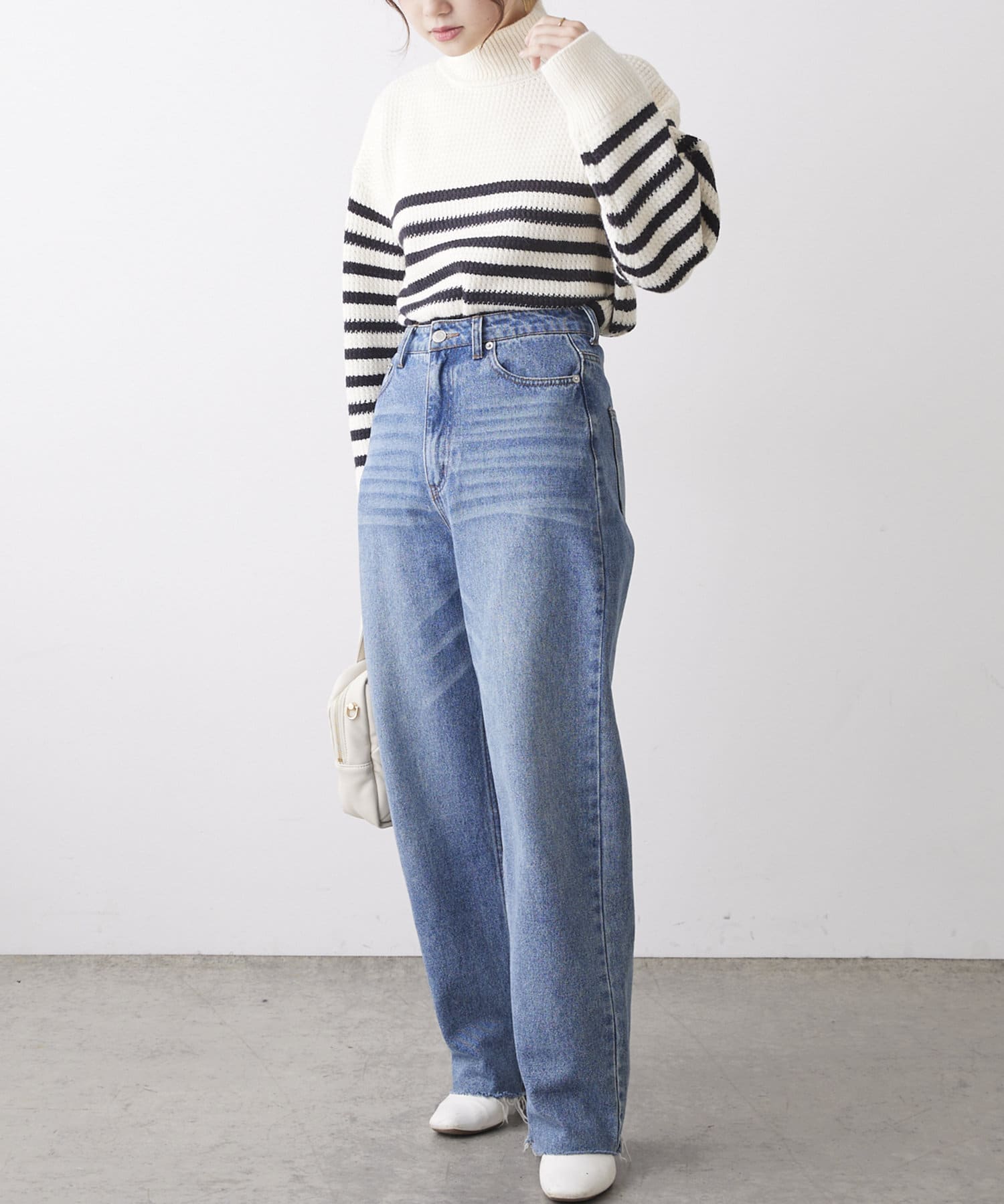 少し太めのローゲージの糸を使用することで、綺麗見えするハイネックもカジュアルにデイリーユース出来るようなデザインに。