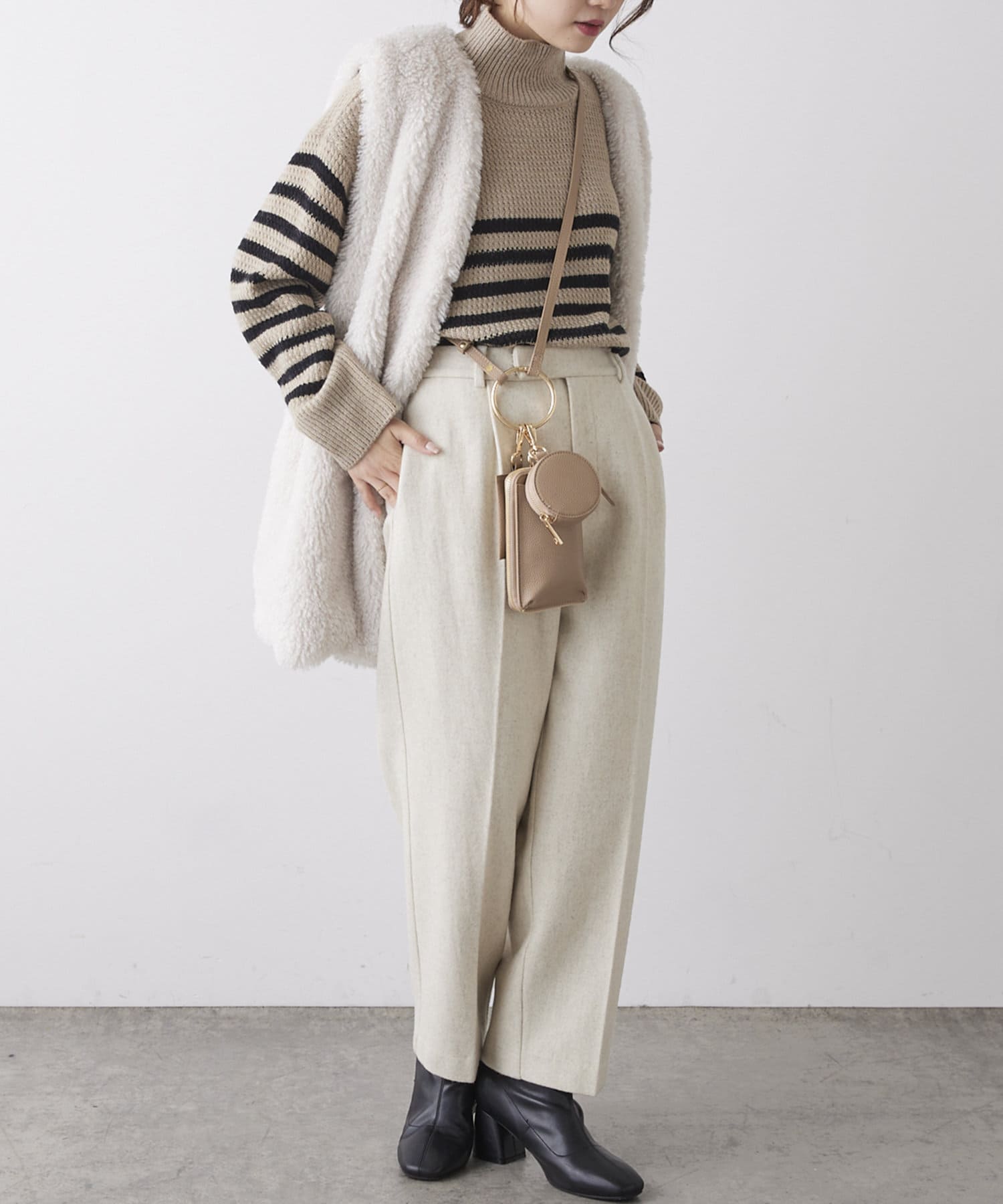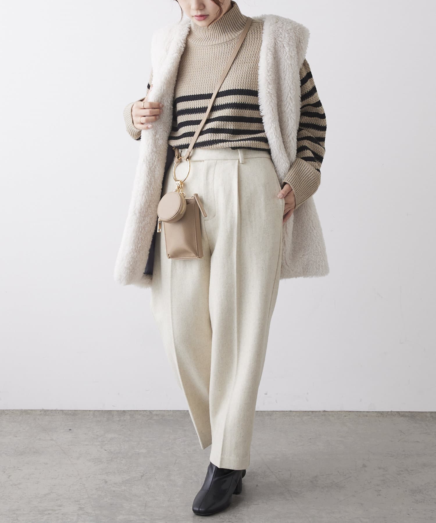 アイボリー/ベージュと落ち着いたカラー展開なので、華やかなカラーアイテムとも好相性◎