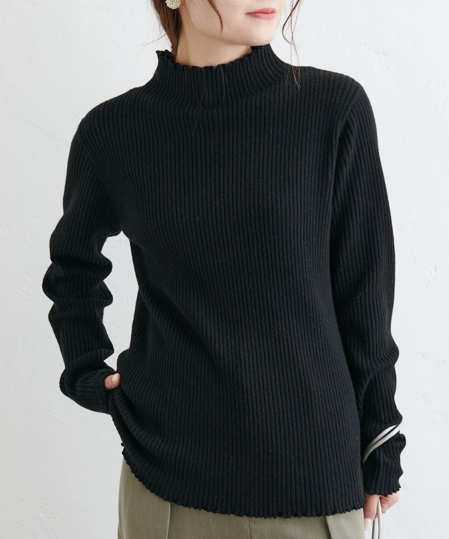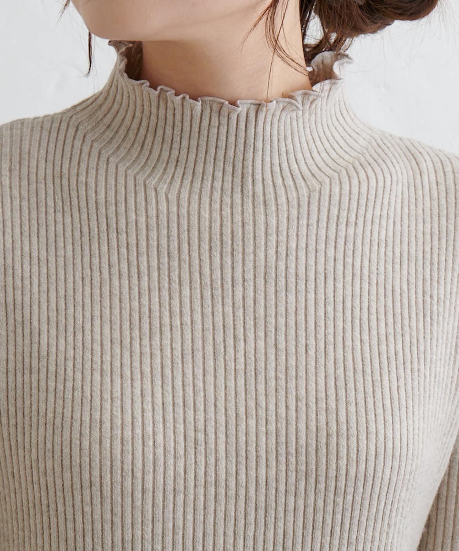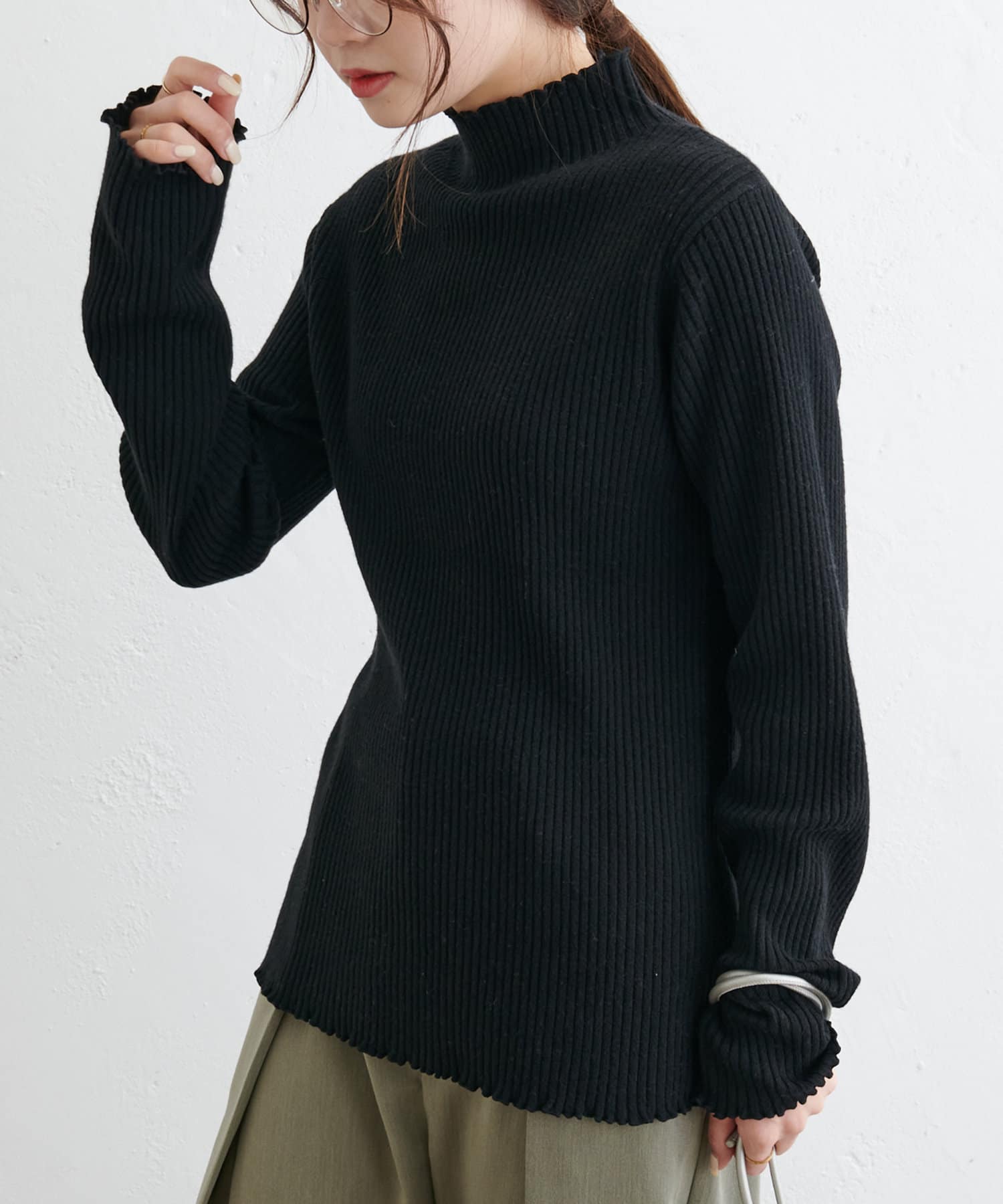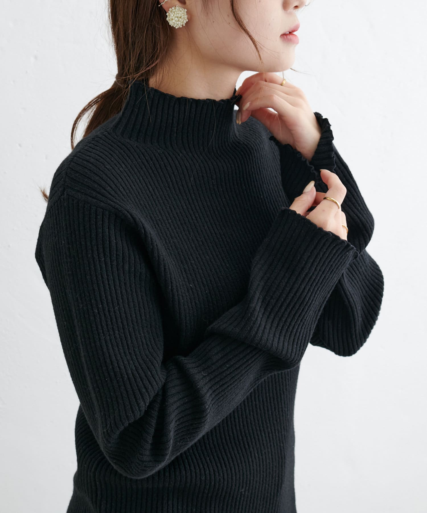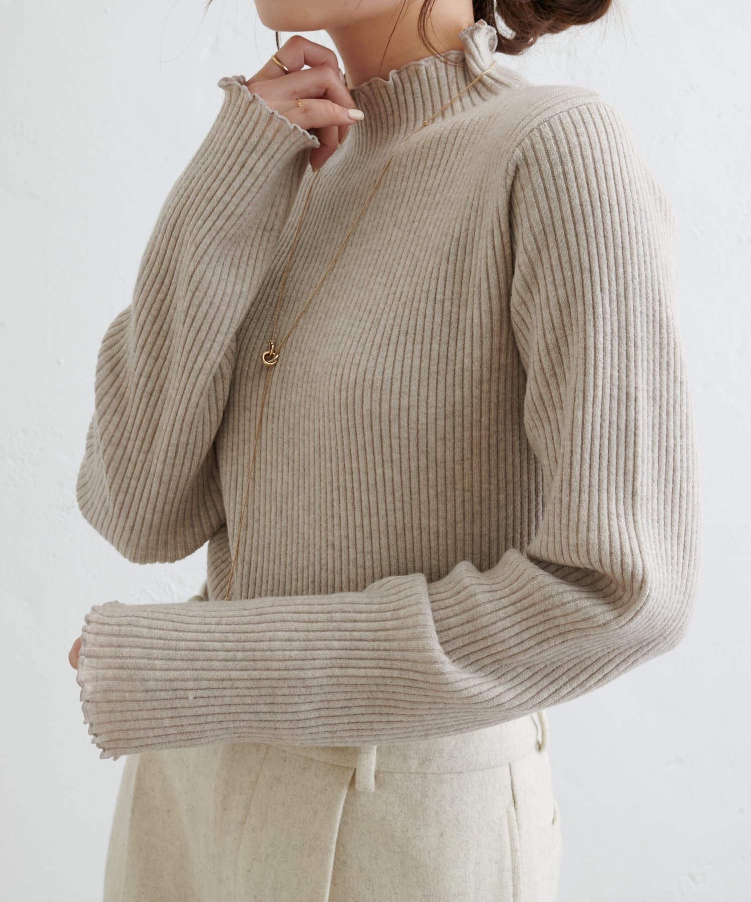 首元、袖、裾のメローフリルがポイントのハイネックニット。