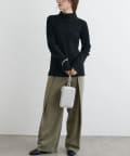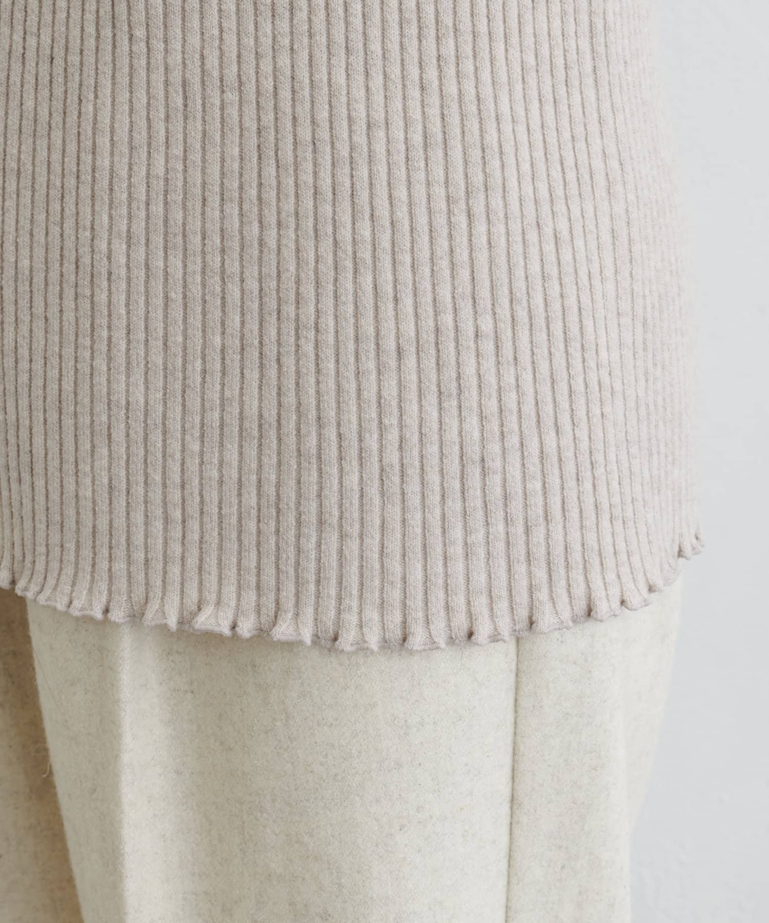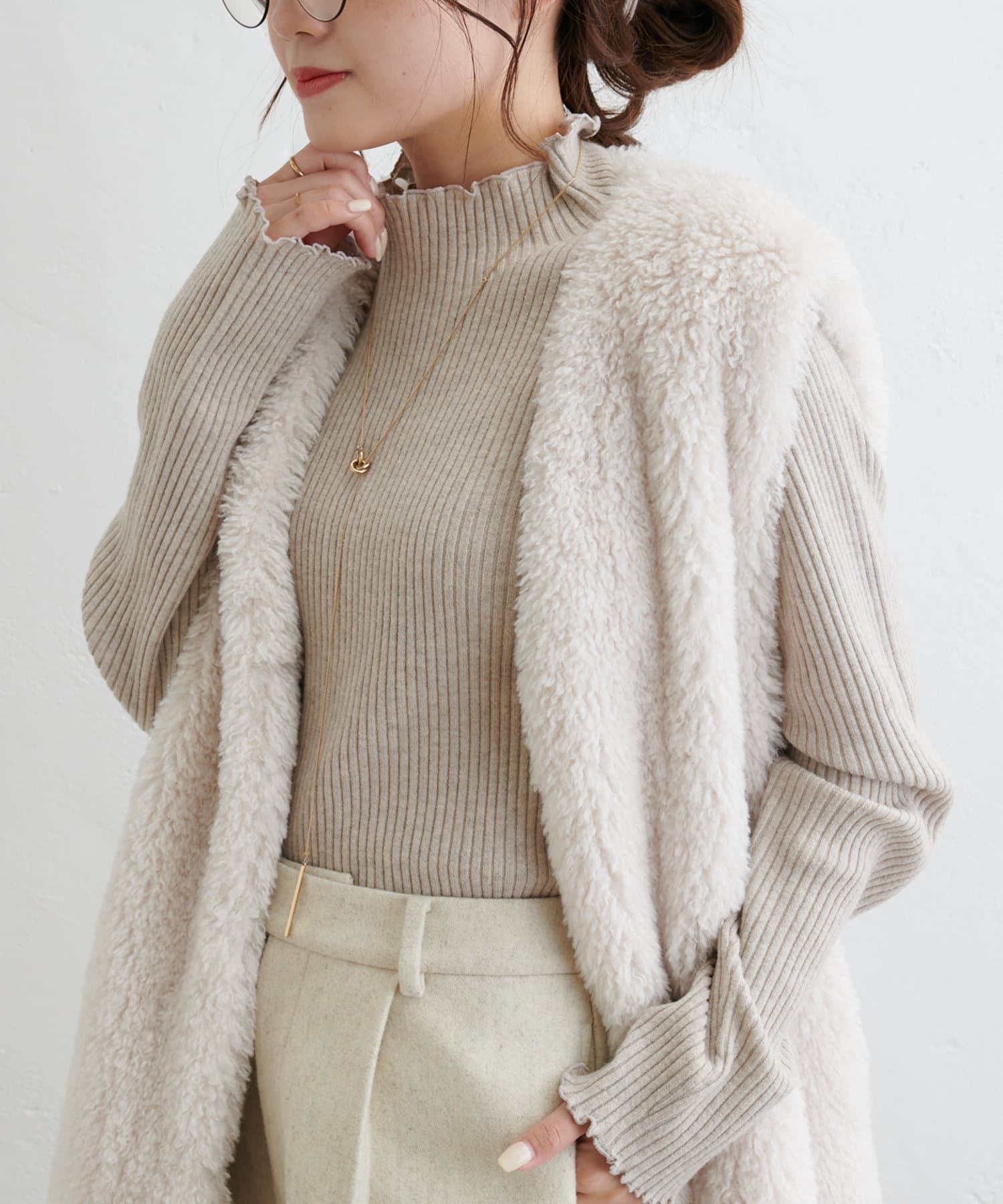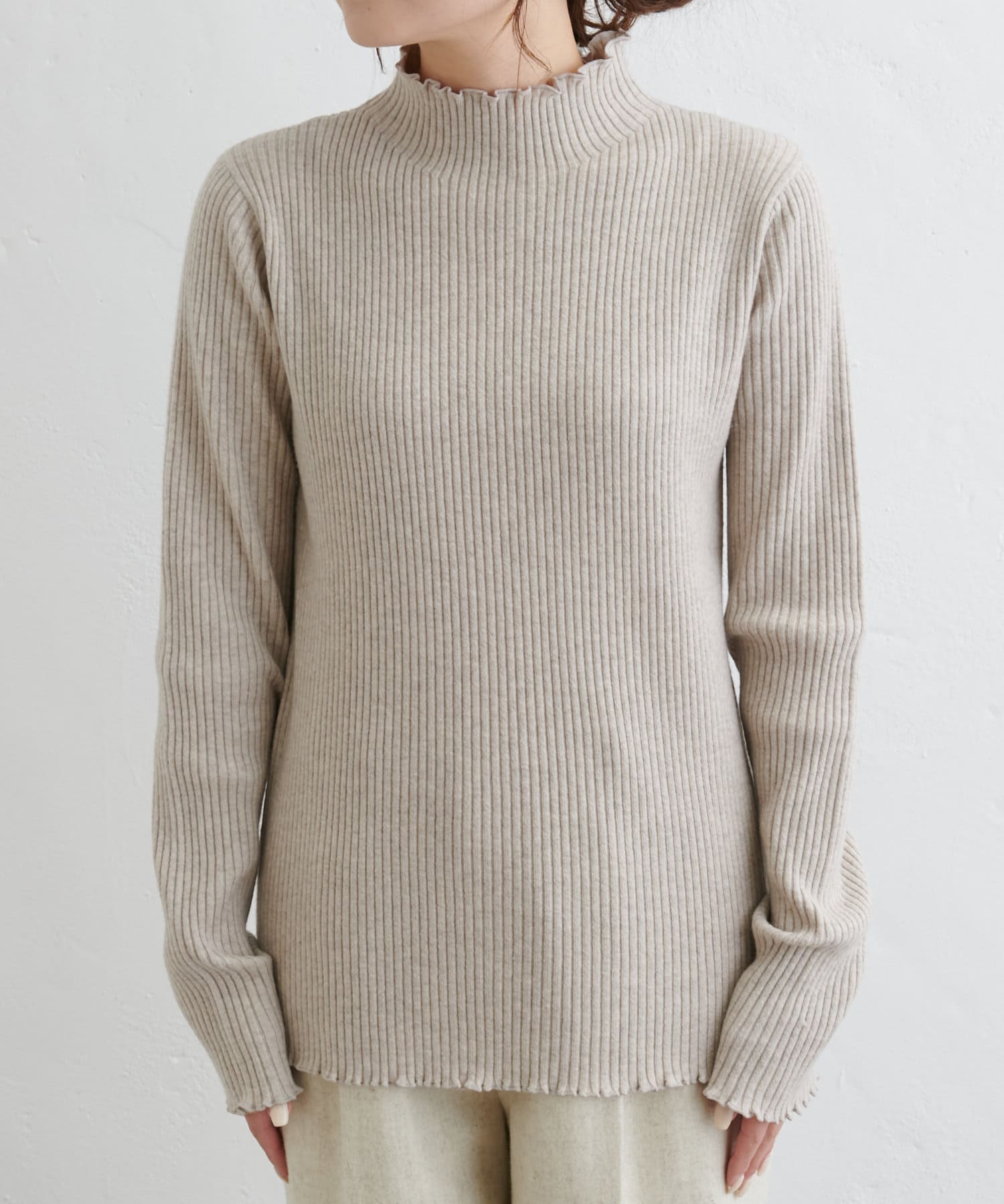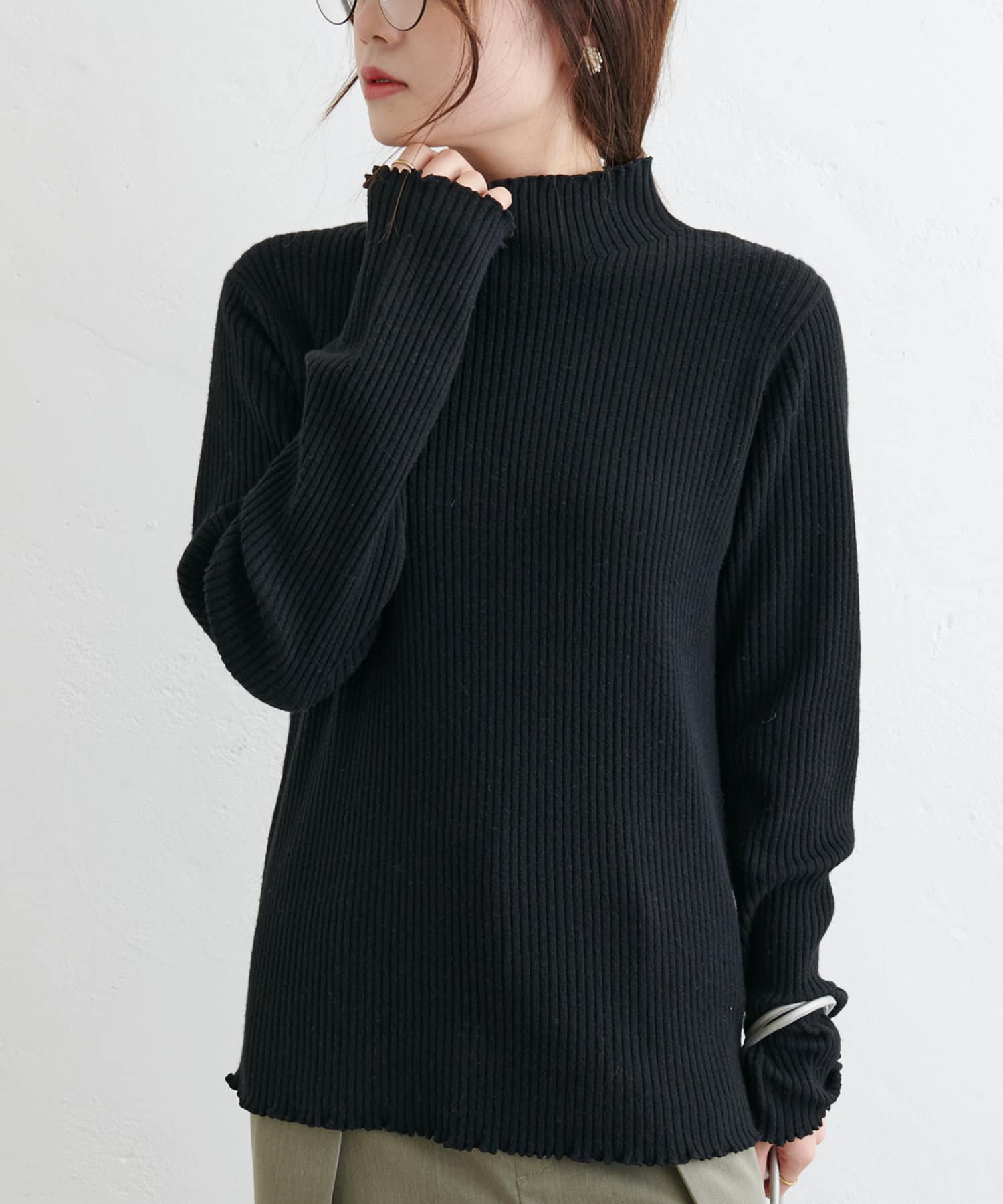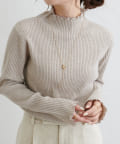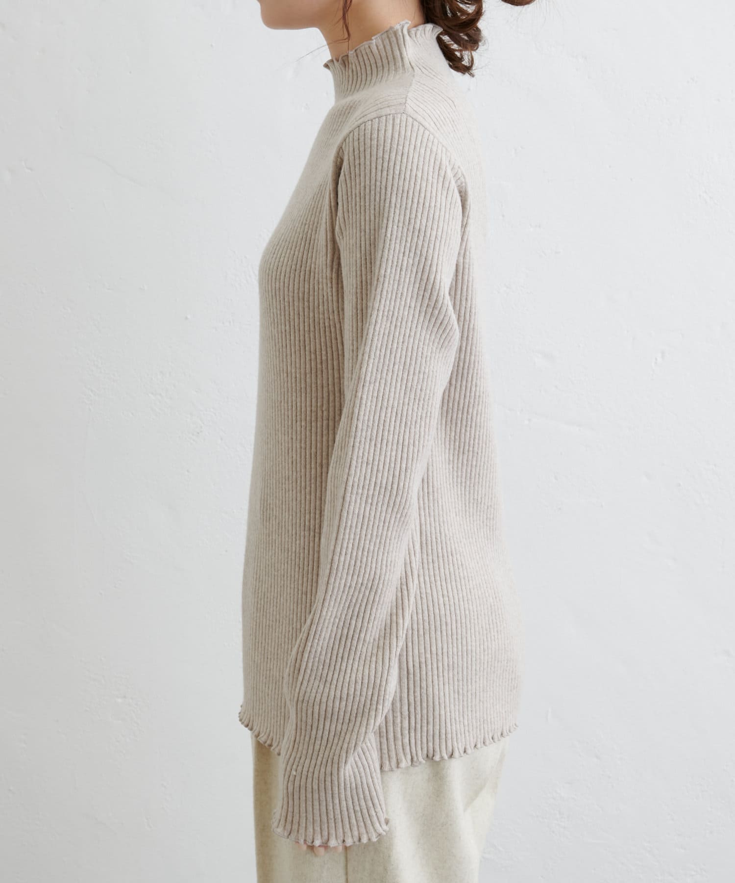 首元、袖、裾のメローフリルがポイントのハイネックニット。