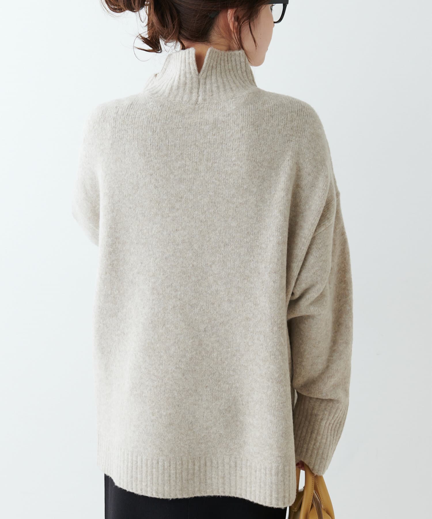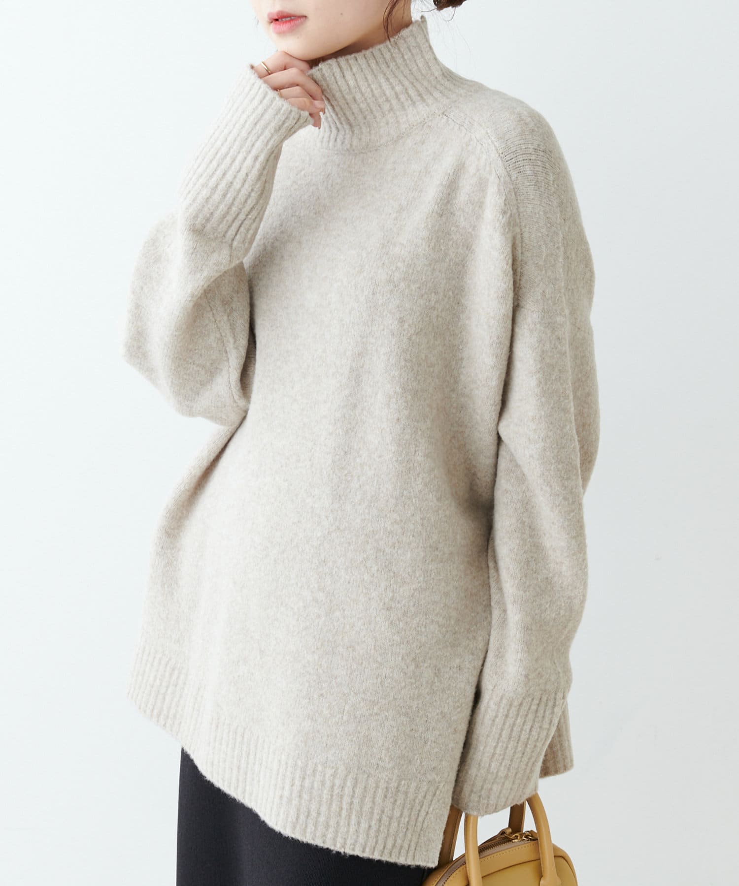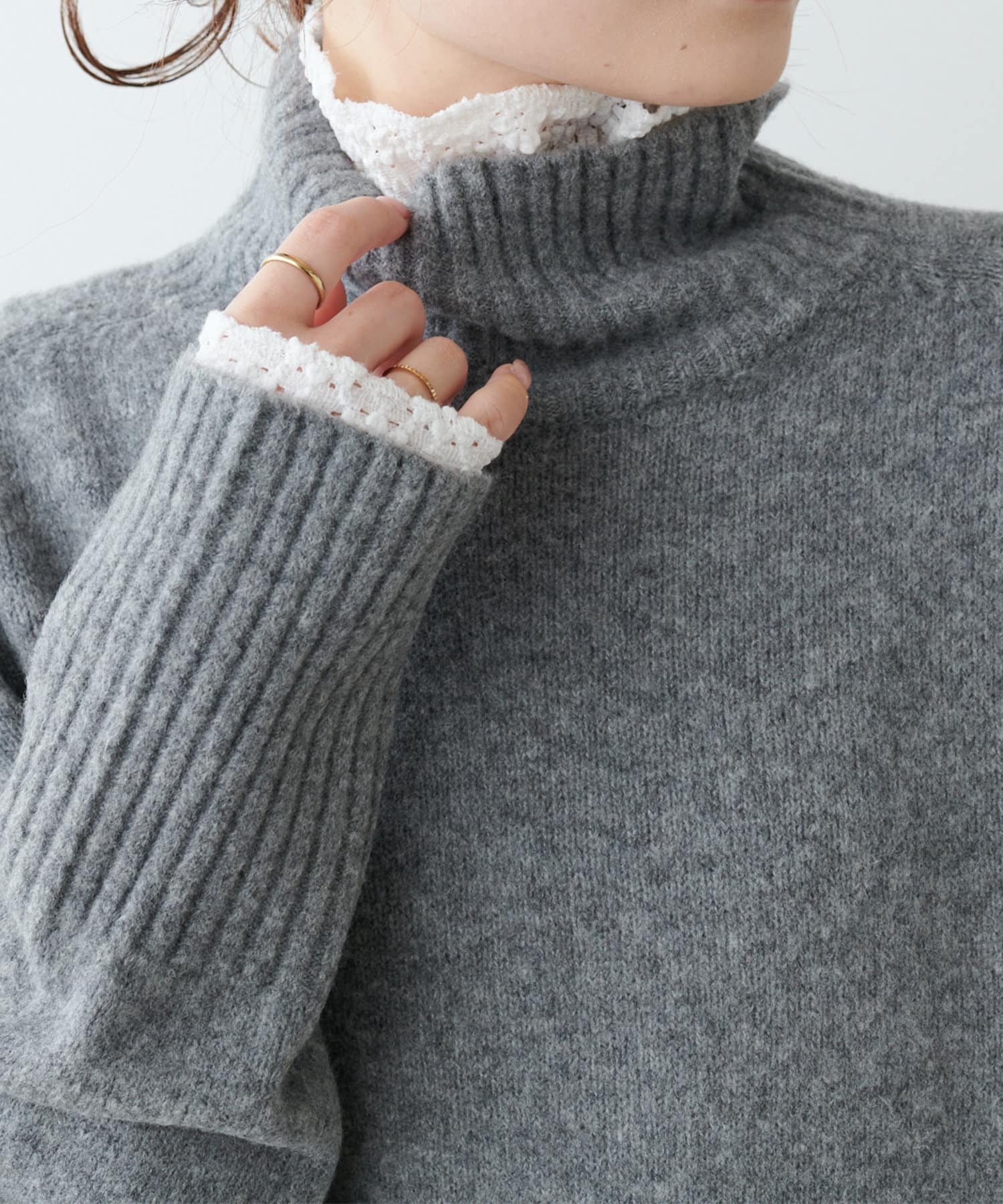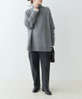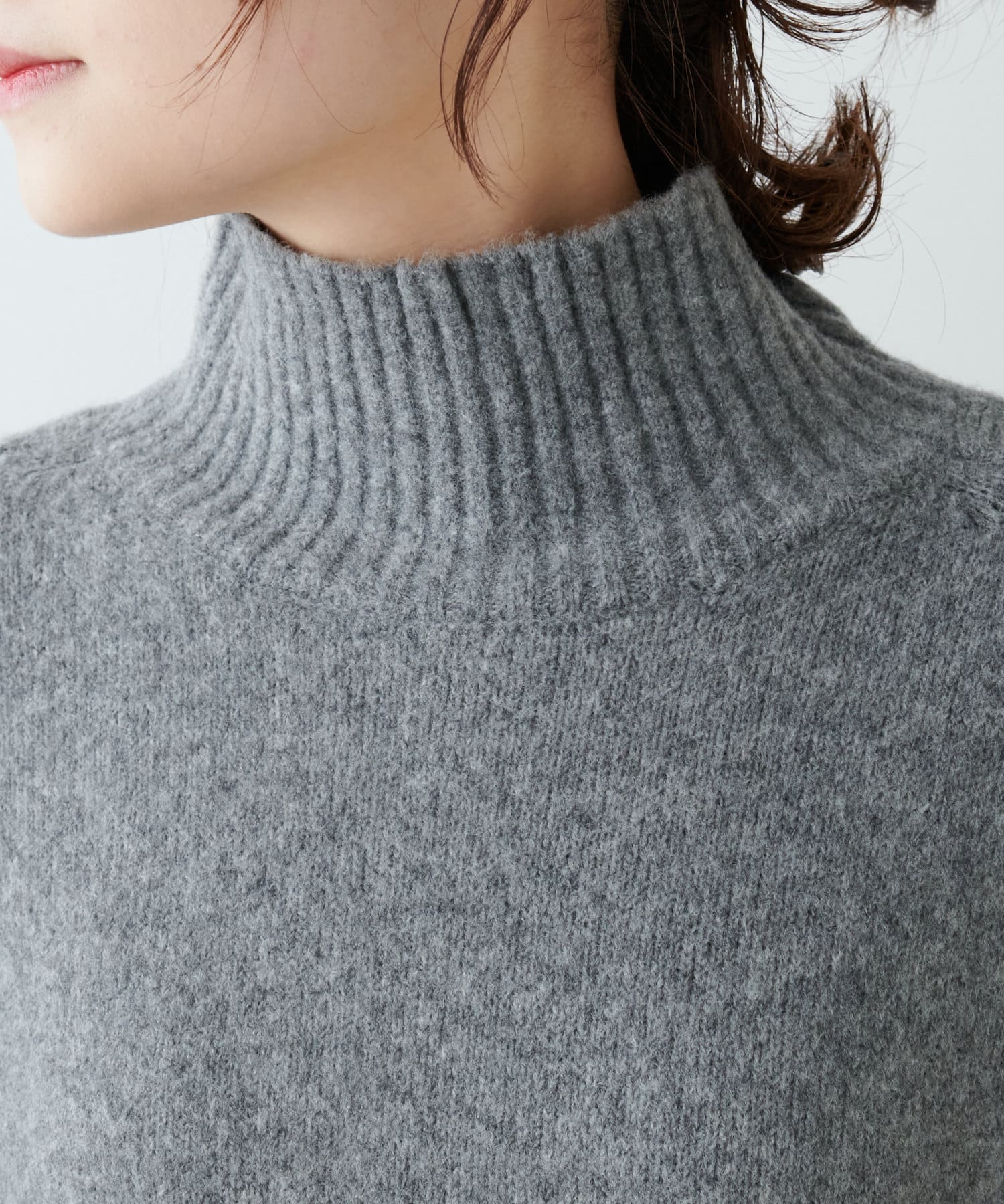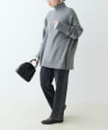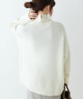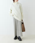 ハイネック部分や袖、裾はリブ編みで、立体的な表情をプラス◎