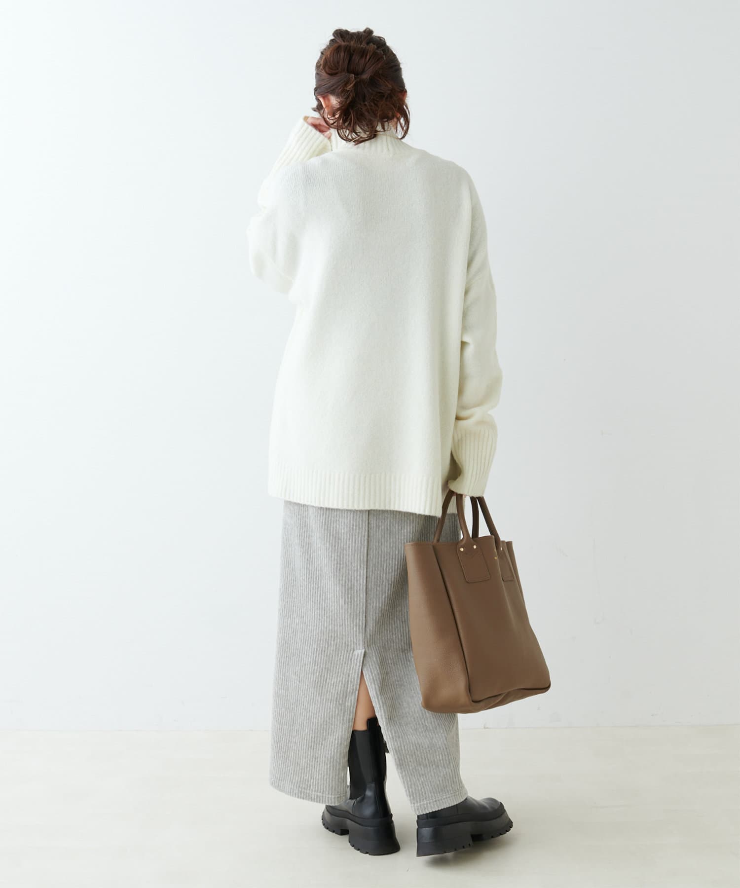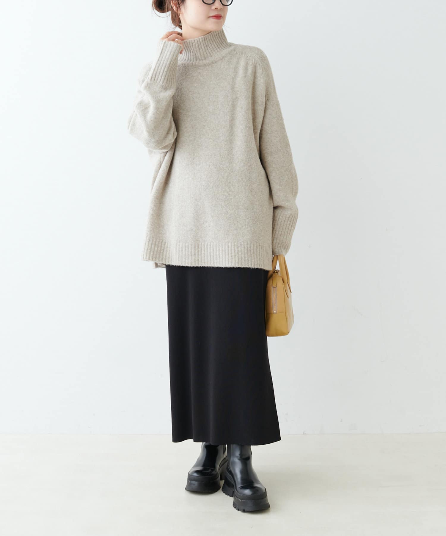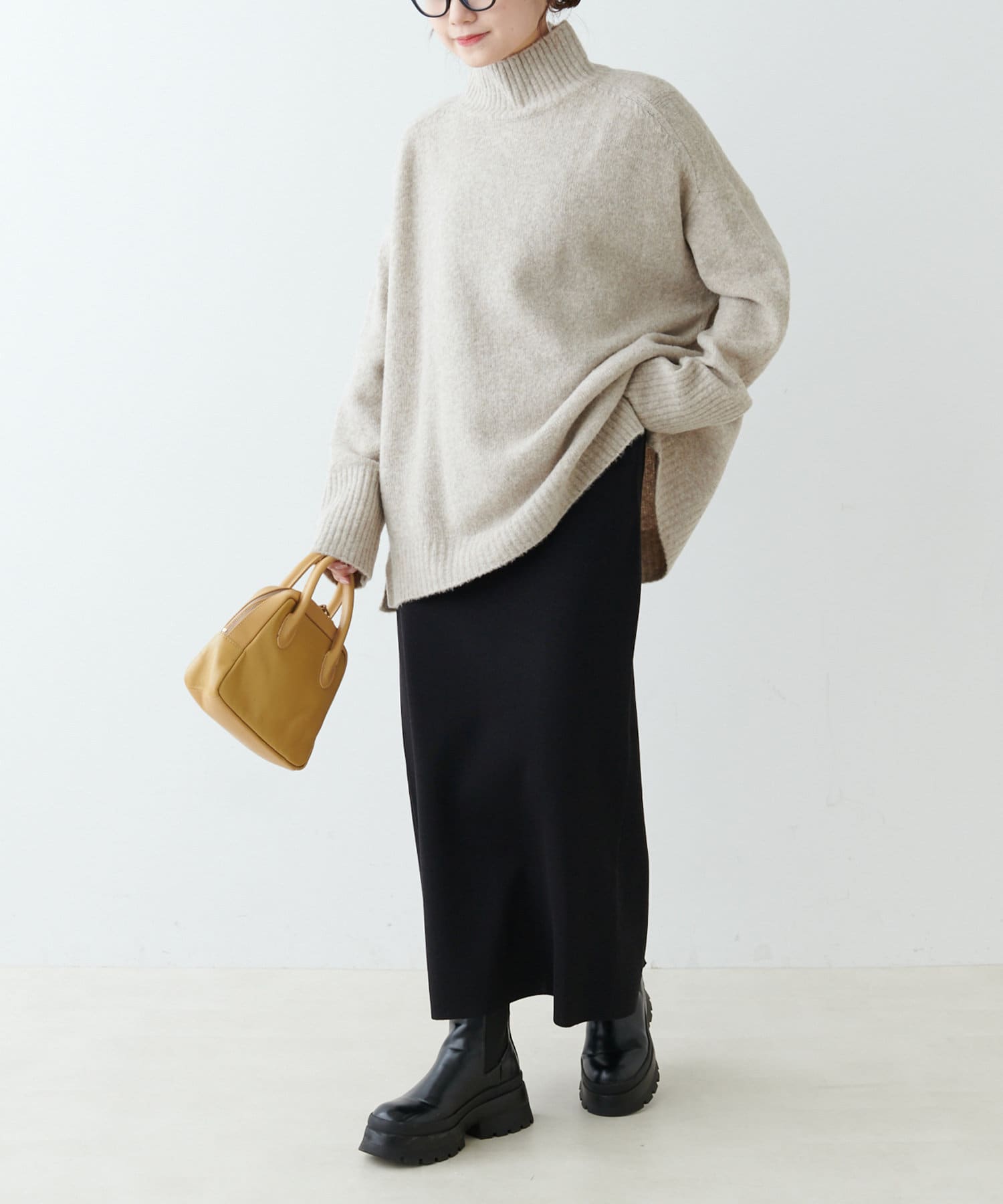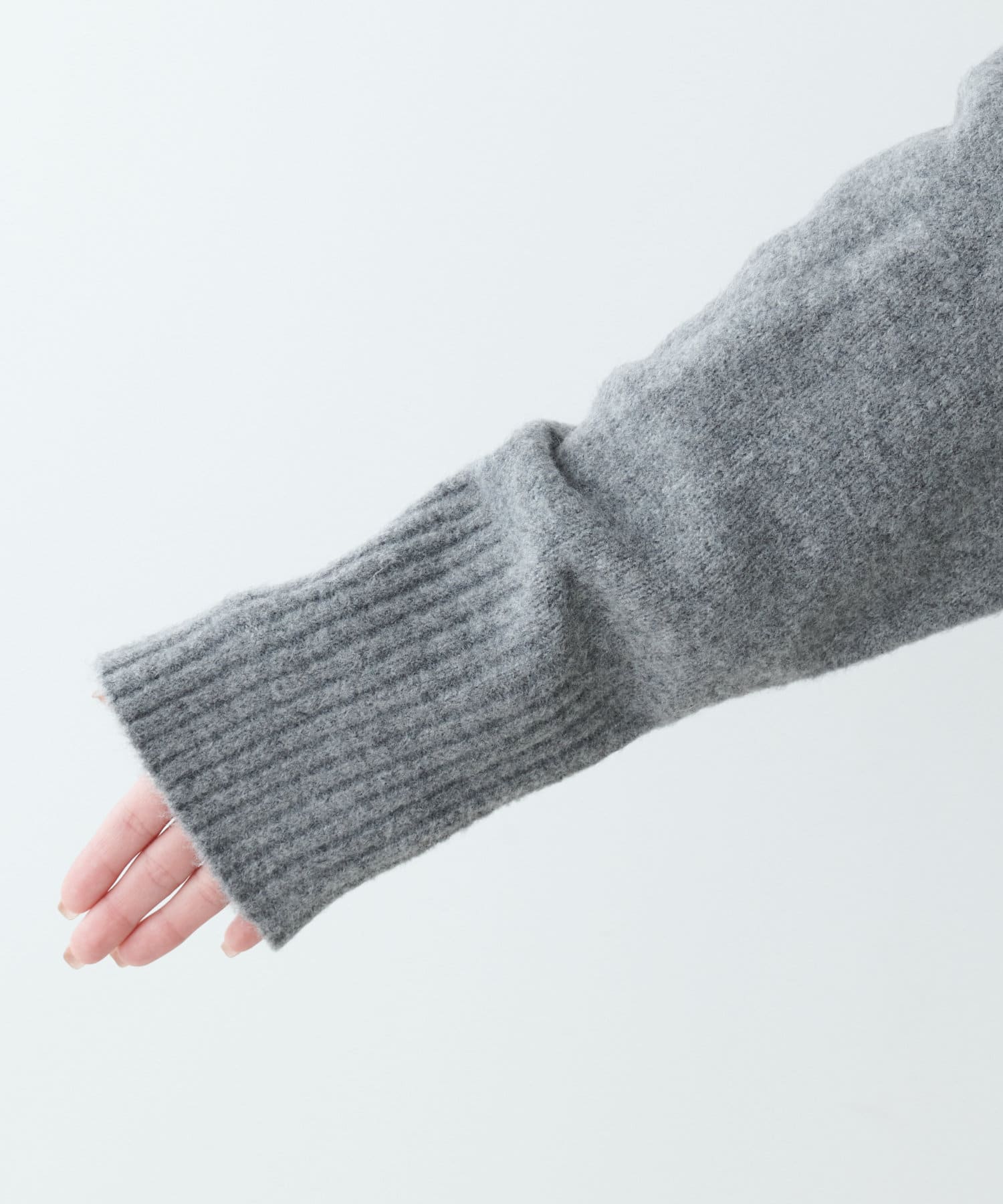 ハイネック部分や袖、裾はリブ編みで、立体的な表情をプラス◎