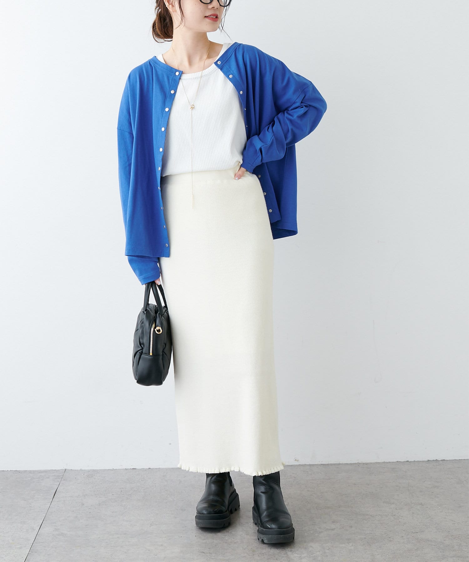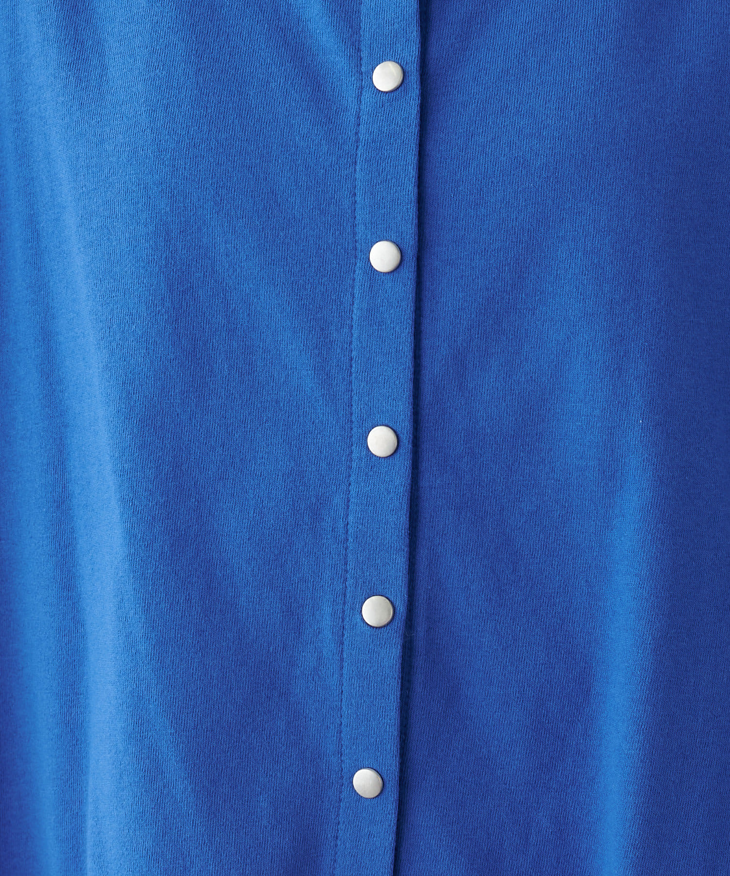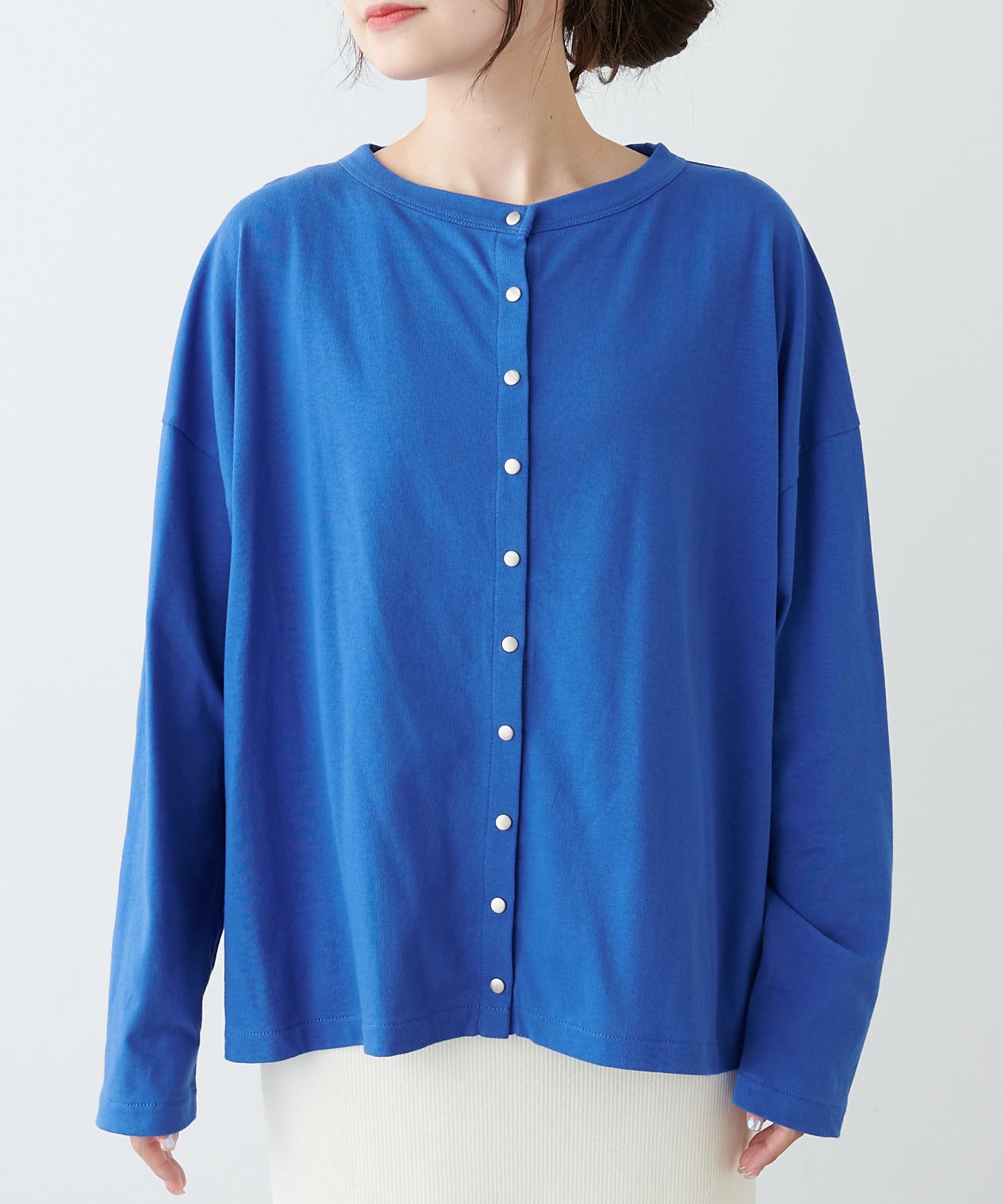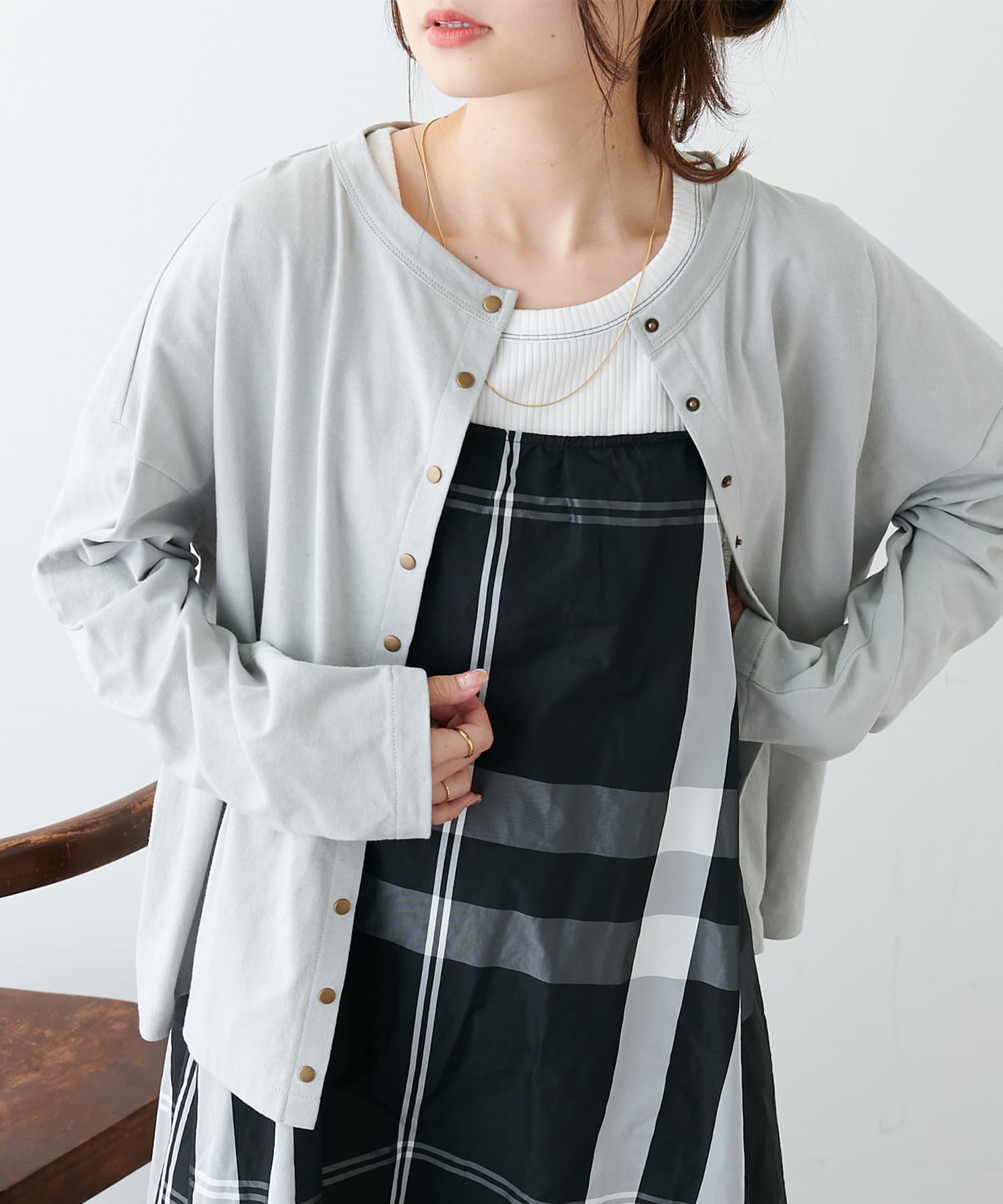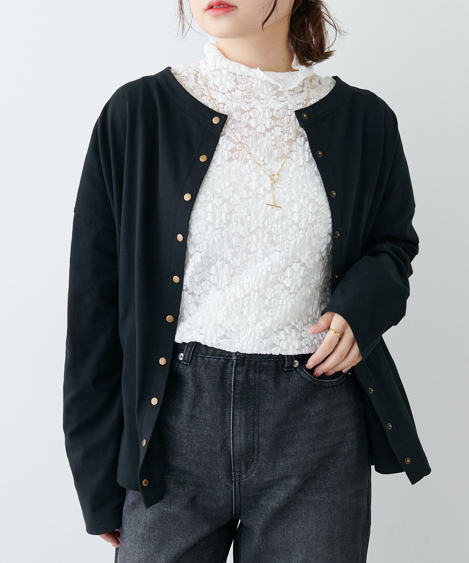 フロントのスナップボタンがスタイリングのアクセントになるカーディガン。