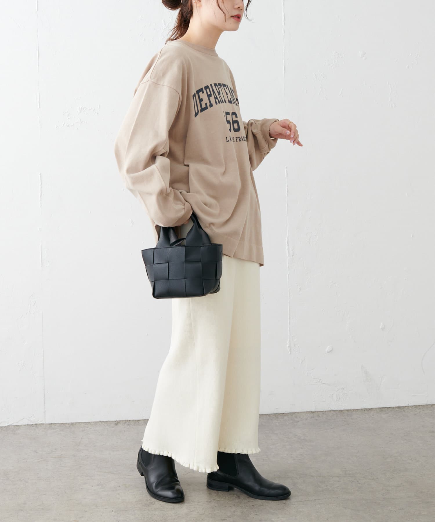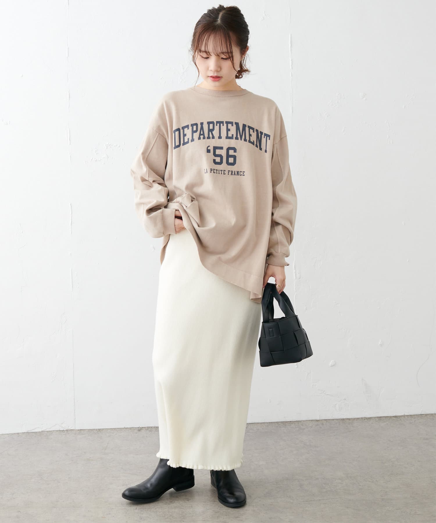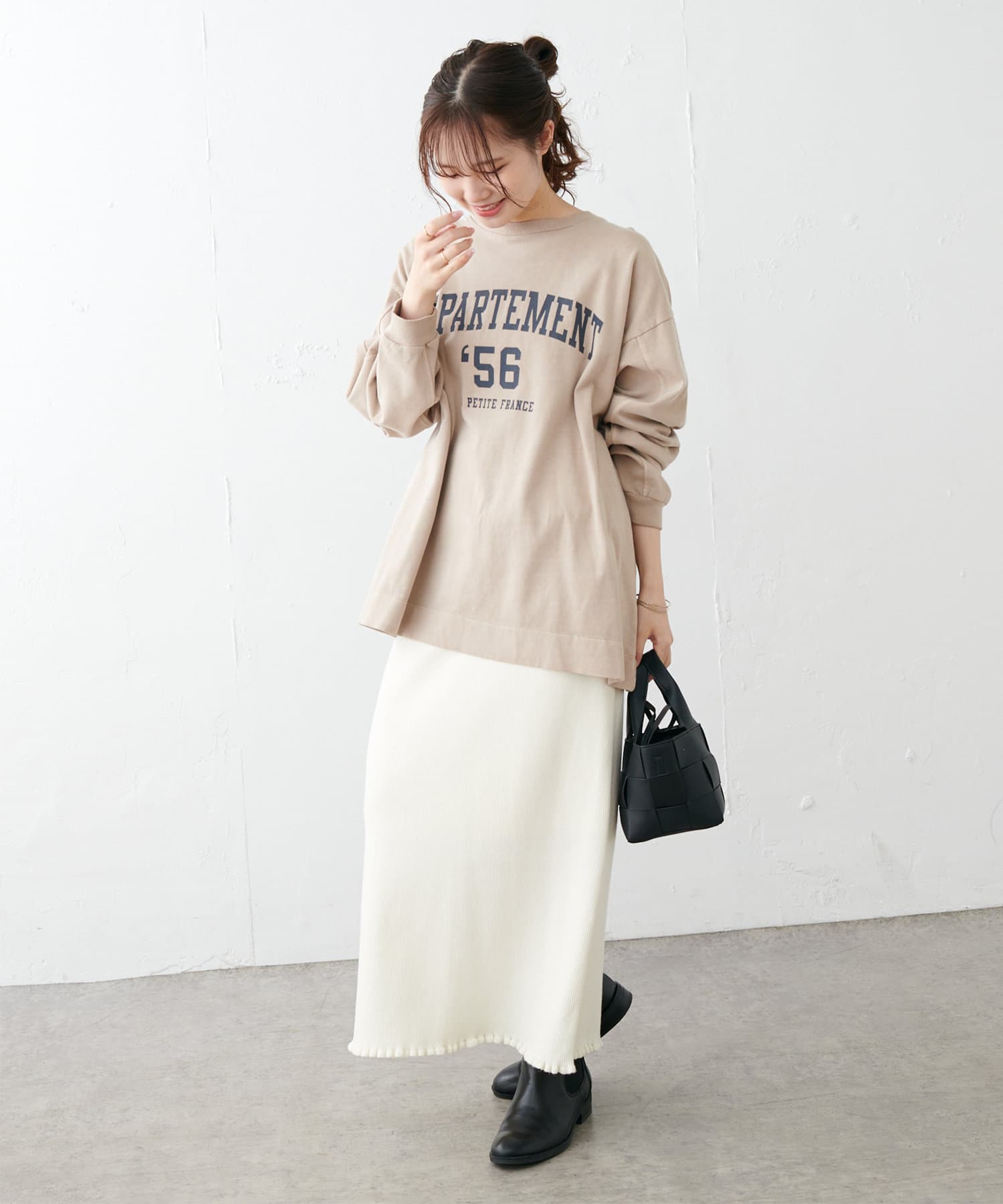 タックインはボトムスを選ばず合わせやすく、アウトスタイルではあえてワイドパンツやロングスカートを合わせても旬の着こなしが完成します。シンプルになりやすいので、トレンドのカラーアイテムや季節らしいシーズンアイテムを取り入れるのがおすすめです。