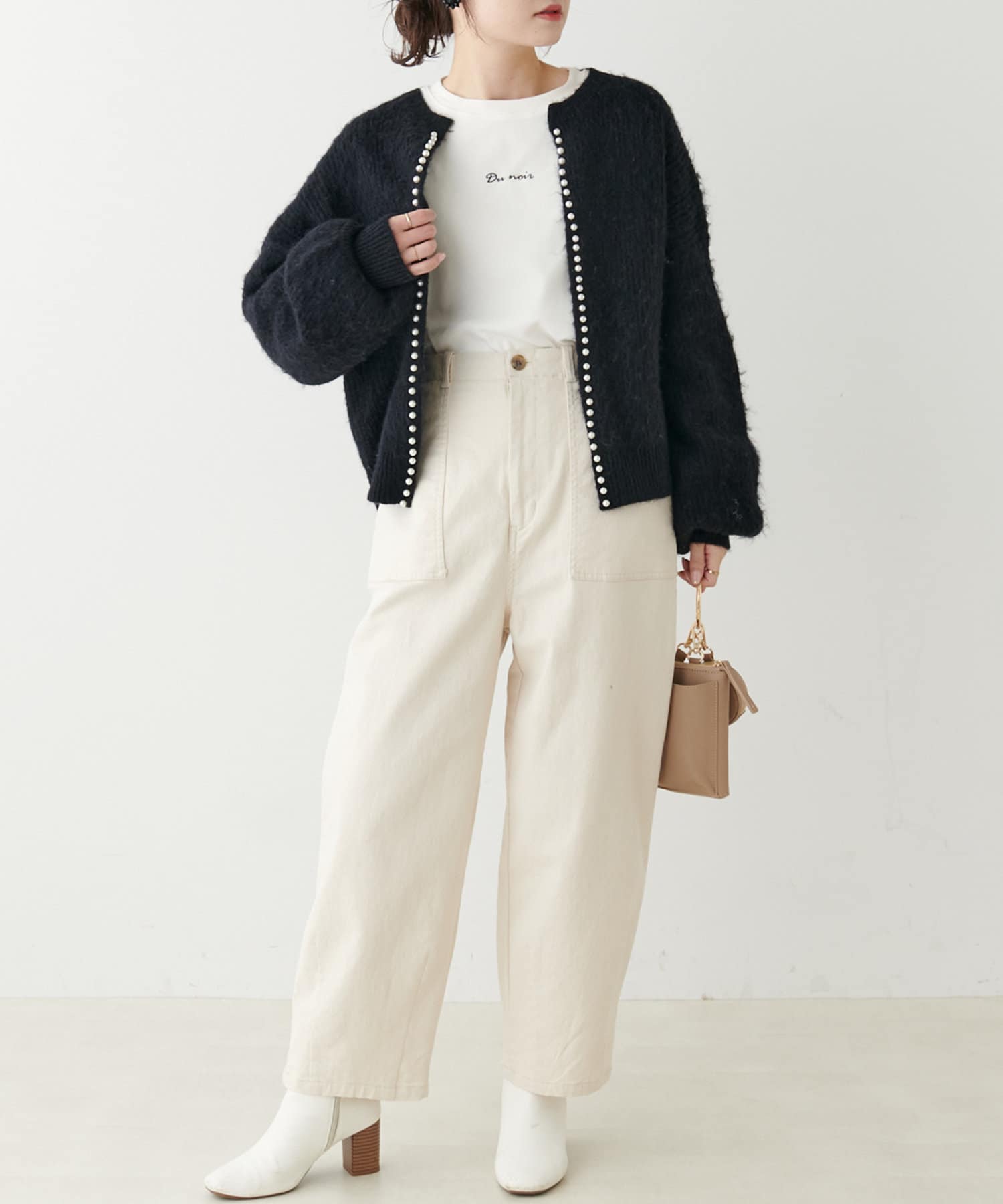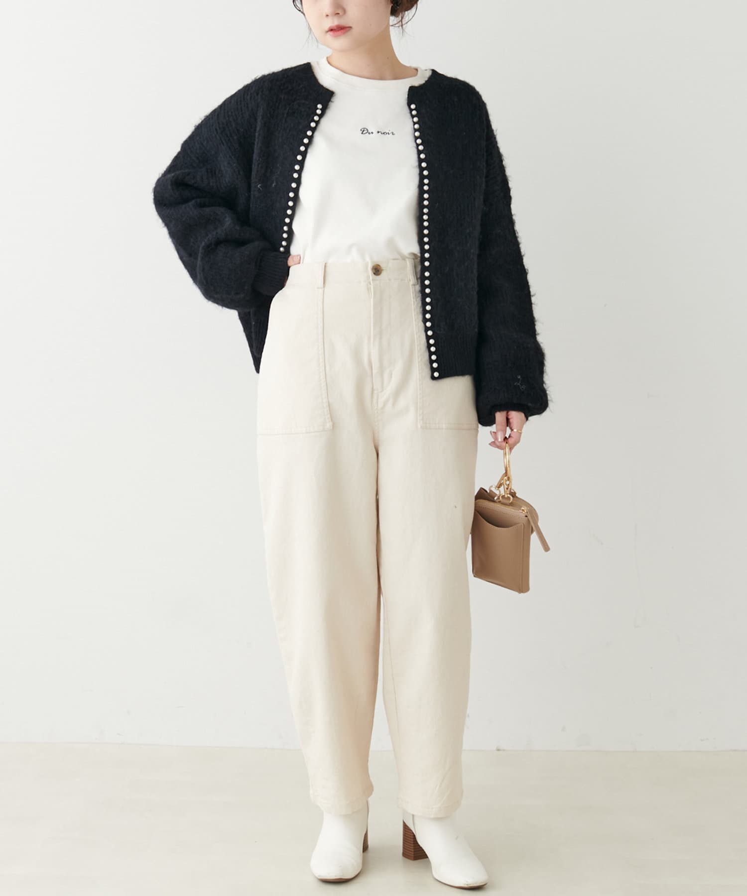 お尻が隠れる丈感なので、細身のリブパンツやIラインスカートなどを合わせても