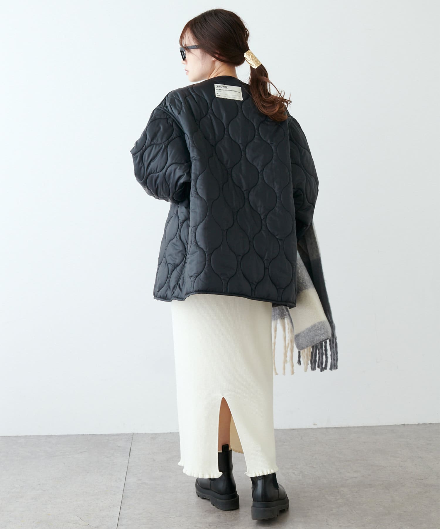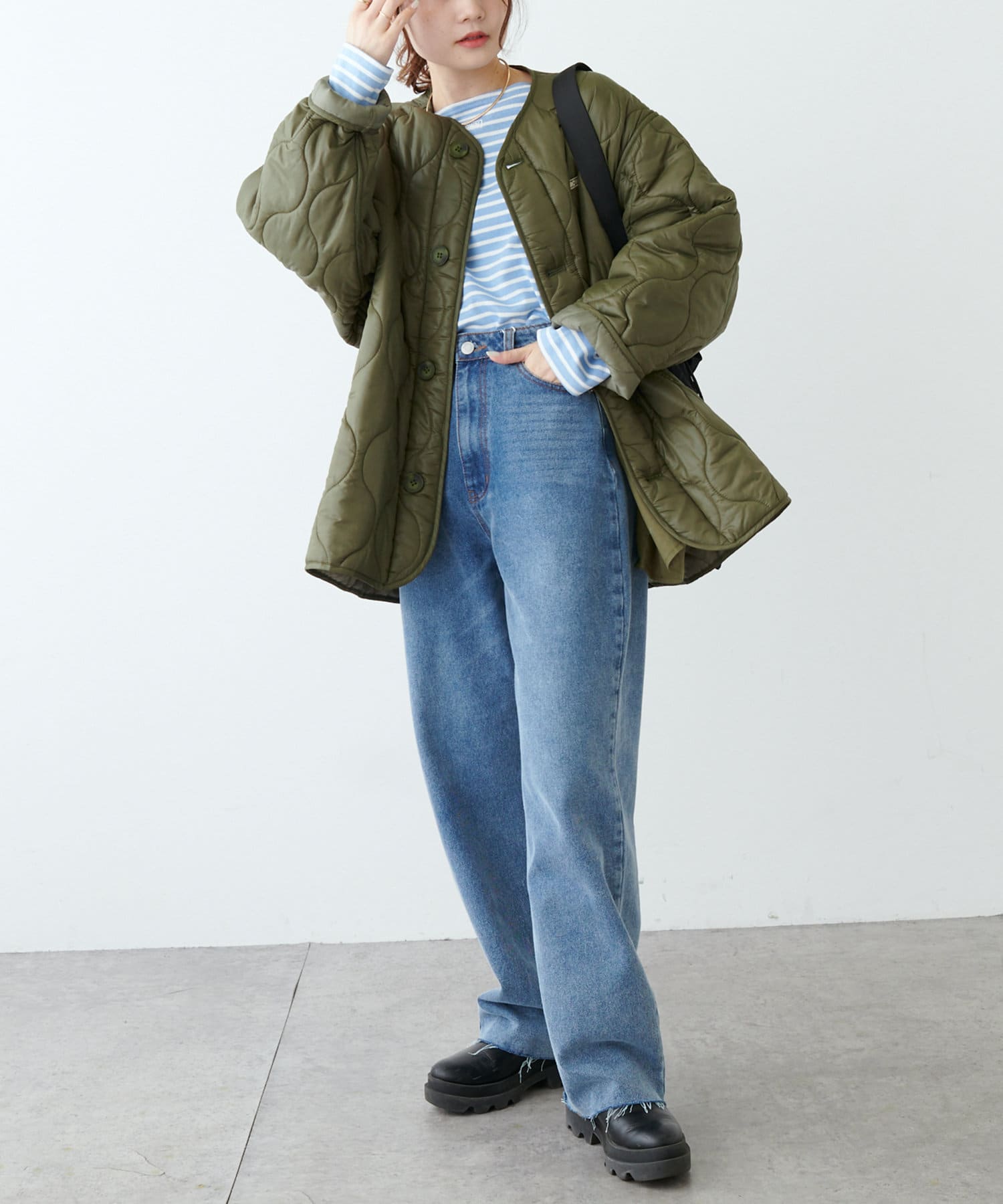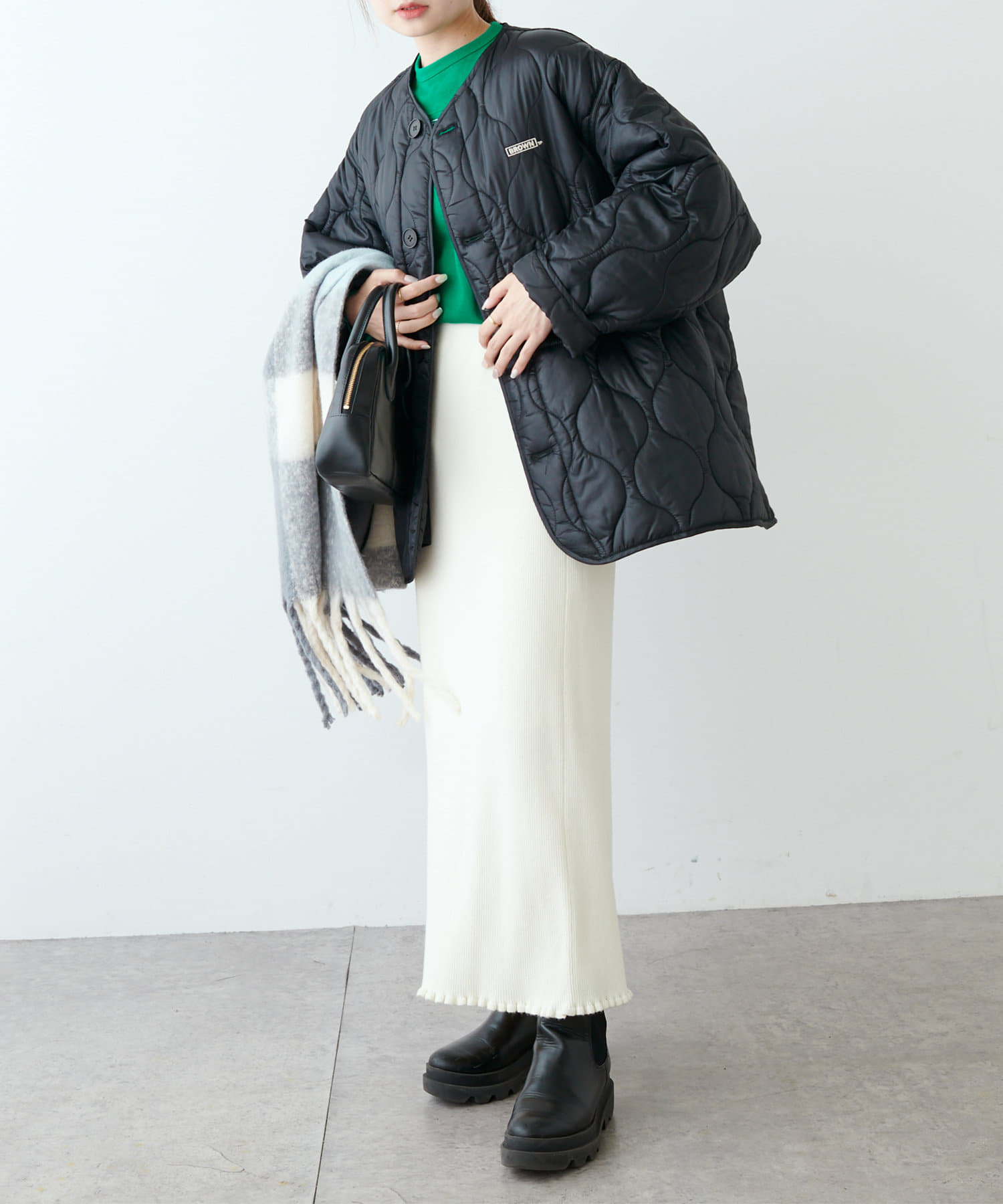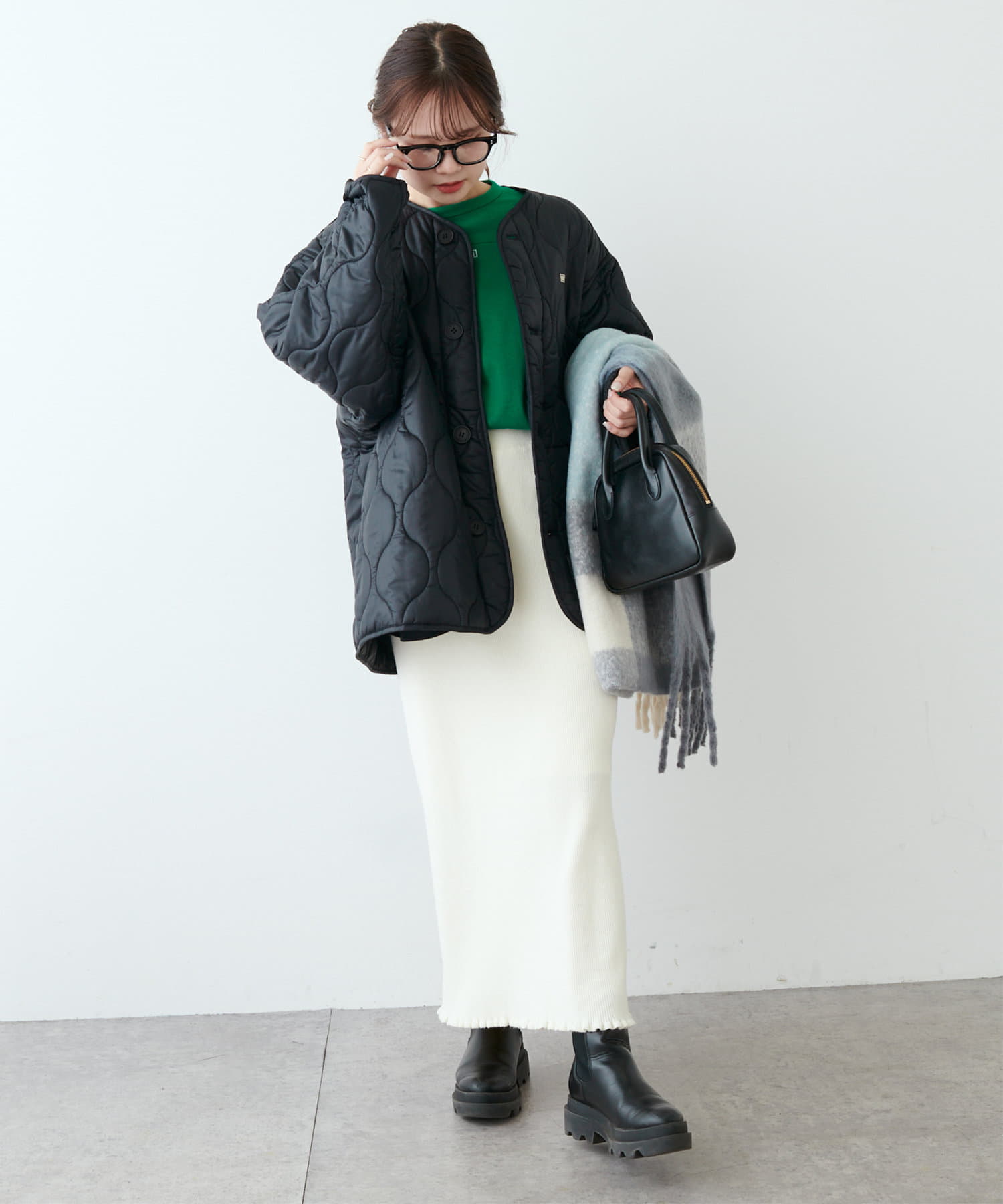 ノーカラーデザインなので、ハイネックのトップスや襟ありインナー合わせが◎