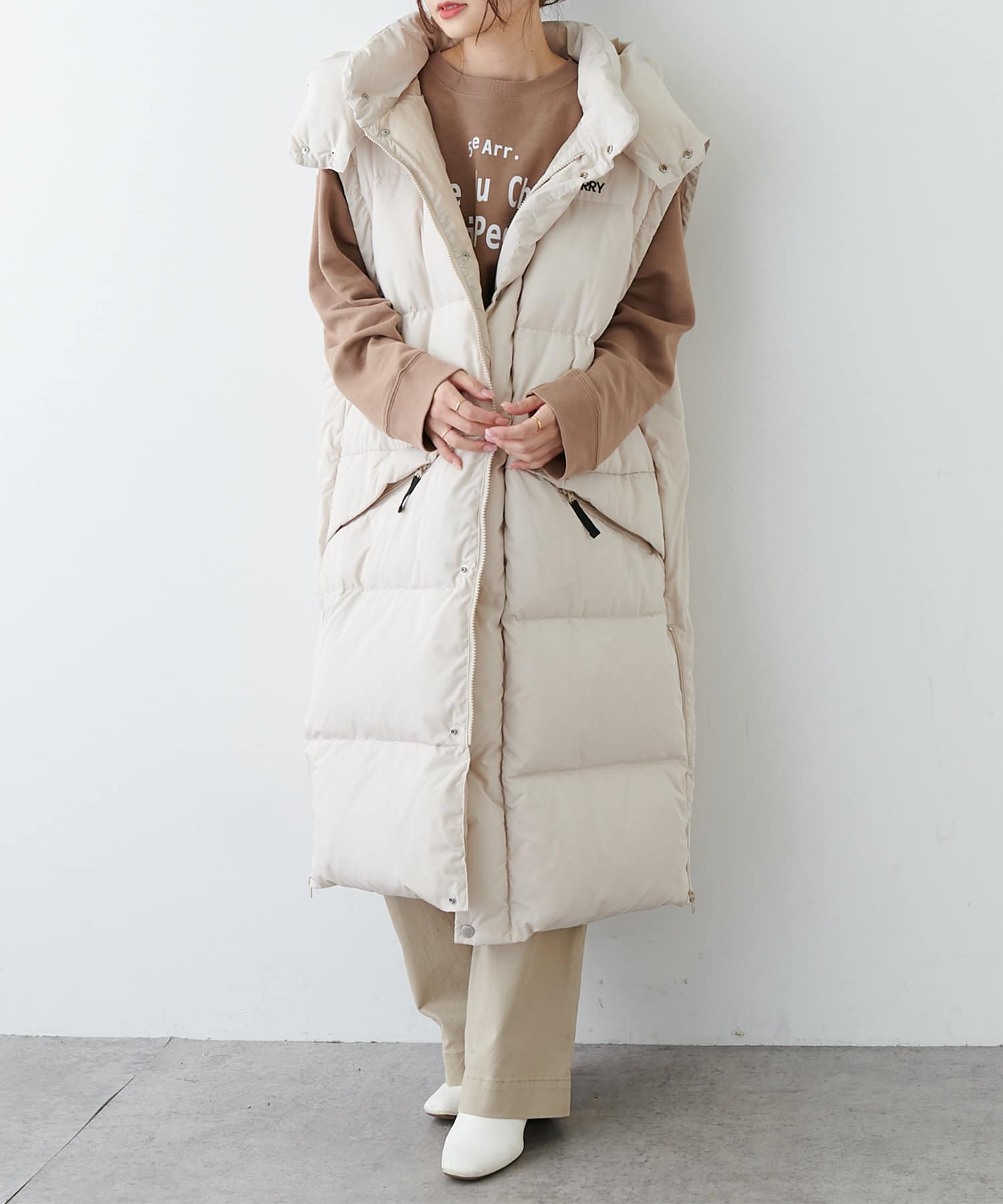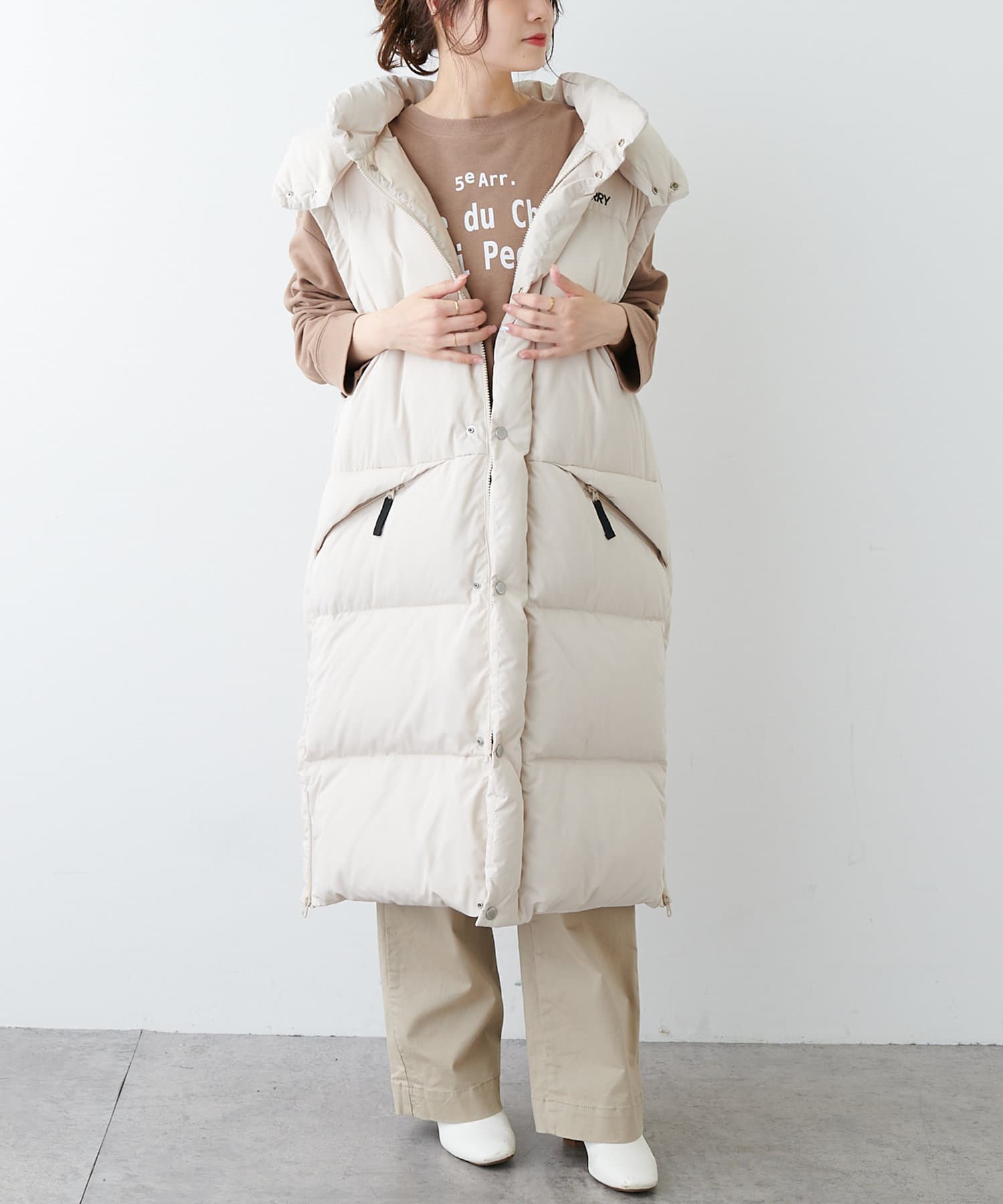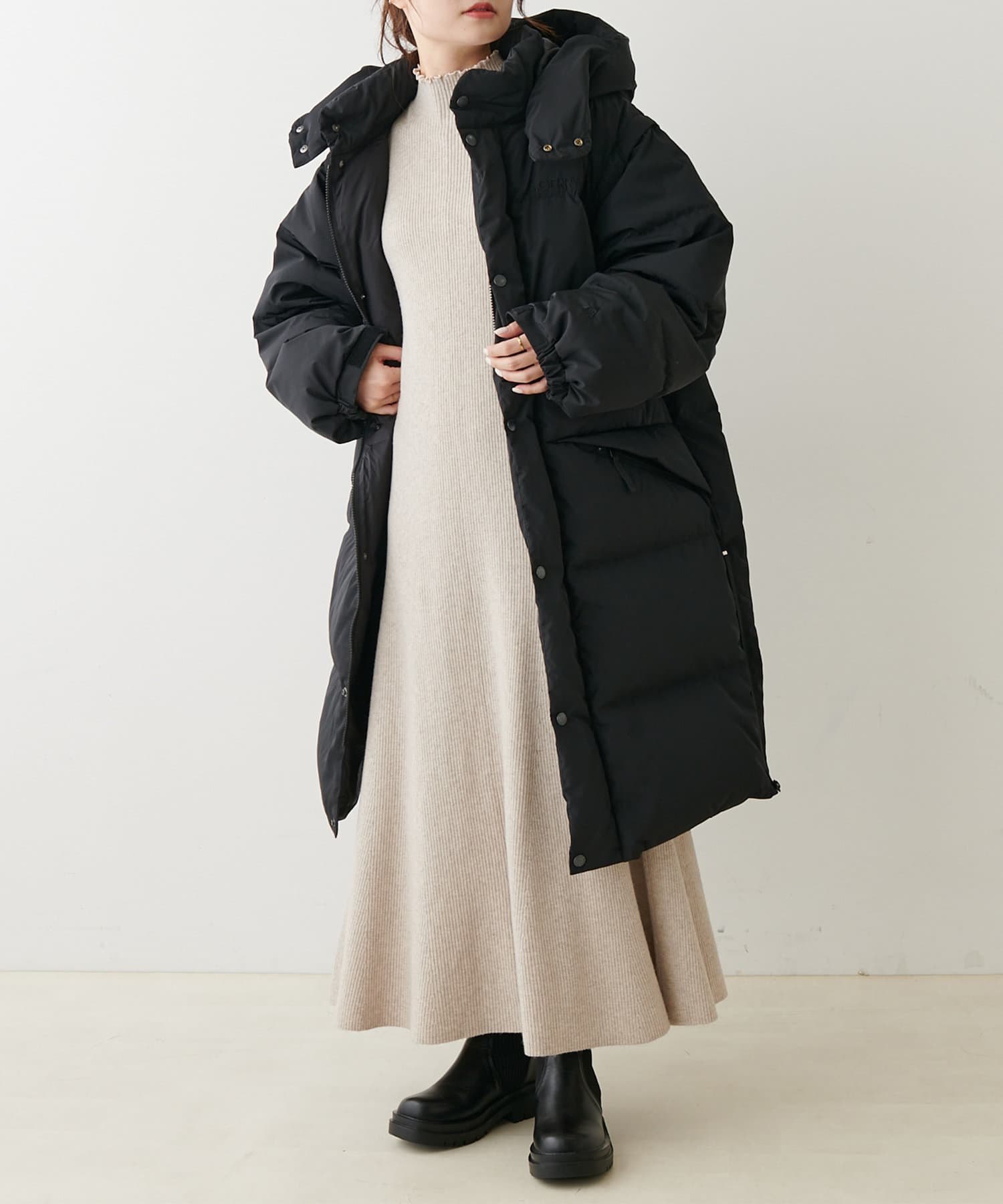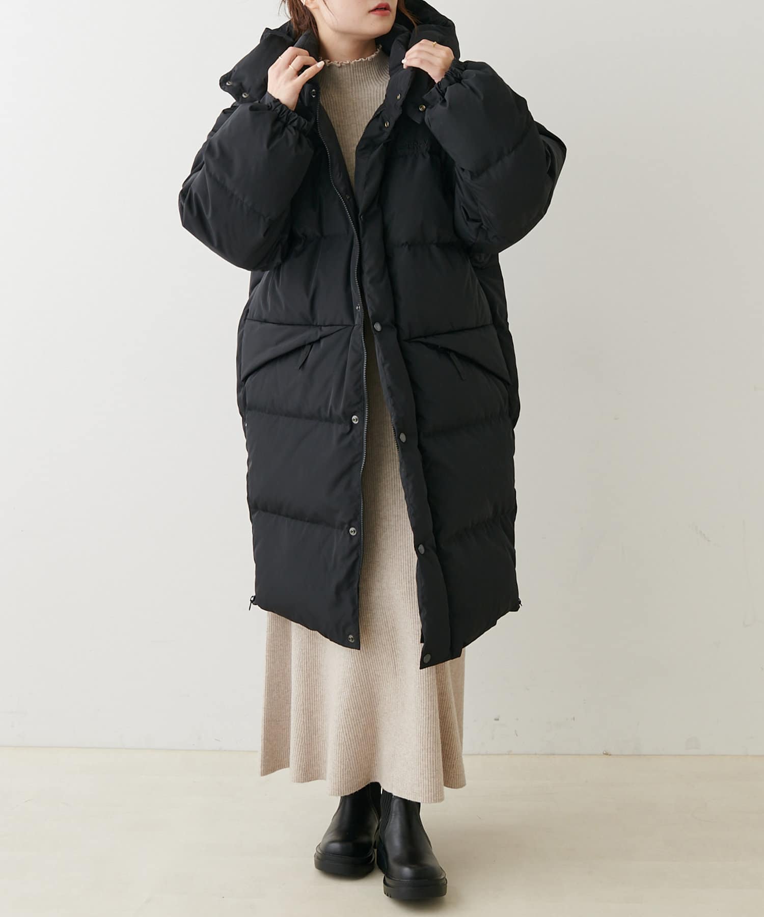 飽きの来ないシンプルなデザインで大人な印象のロング丈ダウンコート。