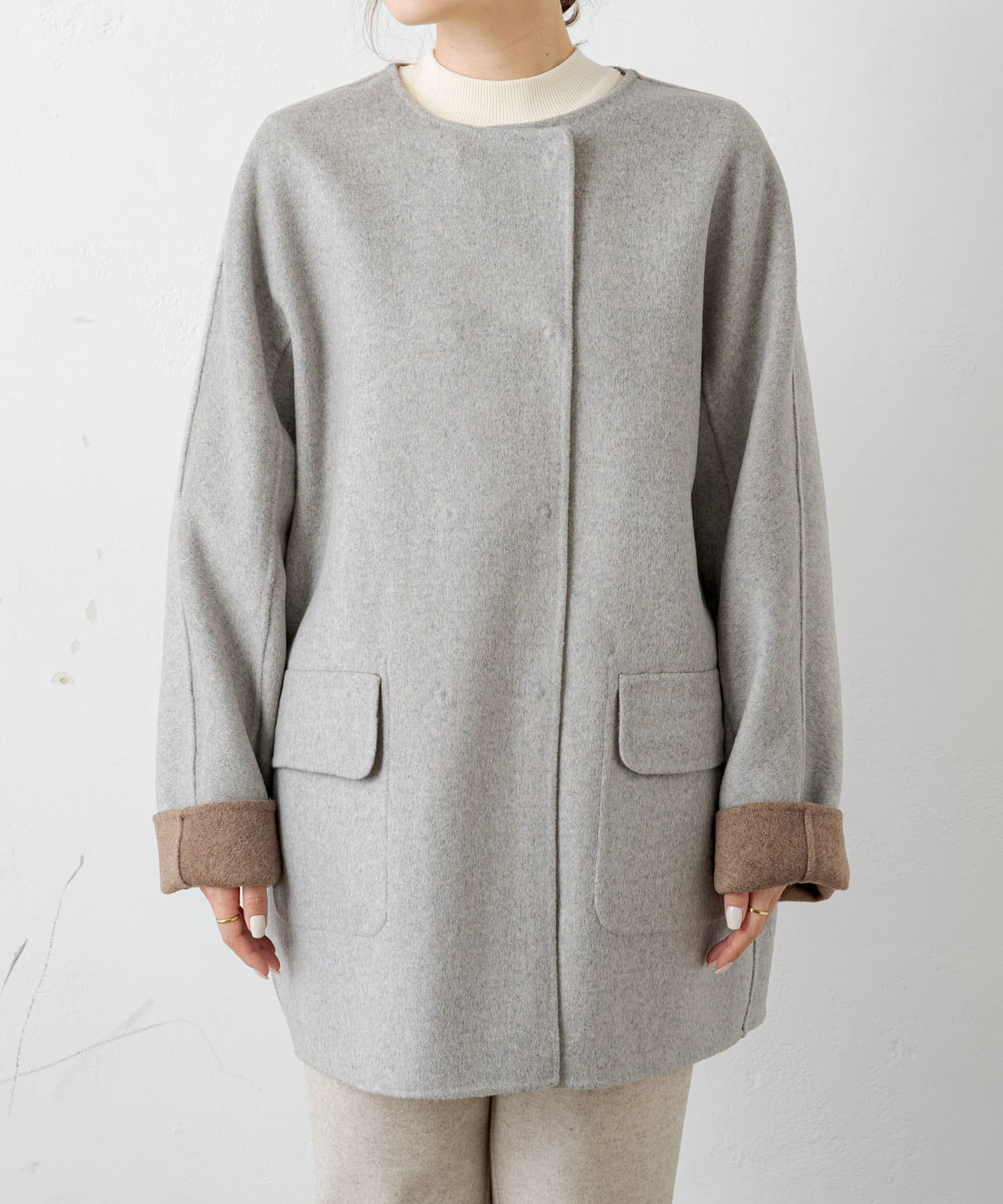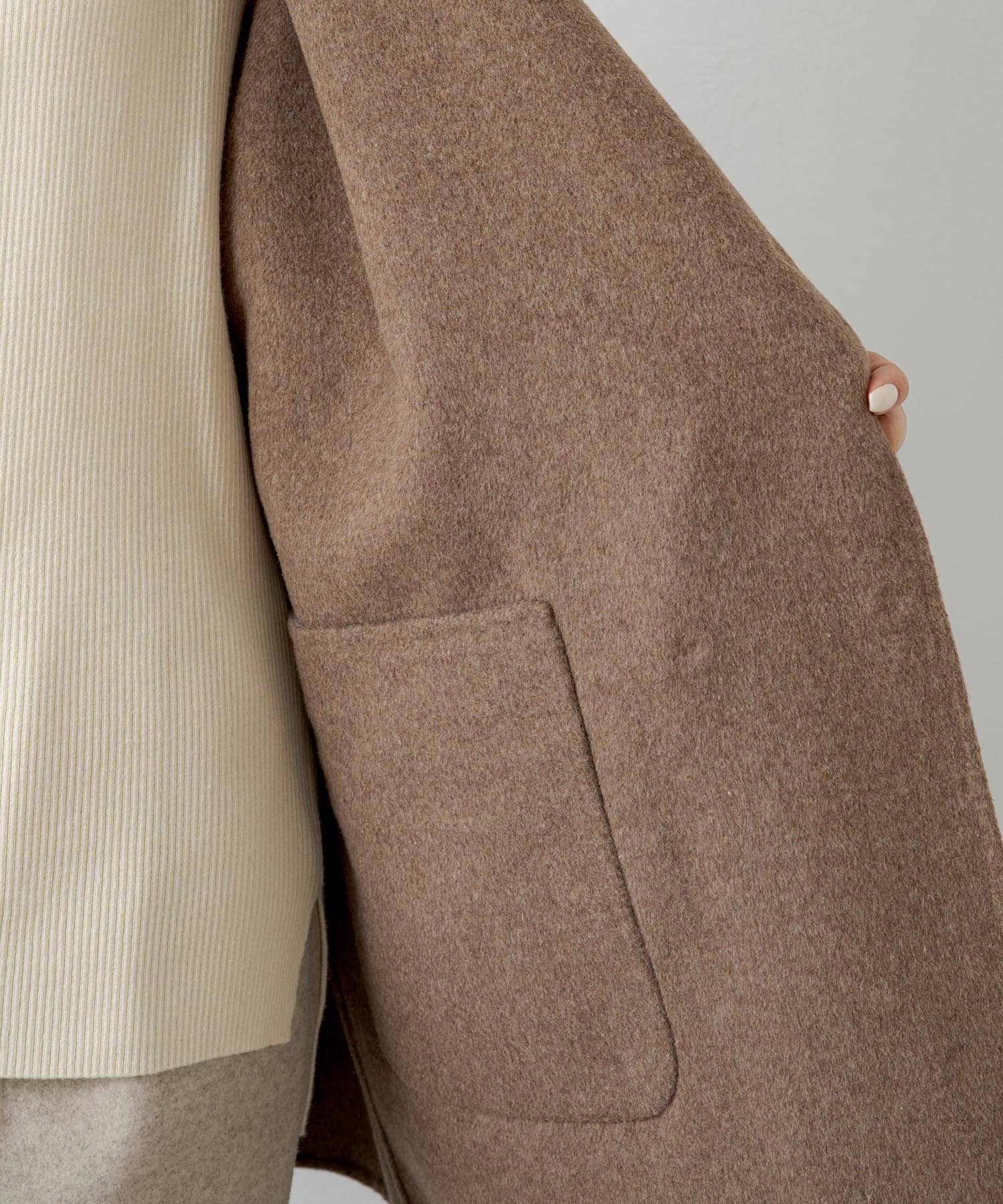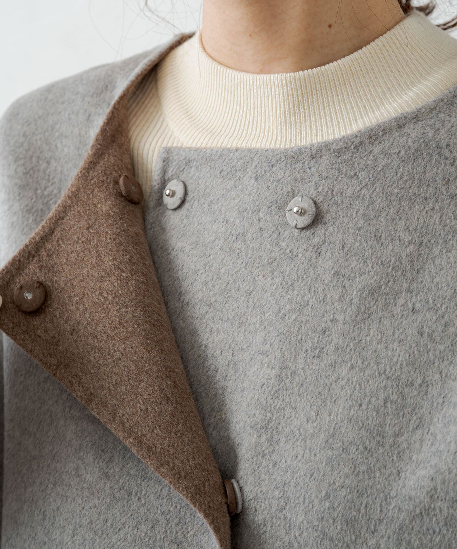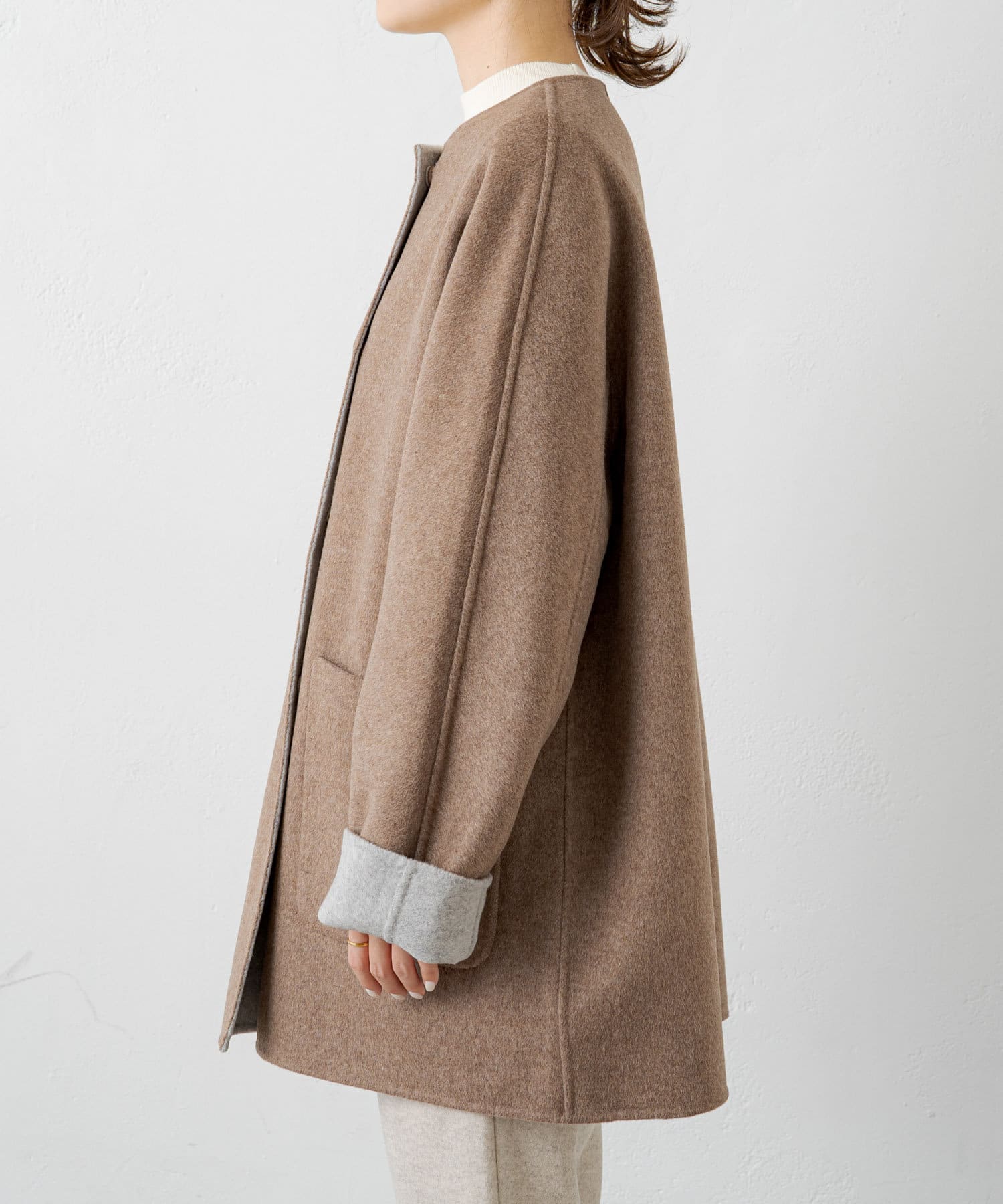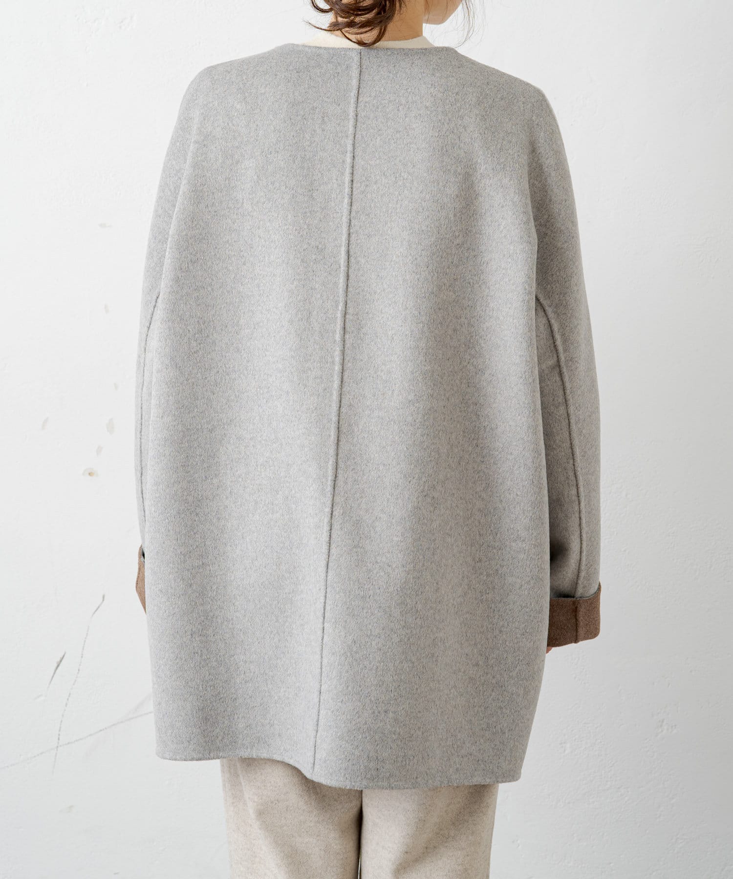 2枚の布を1枚として縫いたてたリバー仕立てのミドル丈コート。