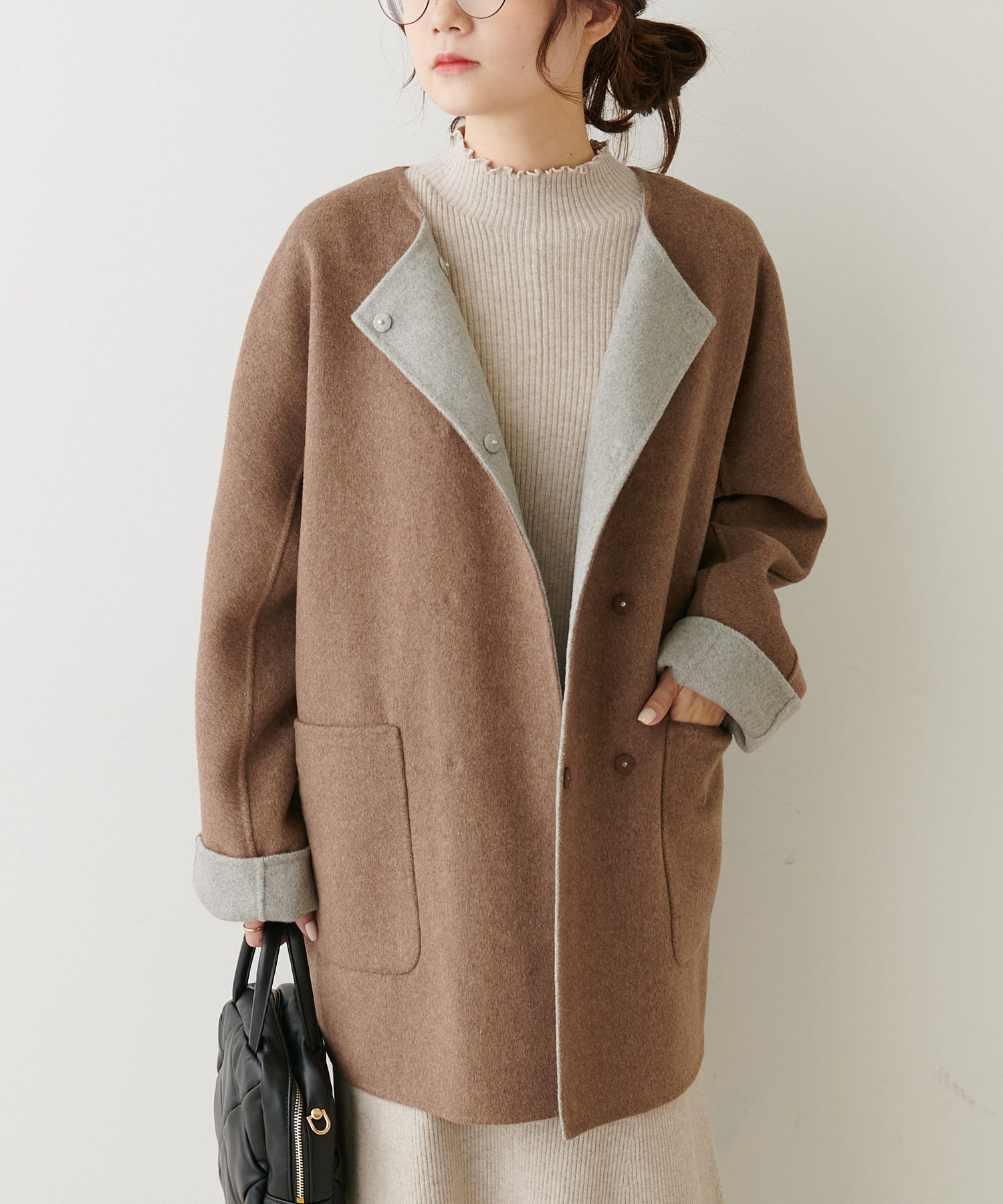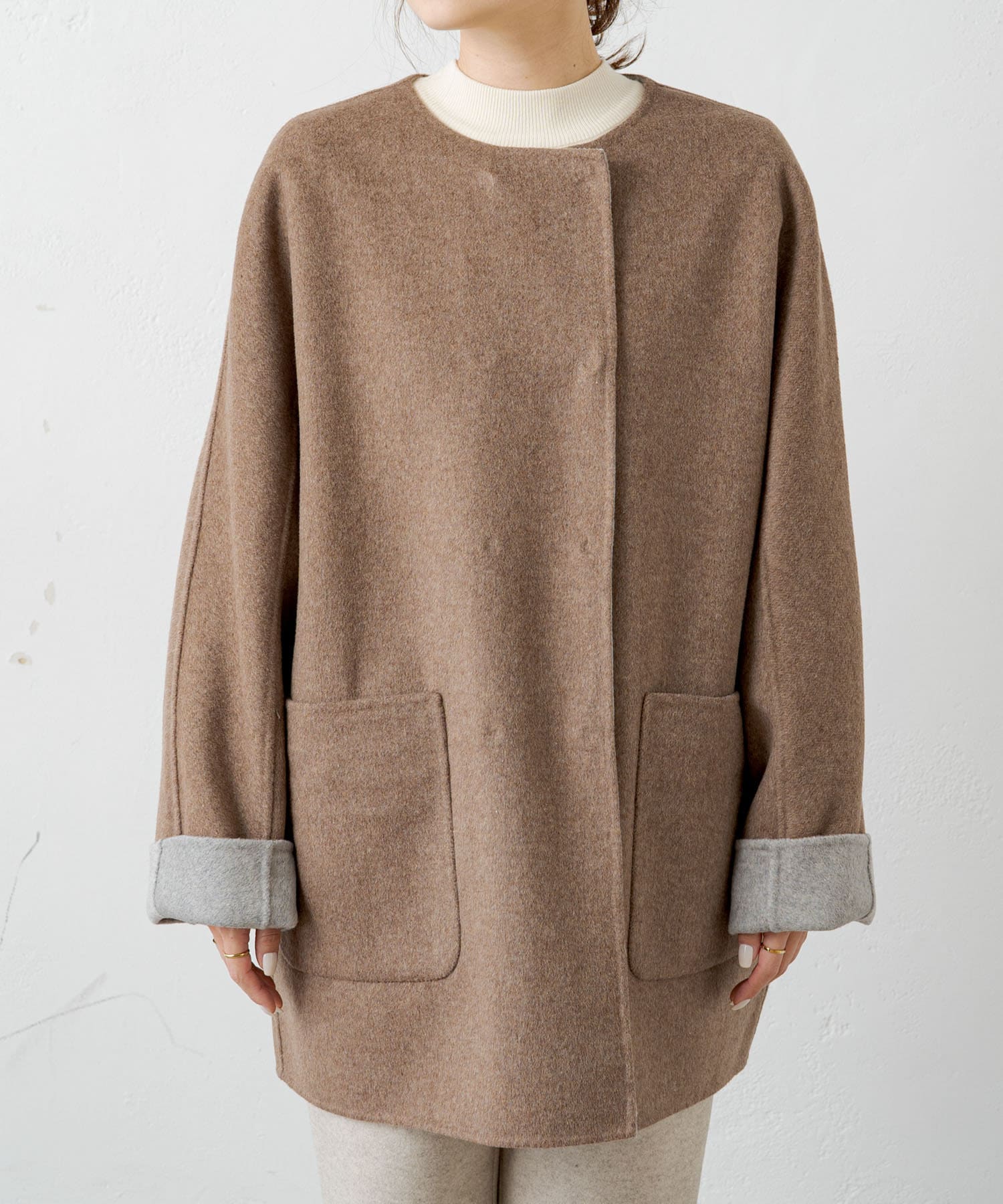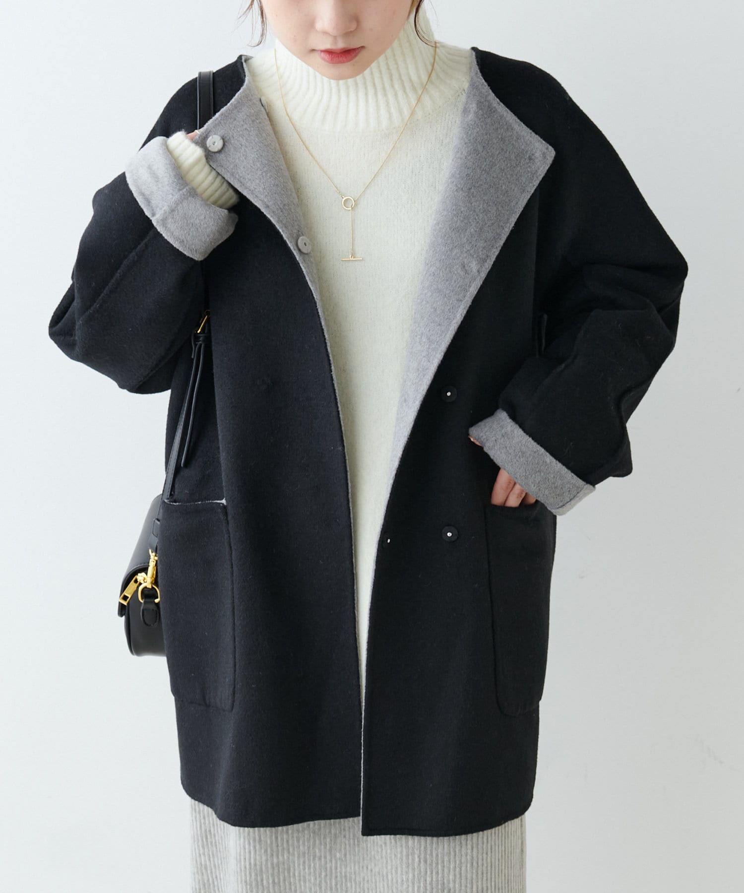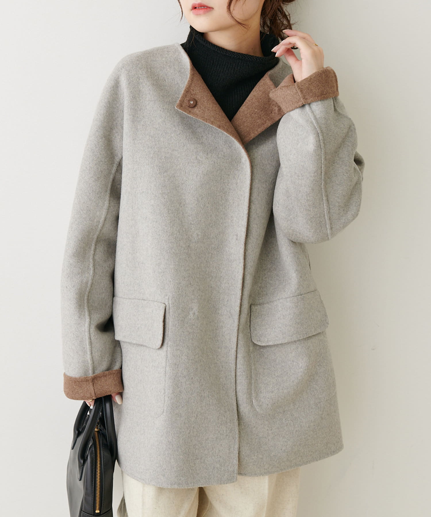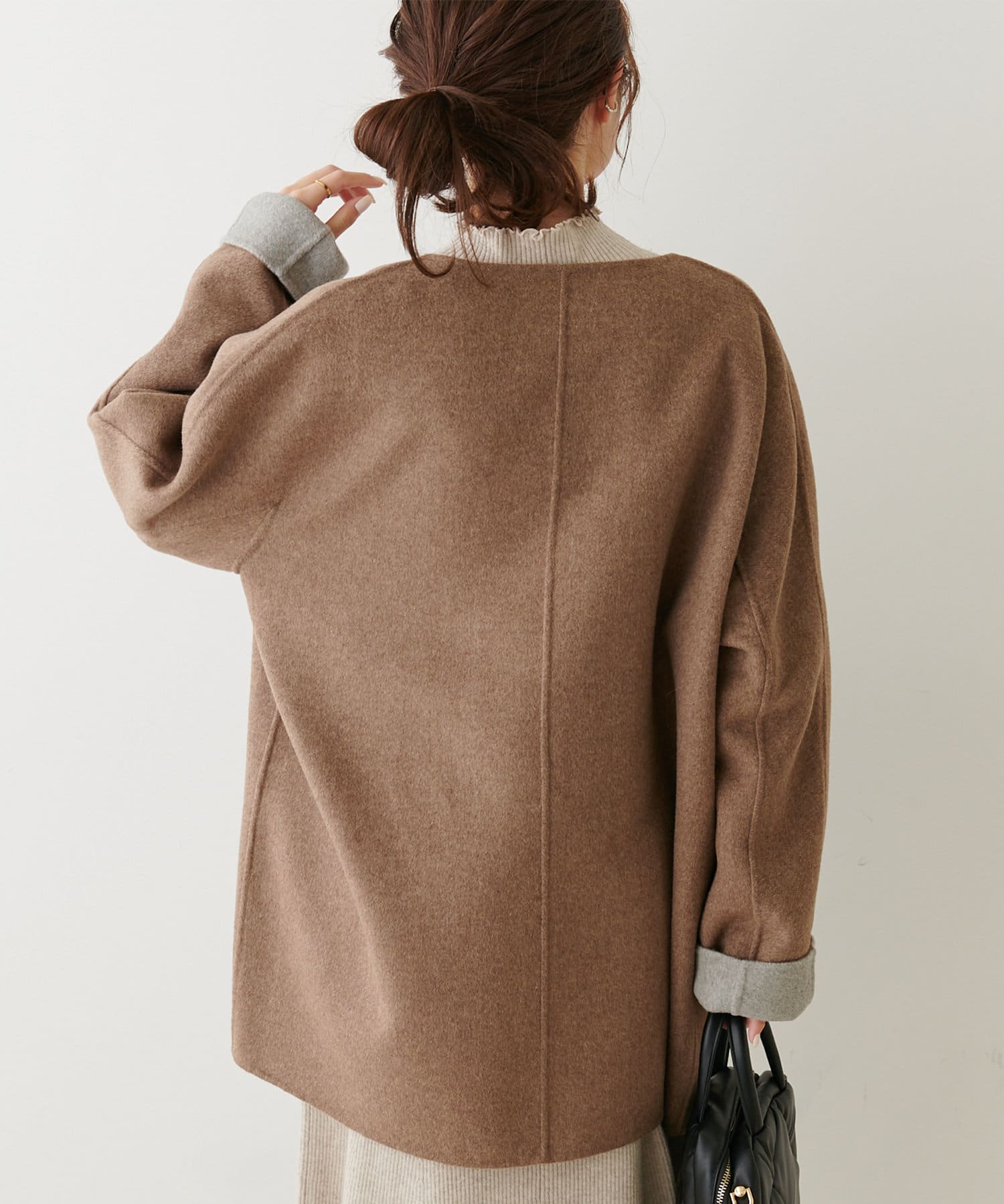 2枚の布を1枚として縫いたてたリバー仕立てのミドル丈コート。