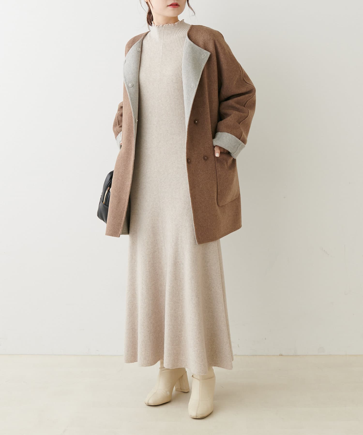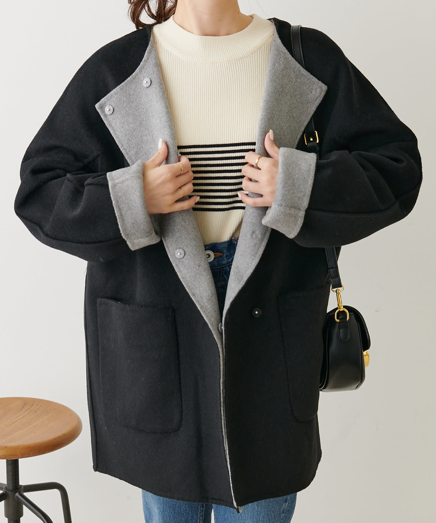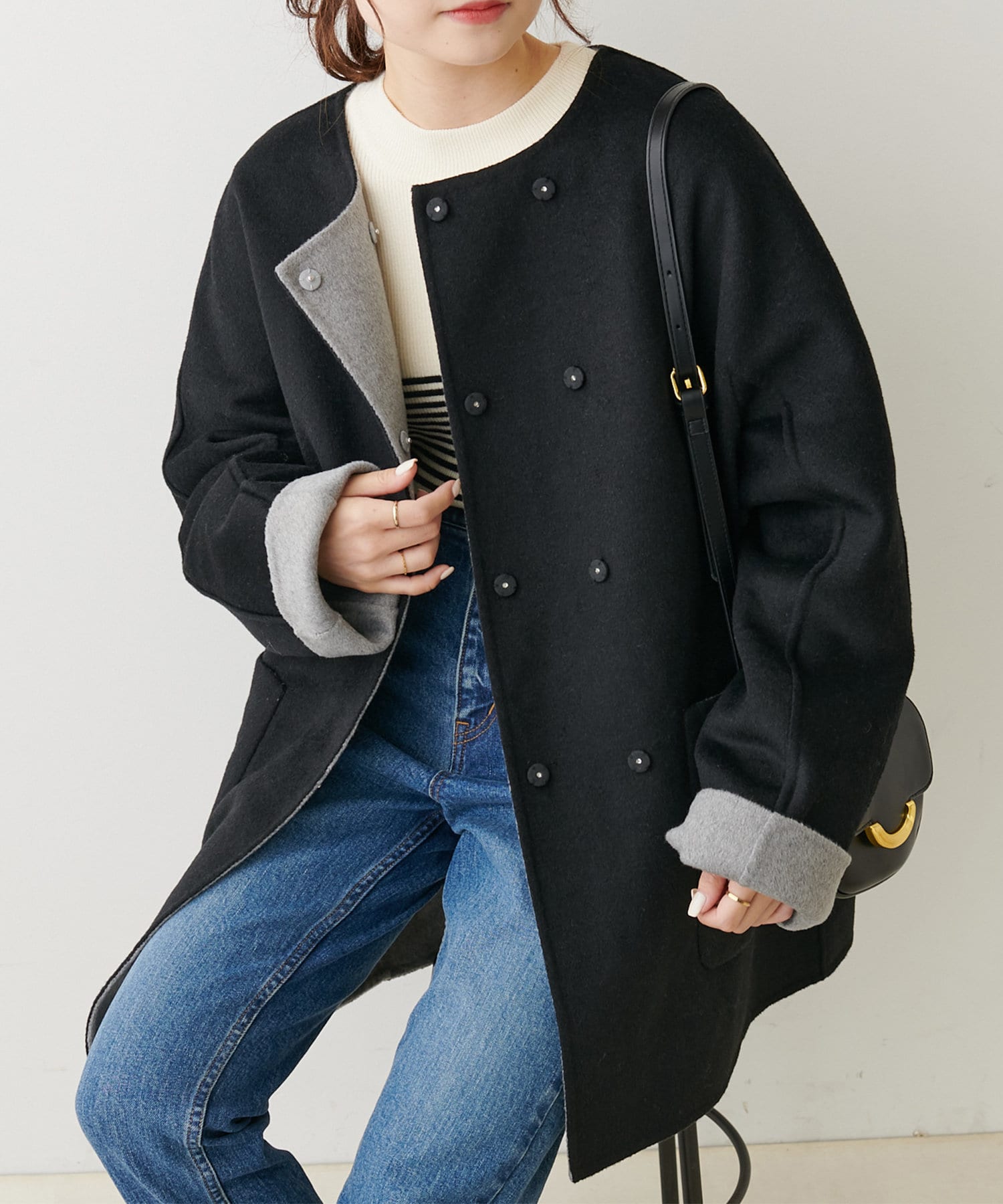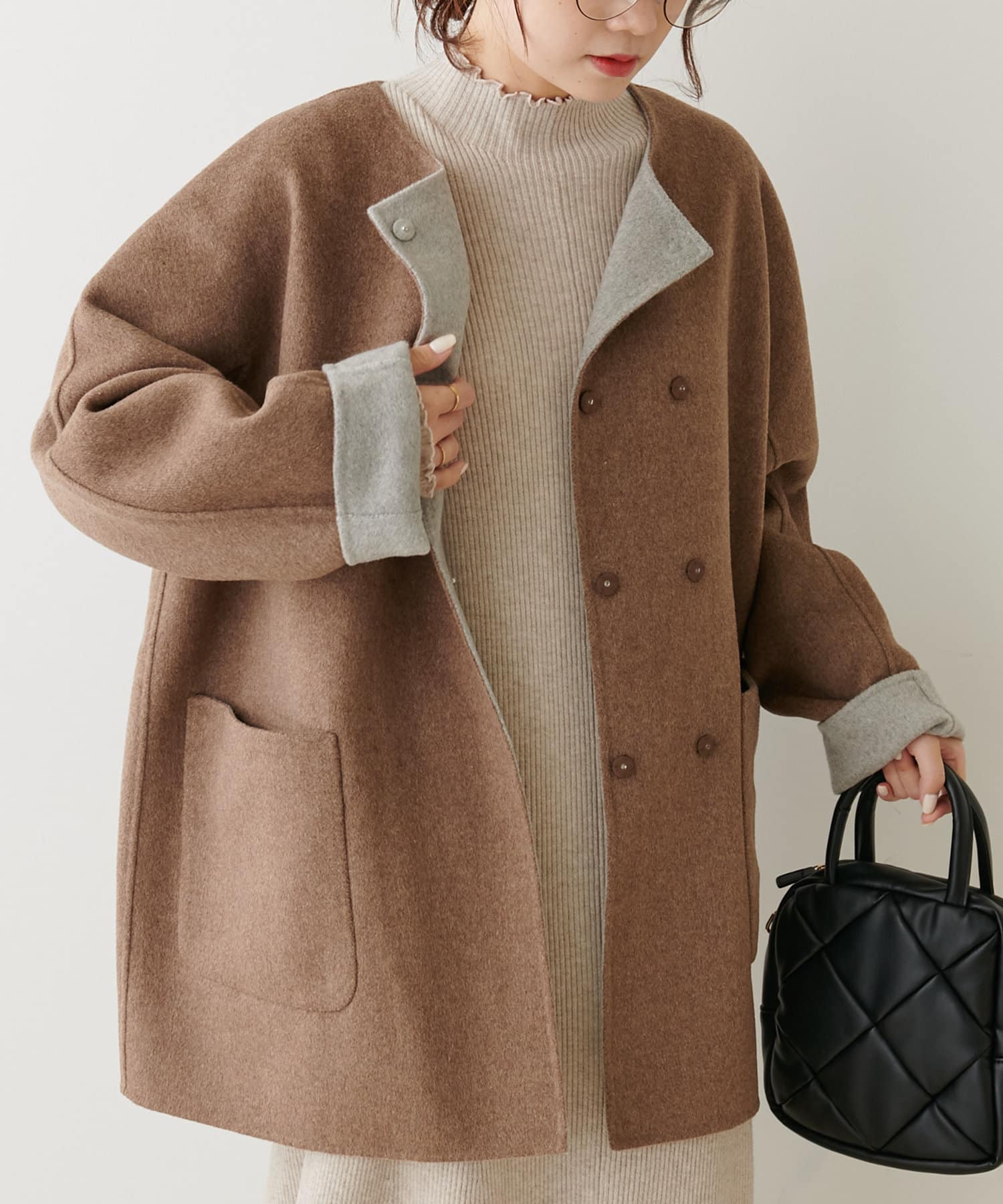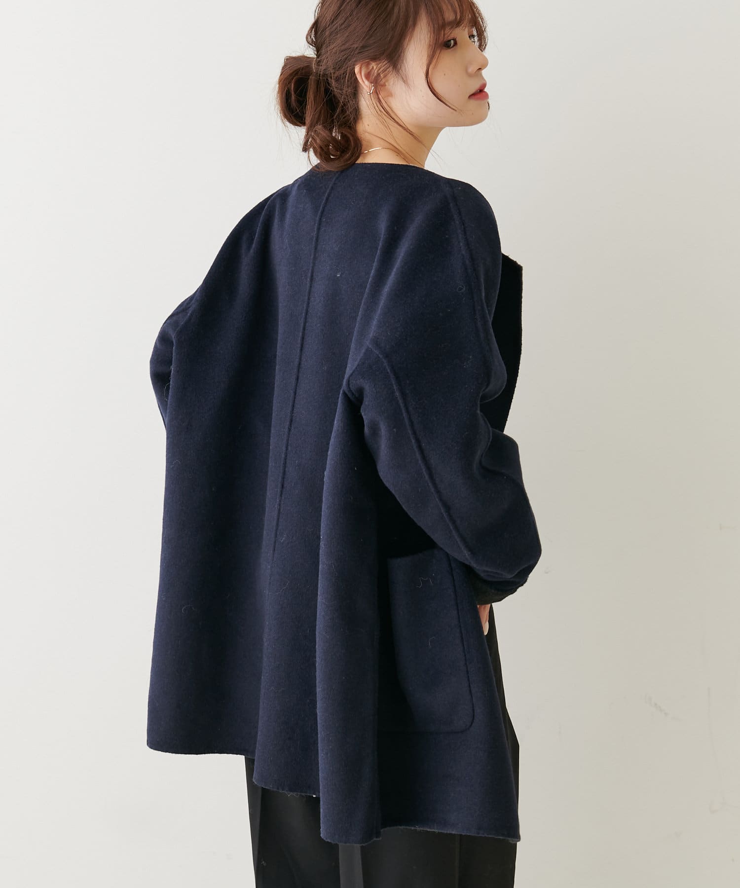 2枚の布を1枚として縫いたてたリバー仕立てのミドル丈コート。