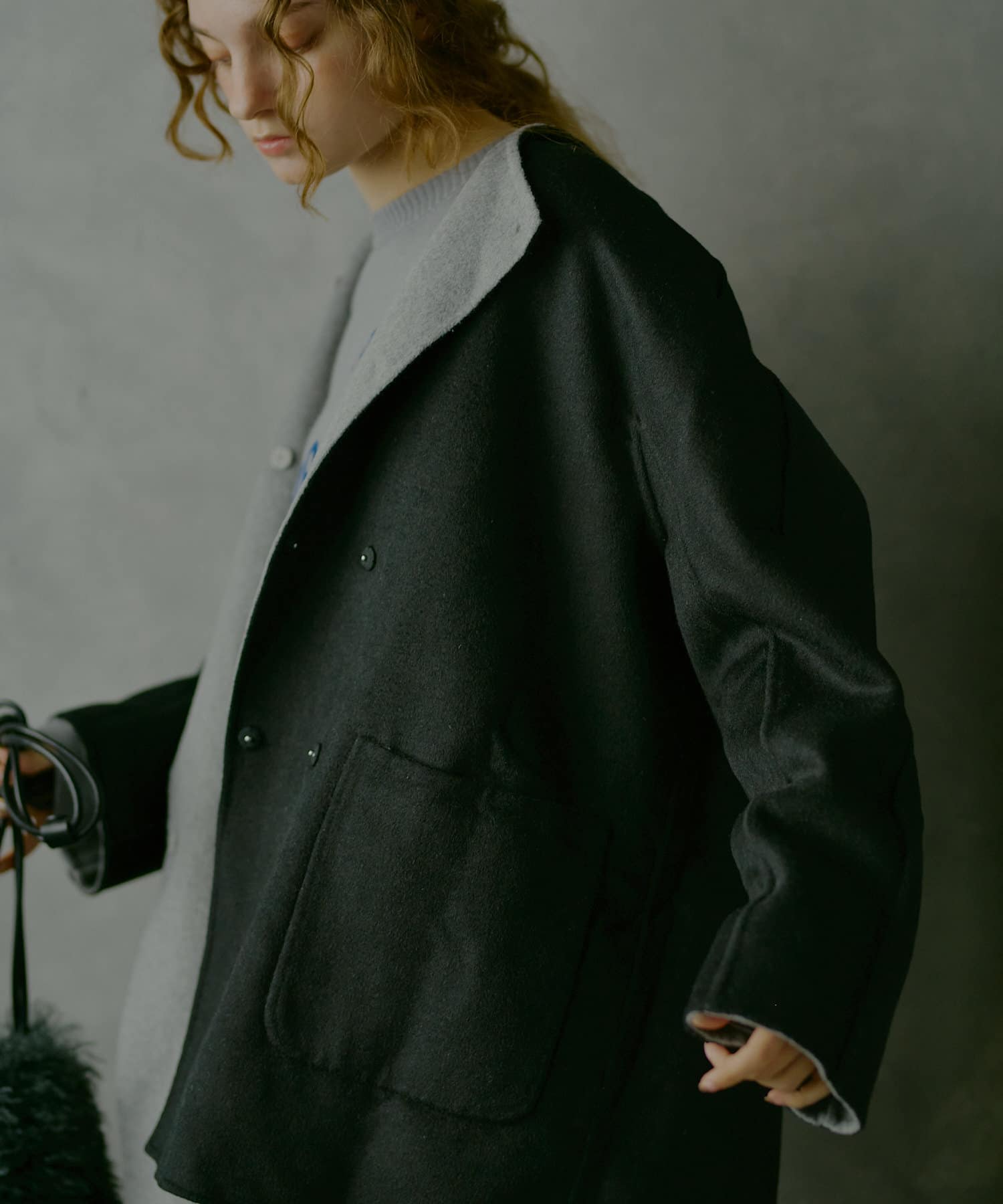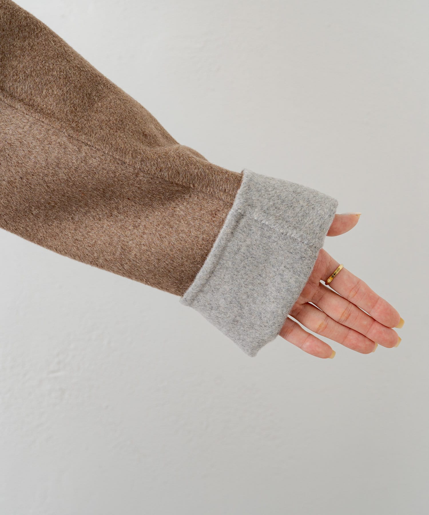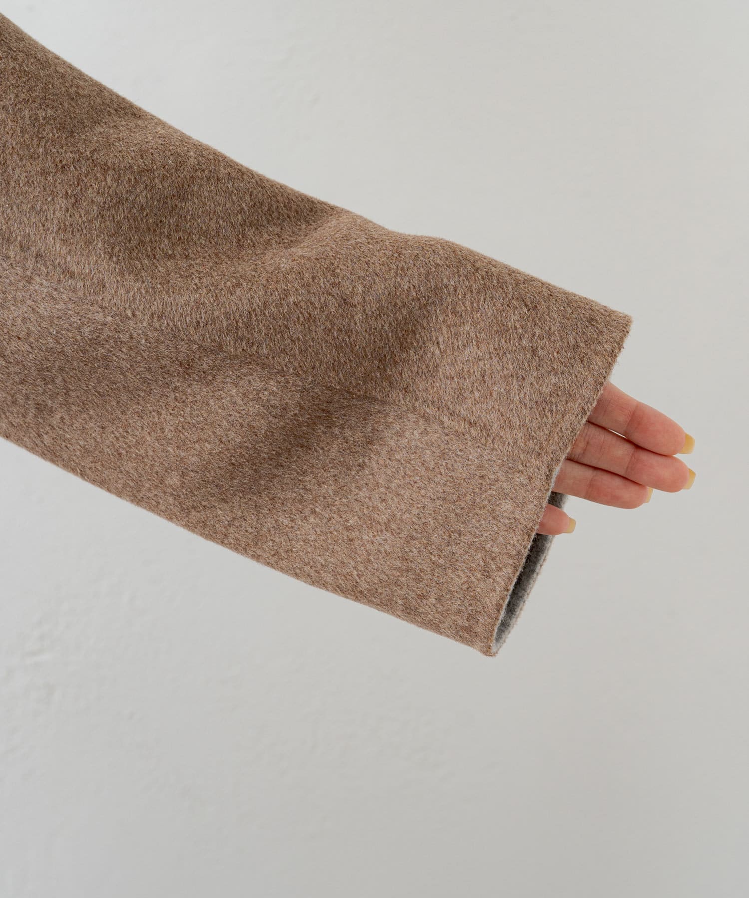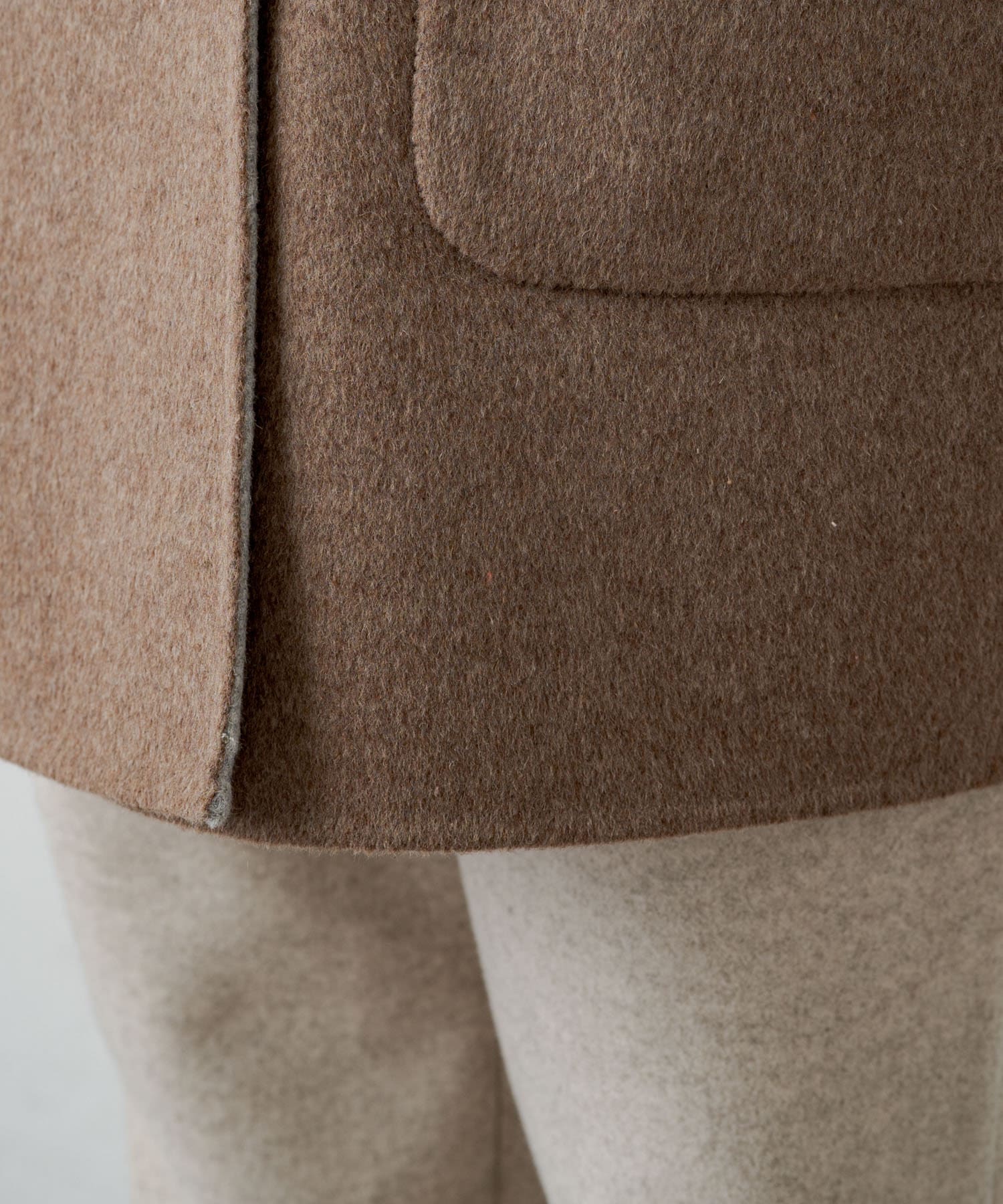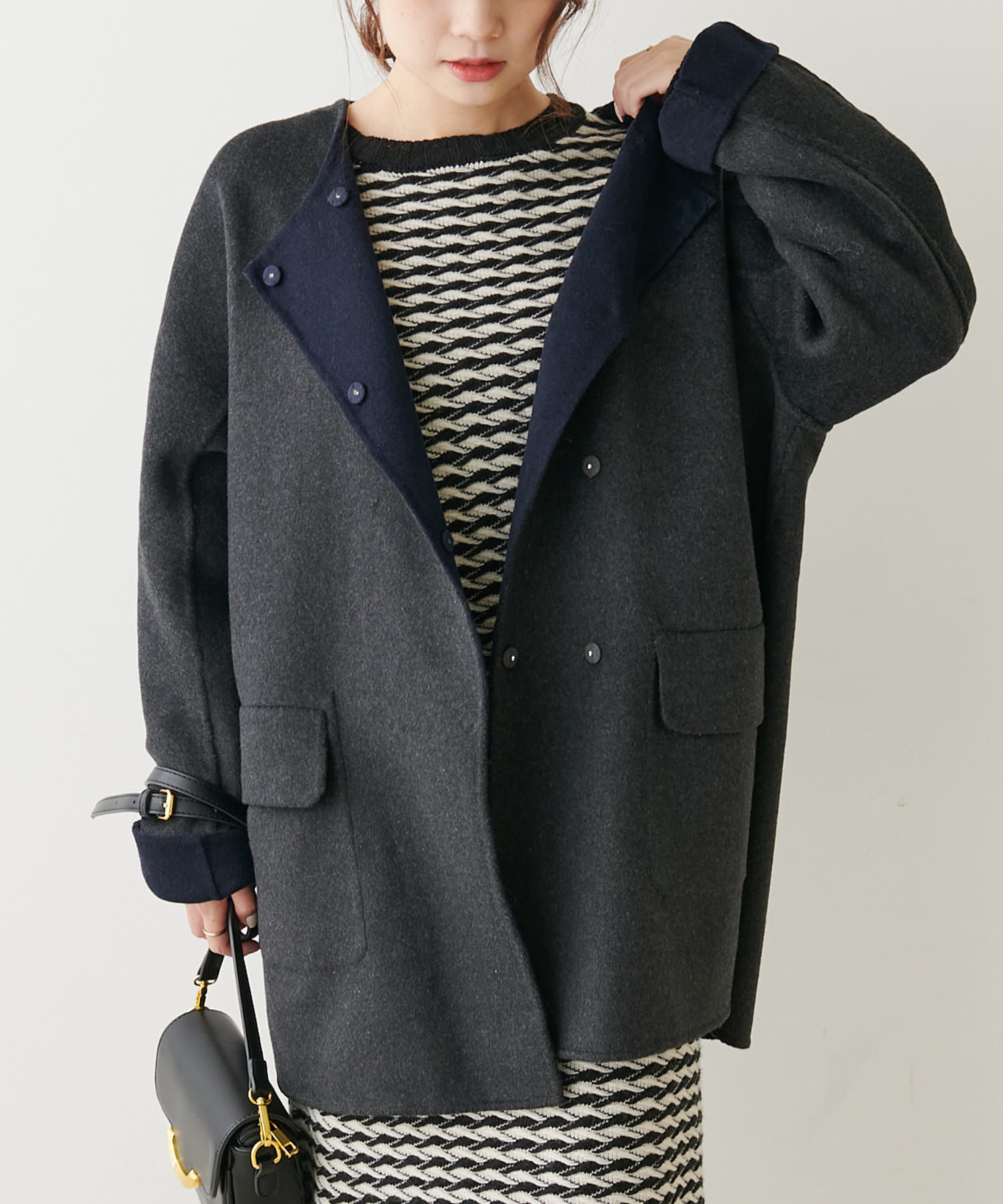 2枚の布を1枚として縫いたてたリバー仕立てのミドル丈コート。