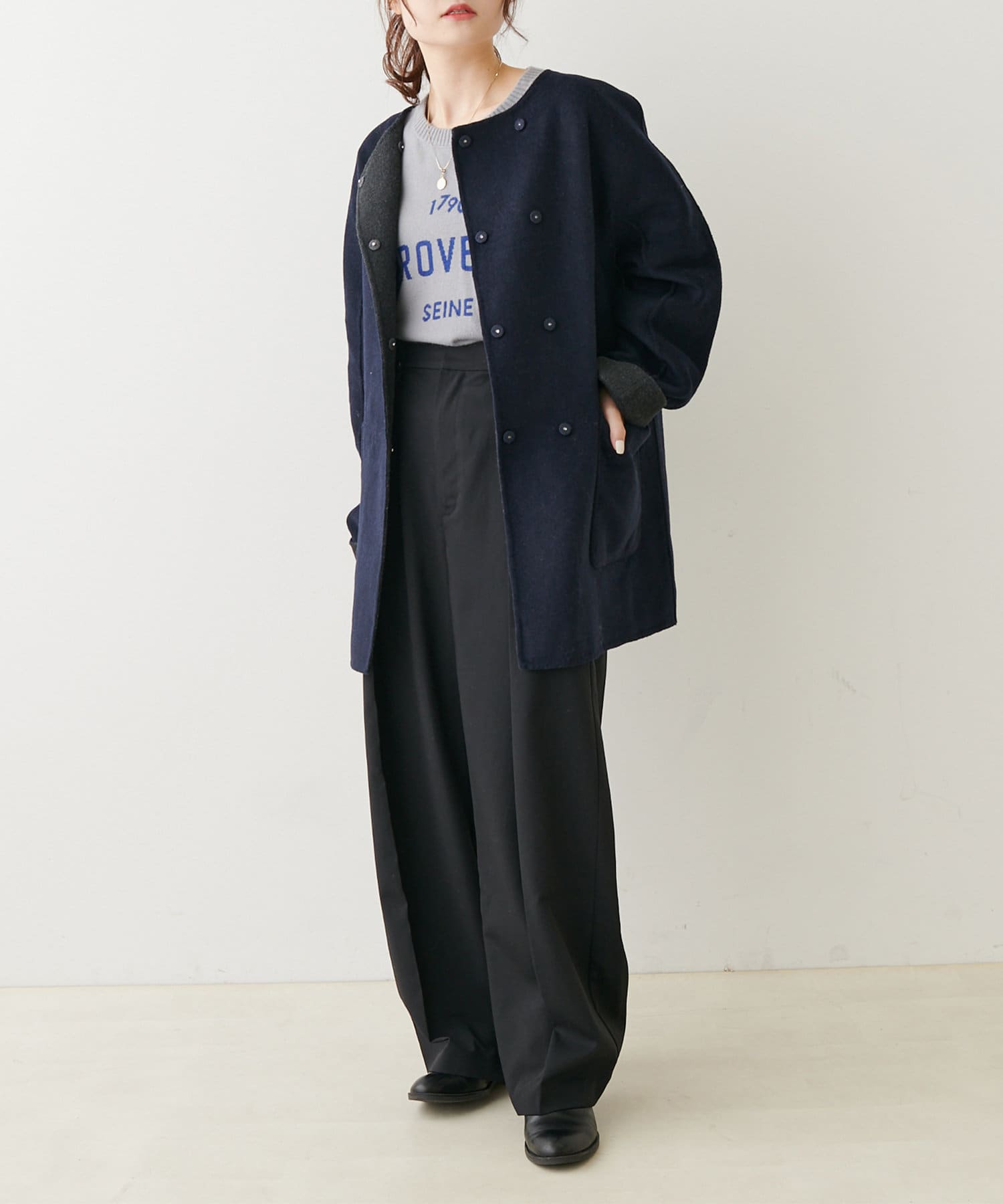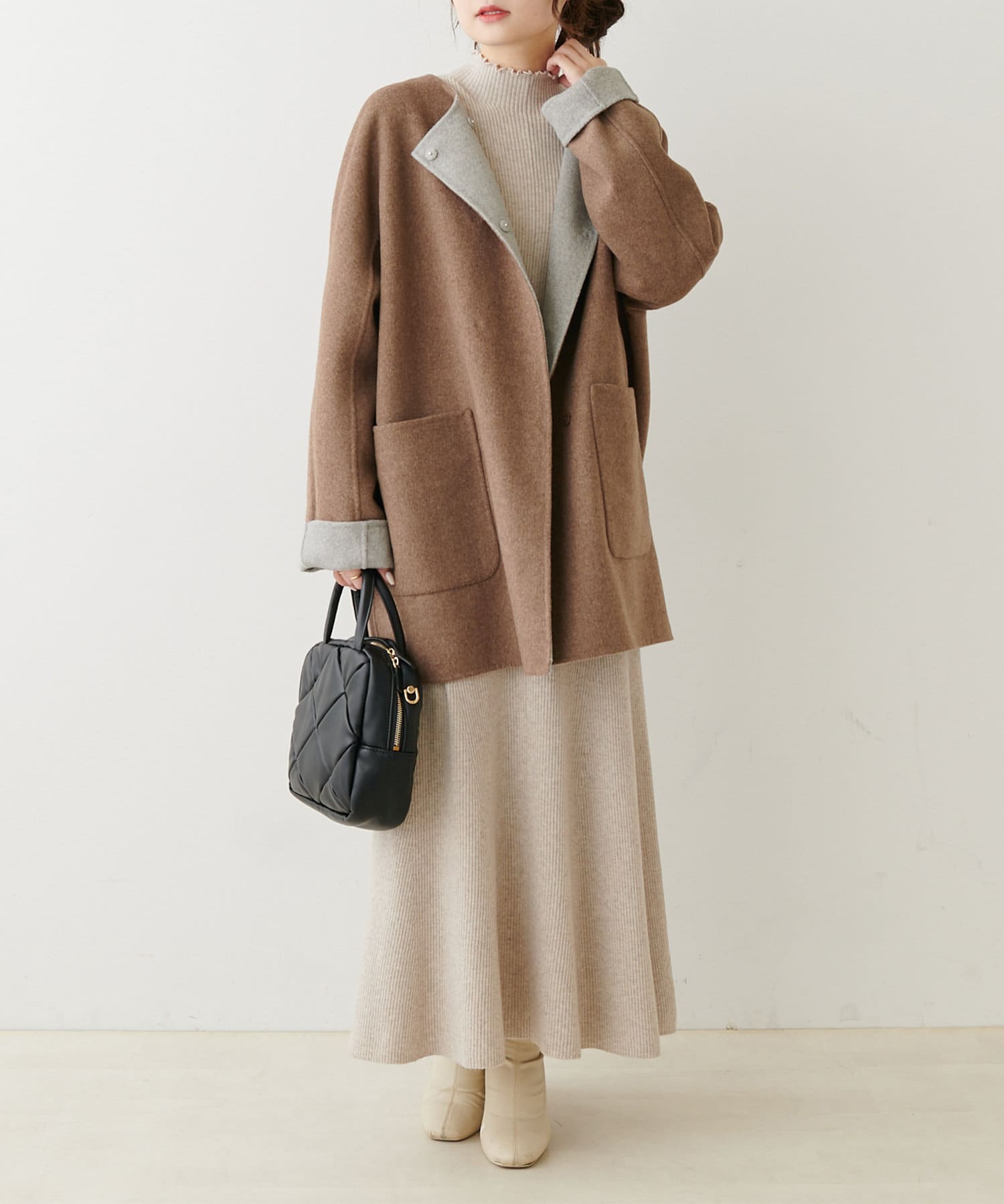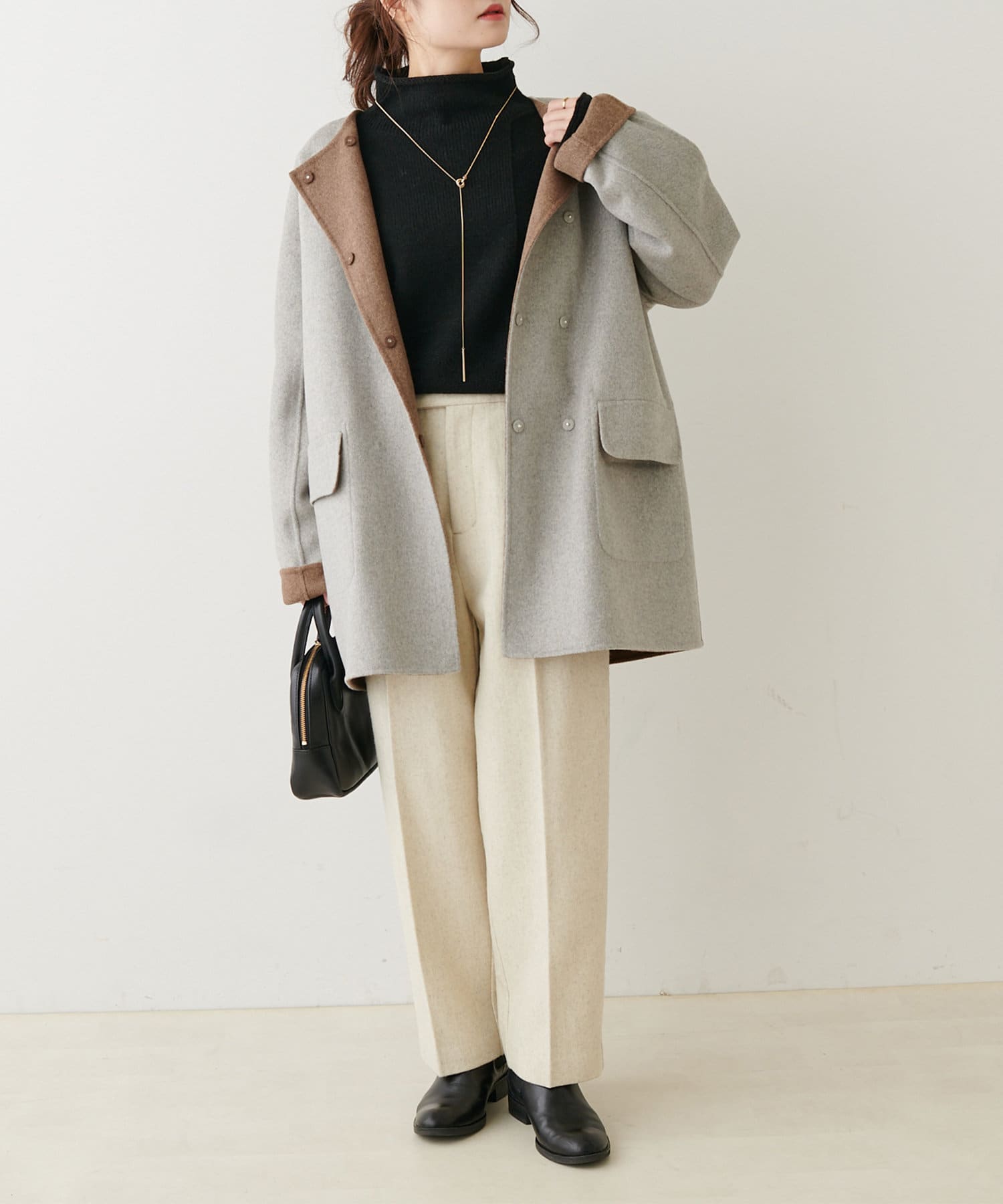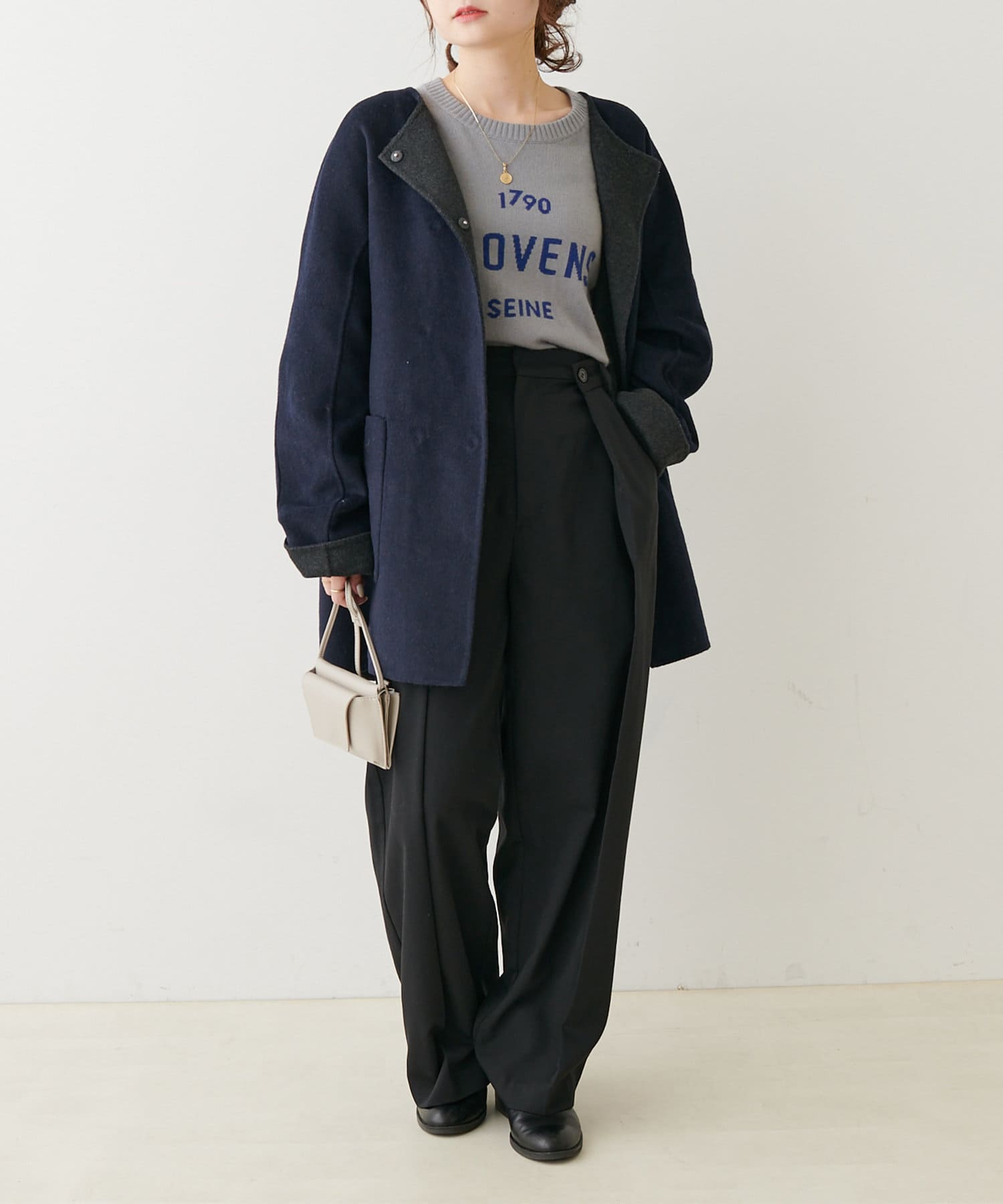 ミドル丈のコートはボトムスを選ばず、デニムや綺麗めなスラックス、ロングスカートまで幅広いスタイルに馴染みます。