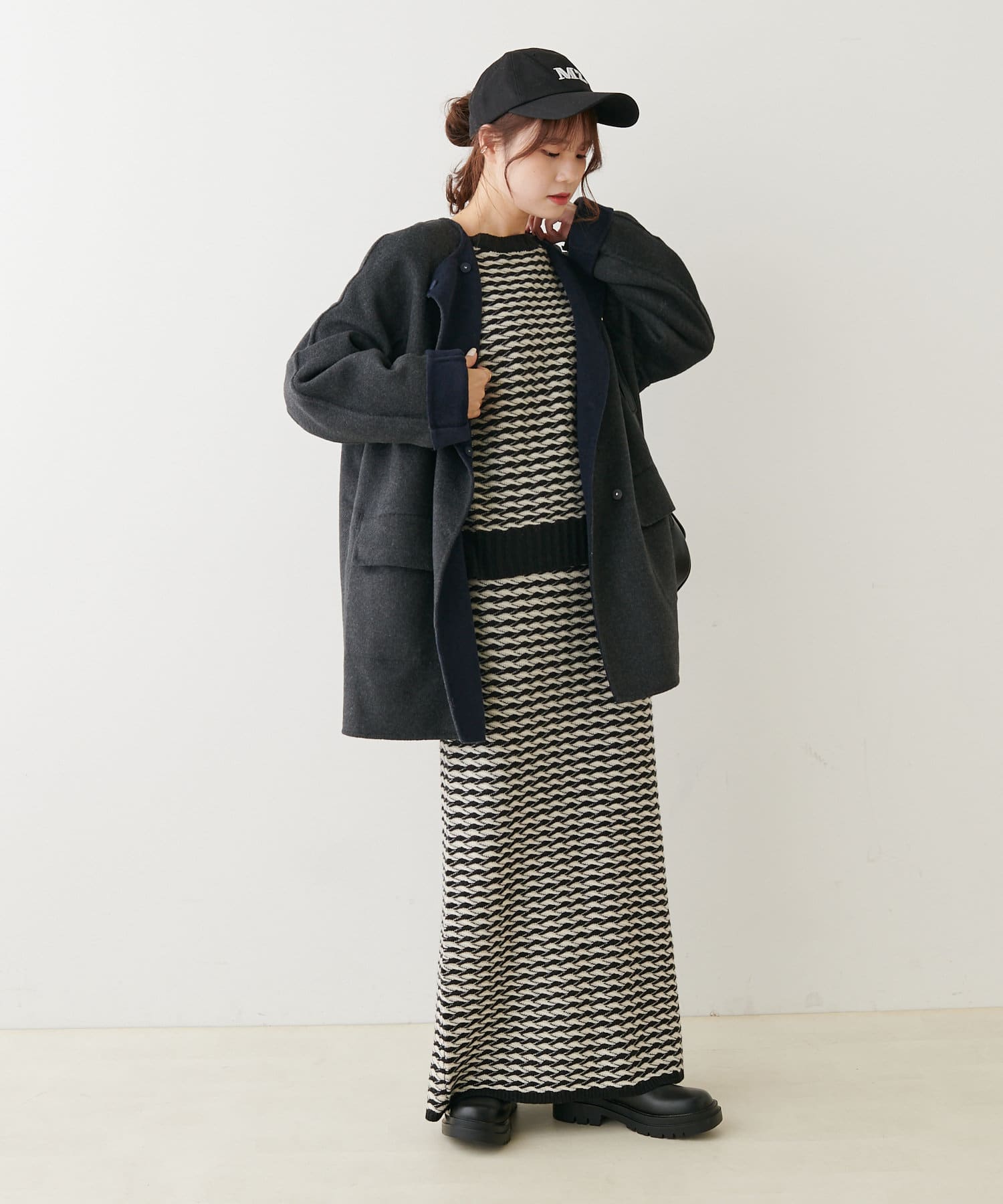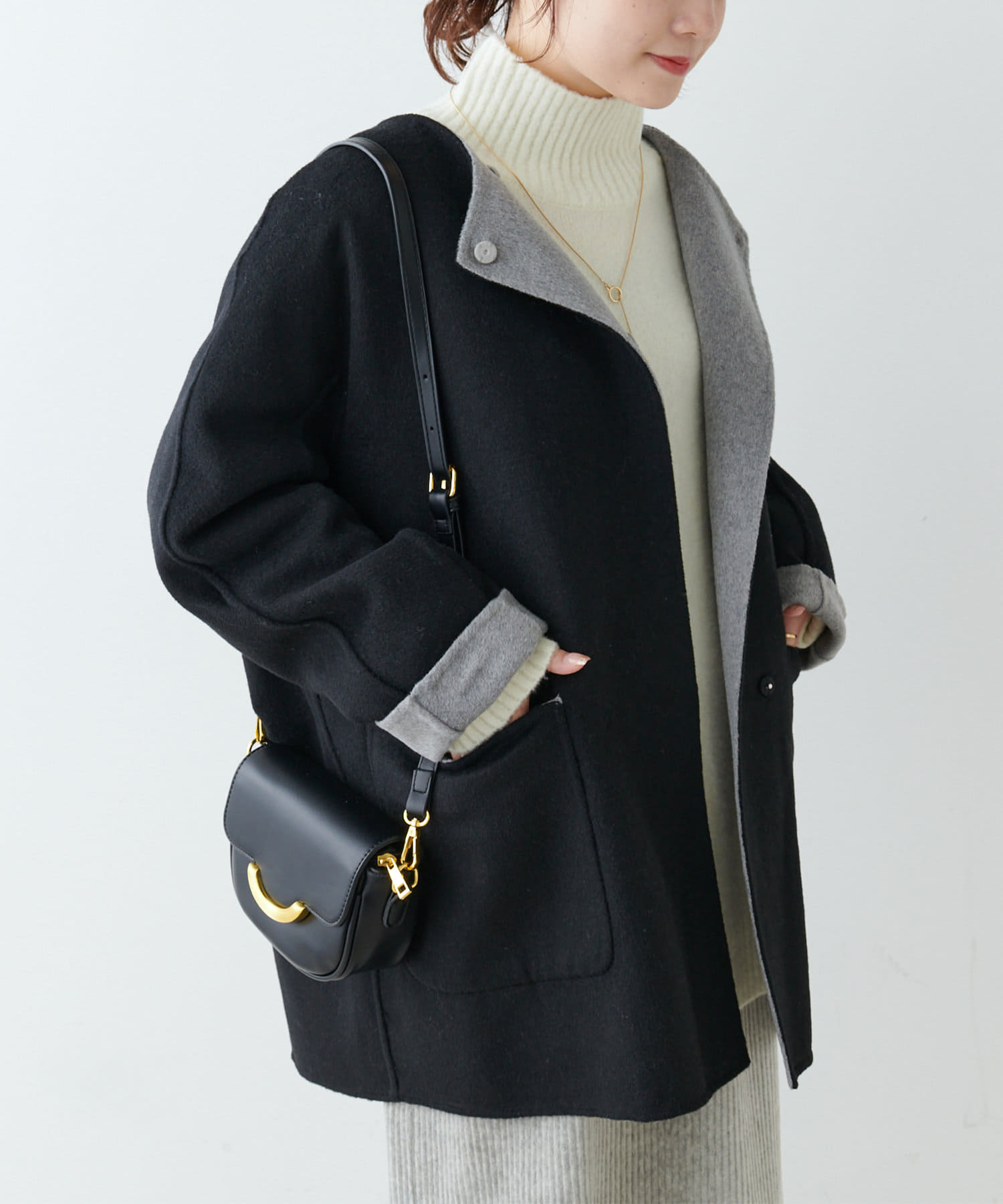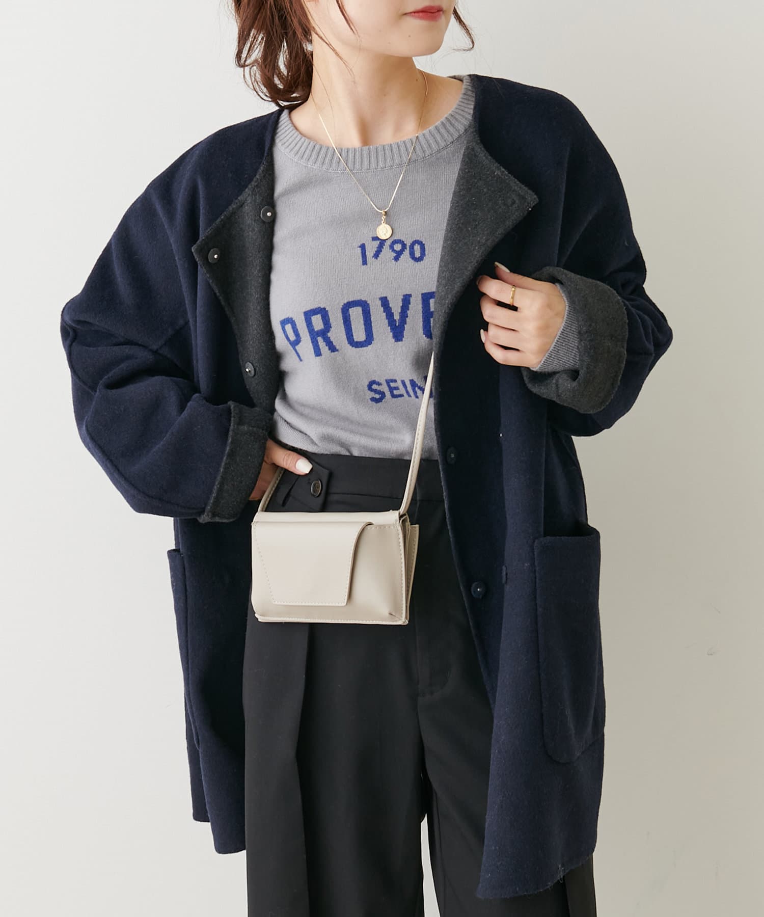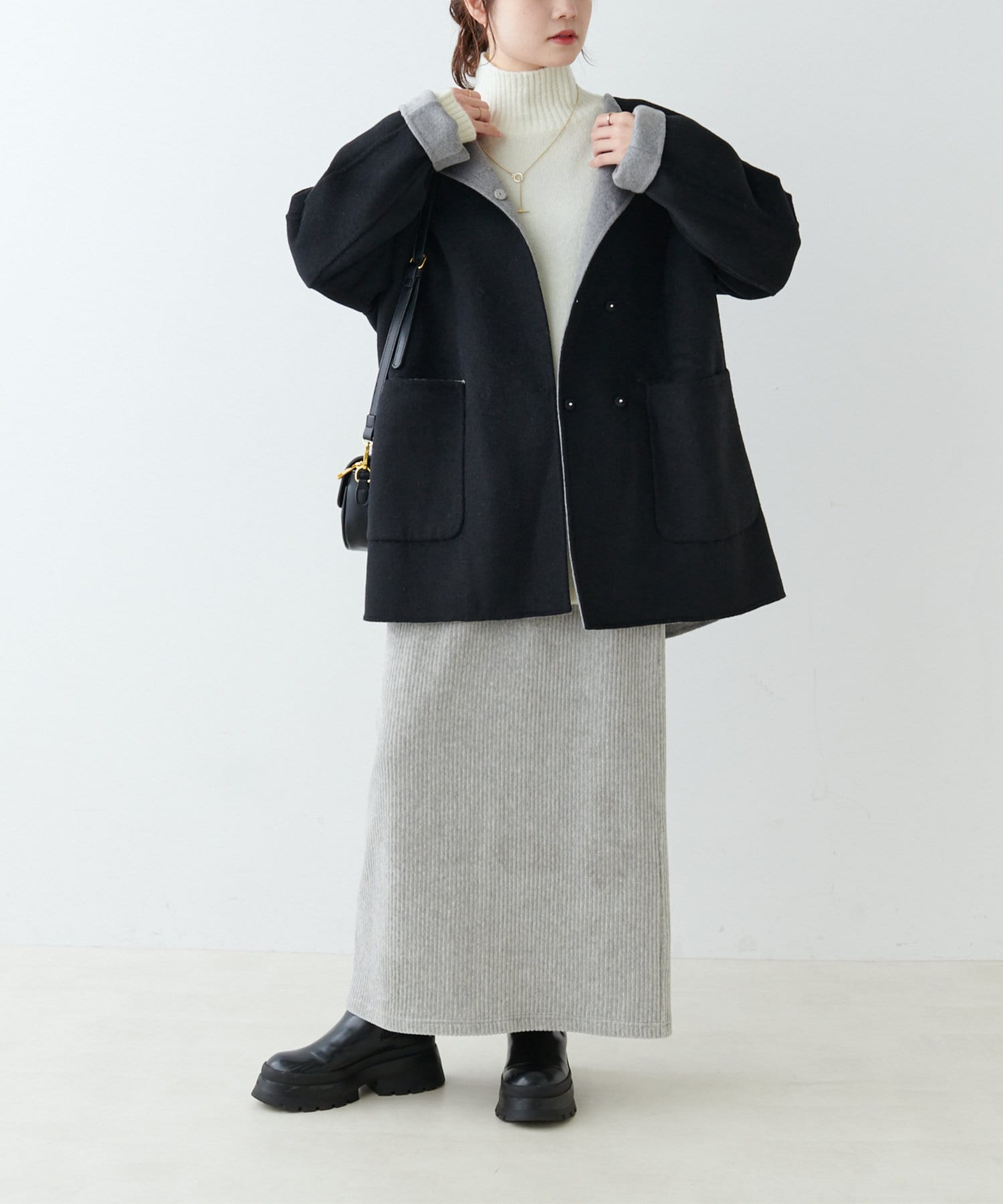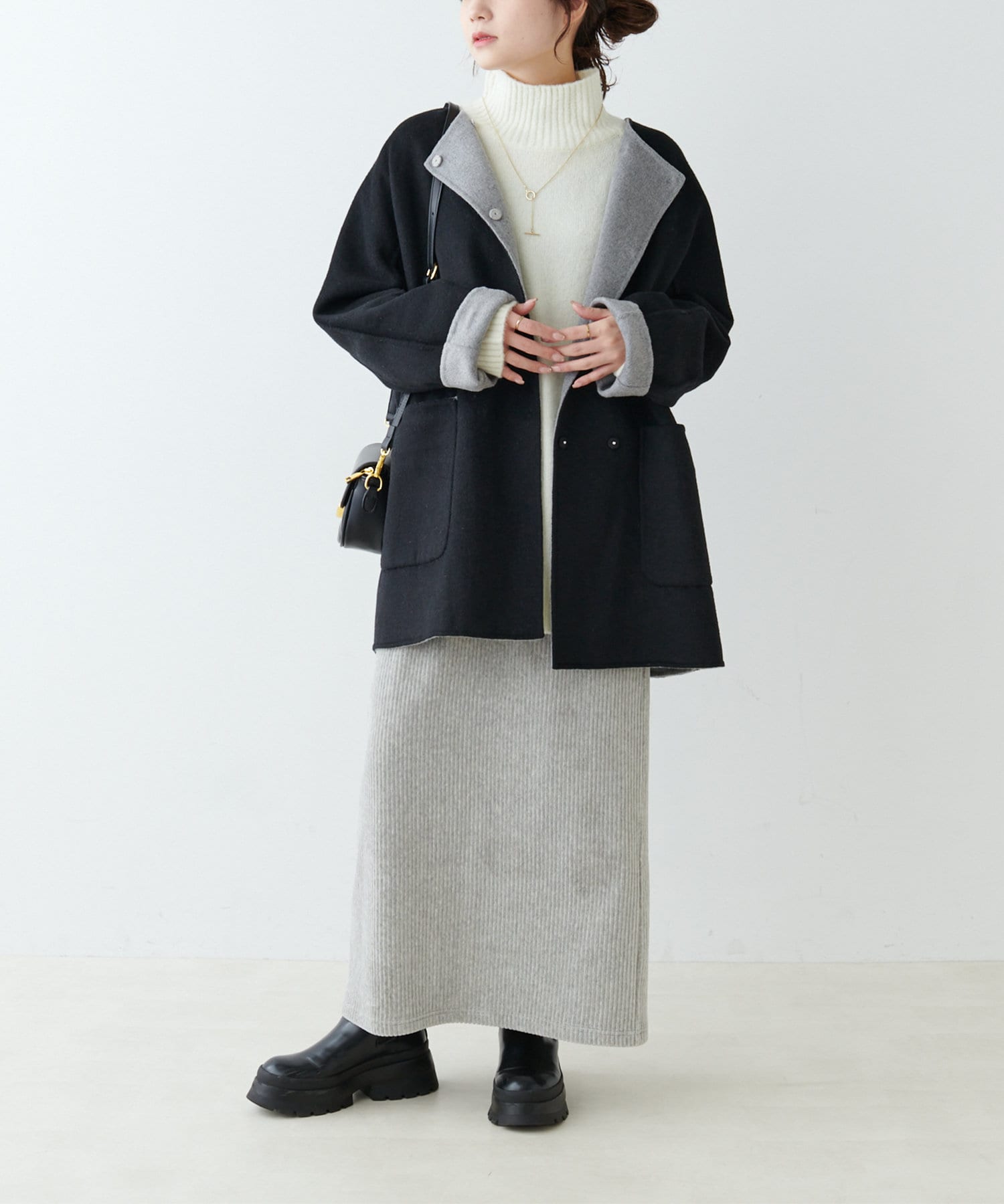 ミドル丈のコートはボトムスを選ばず、デニムや綺麗めなスラックス、ロングスカートまで幅広いスタイルに馴染みます。
