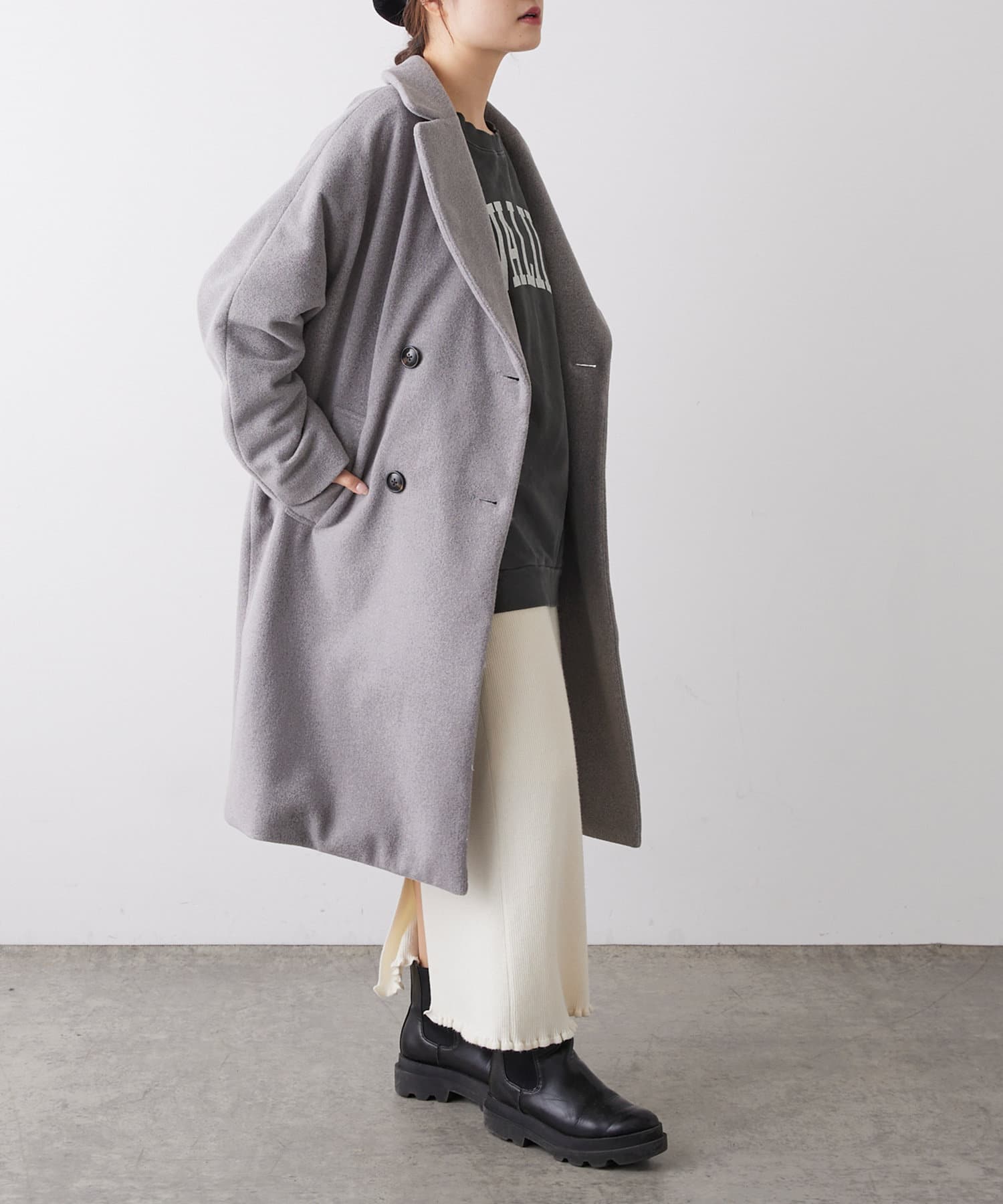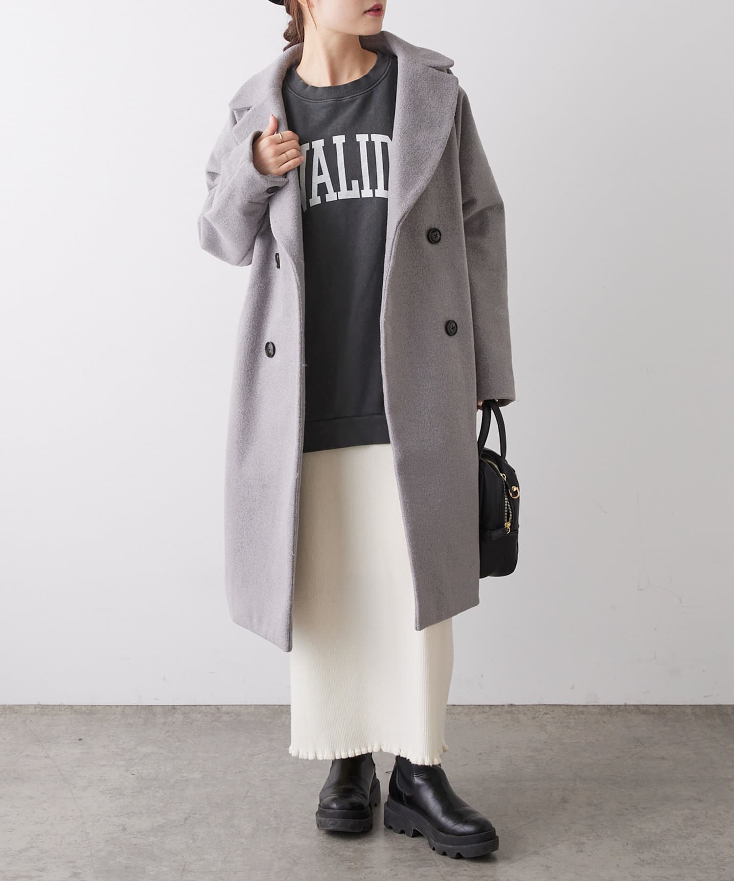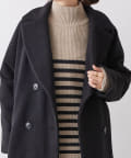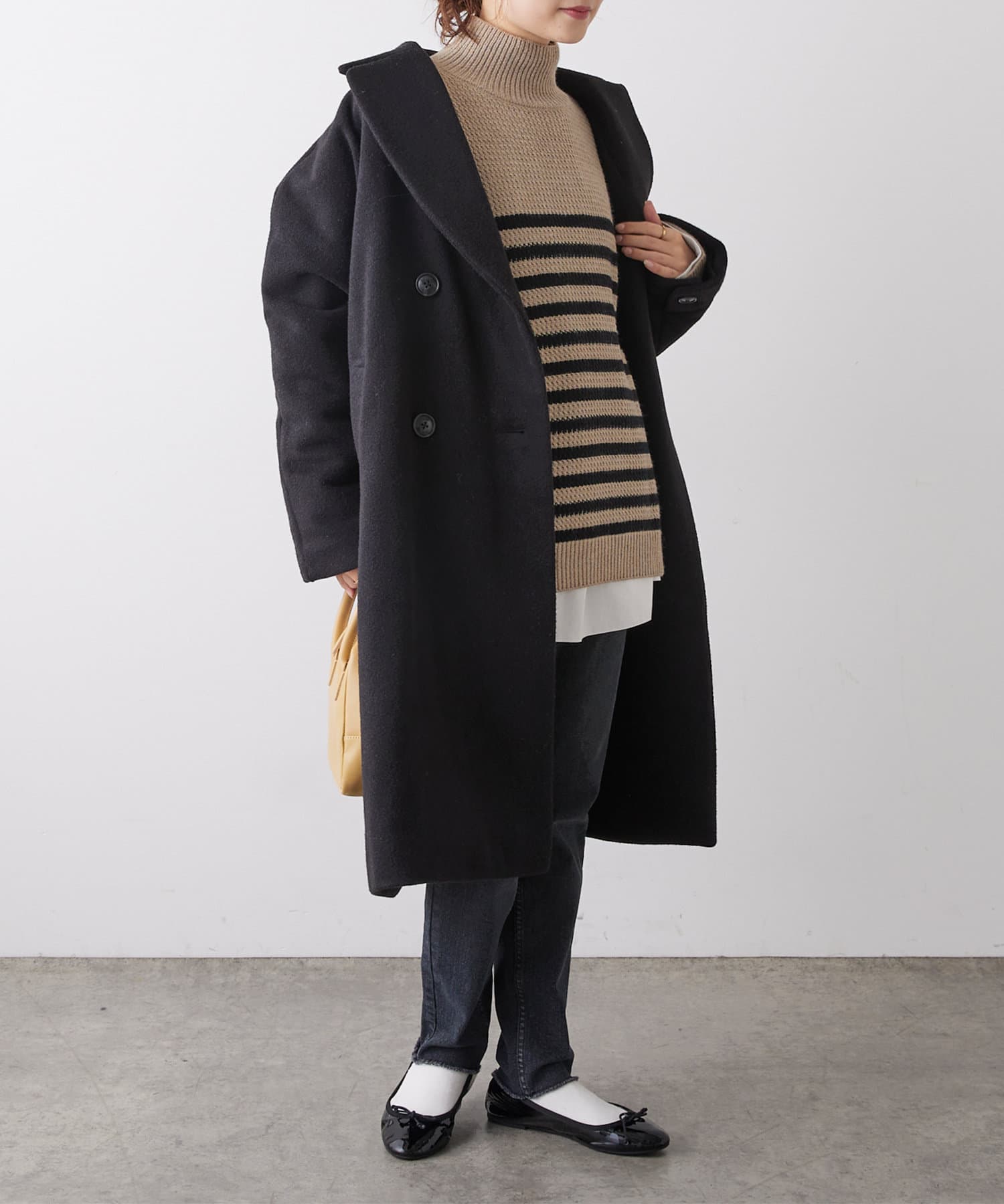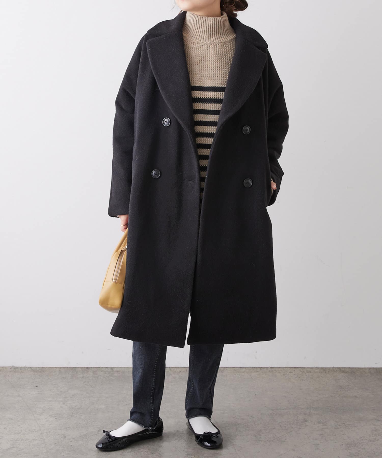 ダブルボタンで身幅にゆとりがあり、厚手のインナーの上から羽織りやすいのも嬉しいポイント。