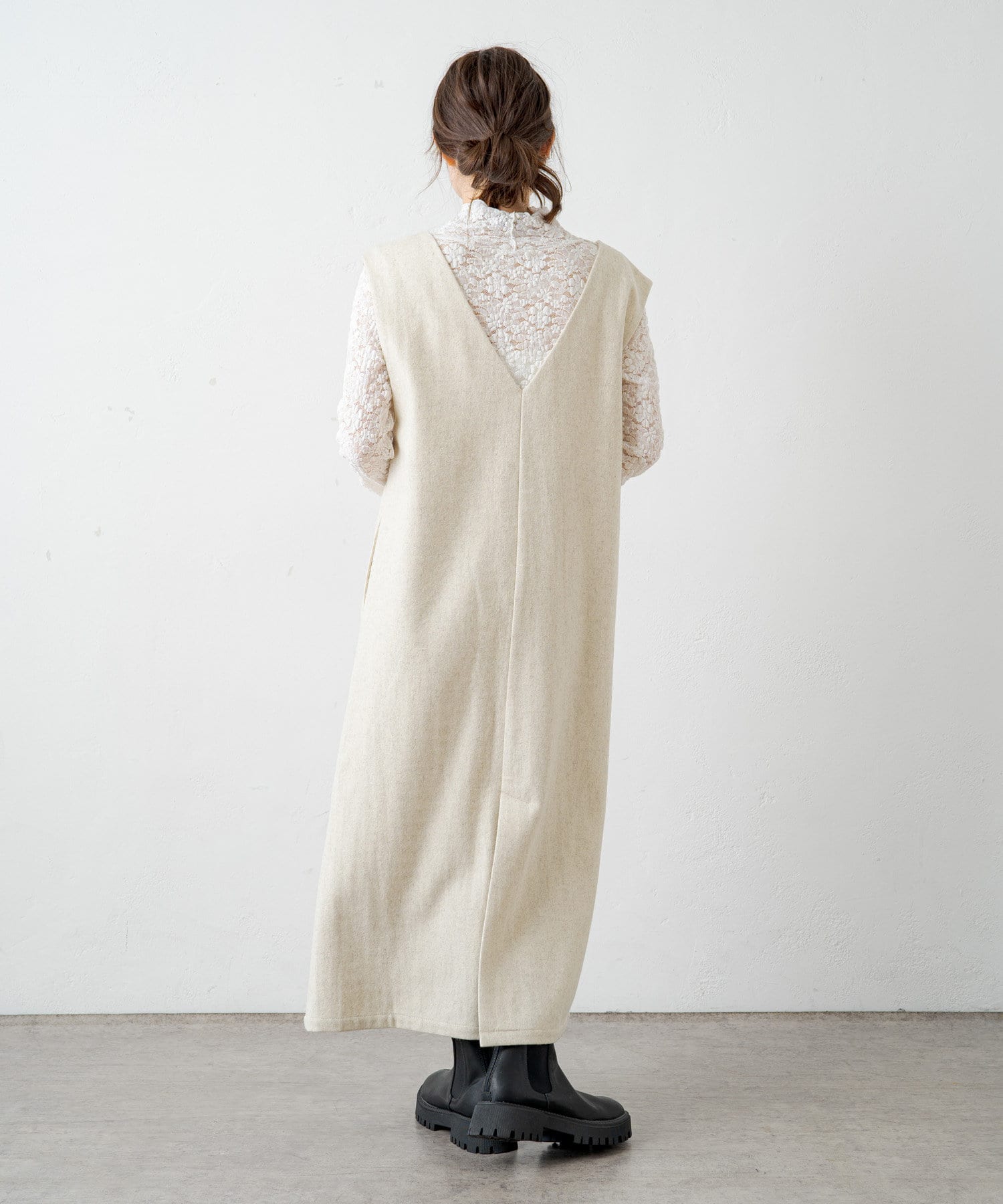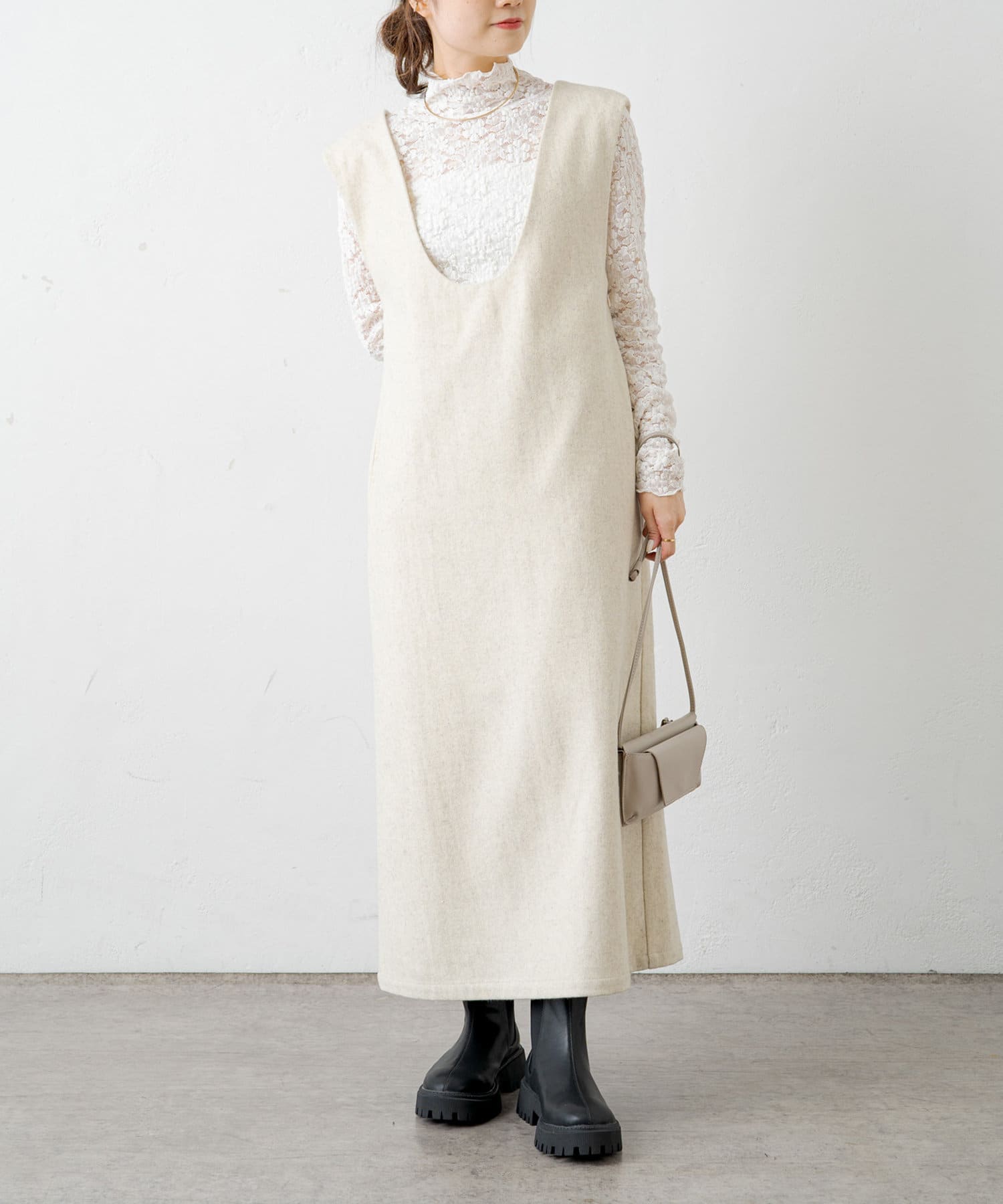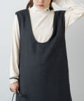 やや深めのネックデザインなので、レーストップスや柄物ブラウスなどインナー次第でがらりと雰囲気が変わります。