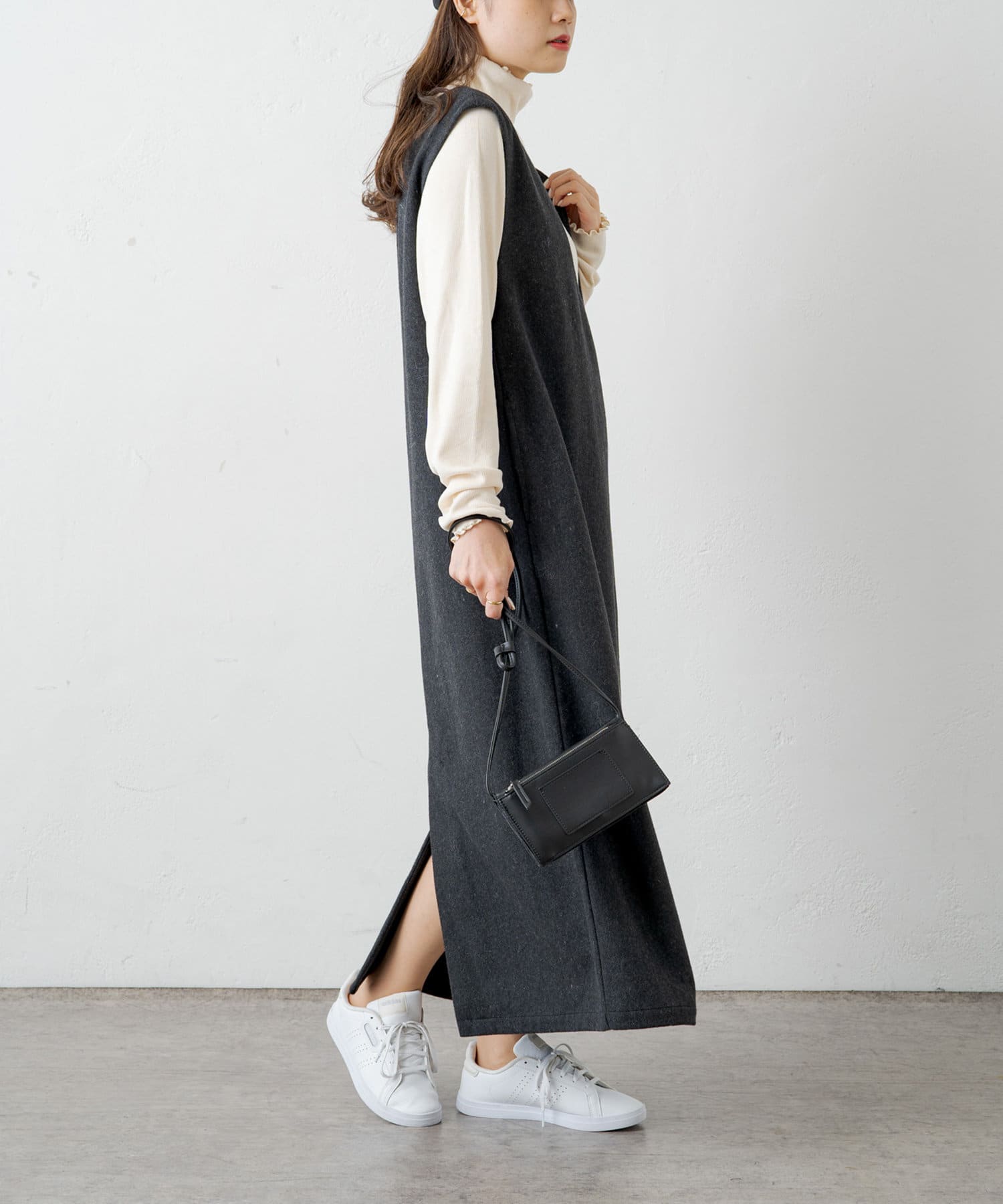 ややAラインなシルエットとしっかりとした生地感で、身体のラインを拾わないのも嬉しいポイント。